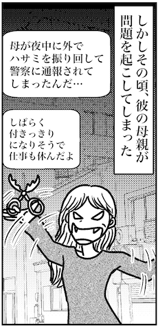 サイゾーウーマンカルチャーマンガアラフォー婚活、「親が警察に通報された」 カルチャー まんが『オバサンと言われても結婚したい!』まとめ読み 【アラフォー婚活ルポ】「母が警察に通報された」バツイチ42歳男性、いったい何が? 2024/05/05 13:00 白戸ミフル(マンガ家) オバサンと言われても結婚したい! 彼の母親が警察に通報された…… 続きはこちら↓ 【アラフォー婚活ルポ】年下彼氏と微妙な中、先輩と行ったクラブで○○を発見!――合コン歴20年以上、累計回数2,500回以上、30代なかばに乳がんで闘病するも、現在は絶賛婚活中のライター・漫画家の白戸ミフルが「アラフォー婚活」の実体験をほぼリアルタ...サイゾーウーマン2023.01.04 人気エピソードのまとめ読み 【アラフォー婚活ルポ】「ウチに来ませんか?」終電間近、23歳男子の誘い――合コン歴20年以上、累計回数2,500回以上、30代なかばに乳がんで闘病するも、現在は絶賛婚活中のライター・漫画家の白戸ミフルが「アラフォー婚活」の実体験をお届けします...サイゾーウーマン2024.03.27【アラフォー婚活ルポ】「お酒買ってラブホ行かない?」タップル婚活、とんでもなかった4人の男たち――合コン歴20年以上、累計回数2,500回以上、30代なかばに乳がんで闘病するも、現在は絶賛婚活中のライター・漫画家の白戸ミフルが「アラフォー婚活」の実体験をお届けします...サイゾーウーマン2024.03.31【アラフォー婚活ルポ】「結婚しよう!」無職、26歳男子の言葉に絶句――合コン歴20年以上、累計回数2,500回以上、30代なかばに乳がんで闘病するも、現在は絶賛婚活中のライター・漫画家の白戸ミフルが「アラフォー婚活」の実体験をお届けします...サイゾーウーマン2024.04.01 前のページ1234567 白戸ミフル(マンガ家) 神奈川県出身。漫画家・ライター。タレント活動の後、マスコミ系の職業を渡り歩き、現在は化粧品メーカーに勤務。合コン歴20年以上、累計回数2500回以上。女性向けwebメディアほか、男性向けメディア、旅系メディア等でライターとして幅広く執筆。著書『合コン・アンド・ザ・シティ 恋活・婚活女子の合コンマニュアル』(ごきげんビジネス出版)、 『乳がんステージ4だった私が、それでも合コンに行きまくって救われた話』(キノブックス) 記事一覧 X:@takara0722 Instagram:@tamifull0722 【アラフォー闘病&婚活記】 最終更新:2024/05/05 13:00 実にふわっとした男 関連記事 【アラフォー婚活ルポ】「ウチに来ませんか?」終電間近、23歳男子の誘い【アラフォー婚活ルポ】お見合い中に何度も聞かれた、この質問【アラフォー婚活ルポ】えぇ~オジサンたちのところに戻りたくない【アラフォー婚活ルポ】キョロキョロ……独身男子とも話したいけど【アラフォー婚活ルポ】イヤな予感……そういやバツイチだっけ その他の作品を読む 次の記事 ブームから8年、【太陽のトマト麺】はいま? >