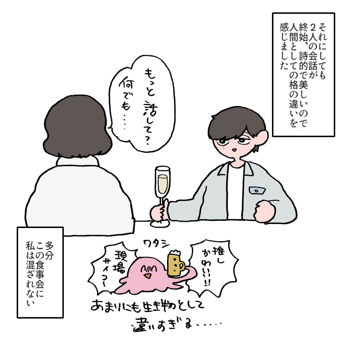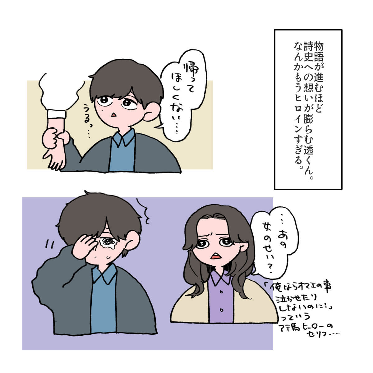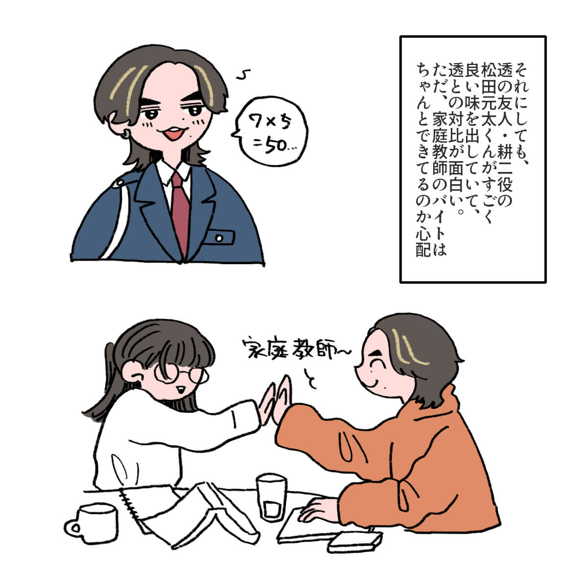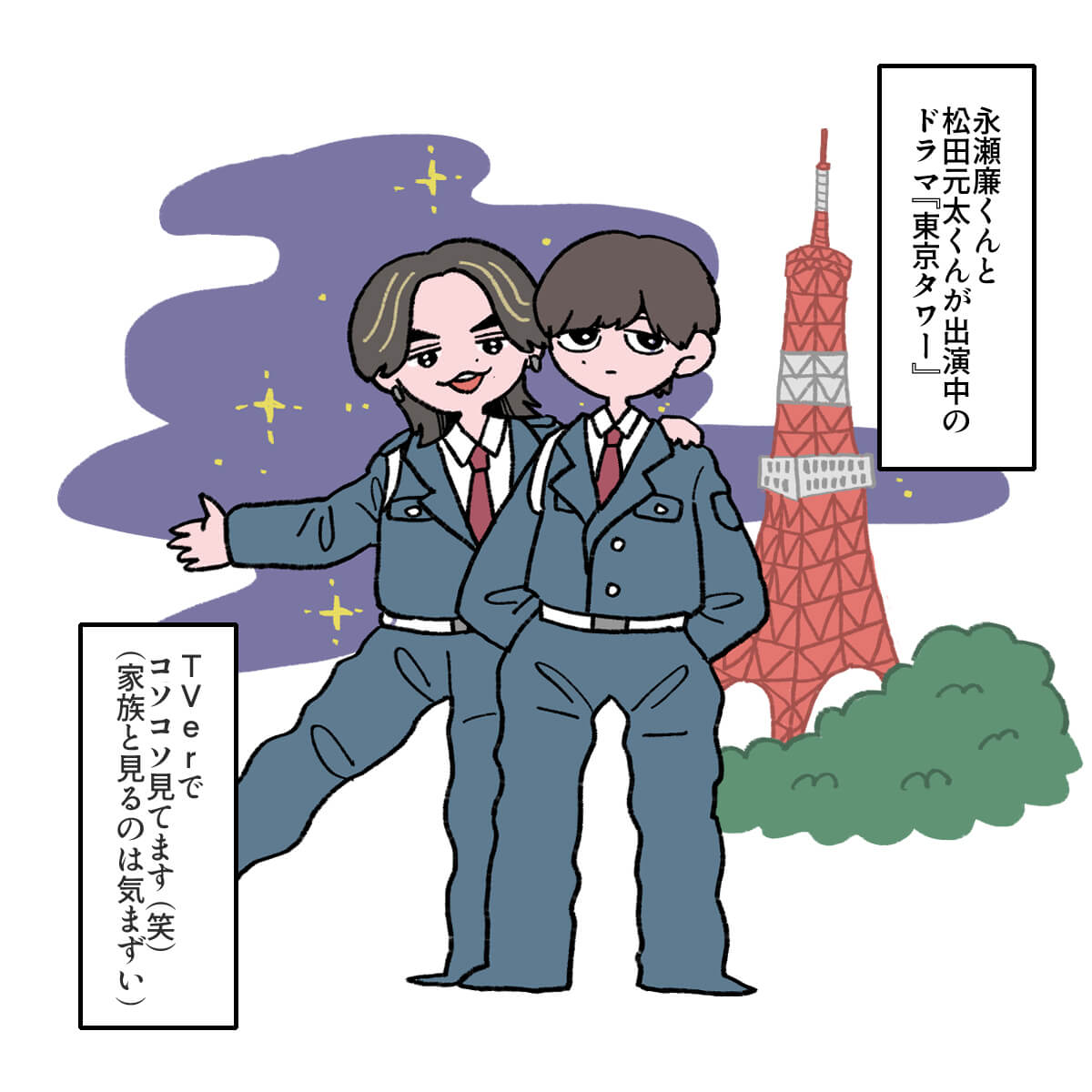 サイゾーウーマン男性アイドルSTARTO(旧ジャニーズ)King&Prince永瀬廉『東京タワー』永瀬廉がヒロインすぎる 男性アイドル [ドルオタ漫画家・竜田トキヒロの“推し事”見聞録]vol.55 『東京タワー』キンプリ・永瀬廉は目が死んでる役が似合う! 詩史との食事シーンが美しいわけ 2024/05/08 21:00 竜田トキヒロ(マンガ家) 永瀬廉King&Prince竜田トキヒロの“推し事”見聞録 ――Twitterで日々、STARTO ENTERTAINMENT(旧ジャニーズ事務所)のタレントをはじめとしたイラストを投稿中のドルオタ漫画家・竜田トキヒロが、現場レポートからドラマや映画、番組レビューまで、“推し事”の様子をお届け! 今回は、King&Prince・永瀬廉が主演を務めるドラマ『東京タワー』(テレビ朝日系)をレビュー! 『東京タワー』は、不倫を題材にした美しくも許されない恋を描いた江國香織氏の同名小説(2001年、マガジンハウス)が原作。医大生・小島透(永瀬)と、20歳以上年の離れた人妻・浅野詩史(板谷由夏)による恋愛模様を描き、05年には岡田准一(当時はV6)と黒木瞳で映画化されました。 また、映画で嵐・松本潤が演じた大学生・大原耕二と人妻・川野喜美子(寺島しのぶ)による“もう1つの禁断の恋”には、Travis Japan・松田元太とMEGUMIが挑んでいます。 4月20日の初回は、動画配信サービスでの見逃し配信の再生数が200万回を突破(21~27日、ビデオリサーチ調べ)するなど、大きな話題を集めている同ドラマ。この記事では、最新の第3話までで印象に残ったシーンなどをイラストでご紹介していきます! 目次 ・King&Prince・永瀬廉、儚げな役がピッタリ! ・King&Prince・永瀬廉がヒロインすぎる! ・Travis Japan・松田元太との友情にも大注目! King&Prince・永瀬廉は、儚げな役がピッタリ! ドラマ『東京タワー』、King&Prince・永瀬廉がヒロインすぎる! King&Prince・永瀬廉とTravis Japan・松田元太の友情にも大注目! ★これまでの連載記事はこちらから 【4月期深夜ドラマ】キンプリ永瀬廉『東京タワー』、TVerお気に入り登録者トップ! STARTO出演作ランキング King&Prince(以下、キンプリ)の永瀬廉が主演を務める連続ドラマ『東京タワー』(テレビ朝日系、毎週土曜午後11時~)が、ファンの間で高い注目を集めている。...サイゾーウーマン2024.04.30 キンプリ・永瀬廉、ドラマ『東京タワー』の“濡れ場”に言及! 「岡田くんみたいには……」 King&Prince・永瀬廉がパーソナリティを務めるラジオ番組『King&Prince 永瀬廉のRadioGARDEN』(文化放送)。4月17日深夜放送回は、主...サイゾーウーマン2024.04.21 【ジャニオタマンガ】映画『法廷遊戯』で気づいた、キンプリ・永瀬廉の“声”の良さ――Twitterで日々、ジャニーズタレントにまつわるイラストを投稿中のジャニオタ漫画家・竜田トキヒロが、現場レポートからドラマや映画、番組レビューまで、“推し事”の様子を...サイゾーウーマン2023.11.15 竜田トキヒロ(マンガ家) 漫画家、イラストレーター。育休中に執筆したエッセイ漫画でKADOKAWAコミックエッセイ大賞受賞。Ameba、ライブドア公式ブロガーを経たのち現在はインフルエンサーとしてエンタメ、オタクに特化した漫画やイラストや体験ルポ等幅広く執筆。著書『コミュ障母さんとごきげん娘』(KADOKAWA) X:@musumenuma 最終更新:2024/05/08 21:06 目、死んでるのが役超えてガチで心配 関連記事 【4月期深夜ドラマ】キンプリ永瀬廉『東京タワー』、TVerお気に入り登録者トップ! STARTO出演作ランキングキンプリ・永瀬廉、ドラマ『東京タワー』の“濡れ場”に言及! 「岡田くんみたいには……」【ジャニオタマンガ】映画『法廷遊戯』で気づいた、キンプリ・永瀬廉の“声”の良さキンプリ・永瀬廉、GWの話題は「ほんまだるい」! 「ファンの人とか何してんのやろ?」興味津々キンプリ・永瀬廉、「今後出ないやん。あんなグッズ」自身の顔をプリントした公式グッズとは? 次の記事 ビーファMANATOとJO1 祥生 、LDH時代を懐古 >