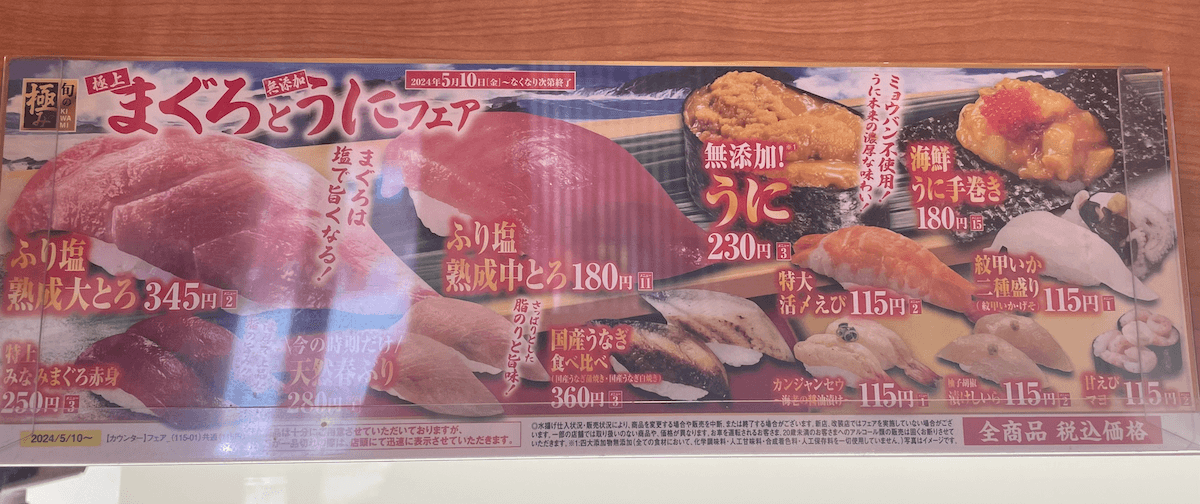 サイゾーウーマン暮らし食べ物【くら寿司】230円「無添加うに」驚きのワケ 暮らし 【くら寿司】期間限定メニュー実食 【くら寿司】230円「無添加うに」、コスパと味は? 19日までの期間限定、急いでチェック! 2024/05/17 13:30 サイゾーウーマン編集部 回転寿司くら寿司 くら寿司外観(C)サイゾーウーマン くら寿司の期間限定メニュー実食レビュー! 今回は5月10日から19日までの「極上まぐろと無添加うに」フェアのメニューについて、実食レビューしていきます! 目次 ・【2024年5月10日スタート】くら寿司の期間限定メニューの実食レビュー ・【2024年5月10日スタート】くら寿司の期間限定キャンペーン 【2024年5月10日スタート】くら寿司の期間限定メニュー 「極上まぐろと無添加うに」フェア (写真:サイゾーウーマン) ※一部店舗では取り扱いがありません。 【開催期間】5月10日(金)~5月19日(金) >>>フェア詳細はこちら 【2024年5月10日スタート】くら寿司の期間限定メニューの実食レビュー (写真:サイゾーウーマン) 特上みなみまぐろ赤身 250円 特上みなみまぐろ赤身 250円(写真:サイゾーウーマン) 特上みなみまぐろ赤身は、「赤いダイヤ」とも呼ばれているミナミマグロの中でも、「1匹からわずか15~20%ほどしか取れない“天身”といわれる部位を使用」とのこと。 登場したネタが写真とサイズや色も違うので、オーダーミスかと思いました。しかし間違いなく特上みなみまぐろ赤身のようです。 口にすると赤身の味わいはあるものの、特上や希少部位に期待するほどのおいしさとは言えず……。名前負け感がありました! コスパ:★☆☆☆☆ 満足度:★☆☆☆☆ 販売期間:5月10日(金)~5月19日(日) 無添加うに(一貫) 230円 無添加うに(一貫) 230円(写真:サイゾーウーマン) 無添加うには、一般的に形崩れを防ぐために使用される添加物「ミョウバン」を一切使用していないため、苦みがないことが特徴とのこと。 たしかに、身はボロボロに崩れていますが、食べてみると旨みをしっかり感じます。磯の香りもありますね。ウニ特有の臭みや後味の苦味がちょっと苦手で普段食べることはないのですが、そうした臭みが感じられなかったのは無添加ゆえかもしれません! コスパ:★★★☆☆ 満足度:★★★☆☆ 販売期間:5月10日(金)~5月19日(日) 国産うなぎ食べ比べ 360円 国産うなぎ食べ比べ 360円(写真:サイゾーウーマン) 国産うなぎの蒲焼きと白焼きを食べ比べられる一皿。 蒲焼きは、あっさりとした醤油ベースのタレで丁寧に焼き上げたあと、蒸しの工程から、タレつけ、炭火焼きを4回繰り返すことで、皮目は香ばしく、身はふわっととろけるような食感とのこと。 実際に食べると、ふわふわの舌触りにびっくり! パリッとした皮目とタレが香ばしく、鰻の味わいを生かす絶妙な味付けです。 白焼きは特製の白醤油にくぐらせているそうで、食べてみると蒲焼よりも酢飯の味が出てくる印象。鰻の存在よりシャリが強いように感じました。個人的には断然蒲焼き推しです! コスパ:★★☆☆☆ 満足度:★★☆☆☆ 販売期間:5月10日(金)~5月19日(日) (新商品)カンジャンセウ 115円 カンジャンセウ 115円(写真:サイゾーウーマン) 生エビをヤンニョンジャンなどを使用した特製のタレに漬け込んだ韓国の定番料理、カンジャンセウ。 食べてみるとピリッとした辛味のあとに醤油が香り、そこに生エビの甘みとねっとりした質感が◎。これはおいしい! 味わいの最後はシャリの酢が勝るので、シャリはハーフのほうがカンジャンセウそのものを楽しめるかも。気軽にカンジャンセウが食べられるのはとてもうれしいので、定番化希望です! コスパ:★★★★★ 満足度:★★★★★ 謎解きをして「名探偵コナン」のオリジナルグッズをゲット! くら寿司WEBページ上から謎解きにチャレンジすると、限定商品などが当たる特別企画を行います。回転レーンを活かしたくら寿司ならではの企画として、店舗の回転レーン上にも謎解きが記載されたポップが流れるので、WEBページにて回答、応募いただくと、抽選で賞品をプレゼントします。ぜひお食事をしながら、回転レーンにも注目してみてください。 ・開始時間:4月5日(金) 10時 ・実施期間:4月5日(金)~5月19日(日) ・実施店舗:くら寿司全店舗 ・WEBサイト:https://www.kurasushi.co.jp/topic/005456.html サイゾーウーマン編集部 芸能・ジャニーズ・美容・暮らし・カルチャーなど、さまざまな情報を独自の切り口で発信するニュースサイト X:@CyzowomanC Instagram:@cyzowoman オンナを刺激するニュースブログ[サイゾーウーマン] 最終更新:2024/05/17 13:30 カンジャンセウ安すぎ! 関連記事 くら寿司の期間限定メニュー、実食レビュー! 『名探偵コナン』コラボ限定キャンペーン情報【2024年4月最新】「しゃぶ葉」まるパクりの「しゃぶ食べ」、もはや酒のテーマパークだった! ケチくさくない圧巻の飲み放題、モンテローザ系列随一!?「鳥貴族」を徹底オマージュ、どころかトリキ超え!? 「豊後高田どり酒場」もはや無双のカオス居酒屋だった【モンテローザで飲んで