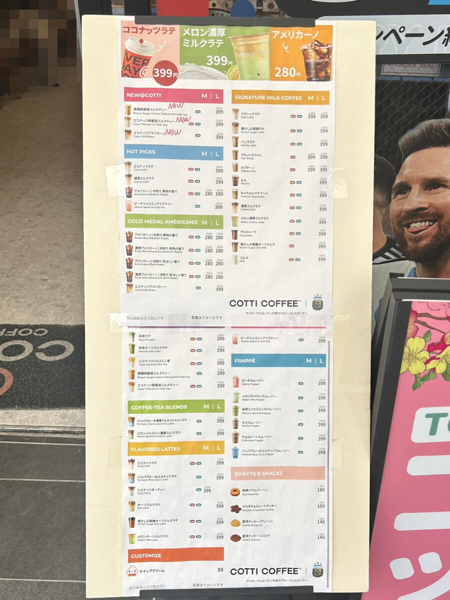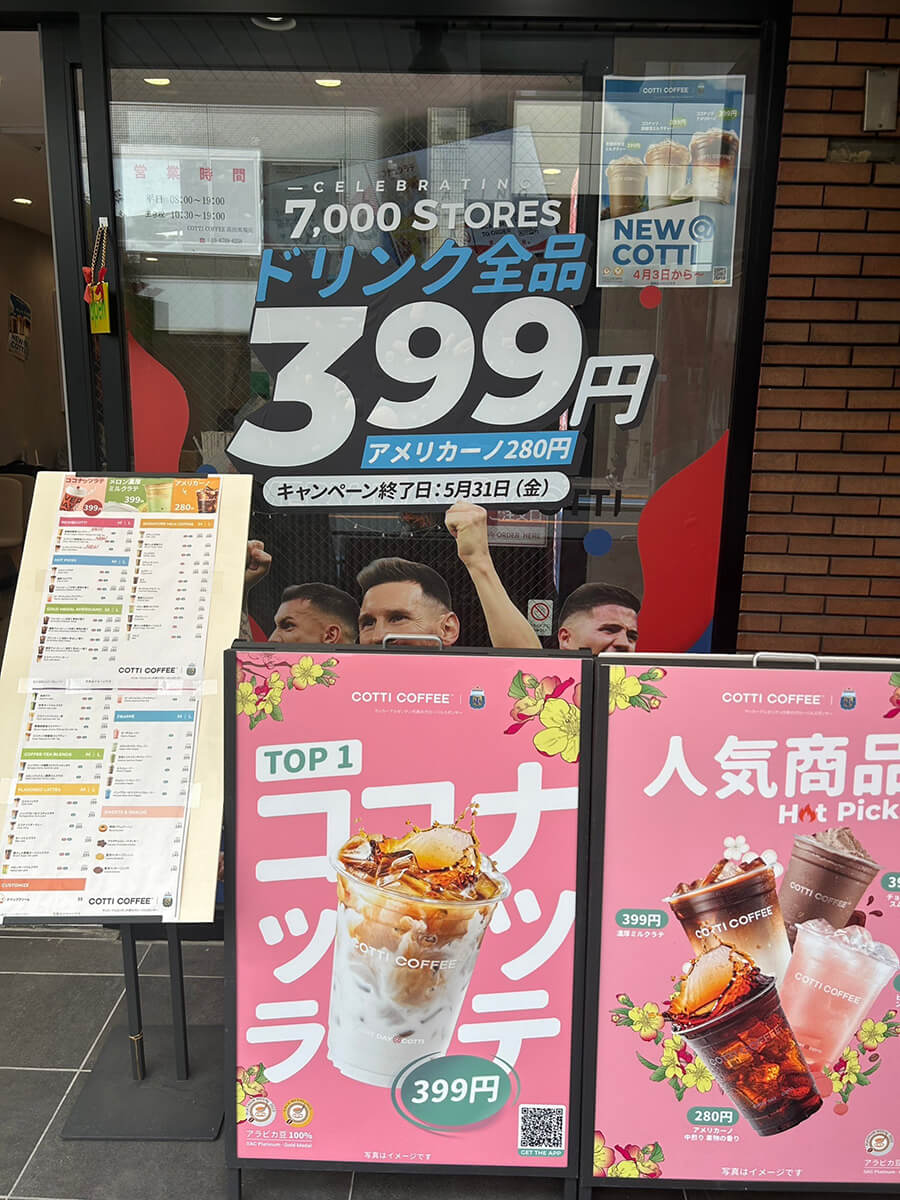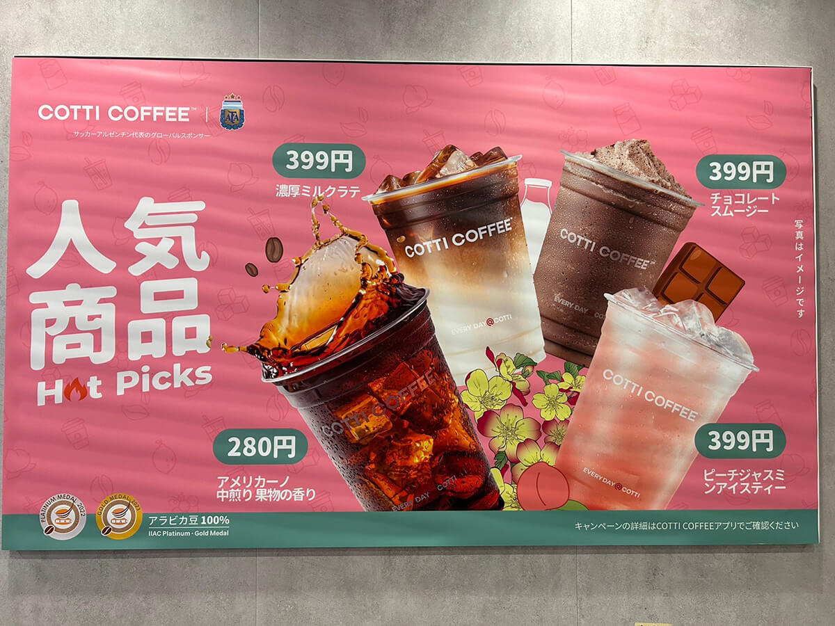 サイゾーウーマン暮らし食べ物コッティコーヒーはいま? 暮らし [話題のチェーン店レビュー] “スタバ超え”掲げる中国発【コッティコーヒー】はいま? 399円新商品は「さすが」の味だった! 2024/05/28 19:09 サイゾーウーマン編集部 食べ物 「コッティコーヒー」高田馬場店の外観(C)サイゾーウーマン 昨年日本に上陸した中国発のコーヒーチェーン「COTTI COFFEE(コッティコーヒー)」を、みなさんご存じでしょうか? 先日、街を歩いていると、「ドリンク全品399円」という文字が飛び込んできて、初めて見るお店でしたが、思わず店内に吸い寄せられました。この記事では、ドリンクメニューの実飲レビューとともに、店内の様子をお伝えします。 ※価格はすべて税込。 ※価格やメニューは2024年5月28日時点の情報です。 ※店舗によって価格やメニューが異なることがあります。 ※最新の情報は公式サイトや公式SNSをご確認ください。 目次 ・中国発の「コッティコーヒー」とは? ・「ドリンク全品399円」キャンペーンがスゴい! ・新商品「ココナッツ鉄観音ミルクティー」399円を実飲 ・キャンペーン終了後も注目したいのワケ ・店自体はサクッとお茶したい人向け? 中国発の「コッティコーヒー」とは? 中国のコーヒーチェーン最大手「瑞幸咖啡(luckin coffee)」の創業者が2022年10月に設立したコッティコーヒー。わずか1年半ほどで世界28カ国で7000店舗以上を展開し、世界で4番目に大きいコーヒーショップへと成長しました。 まだ日本版の公式サイトはないようですが、昨年8月には日本初となる東京大学赤門店(今年4月に閉店、5月に京橋店へ移転)がオープンしたと複数のメディアで報じられており、以降、西池袋店、早稲田戸山キャンパス店、高田馬場店、渋谷新南口店、上野公園店(臨時休業中)、神保町店、大久保店、府中KURURU店というように、都内を中心に続々と店舗を拡大。今年3月には、大阪・心斎橋にも出店しています。 西池袋店の開店時は行列をなすほどの人気だったと報じられましたが、上陸から1年の現在はどんな様子なのか? チェックしてきました。 【コッティコーヒー】「ドリンク全品399円」キャンペーンがスゴい! サッカー・アルゼンチン代表のグローバルスポンサーをにも就いた(C)サイゾーウーマン コッティコーヒーの最大の魅力は、その「安さ」でしょう。高品質、低価格、手軽なコーヒー製品を、若々しくシックなブランド体験とともに提供することを目指しているという同店。 日本では、全世界店舗数7,000店突破を記念し、2月末から5月31日までの期間限定で「ドリンク全品399円、アメリカーノ280円」のキャンペーンを実施中でした。 ドリンクの品数の多さに驚き(C)サイゾーウーマン 世界基準のコーヒー豆審査競技会で入賞した、IIACプラチナ「コメット」コーヒー豆と、IIAC金賞「シリウス」コーヒー豆を使用したアメリカーノはM・Lサイズ問わず280円、ラテやフルーツティー、スムージーなども一律399円で味わえるそう。 レジ横にはスイーツが並んでいました(C)サイゾーウーマン メニュー表にはズラッとドリンクが並んでおり、その数37種類! いったいどれを頼むか悩んでしまうほどです。フードメニューはなく、バウムクーヘンとクッキー3種のスイーツのみではあるものの、値段は100~180円と、ドリンク同様にこちらもかなり安くなっています。 【コッティコーヒー】新商品「ココナッツ鉄観音ミルクティー」399円は甘すぎず後味スッキリ! 今回注文した「ココナッツ鉄観音ミルクティー」。もちろん399円です(C)サイゾーウーマン 今回、私がチョイスしたのは、4月から販売されている「ココナッツ鉄観音ミルクティー」。 「黒糖鉄観音ミルクティー」や「ココナッツアメリカーノ」も同じく新商品だったのですが、コッティコーヒーの看板メニューは「ココナッツラテ」とのことだったので、ココナッツを使ったドリンク2種のうち、より甘くて飲みやすそうな「ココナッツ鉄観音ミルクティー」にしました。 ミルクティーには「鉄観音」という茶葉が使われていて、甘さは控えめ。ココナッツウォーターが入っていることから、甘さがくどすぎたらどうしようと思ったのですが、想像よりもさっぱりしていてへんに甘すぎることなく、後味はスッキリしています。 ココナッツウォーターがあまり得意でないという人も飲みやすいマイルドなお味ですが、茶葉の風味もあり、なんというか、さすがはお茶の国・中国発のお店という感じで唸りました。 サイズはMとLがあり、特に指定しなかったらLサイズでオーダーが通っていました。量がたっぷりで飲みごたえもあり、コスパ◎! 【コッティコーヒー】「ドリンク全品399円」キャンペーン終了後も目が離せない! 看板メニューの「ココナッツラテ」は通常Lサイズ・430円(C)サイゾーウーマン なお、この「ココナッツ鉄観音ミルクティー」は「ドリンク全品399円、アメリカーノ280円」キャンペーン期間中に提供を開始したため、通常いくらの商品なのかわかりませんが、グ