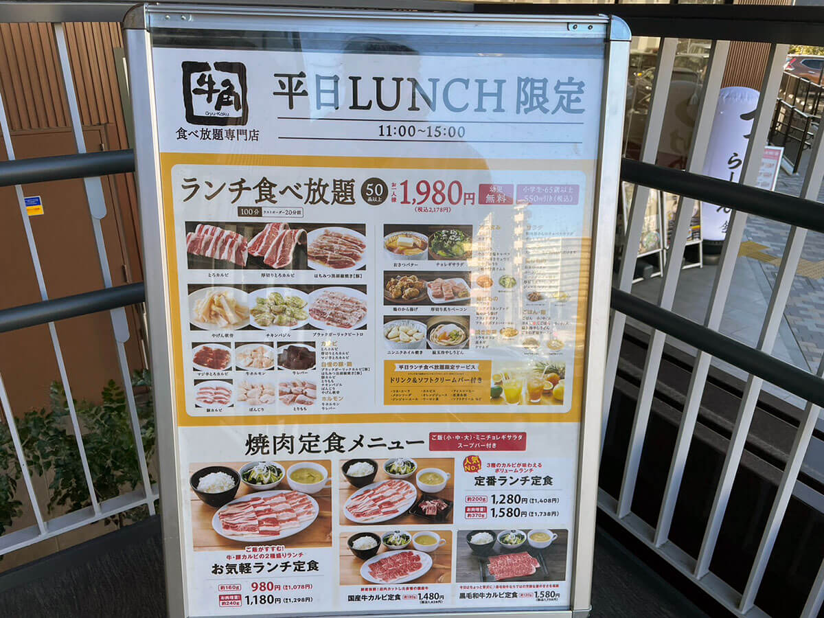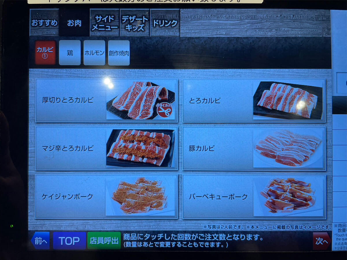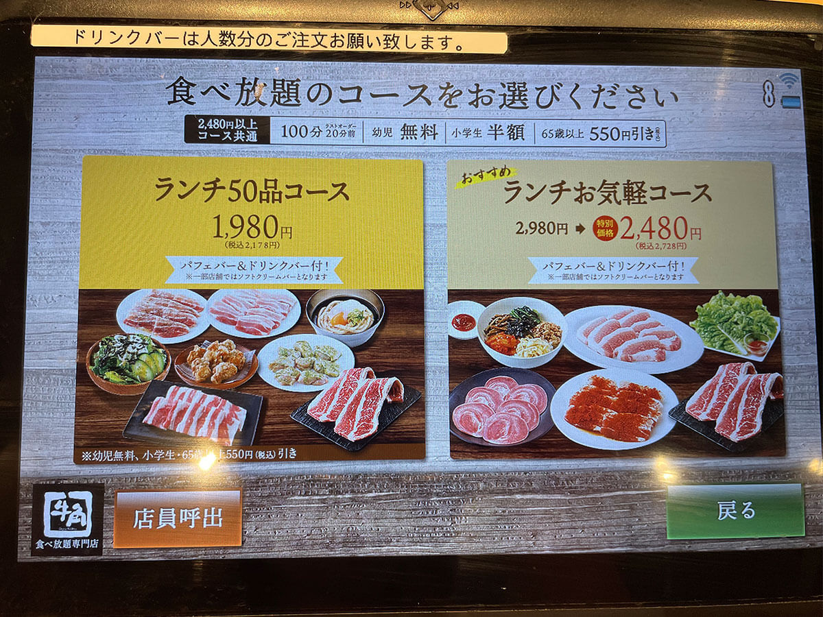 サイゾーウーマン暮らし食べ物牛角「2,178円食べ放題」に感動 暮らし ランチ食べ比べレビュー 黒字回復した【牛角】ランチ「2,178円食べ放題」は【焼肉きんぐ】より断然、「上」と言えるワケ 2024/06/15 17:00 仲宗根由紀子(エンタメライター) ランチ食べ比べレビュー牛角 牛角食べ放題専門店の外観(C)サイゾーウーマン 今日は昼からガツンといきたい気分……そんなときに食べたくなるのが“焼肉ランチ”ですよね。焼肉チェーン「牛角」が全国展開する「牛角食べ放題専門店」では平日ランチタイム限定のお得な食べ放題があると耳にしたので、早速足を運んでみました! ※2024年5月14日公開の記事を再編集しています。 ※価格はすべて税込。 ※価格やメニューは2024年5月10日時点の情報です。 ※店舗によって価格やメニューおよびシステムが異なることがあります。 ※最新の情報は公式サイトや公式SNSをご確認ください。 目次 ・牛角、売上高で焼肉きんぐに惨敗 ・2,178円「ランチ50品コース」を注文 ・牛カルビなど肉を次々と注文! ・ドライフルーツかけ放題に感動 ・ランチタイムなのに客1人 ・焼肉きんぐより味は上か 【牛角】店舗数1位も……売上高シェアで2位に転落 店舗数日本一を誇る牛角が展開する牛角食べ放題専門店は、平日ランチタイム限定(今回訪れた店舗は午前11時~午後3時)の食べ放題コースを提供しています。 平日ランチ食べ放題の看板(C)サイゾーウーマン 平日ランチ限定の食べ放題コースは、以下の2種類。 ・「ランチ50品コース」2,178円 ※小学生未満は無料、小学生と60歳以上は550円引き ・「ランチお気軽コース」2,728円 ※小学生未満は無料、小学生は半額、60歳以上は550円引き どちらも牛・豚・鳥の焼肉やサイドメニューが食べ放題なだけでなく、「ドリンク&パフェバー」(一部店舗ではドリンク&ソフトクリームバー)も付いています。 なお、2023年版「焼肉チェーンの店舗数ランキング」(22年7月~23年7月、日本ソフト調べ)によれば、店舗数1位は571店舗の牛角で、2位が焼肉きんぐの306店舗。 以前は売上高シェアで業界トップをひた走っていた牛角ですが、「焼肉チェーン店売上高シェアランキング」(富士経済「外食産業マーケティング便覧2023」より)では2位に転落。昨年は焼肉チェーン業界において焼肉きんぐの独り勝ち状態が目立ち、牛角は一時600店舗以上あった店舗数も近年、減少傾向にあるようです。 しかし、牛角や大戸屋などを運営する株式会社コロワイドの2024年3月期連結決算(国際会計基準)は、最終損益が29億円の黒字(前の期は68億円の赤字)に。赤字から黒字に回復しました。 熾烈な競争が繰り広げられている同業界ですが、牛角の今を調査するため、早速店舗へ向かいます。 【牛角食べ放題専門店】2,178円「ランチ50品コース」を注文 開店直後の午前11時頃にお店に着くと、まだお客さんはいない様子。すぐにほかのお客さんが来ると思いますが、こういう状況って、1人でお店を独占するようで少しワクワクしません? コースを選ぶ画面(C)サイゾーウーマン 今回は、卓上のタブレットから2,178円の「ランチ50品コース」を注文。この店舗はスープバーも付いているため、早速スープとドリンクを取りに行きます。 この日は卵スープでした(C)サイゾーウーマン サラダ2種類(C)サイゾーウーマン お肉を頼む前に、「焼肉屋さんのキャベツサラダ」と「パリシャキ梅しそじゃこサラダ」を注文。今回は肉をたくさん食べて元を取りたいので、あえてごはんは頼まず、肉と野菜で攻める作戦をとります。 ちなみに、「パリシャキ梅しそじゃこサラダ」は牛角公式サイトに掲載されている「ランチ50品コース」の一覧に見当たらないので、ほかの店舗でも頼めるかどうかは不明。 焼肉と相性抜群のキムチ(C)サイゾーウーマン キムチも頼みましたが、量が多くてびっくり! これを見てフラッシュバックしたのが、先日筆者が訪れた「牛角焼肉食堂」のキムチです。 「牛角焼肉食堂」は牛角がプロデュースしているフードコート専門店なのですが、ここで「牛カルビ焼き定食」(1,012円)を頼んだところキムチが一切れしかついておらず、「メニュー写真と違う」と涙を飲んだばかり。 ちなみに、こちらが牛角焼肉食堂の「牛カルビ焼き定食」(C)サイゾーウーマン 同じ牛角系でも、お店によってここまで“キムチの盛り”が違うとは……。 非公開: 牛角の新業態【牛角焼肉食堂】が全国で急拡大! 1,012円「カルビ定食」の残念なポイントとは? 国内焼肉チェーン店舗数1位の「牛角」が近年、プロデュースしているフードコート専門店「牛角焼肉食堂」。近頃、全国で急拡大していると聞きつけ、食べに行ってきました!...サイゾーウーマン2024.05.02 【牛角食べ放題専門店】いよいよ肉を注文! カルビの注文画面(C)サイゾーウーマン いよいよ本日のメインであるお肉を頼んでいきます。 「ランチ50品コース」で頼める牛カルビは主に「厚切りとろカルビ」など3種類。このほかに、さまざまな味付けの豚肉や鶏肉、牛ホルモン