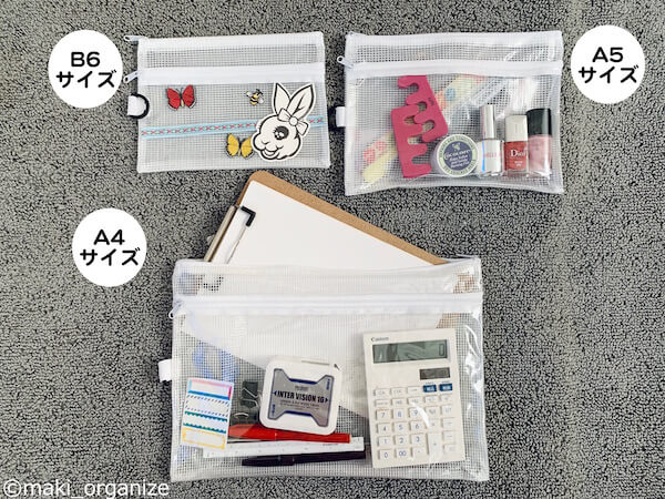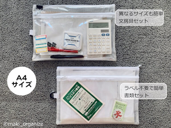 サイゾーウーマン暮らし100均・雑貨【ダイソー】「Wファスナー ビニールケース」収納例 暮らし 【ダイソー】収納アイデア 【ダイソー】110円「Wファスナー ビニールケース」、プロの使用例3! 持ち出し便利な収納テク 2024/07/01 13:00 伊藤まき(収納ライター) 伊藤まきの「お片付けSOS」相談ダイソー (C)GettyImages 整理収納アドバイザー・伊藤まきさんがサイゾーウーマンで連載中の「『お片付けSOS』相談!」。今回はダイソーの「Wファスナー ビニールケース」を再掲します。プロの収納実例は? ※2023年12月11日の記事を再編集したものです。 ※最新情報は公式サイトでご確認ください。 目次 ・【ダイソー】「Wファスナー ビニールケース」110円 ・「Wファスナー ビニールケース」使用例1 ・「Wファスナー ビニールケース」使用例2 ・「Wファスナー ビニールケース」使用例3 【ダイソー】「Wファスナー ビニールケース」110円 ケース全体は半透明、前ポケットのみ透明(C)サイゾーウーマン ダイソーの「Wファスナー ビニールネットケース」です。ポイントは、ポケットが2つに分かれていること。ファスナーは「I型」で、「L型」とは収納するモノの目的が変わります。 事務用品として知られるポーチですが、いろいろな場所で使える収納アイテム。奥深い魅力を発見できたらと思います。 【ダイソー】「Wファスナー ビニールケース」使用例1:「B6サイズ」は会計管理に便利 お薬手帳や母子手帳も、一度の出し入れで済む(C)maki_orgazenize 病院やパスポートの持ち出しに便利!(C)maki_organize B6サイズでは、家族の病院セットを作っておくと、ケースごと持ち出せて便利です。会計のあと、カードホルダーにカードを戻す作業やお薬手帳を取り出すのがラクになりますよ。 下のポーチは、生活のやりくり費セット。1週間分の予算を入れて、前のポケットにレシートを入れておきます。管理するという点では、海外旅行用のお財布やパスポートケースにするのも◎。 ダイソー「Wファスナー ビニールケース」使用例2:「A5サイズ」もグループ収納で便利 いろんなシーンで重宝します(C)maki_orgazenize 上は、子ども用のグルーミングセット。下は、仕事で使うボイスメモ用のセット。電池(前)とレコーダー(後)をまとめています。使うシーンが同じモノをまとめるほど、効率的になります。使う場所まで持ち出しやすく、準備の手間もかかりません。 【ダイソー】「Wファスナー ビニールケース」使用例3:「A4サイズ」は家電の保証書やパーツ収納に 前面が透明なので、中身も把握できる(C)maki_orgazenize A4サイズは、家中の書類の整理に、やっぱり便利です。家電の保証書とパーツのセット、カタログ資料と名刺などサイズの異なる資料もわかりやすく保管できます。ちなみに、取扱説明書はアプリで管理が楽なので処分してOK。 (C)maki_orgazenize 前面が透明なので、何をグルーピングしているかひと目でわかります。これこそ、整理収納で大事なポイント。回転率の高い生活を望む人には、コンパクトに“見える”収納法がベストマッチです。 ダイソー収納アイデア&アイテム人気記事(※画像クリックで記事に飛びます) ダイソー「蓋付き収納 BOX」商品番号:4549131634921ダイソーの「蓋付き収納 BOX」。大型クローゼットや押入れがない家でも機能的に収納ができる、便利なアイテムです。ジッパー付きの軽量サイズ(182g/ライター調べ)だから、高い場所に置いても片手で降ろせます。価格は330円(税込)ですが、無印良品の「ポリエステル綿麻混・ソフトボックス」(1,490円/同)の5分の1。 ダイソー「強力吸盤フック」「ミニ突っ張り棒」ダイソーの「強力吸盤フック」耐荷5kg(2P)と耐荷2kg(4P)、そしてミニ突っ張り棒(2P)。この2グッズがあるだけで、家中の困ったコトにかなり役立ちます。この強力吸盤フックは、ツルツルした面(タイル、ガラス、琺瑯など)に適しているので、トイレに使うのも便利。生理用品を入れたポーチや、流せるトイレブラシを吊り下げます。ミニ突っ張り棒は、床下から20〜30cmの場所がベスト。 ダイソー「ホッピングバッグ」商品番号:4549131306484ダイソーの「ホッピングバッグ」なら、使わない時は畳めて「かさばらない」ので、狭い空間を奪いません。イレギュラーなモノが増えた時も、サッと広げるだけで便利な収納ボックスへと変わります。ブランケットや羽織の収納ボックスとして。 あちこちに脱ぎ散らかした衣類も、簡単に回収できます。キッチンペーパーやトイレットペーパーなど、収納棚に入りきれなかったストック品もまとまります。ペットシーツやおむつの在庫入れなど、紙モノに最適 ダイソー「超強力マグネット」商品番号:4549131230475マルチに使える、ダイソー「超強力マグネット」。一般的な磁石に比べて、一度貼り付くと剥がすのも困難な磁力を誇ります。ティッシュケースにマグネットをつけたり、リモコンにつけたりすれば、簡単に壁面収納がかないます。このマグネットを使って自作したティッシュケースは、山崎実業のマ