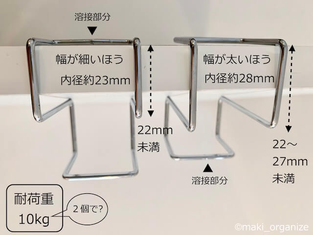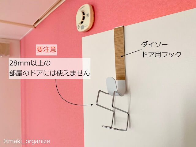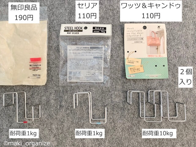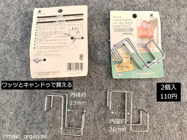 サイゾーウーマン暮らし100均・雑貨【キャンドゥ】110円「ドアにかけられるフック」 暮らし 【キャンドゥ】収納アイデア 【キャンドゥ】110円「ドアにかけられるフック」、万能片付け道具です! プロの使用アイデア6 2024/07/18 13:30 伊藤まき(収納ライター) 「お片付け・お掃除SOS」伊藤まき (C)サイゾーウーマン 整理収納アドバイザー・伊藤まきさんがサイゾーウーマンで連載中の「『お片付けSOS』相談!」。今回はワッツとキャンドゥで買えるおすすめ商品「ドアにかけられるフック」を再掲します。プロの収納実例は? ※2024年1月3日公開の記事を再編集したものです。 ※最新情報は公式サイトでご確認ください。 目次 ・【キャンドゥ】「ドアにかけられるフック」110円 ・使用例1:突っ張り棒を支える ・使用例2:ゴミ箱を分割可能 ・使用例3:本のディスプレイに ・使用例4:ドライヤーホルダーとして ・使用例5:ワイヤーネットに合わせて使う ・使用例6:ドア裏に使って収納力アップ 【キャンドゥ】「ドアにかけられるフック」110円 (C)maki_organize 筆者が「片付け道具」として常備している「Z型(角S型)フック」。数ある「Z型フック」のうち、ヘビロテしているのは「ワッツ」と「キャンドゥ」で買える「ドアにかけられるフック」です。 これを一番に選ぶ理由は、2個入りのコスパ。筆者宅でも数年以上に渡って使っていますが、とても頑丈で生活のあらゆるシーンで活用できます。 ・ワッツ「ドアにかけられるフック」(型番)027118 ・キャンドゥ「ドアにかけられるフック」(独自商品コード)4943273410359 見た目はほぼ同じですが、耐荷重の大きな差があります(C)maki_organize ワッツとキャンドゥのアイテム(C)maki_organize 「ドアにかけられるフック」は無印良品とセリアより耐荷重が強いと表記されているのもポイント。また、無印良品と同じく「上下のフック幅が5mm違う」ので、1個で2パターンの使用が可能。ま筆者宅でも数年以上使って、壊れることがなかったので頑丈だといえます。 2個入りならではの使用例があるので次より紹介します。 キャンドゥ「ドアにかけられるフック」使用例1:突っ張り棒を支える フック幅が広いから、ズレにくい(C)maki_organize ミニサイズの突っ張り棒を支える用途に使うことができます。100均の「タオルバー」があるので、このような使い方は必須ではありませんが、長めのサイズで使いたいときは便利だと思います。 キャンドゥ「ドアにかけられるフック」使用例2:ゴミ箱を分割可能 レジ袋の間口をガバッと開けられる(C)maki_organize 1つのゴミ箱を、2つの分別ゴミに分けて使うことができます。フックの幅が広いのでしっかりと支えてくれます。 キャンドゥ「ドアにかけられるフック」使用例3:本のディスプレイに プラスチックより、高見えのデザイン(C)maki_organize 壁に付けられる「ウォールバー」との相性も抜群です。飾りたい本のディスプレイや、リモコンホルダーとしても使えます。 キャンドゥ「ドアにかけられるフック」使用例4:ドライヤーホルダーとして かさばらないから、ゴチャゴチャ感もなし(C)maki_organize ドライヤーホルダーの「コード整理」に役立ちます。また、100均のドライヤーホルダーよりコンパクトでシンプルな点もおすすめです。ちなみに、湿気が強い場所で長く使うとサビがつきやすいので注意。換気の良い洗面所でこまめに確認すれば問題ないと感じます。 キャンドゥ「ドアにかけられるフック」使用例5:ワイヤーネットに合わせて使う ワイヤーネットのマス目とほぼ同じサイズ(C)maki_organize 100均のワイヤーネットとの相性もバツグン。マス目のサイズにぴったりなので、S字フックより横ブレや外れる面倒が少なく思います。写真上のように、ヘアアイロンホルダーとして支えても◎。 キャンドゥ「ドアにかけられるフック」使用例6:ドア裏に使って収納力アップ 何度でも使い回しが効くのも良いです(C)maki_organize 2個入りで110円(税込)なので、ドア裏の収納力アップも低予算で可能。粘着テープフックより、建具を傷めずに強く固定できる点がおすすめです。 最後に、「ワッツ」と「セリア」で買える「ドアにかけられるフック」の残念な点と注意ポイントを挙げます。 キャンドゥ「ドアにかけられるフックの欠点:大きな傷がつく (3)のイケアは内側にクッション付き(C)maki_organize 使いやすさ、コスパ、デザインと満点過ぎるフックですが「残念なこと」もあります。写真上のように、扉と枠の隙間に「大きな傷」が付きます。ほかの「Z型フック」より、丸みがあるスチールなので開閉時に凸凹の傷跡が刻まれます。 筆者宅では、ジェルパットや魔法のテープを挟んで使用したこともありますが、それも長く続きませんでした。そういった点では、(4)のセリア「ステンレスフラットコの字フック(2P)」が、隙間との接触が少ないスリムなデザインです。 キャンドゥ「ドアにかけられるフック」の欠点:28mmを超える扉は× 部屋のドア用ではありません(C)maki_organize 商品名から、部屋の「扉
