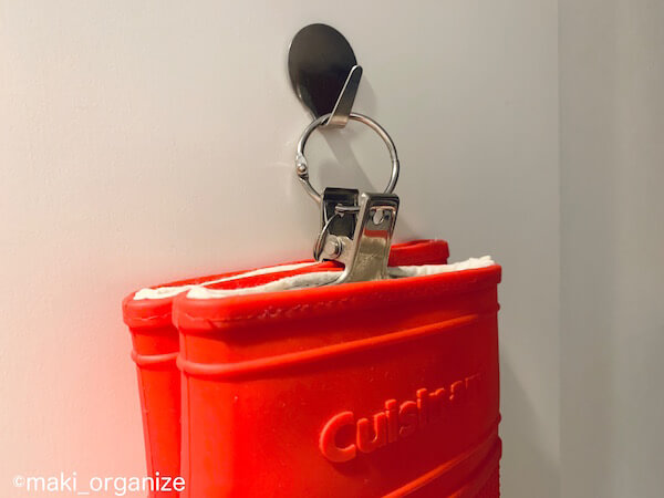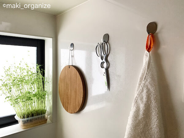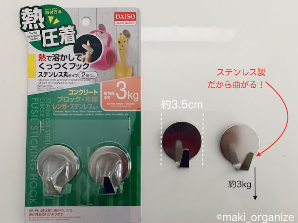サイゾーウーマン暮らし住まい【ダイソー】110円「熱で溶かしてくっつくフック」 暮らし 【セリア】収納アイデア 【ダイソー】110円のコレ、収納のプロが一番に愛用! 「空中収納」の使用アイデア3 2024/07/20 13:00 伊藤まき(収納ライター) 「お片付け・お掃除SOS」伊藤まき (C)GettyImages 整理収納アドバイザー・伊藤まきさんがサイゾーウーマンで連載中の「『お片付けSOS』相談!」。今回はダイソーの「熱で溶かしてくっつくフック」を紹介します。 ※2024年1月25日公開の記事を再編集しています。 目次 ・【ダイソー】110円「熱で溶かしてくっつくフック」 ・使用実例1 ・使用実例2 ・使用実例3 ・「熱で溶かしてくっつくフック」取り外し方 【ダイソー】110円「熱で溶かしてくっつくフック」 ステンレス製のシンプルデザイン!(C)maki_organize ダイソーの「熱で溶かしてくっつくフック」。100均フックの中では、個人的にも一番(!)愛用しています。 この商品が良い理由は、この4つ。 [1]強力だから落下しにくい [2]外回りの「空中収納」に最適 [3]フックの先端が曲がる [4]取り付け&外しも簡単! ただし、注意したい点もあるので、使用した実例を含めながら詳しく説明したいと思います。 ※最近は「両面テープバージョン」も出ました。 ダイソー「熱で溶かしてくっつくフック」使用実例1:キッチン周りに [筆者宅実例]キッチンパネルにも強く固定(C)maki_organize 写真上は、筆者宅のキッチンパネルです。 前回までに、フィルムシートフックを紹介していますが「長く強く固定したいモノ」に限っては、ダイソーの「熱で溶かしてくっつくフック」を使っています。もう5年以上も、この状態です。一度だけ自然落下しましたが、壁の傷は回避できました。 [筆者宅]食器棚のサイドに、オーブンミットを固定(C)maki_organize こちらの商品の注意点は、取り外す時に壁に傷や跡が残る恐れがあること。なので、この場所に強く固定したいという覚悟を持って使います。 例えば、筆者宅では食器棚のサイドに3つ付けていますがプリント合板なので塗装面も剥がれる可能性があります。それでも、頑丈なのでとても満足しています。 ダイソー「熱で溶かしてくっつくフック」使用実例2:外回りの「空中収納」に 角に立てかければ、ゴミが溜まります。(C)maki_organize 家の外回り(玄関、ベランダ、駐車場)は、モノを直置きすると砂埃などで汚れます。キレイを維持するコツは、地面に何も置かないこと! ダイソーの「熱圧着 熱で溶かしてくっつくフック」なら、凸凹の外壁もご覧の通り「空中収納」ができます。 傘も汚れずに、コンパクトに収納!(C)maki_organize 取り付け可能な場所は、コンクリート、ブロック、モルタル、スチール、木部、レンガ、タイル、ステンレス。NGは、壁紙や塗装など表面を剥がしてしまう恐れのある家具、建具、素材です。車の中など高温多湿な場所も不向きですが、割りと万能なフックです。 ダイソー「熱で溶かしてくっつくフック」使用実例3:止め金具として 先端が曲がるから使いやすい(C)maki_organize 空中に収納できる(C)maki_organize ダイソーの「熱で溶かしてくっつくフック」が扱いやすいのは、フックの先端が曲がること。写真のように、ワイヤーカゴを設置してペンチでかませると止め金具の役割も。玄関に置きたい、電源プラグ式の蚊取り線香もスッキリ収納できます。 ダイソー「熱で溶かしてくっつくフック」取り外し方 この投稿をInstagramで見る ・ #サイゾーウーマン #ダイソー #熱で溶かしてくっつくフック #熱圧着フック の付け方 付けたら、1日そのままに。 翌日になって固まってから、かけてください。 とるときは、ドライヤー温風を当てるだけ! ポロリとれたら成功。あと少しのときは。剥がすときに外壁塗装も引っ張られやすいのでご注意ください。(個人の使用レポ) #外構収納 #ベランダ収納 #傘収納 #掃除道具収納 #玄関まわりのお掃除 #玄関まわりの収納 #ほうきとちりとり 整理収納アドバイザー|伊藤まき|ito maki|東京(@maki_organize)がシェアした投稿 – 2020年 7月月5日午後10時11分PDT 使うときは、フック裏の粘着剤を30秒ほど火で炙って溶かし、粘着剤をつぶすように力強く固定します。剥がす時も簡単で、ドライヤーの温風を当て、ナイフやマイナスドライバーで外すだけ。スルッと取れますが、塗装が剥がれる心配があります。 ダイソー収納アイデア&アイテム (※画像クリックで記事に飛びます) ダイソー「蓋付き収納 BOX」商品番号:4549131634921ダイソーの「蓋付き収納 BOX」。大型クローゼットや押入れがない家でも機能的に収納ができる、便利なアイテムです。ジッパー付きの軽量サイズ(182g/ライター調べ)だから、高い場所に置いても片手で降ろせます。価格は330円(税込)ですが、無印良品の「ポリエステル綿麻混・ソフトボックス」(1,490円/同)の5分の1。 ダイソー「強力吸盤フック」「ミニ突っ張り棒」ダイソーの「強力吸盤フック」耐荷5kg(2P)と耐荷2kg(4P)、そしてミニ突っ張り棒(2P)。この2グッズがあるだけで、