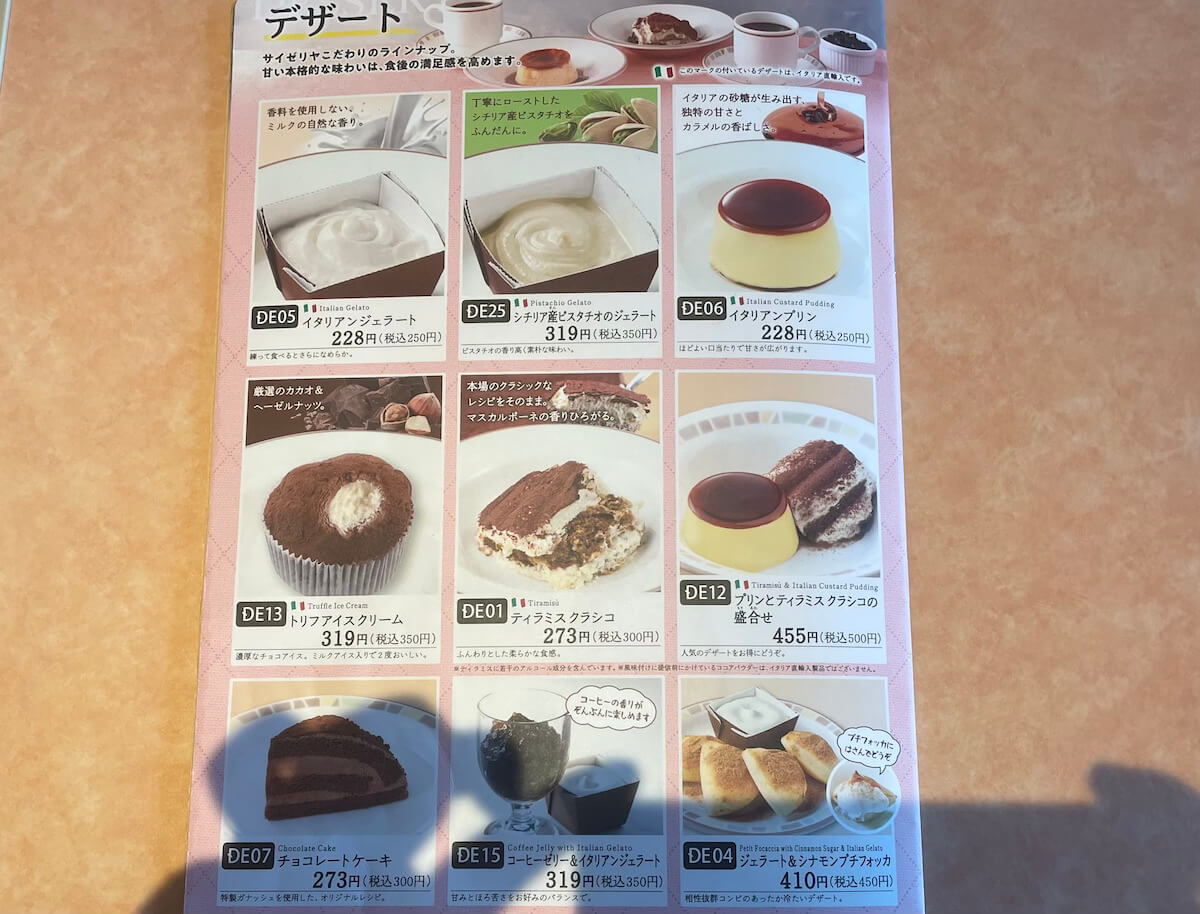 サイゾーウーマン暮らし食べ物【ジョリパ】デザートこそおすすめのワケ 暮らし ジョリーパスタ、実食レビュー 【ジョリーパスタ】冷製パスタだけじゃない、デザートこそ食べるべき理由とは? 2024/07/28 13:00 サイゾーウーマン編集部 サイゼリヤ ジョリーパスタ外観(写真:サイゾーウーマン) 夏の期間限定メニューの冷やし麺がスタートしているパスタ専門チェーン「ジョリーパスタ」。店舗数302 とイタリアンチェーンではサイゼリヤに次ぐ業界第2位です。そんな「ジョリーパスタ」、実はデザートが人気な模様。実食してきました! ※2024年2月29日公開の記事を再編集しています。 ※価格や情報は24年2月29日時点のものです。 ※最新の情報は公式サイトや公式SNSをご確認ください。 目次 ・ジョリーパスタとは ・サイゼリアとジョリーパスタのデザートメニュー比較 ・ジョリーパスタ「ジョリパ特製ミスト」実食 ・デザートはサイゼリヤより断然ジョリーパスタを選ぶ! ジョリーパスタとは ジョリーパスタ外観(写真:サイゾーウーマン) ジョリーパスタは、すき家、なか卯などを展開するゼンショーグループの一つ。 パスタをメインにピザやドルチェも扱うチェーン店で、第1号店を東京都世田谷区に出店後、全国302店舗(22年3月31日時点)に拡大した人気店です。 定番メニューのほかに、冷製パスタやスープパスタなど季節ごとの特別メニューも提供し、いつ行っても目新しい季節メニューが展開されているのも魅力です。 現在は季節限定メニューの「うにの冷製パスタ」を提供中。8月1日からは「和風冷製ローストビーフパスタ」も登場します。 【ジョリーパスタ】デザート数が20品、サイゼリヤはデザート激減 そんなジョリーパスタですが、実はデザートにも力が入っていて、評判も高い様子。 比較として、業界1位のサイゼリヤのデザートメニューをチェックすると全8品(※画像は昨年12月時点のメニューで、現在は「シチリア産ピスタチオのデザート」は販売していません)。 最安はイタリアンプリン(250円)、最高がプリンとティラミスクラシコの盛合せ(500円)です。 リニューアル前のメニュー。現在は「シチリア産ピスタチオのデザート」は販売していません(写真:サイゾーウーマン) 実は、サイゼリヤからデザートがどんどん減っていることに気がついていましたか? 調べたところ、パンナコッタシリーズやデザートフォカッチオは消滅し、熱いファンもついていたアイスケーキシリーズ(ティラミス、カプチーノ、季節限定でヘーゼルナッツやメリンガータなども)も22年を最後に消えたとか。 一方、ジョリーパスタのデザートメニューはこちら!(※画像は24年2月29日時点のメニューです) 豊富なメニュー。情報量も多い(写真:サイゾーウーマン) ジョリパのドルチェメニューは全20品。メニュー写真のほかに、公式サイトでは期間限定メニューも載っています。最安は「あまおう苺フロマージュ」(198円)、最高が「プレミアムドルチェミスト〜5種盛合せ〜」(759円)。 ジョリーパスタは圧倒的な品数で、価格もお手頃ですね。 【ジョリーパスタ】「ジョリパ特製ミスト」(539円)実食 今回は、デザートの盛合せ「ジョリパ特製ミスト」(539円)を頼みました。 「ジョリパ特製ミスト」(539円)(写真:サイゾーウーマン) ジョリパ特製ミストは、ティラミス、イタリアンプリン、パンナコッタの盛合せ。うれしいことに、イタリアンプリンをピスタチオプリンに無料で変更可能です! 今回はプレーンのイタリアンプリンのままにしました。 「ジョリパ特製ミスト」のティラミス(写真:サイゾーウーマン) ティラミスはマスカルポーネが濃厚! ブランデーが染み込んだ生地は、風味をしっかり感じつつもアルコール感は強くないので、サイゼリヤより子どもも食べやすそう。コーヒーにとっても合います。 「ジョリパ特製ミスト」のプリン(539円)(写真:サイゾーウーマン) プリンは一口食べて、もっちりねっとりの質感にびっくり! さらに味の濃厚さに、またびっくり! プリンというより、クレームブリュレを固めたようなクリーミーな味わい。 メニュー表によると「チーズケーキのような濃厚な味わいと、ねっとり硬めの食感にこだわってつくったドルチェ」とのこと。まさにその通り! 質量があるので、見た目よりも満足感があり、2人でシェアして食べてもよさそう。 さて、ティラミスとプリンの盛合せはサイゼリヤにもありますよね。それと比べると、2つのボリュームはサイゼと同程度。プリンのサイズも同じくらいですが、濃厚さとねっとりさではジョリーパスタのほうに分があるように思います。 「ジョリパ特製ミスト」のパンナコッタ(539円)(写真:サイゾーウーマン) 最後はパンナコッタ。フローズンのいちご、ブルーベリーが乗っています。パンナコッタをすくおうとしたら、驚きのプルンプルン具合!! ミルキーな甘さと酸味あるベリーソースがばっちり合います。 ティラミスとプリンときて、このほどよい酸味がいい仕事してます。ミルク味