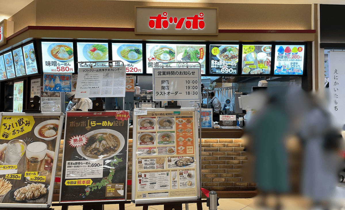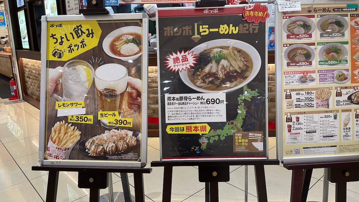 サイゾーウーマン暮らし食べ物【ポッポ】、新メニューに衝撃 暮らし 話題のチェーン店探訪 ヨーカドー系の絶滅危機【ポッポ】、新メニュー「熊本風豚骨らーめん」食べたら衝撃すぎた 2024/07/05 15:00 サイゾーウーマン編集部 イトーヨーカドーポッポ イトーヨーカドー(写真:サイゾーウーマン) イトーヨーカドー系列のファーストフードチェーン「ポッポ」。ヨーカドーの閉店ラッシュの中で、同店の行く末を心配する声も聞こえます。そんな「ポッポ」の新メニューを実食してきました。 ※2024年7月1日時点の情報です ※価格はすべて税込み ※最新情報は公式サイトやSNSをご確認ください 目次 ・【ポッポ】現在はわずか35店舗 ・【ポッポ】新登場メニュー「熊本風豚骨らーめん」 ・【ポッポ】新登場メニュー「熊本風豚骨らーめん」実食 【ポッポ】現在はわずか35店舗 セブン&アイ・ホールディングス傘下のイトーヨーカドーが運営するファストフードチェーン、ポッポ。全店がヨーカドー内にあります。販売メニューはらーめん、たこ焼、今川焼、ソフトクリーム、お好み焼、フライドポテトなどで、手頃な価格が支持されています。 1976年に1号店をイトーヨーカドーせんげん台店(埼玉県越谷市)に開店し、2008年4月時点で145店舗を展開していたそうですが、現在はわずか35店(2024年6月時点)。 今後、閉店が決まっているヨーカドーもあるため、さらに減少すると考えられます。 【ポッポ】新登場メニュー「熊本風豚骨らーめん」690円 ポッポ外観(写真:サイゾーウーマン) この日訪れたイトーヨーカドーの1階、フードコートの一角にポッポがありました。利用したのは土曜の午後6時という夕飯時。 「餃子の王将」「はなまるうどん」「バーガーキング」といった人気店と軒を並べる中、ポッポは健闘! 常に客足が途絶えることなく、時には数人の列もできていました。 アルコールメニューの提供も(写真:サイゾーウーマン) 店頭では「ちょい飲みポッポ」なる、アルコールメニューの紹介も。かなり気になりつつも、今回は新メニューに着目します。 公式サイトで「季節のおすすめ」として紹介されていた新メニュー「熊本風豚骨らーめん 濃厚黒マー油&絶品チャーシュー」(690円、税込)。同サイトによると、「マー油の香ばしい香りと深みのあるコクが豚骨スープの濃厚な味わいにマッチします。豚バラ肉を大釜でじっくりと煮込んだチャーシューも絶品です!」。 ちなみに、現在「ポッポらーめん紀行」という全国のご当地らーめんを取り上げるシリーズを展開しているもよう。いつからスタートして熊本で何回目なのかは不明ですが、前回は愛知県の「台湾らーめん」だったとか。 【ポッポ】新登場メニュー「熊本風豚骨らーめん」実食 オーダーしてから4〜5分ほどで提供された器がこちら。ひと目見て、「……なんか違う?」と思ってしまいました。 熊本風豚骨らーめん(写真:サイゾーウーマン) あらためてメニューの写真と見比べると、おそらくマー油が霧散してしまったようです。フードコートの呼び出しベルが鳴ってから取りに行ったのですが、その間に散り散りになってしまったのでしょう。 チャーシューは2枚(写真:サイゾーウーマン) マー油のほかは、写真と同じ。チャーシュー、ネギ、シナチク、きくらげ、もやしが乗っかっています。チャーシューはポッポの通常メニューのらーめんとは異なる長方形。普通のチャーシューは丸形です。 ポッポの醤油らーめん(写真:サイゾーウーマン) では、さっそくスープから口にしてみます。 濃厚なとんこつの味に加えて、にんにくの存在感がガツンと衝撃的! よく見るとスープの表一面にフライドガーリックが浮かんでいることに気が付きました。マー油について理解してなかったんですが、にんにくをメインにした香味野菜をラードで揚げて作った油のことなんですね。 絶対的ににんにくが口に入ってくることを避けられない量(写真:サイゾーウーマン) もやしはシャキシャキ、チャーシューは脂身の甘みを感じる満足感あるボリュームです。きくらげ、しなちくもそれぞれ歯ざわりがよく、具材のバランスは良いのではないでしょうか。 麺は通常のポッポが細くて縮れているのに対し、今回はとんこつらーめんでおなじみのストレートの細麺。 麺はとんこつラーメンの主流タイプでした(写真:サイゾーウーマン) 序盤は快調に食べ進めていたものの、残り6割くらいの時点で飽きがきてしまいました。というのも、食べても食べても、ひたすらににんにくの味……。 しなちくやねぎが味変のアイテムとしてかなり貴重な存在で、それらが尽きてしまうと持て余してしまいます。 筆者はそこそこにんにくは好きなほうではあるんですが、味変したくなったのが正直なところ。ネット情報によると、熊本らーめんは紅生姜やからし高菜を加えないのが正統とされてるようではありますが、ちょっと加えたくなりました。 にんにくが前面に出た味わいが衝撃すぎた「熊本風豚骨らーめ