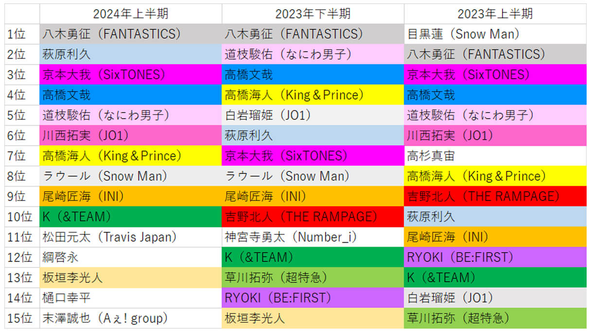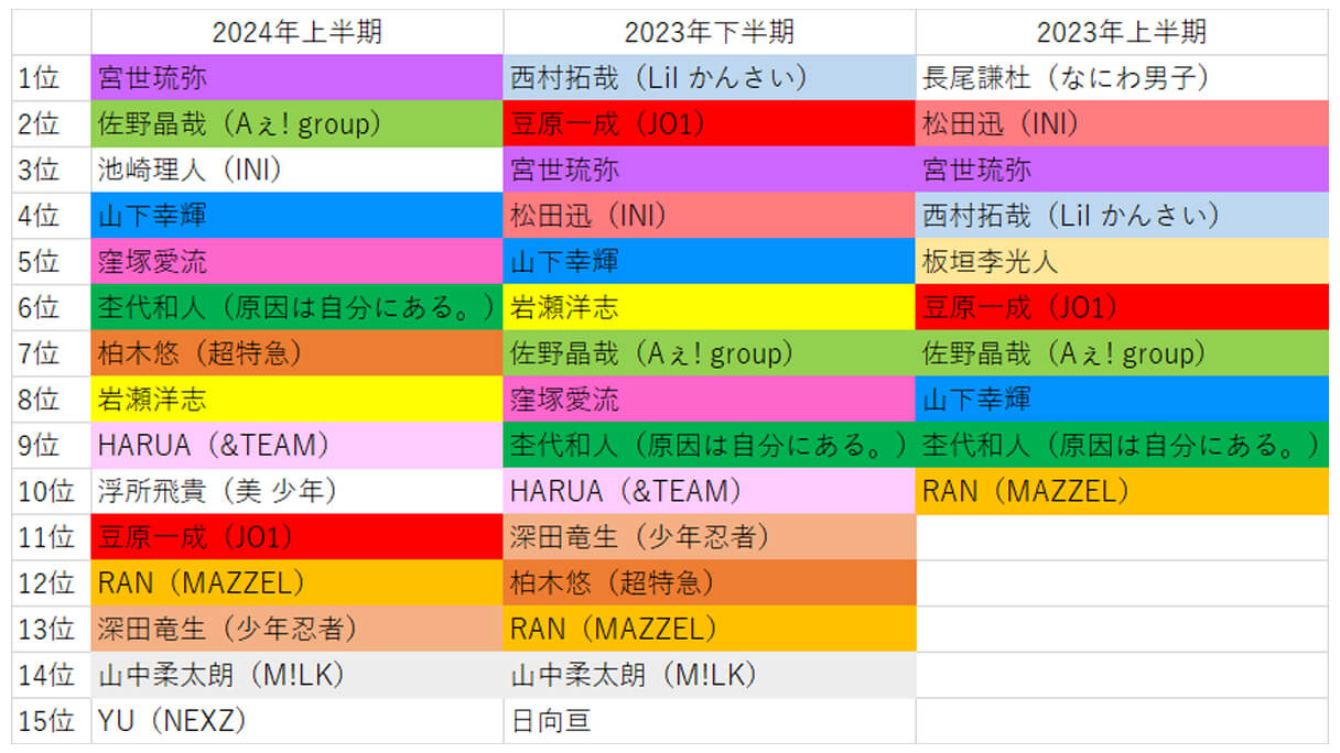 サイゾーウーマン男性アイドル「ViVi国宝級イケメンランキング」を分析 男性アイドル 編集部コラム 八木勇征が10万ポイント増で殿堂入り! 「ViVi国宝級イケメンランキング2024年上半期」の結果を分析 2024/07/18 21:00 サイゾーウーマン編集部 男性アイドル編集部コラムSTARTO 「ViVi」2024年09月号(講談社) ファッション誌「ViVi」(講談社)が半年に1回行っている人気企画「国宝級イケメンランキング」。公式サイトで行われたアンケートの集計結果と、2024年上半期の話題性・活躍度を考慮してポイント化し、ランキングを決定するというもので、7月16日に2024年上半期のランキング結果が発表されました。 この記事では、各部門の結果を詳しく分析していきます。 目次 ・「ViVi国宝級イケメンランキング2024年上半期」3部門の結果一覧 ・NOW部門、八木勇征がぶっちぎり ・NEXT部門、INI・池崎理人の躍進に注目! ・ADULT部門、STARTO勢がトップ3独占 「ViVi国宝級イケメンランキング2024年上半期」3部門の結果一覧 NOW部門 NEXT部門(22歳以下が対象) ADULT部門(30歳以上が対象) 1位 八木勇征(FANTASTICS) 宮世琉弥 山田涼介(Hey!Say!JUMP) 2位 萩原利久 佐野晶哉(Aぇ! group) 中島健人 3位 京本大我(SixTONES) 池崎理人(INI) 渡辺翔太(Snow Man) 4位 高橋文哉 山下幸輝 間宮祥太朗 5位 道枝駿佑(なにわ男子) 窪塚愛流 SKY-HI 6位 川西拓実(JO1) 杢代和人(原因は自分にある。) 白濱亜嵐(GENERATIONS) 7位 高橋海人(King&Prince) 柏木悠(超特急) 山下智久 8位 ラウール(Snow Man) 岩瀬洋志 瀬戸康史 9位 尾崎匠海(INI) HARUA(&TEAM) 赤楚衛二 10位 K(&TEAM) 浮所飛貴(美 少年) 澤本夏輝(FANTASTICS) 11位 松田元太(Travis Japan) 豆原一成(JO1) 12位 綱啓永 RAN(MAZZEL) 13位 板垣李光人 深田竜生(少年忍者) 14位 樋口幸平 山中柔太朗(M!LK) 15位 末澤誠也(Aぇ! group) YU(NEXZ) 5月9日~6月10日の約1カ月間、公式サイトで投票を受け付けていた2024年上半期の「ViVi国宝級イケメンランキング」は、上記のような結果となり、ボーイズグループ所属メンバーが多数ランクイン。 なお、それぞれの所属事務所を見ると、3部門合わせて、STARTO ENTERTAINMENT(旧ジャニーズ事務所)所属タレントは12名と最も多く、スターダストからは5名、LDHとLAPONEエンタテインメントは3名ずつ、BMSGとHYBE LABELS JAPANからはそれぞれ2名が15位内に入りました。 以下では、2023年上半期・下半期の結果を振り返りつつ、各部門の結果を詳しく見ていきます。 「ViVi国宝級イケメンランキング2024年上半期」NOW部門、FANTASTICS・八木勇征がぶっちぎりで1位に 「国宝級イケメンランキング」で殿堂入りしたFANTASTICS・八木勇征(Getty Images) 複数回ランクインしているタレントを色別に示しています(C)サイゾーウーマン 「ViVi国宝級イケメンランキング」のメインともいえる「NOW部門」は、FANTASTICS from EXILE TRIBEの八木勇征が、40万8,776とぶっちぎりのポイント数で連覇を達成。2023年下半期の31万211ポイントから約10万数字を伸ばし、40万8,776ポイントでぶっちぎりでトップに立ち、めでたく「殿堂入り」を果たしました。 八木といえば、 凪良ゆう氏のボーイズラブ小説(徳間書店)を実写化し、昨年4月には映画も公開された主演ドラマ『美しい彼』シリーズ(TBS系)がきっかけでブレーク。その人気は国内にとどまらず、海外でも多くのファンを獲得しています。 以降、多くの作品に出演しており、主演映画『矢野くんの普通の日々』(11月予定)、『僕らは人生で一回だけ魔法が使える』(来年予定)の公開がそれぞれ控えるなど大活躍なだけに、1位は納得の結果といえるでしょう。 なお、その『美しい彼』でダブル主演を務めた萩原利久は、32万2,491ポイントで前回から4ランクアップし2位に。カップル役を演じた2人の今後の活躍ぶりに期待したいところです。 「ViVi国宝級イケメンランキング2024年上半期」NEXT部門は、INI・池崎理人の躍進に注目! 複数回ランクインしているタレントを色別に示しています(C)サイゾーウーマン 22歳以下が対象の「NEXT」部門は、前回、前々回に3位だった宮世琉弥が13万8227ポイントを稼ぎ、2ランクアップで1位に輝きました。 宮世は3月公開の映画『恋わずらいのエリー』で原菜乃華とダブル主演を務め、4月期放送のドラマ『くるり〜誰が私と恋をした?〜』(TBS系)では生見愛瑠の元恋人の年下男子役を好演したのが記憶に新しいところ。「ViVi」編集部からは、「小年感と色気の最強ブレンド 究極の“年下系男子”ついに次世代の頂へ」と評されています。 そのほか、「NEXT」部門で注目すべきは3位のINI・池崎理人の躍進ぶりです。低音イケメンボイスを生かし、グループではラップを担当している彼は、目鼻立ちがくっきりとした整った顔立ちで、今回、「国宝級イケメンランキング」に初登場。個人でのドラマやバラエティ出演の機会は少ないだけに、今後露出が増えれば、さらなる人気を得られそうです。 「ViVi国宝級イケメンランキング2024年上半期」ADULT部門、STARTO勢がトップ3を独占 複数回ランクインしているタレントを色別に示しています(C)サイゾーウーマン 30歳以上を対象