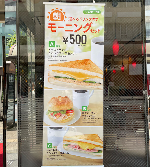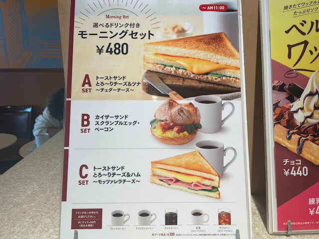 サイゾーウーマン暮らしトレンドベローチェ【500円モーニング】20円値上げ 暮らし モーニング食べ比べレビュー 【カフェベローチェ】500円モーニング、とろけるチーズサンドが名作! 20円値上げでも食べる価値あり! 2024/08/14 10:30 サイゾーウーマン編集部 モーニング食べ比べレビューベローチェ ベローチェ外観(C)サイゾーウーマン 喫茶店やファミレスなどが、朝の時間帯にドリンクとトースト等のメニューをお手頃価格で提供するモーニングサービス。今回はカフェチェーンの「カフェ・ベローチェ」でモーニングを楽しんできました。最近、480円から500円に値上げしたものの、その実力は? ※2024年2月12日公開の記事を再編集しています。 ※値上げに伴い価格を修正しました。 目次 ・ベローチェ モーニングセットメニューは3つ ・ベローチェ モーニングA SET 500円を実食! ・ベローチェ モーニングB SET を実食! ・ベローチェ モーニングC SET 500円を実食! ・ベローチェ、電源とWi-Fiが使える 【カフェ・ベローチェ】モーニングメニュー・価格・サービス時間帯・カロリー (写真:サイゾーウーマン) ベローチェにやってきました。店外にしっかりとモーニングの案内があります。メニューは3種類。どれも税込み500円均一なのがわかりやすいですね。 【価格】ドリンクセット500円(税込み)、サンド単品300円 【サービス時間帯】〜午前11時 【A SET】 トーストサンド とろ~りチーズ&ツナ ~チェダーチーズ~ ツナ、チェダーチーズ、サラダほうれん草をサンドして焼き上げました。味のアクセントに、オリーブソースを合わせたホットサンドです。(カフェ・ベローチェ公式サイトより) セット ¥500 単品 ¥300 カロリー 関東/仙台397kcal、関西/広島/名古屋416kcal、福岡403kcal 【B SET】 カイザーサンド サラダチキン ~すりおろし野菜ソース~ 外はパリッと中はふんわりもっちり、石窯で焼き上げたカイザーパン。柔らかい鶏むね肉のサラダチキンとフレッシュなトマトに、玉ねぎ・人参・りんごなどの野菜の旨味がギュッと詰まったソースを合わせました。(カフェ・ベローチェ公式サイトより) セット ¥500 単品 ¥300 カロリー 268kcal 【C SET】 トーストサンド とろ~りチーズ&ハム ~モッツァレラチーズ~ ロースハム、モッツァレラチーズ、サラダほうれん草をサンドして焼き上げました。味のアクセントに、野菜の旨みを凝縮したトマト野菜ソースも加えています。素材の味わいが感じられる、彩りの良いホットサンドです。(カフェ・ベローチェ公式サイトより) セット ¥480 単品 ¥300 カロリー 関東/仙台358kcal、関西/広島/名古屋377kcal、福岡364kcal 【ドリンク】 ブレンドコーヒー・アメリカンコーヒー・アイスコーヒー・紅茶(ストレート/レモン)・アイスティー(ストレート/レモン)から選択。+50円でサイズLに変更(紅茶はLサイズなし) 【カフェ・ベローチェ】 モーニングA SET 500円を実食! A SET「トーストサンド とろ~りチーズ&ツナ ~チェダーチーズ~」、飲み物はブレンドコーヒーを選びました。 注文してから調理を始めるようで、トーストサンドが提供されるまで1~2分レジ横でスタンバイ。トーストしているところが見えてワクワクします。 思ったよりトーストは大きめサイズ(写真:サイゾーウーマン) デデーン!!! チーズがすごい!! 滝のように流れ落ち、下に接触するギリギリのラインでピタッと凝固しています。 チーズの重量感がヤバい(写真:サイゾーウーマン) パンは8枚切りの厚さ。手にするとズシッとした重みと、焼き立てのぬくもりを感じます。 断面を見るべく、手でちぎってみました。 ほうれん草がひょっこり(写真:サイゾーウーマン) サラダほうれん草が出てきました。写真ではとても見えにくいのですが、マヨネーズ味のツナもたっぷり入ってます。 手でちぎったら断面がガタガタになってしまった(写真:サイゾーウーマン) 「とろ~りチーズ&ツナ」の名の通り、チーズのとろ~り具合がすごい! 実際に食べると、チーズが口中に広がりとにかく幸せ。 パンの耳のほうはサクサクですが、中央にいくほどチーズと一体化してしっとりしてきます。そこに、なめらかなツナととろとろのチーズが加わると、もはや噛まずに飲み込めてしまうほど。こんなに柔らかいチーズサンドは初めて食べました。 はっきり言って、チーズサンド界における名作でしょう! とろ~りチーズがお好きな方は、早起きしてでも食べる価値は十分にありますよ! なお関東・仙台、関西・広島・名古屋、福岡でA SET「トーストサンド とろ~りチーズ&ツナ ~チェダーチーズ~」のカロリーが異なるので、もしかしたら使用しているチーズやツナなどに地域差があるのかもしれません。 【カフェ・ベローチェ】B SET「カイザーサンド スクランブルエッグ・ベーコン」実食! ※現在「カイザーサンド スクランブルエッグ・ベーコン」は提供していません。値上げに伴い「カイザーサンド サラダチキン ~すりおろし野菜ソース~」に変更になりました。 B SET「カイザーサンド スクランブルエッグ・ベー