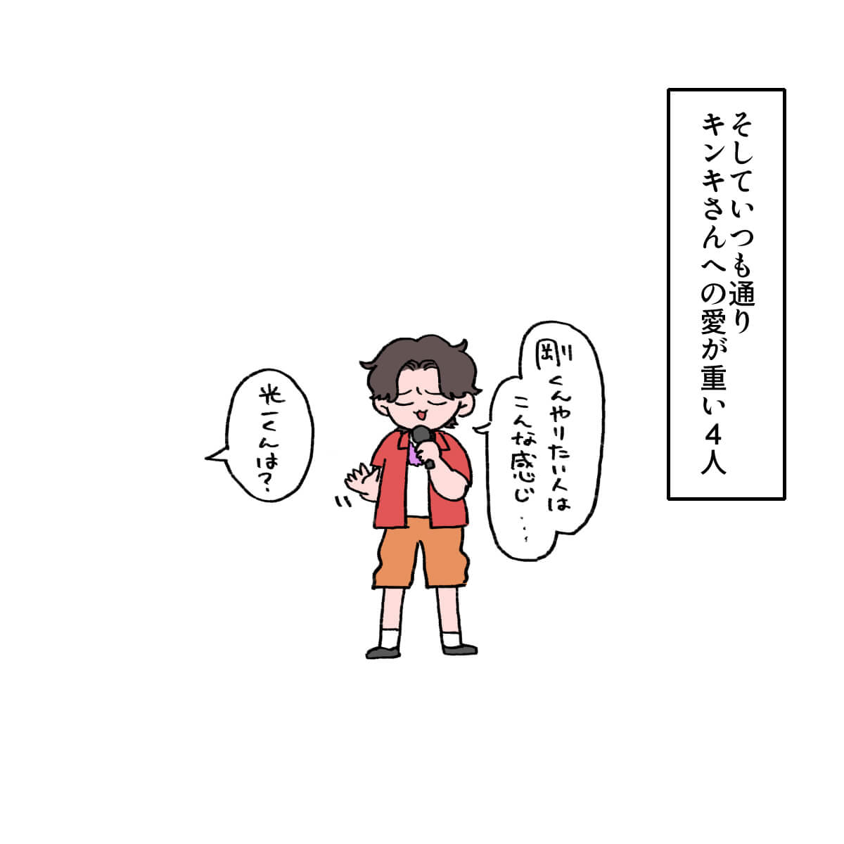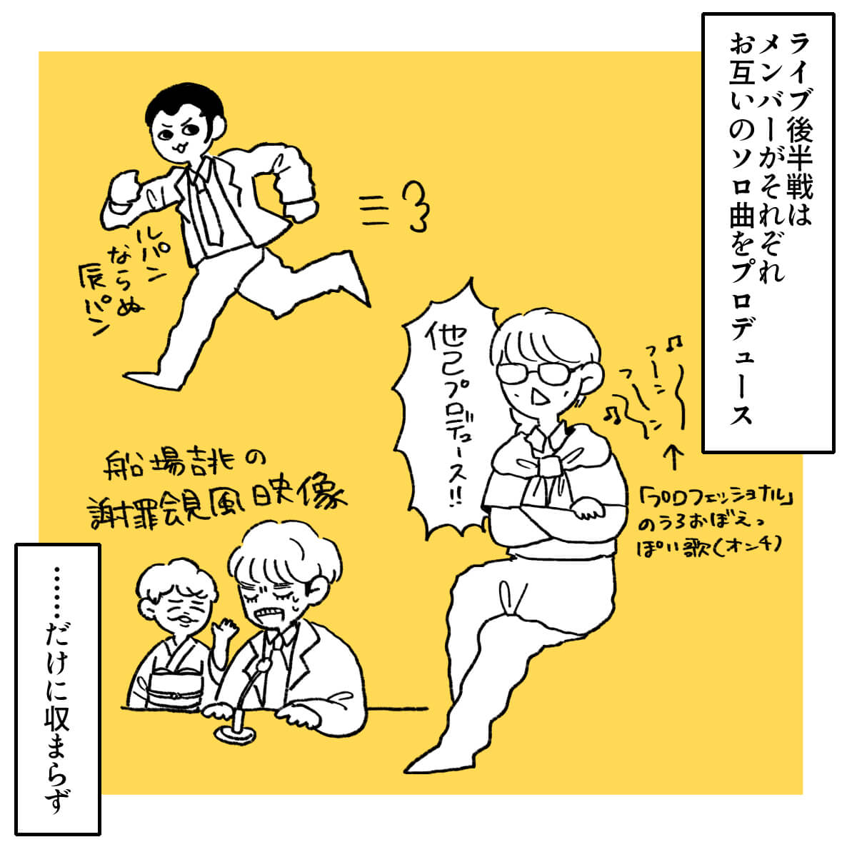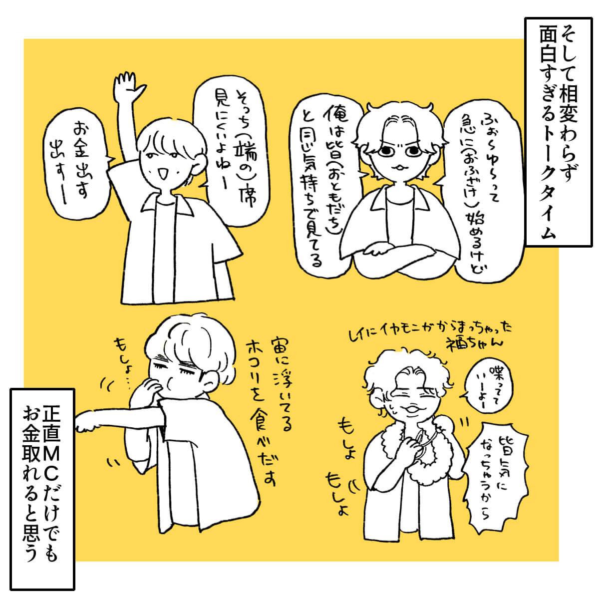 サイゾーウーマン男性アイドルSTARTO(旧ジャニーズ)ふぉ~ゆ~初の夏ライブ『PANIC』レポ 男性アイドル [ドルオタ漫画家・竜田トキヒロの“推し事”見聞録]vol.67 Snow Man・岩本照の振り付けがさすが! ふぉ~ゆ~初の夏ライブ『PANIC』レポ 2024/08/08 12:30 竜田トキヒロ(マンガ家) ふぉ~ゆ~竜田トキヒロの“推し事”見聞録STARTO ――Twitterで日々、ジャニーズタレントにまつわるイラストを投稿中のジャニオタ漫画家・竜田トキヒロが、現場レポートからドラマや映画、番組レビューまで、“推し事”の様子をお届け! 今回は、舞台を中心に活躍する4人組グループ・ふぉ~ゆ~のコンサート『ふぉ~ゆ~ LIVE TOUR 2024 “PANIC”』東京公演(TOKYO DOME CITY HALL)の模様をレポート! 福田悠太、辰巳雄大、越岡裕貴、松崎祐介の4人の「ゆう」からなるふぉ~ゆ~。2011年に結成され、CDデビューをしないまま、17年にジュニア(当時はジャニーズJr.)を卒業した彼らですが、その確かな実力はKinKi Kids・堂本光一ら先輩たちからも抜群の信頼を寄せられています。 19年の初単独コンサート以来、秋から冬にかけてライブを行うことが定番となっていた彼らにとって、初めての真夏の開催となった今回のライブ。いったいどんな内容になっていたのか、イラストと共に振り返っていきます。 目次 ・ふぉ~ゆ~初の夏ライブで感じた“最強感” ・ふぉ~ゆ~、KinKi Kidsへの愛が強すぎ!? ・客降り演出で越岡裕貴がファンの頭をなでる ・Snow Man・岩本照プロデュース曲も ふぉ~ゆ~、初の夏ライブ『PANIC』で感じた4人の“最強感” ふぉ~ゆ~、KinKi Kidsへの愛が強すぎ!? 堂本剛 のソロ曲披露 ふぉ~ゆ~・越岡裕貴がファンの頭をなでた! 客降り演出に感激 Snow Man・岩本照、自身の振付け曲でふぉ~ゆ~をプロデュース! 【ジャニオタマンガ】ふぉ~ゆ~の“ギャップ”にメロメロ! ライブ『HAPPY 4U.HOUR』レポ――Twitterで日々、ジャニーズタレントにまつわるイラストを投稿中のジャニオタ漫画家・竜田トキヒロが、現場レポートからドラマや映画、番組レビューまで、“推し事”の様子を...サイゾーウーマン2023.10.18 竜田トキヒロ(マンガ家) 漫画家、イラストレーター。育休中に執筆したエッセイ漫画でKADOKAWAコミックエッセイ大賞受賞。Ameba、ライブドア公式ブロガーを経たのち現在はインフルエンサーとしてエンタメ、オタクに特化した漫画やイラストや体験ルポ等幅広く執筆。著書『コミュ障母さんとごきげん娘』(KADOKAWA) X:@musumenuma 最終更新:2024/08/08 12:52 ジャニオタ、一度はふぉ~ゆ~現場経験すべき 関連記事 【ジャニオタマンガ】ふぉ~ゆ~の“ギャップ”にメロメロ! ライブ『HAPPY 4U.HOUR』レポBE:FIRSTの歌唱力の高さに「生で聞きた~い」と感動! アマプラ配信初ドームライブ映像レビューSnow Man・佐久間大介のダンスはさすが! BE:FIRST・SOTAは異次元すぎた『音楽の日』レビューキンプリ・高橋海人の体幹、BE:FIRST・SOTAの動きがすごい! 『THE MUSIC DAY』レビュー『それスノ』で『ひみつの嵐ちゃん!』「マネキンファイブ」が復活! 目黒蓮の“モテ男”コーデとは? 次の記事 【富士そば】賛否メニューを実食したら最高だった >