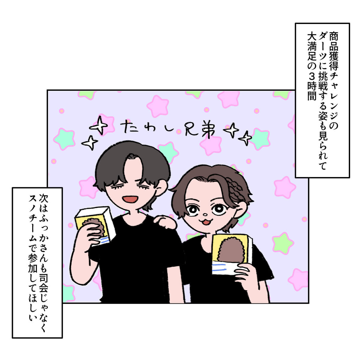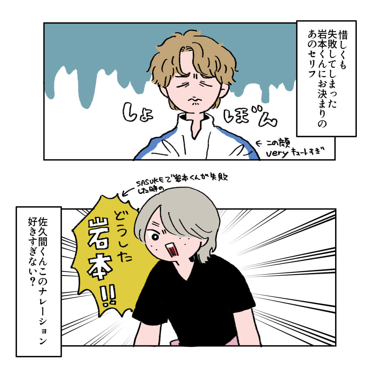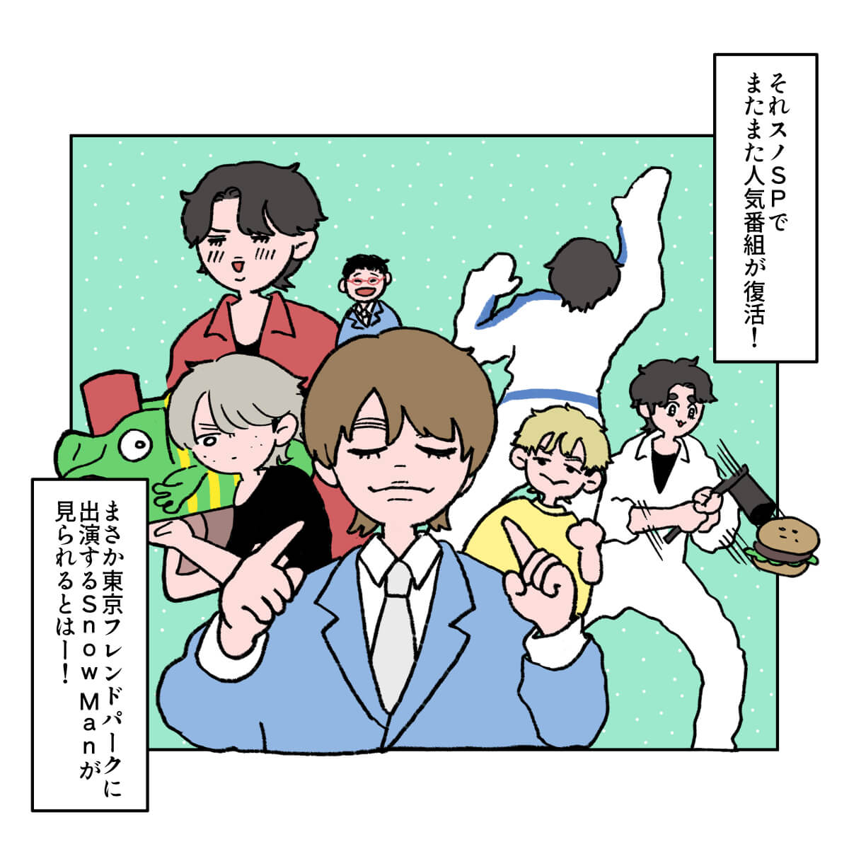 サイゾーウーマン男性アイドルSTARTO(旧ジャニーズ)Snow Man『それスノ』SP、目黒蓮がさすがだった! 男性アイドル [ドルオタ漫画家・竜田トキヒロの“推し事”見聞録]vol.68 『それスノ』の『東京フレンドパーク』復活! 目黒蓮のキメ顔が「さすが」のかわいさ! 2024/08/14 21:00 竜田トキヒロ(マンガ家) Snow Man竜田トキヒロの“推し事”見聞録STARTO ――Twitterで日々、ジャニーズタレントにまつわるイラストを投稿中のジャニオタ漫画家・竜田トキヒロが、現場レポートからドラマや映画、番組レビューまで、“推し事”の様子をお届け! 今回は、8月9日放送の『それSnow Manにやらせて下さい』3時間SP(TBS系)をレビュー! この日は、「『東京フレンドパーク』復活!レギュラー放送終了から13年…伝説のアトラクションにSnow Man初挑戦」と題し、かつて放送されていたゲームバラエティ『関口宏の東京フレンドパーク』(同)とコラボ。 深澤辰哉と南海キャンディーズ・山里亮太がMCを務める中、残りのSnow Manメンバー8人は、澤穂希、田中理恵、髙木菜那、村上佳菜子からなる「国民的女子アスリート」チーム、なかやまきんに君、関口メンディー、塚田僚一(A.B.C-Z)、RENAの筋肉自慢がそろう「筋肉バキバキ」チームと熱戦を繰り広げました。 トランポリンでジャンプして巨大な壁に張り付く「ウォールクラッシュ」、ザウルスの口から流れてくる光を台からジャンプして止める「フラッシュザウルス」などのおなじみの競技で、彼らがいったいどんな活躍を見せたのか、イラストと共に振り返っていきます。 目次 ・『それスノ』目黒蓮が「さすが」だったワケ ・佐久間大介ファンが沸いた場面とは? ・岩本照にメロメロ! 向井康二は〇〇姿が可愛い? 『それスノ』3時間SP、Snow Man・目黒蓮に「さすが」と感じたワケ Snow Man・佐久間大介ファンが沸いた、「カッコ良すぎ」な場面とは? Snow Man・岩本照にメロメロ! 向井康二は〇〇姿が可愛い? Snow Man・岩本照の振り付けがさすが! ふぉ~ゆ~初の夏ライブ『PANIC』レポ――Twitterで日々、ジャニーズタレントにまつわるイラストを投稿中のジャニオタ漫画家・竜田トキヒロが、現場レポートからドラマや映画、番組レビューまで、“推し事”の様子を...サイゾーウーマン2024.08.08 Snow Man・佐久間大介のダンスはさすが! BE:FIRST・SOTAは異次元すぎた『音楽の日』レビュー――Twitterで日々、STARTO ENTERTAINMENT(旧ジャニーズ事務所)のタレントをはじめとしたイラストを投稿中のドルオタ漫画家・竜田トキヒロが、現場レポー...サイゾーウーマン2024.07.24 『それスノ』で『ひみつの嵐ちゃん!』「マネキンファイブ」が復活! 目黒蓮の“モテ男”コーデとは?――Twitterで日々、STARTO ENTERTAINMENT(旧ジャニーズ事務所)のタレントをはじめとしたイラストを投稿中のドルオタ漫画家・竜田トキヒロが、現場レポー...サイゾーウーマン2024.07.03 竜田トキヒロ(マンガ家) 漫画家、イラストレーター。育休中に執筆したエッセイ漫画でKADOKAWAコミックエッセイ大賞受賞。Ameba、ライブドア公式ブロガーを経たのち現在はインフルエンサーとしてエンタメ、オタクに特化した漫画やイラストや体験ルポ等幅広く執筆。著書『コミュ障母さんとごきげん娘』(KADOKAWA) X:@musumenuma 最終更新:2024/08/14 21:00 『フレパ』定期的にやりそうな予感 関連記事 Snow Man・岩本照の振り付けがさすが! ふぉ~ゆ~初の夏ライブ『PANIC』レポSnow Man・佐久間大介のダンスはさすが! BE:FIRST・SOTAは異次元すぎた『音楽の日』レビュー『それスノ』で『ひみつの嵐ちゃん!』「マネキンファイブ」が復活! 目黒蓮の“モテ男”コーデとは?Snow Man・目黒蓮は令和のキムタク!? レベチな声援の大きさに驚いた『ウィアコン』配信レビュー『それスノ』ダンス企画第5弾、目黒蓮がいつにも増してかわいい! ここでしか得られない“栄養”とは? 次の記事 木村拓哉、アルバムの売り上げダウン >
