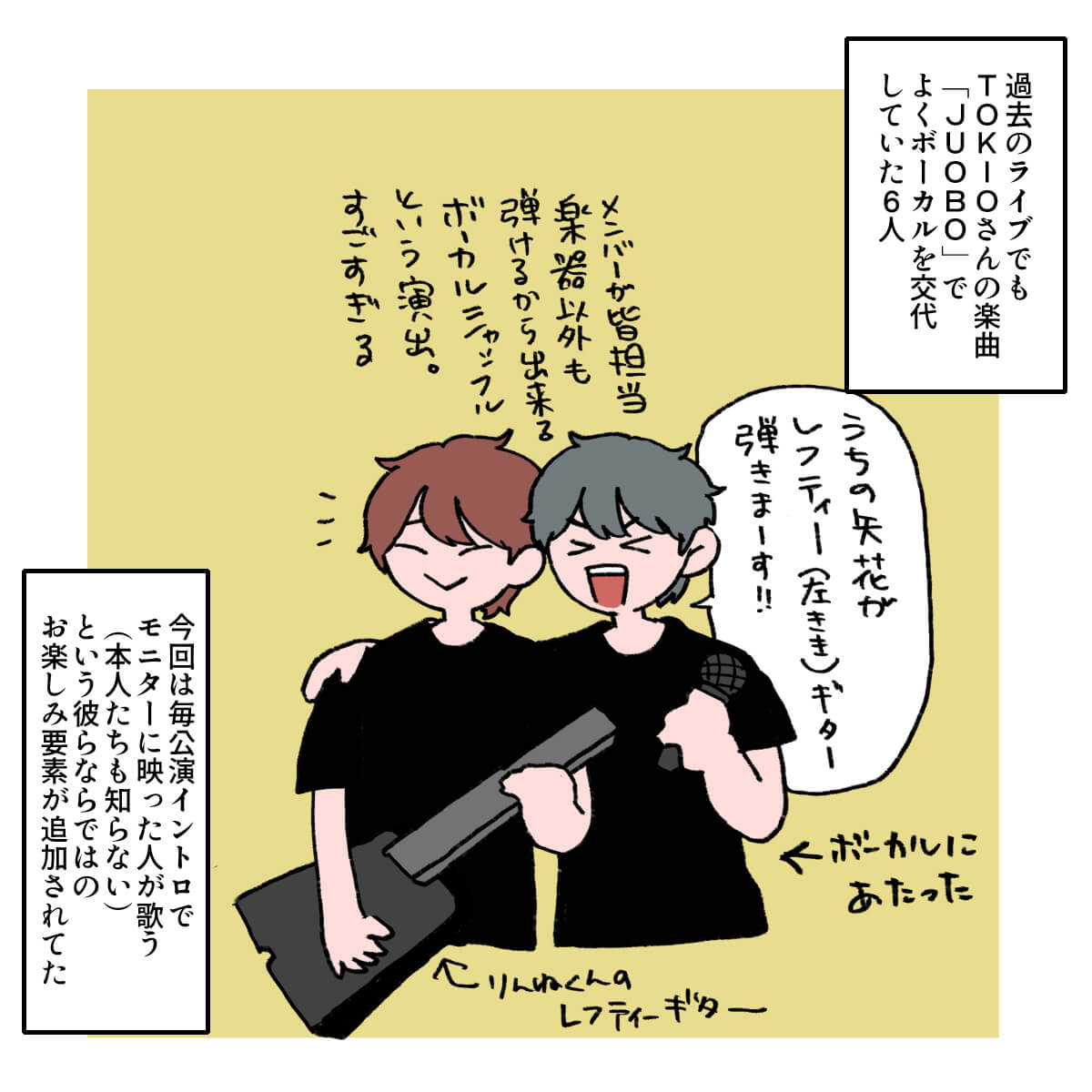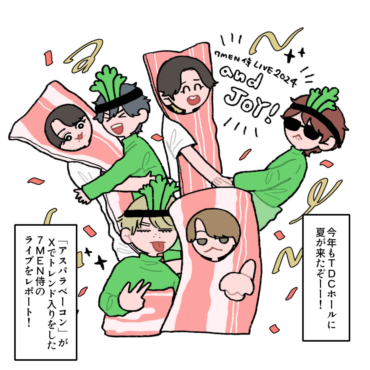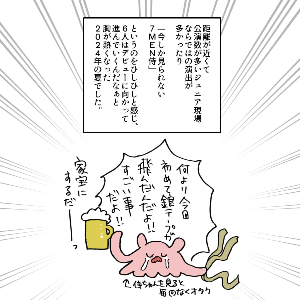 サイゾーウーマン男性アイドルSTARTO(旧ジャニーズ)ジュニア7 MEN 侍7 MEN 侍ホールツアー『and JOY!』レポ 男性アイドル [ドルオタ漫画家・竜田トキヒロの“推し事”見聞録]vol.69 7 MEN 侍・矢花黎ファンが思わず涙! 全国ホールツアー『and JOY!』東京公演レポ 2024/08/21 21:00 竜田トキヒロ(マンガ家) 7 MEN 侍竜田トキヒロの“推し事”見聞録STARTO ――Twitterで日々、ジャニーズタレントにまつわるイラストを投稿中のジャニオタ漫画家・竜田トキヒロが、現場レポートからドラマや映画、番組レビューまで、“推し事”の様子をお届け! 今回は、菅田琳寧、中村嶺亜、本高克樹、佐々木大光、今野大輝、矢花黎の6人からなるジュニア内ユニット・7 MEN 侍の初の全国ホールツアー『7 MEN 侍 LIVE 2024 and JOY!』の模様をレポート! 7月29日から東京・TOKYO DOME CITY HALLにて幕が上がった今ツアー。8月12日に東京公演、19日に静岡公演を終えた彼らはこの後、北海道、大阪、宮城、広島、福岡、愛知の計8都市をまわり、全46公演を行う予定です。 この記事では、矢花の24歳の誕生日当日に行われた公演の模様をイラストで振り返っていきます。 目次 ・7 MEN 侍の初の全国ホールツアー、セットが豪華に ・ワクワク演出多数でガチャ要素も ・矢花黎ファンが涙した誕生日演出とは? ・バンド演奏が中村嶺亜の魅力を引きたてる! 7 MEN 侍の初の全国ホールツアー『and JOY!』、セットが昨年よりも豪華に! ワクワク演出多数で、まるで“運ゲー”なガチャ要素も 7 MEN 侍・矢花黎ファンが思わず涙した、誕生日演出とは? 7 MEN 侍メンバーのバンド演奏が、メインボーカル・中村嶺亜の魅力を引きたてる! 『新しいカギ』のラウールが心配に? 7 MEN 侍は「ちいかわ」すぎた最新回レビュー――Twitterで日々、STARTO ENTERTAINMENT(旧ジャニーズ事務所)のタレントをはじめとしたイラストを投稿中のドルオタ漫画家・竜田トキヒロが、現場レポー...サイゾーウーマン2024.06.05 坂本昌行が7 MEN 侍に送った“何よりの褒め言葉”とは? 『GIFT for X』最終回イラストレポ――Twitterで日々、STARTO ENTERTAINMENT(旧ジャニーズ事務所)のタレントをはじめとしたイラストを投稿中のドルオタ漫画家・竜田トキヒロが、現場レポー...サイゾーウーマン2024.04.03 【ジャニオタマンガ】井ノ原快彦社長に思わず感謝? ジャニーズJr.・7 MEN 侍『サマパラ』レポ――Twitterで日々、ジャニーズタレントにまつわるイラストを投稿中のジャニオタ漫画家・竜田トキヒロが、現場レポートからドラマや映画、番組レビューまで、“推し事”の様子を...サイゾーウーマン2023.08.02 竜田トキヒロ(マンガ家) 漫画家、イラストレーター。育休中に執筆したエッセイ漫画でKADOKAWAコミックエッセイ大賞受賞。Ameba、ライブドア公式ブロガーを経たのち現在はインフルエンサーとしてエンタメ、オタクに特化した漫画やイラストや体験ルポ等幅広く執筆。著書『コミュ障母さんとごきげん娘』(KADOKAWA) X:@musumenuma 最終更新:2024/08/21 21:22 YouTube発の「アスパラベーコン」のあいさつが曲になるとはね 関連記事 『新しいカギ』のラウールが心配に? 7 MEN 侍は「ちいかわ」すぎた最新回レビュー坂本昌行が7 MEN 侍に送った“何よりの褒め言葉”とは? 『GIFT for X』最終回イラストレポ【ジャニオタマンガ】坂本昌行と7 MEN 侍がまるで“親鳥とヒヨコ”! 『GIFT for X』の見どころ【ジャニオタマンガ】中村嶺亜は「不動の皇帝」矢花黎は「軍師」! 7 MEN 侍ステマシート【ジャニオタマンガ】井ノ原快彦社長に思わず感謝? ジャニーズJr.・7 MEN 侍『サマパラ』レポ 次の記事 渋谷すばる、ミスチルら所属レコード会社に所属 >