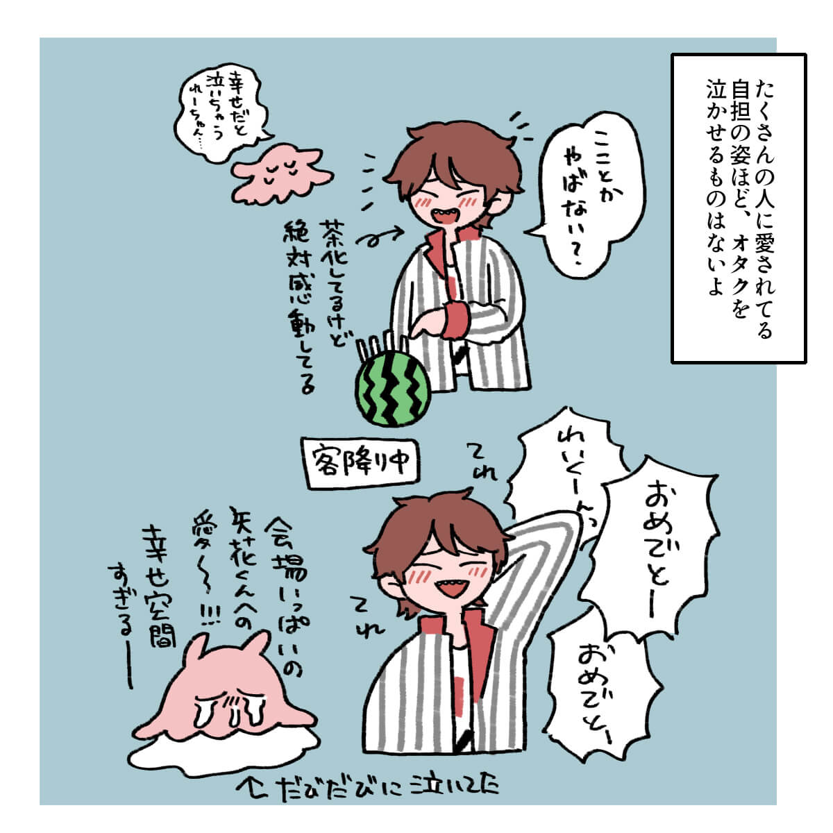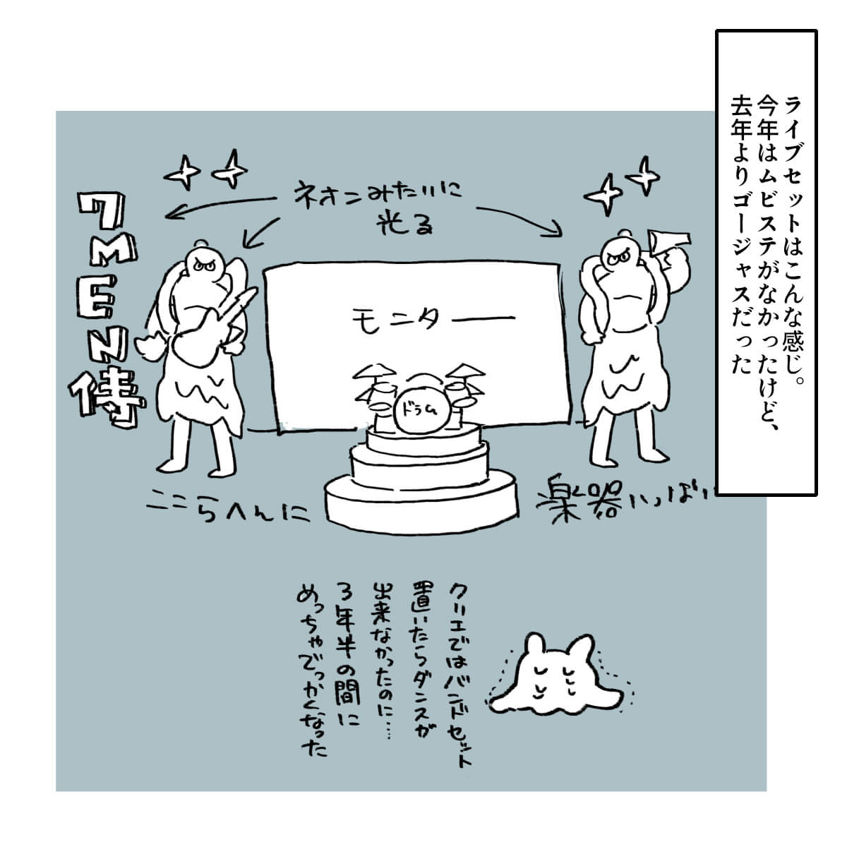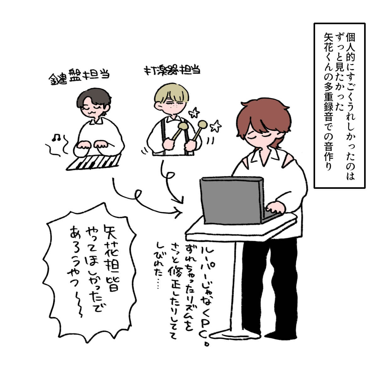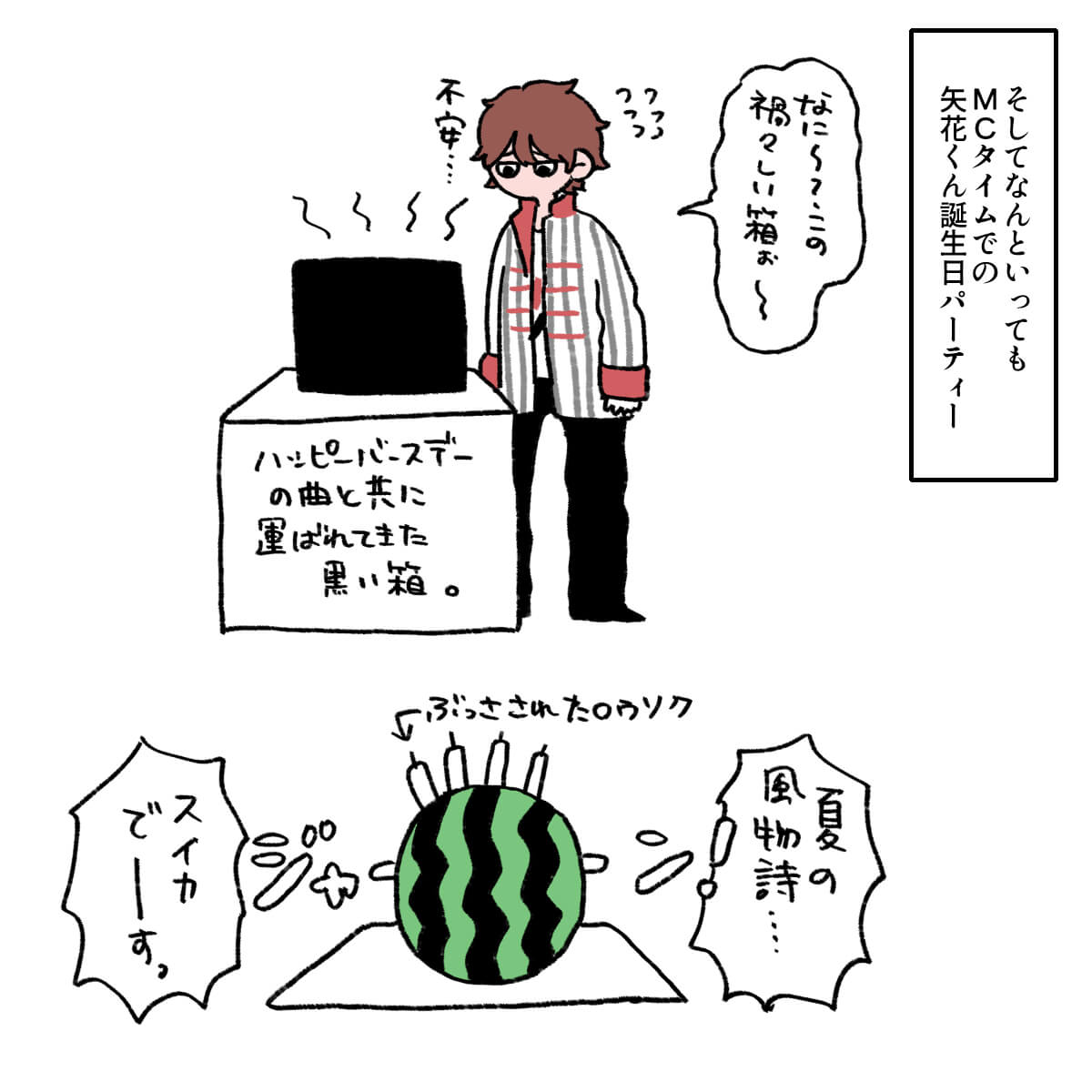 サイゾーウーマン男性アイドルSTARTO(旧ジャニーズ)ジュニア7 MEN 侍7 MEN 侍ホールツアー『and JOY!』レポ 男性アイドル [ドルオタ漫画家・竜田トキヒロの“推し事”見聞録]vol.69 7 MEN 侍・矢花黎ファンが思わず涙! 全国ホールツアー『and JOY!』東京公演レポ 2024/08/21 21:00 竜田トキヒロ(マンガ家) 7 MEN 侍竜田トキヒロの“推し事”見聞録STARTO ――Twitterで日々、ジャニーズタレントにまつわるイラストを投稿中のジャニオタ漫画家・竜田トキヒロが、現場レポートからドラマや映画、番組レビューまで、“推し事”の様子をお届け! 今回は、菅田琳寧、中村嶺亜、本高克樹、佐々木大光、今野大輝、矢花黎の6人からなるジュニア内ユニット・7 MEN 侍の初の全国ホールツアー『7 MEN 侍 LIVE 2024 and JOY!』の模様をレポート! 7月29日から東京・TOKYO DOME CITY HALLにて幕が上がった今ツアー。8月12日に東京公演、19日に静岡公演を終えた彼らはこの後、北海道、大阪、宮城、広島、福岡、愛知の計8都市をまわり、全46公演を行う予定です。 この記事では、矢花の24歳の誕生日当日に行われた公演の模様をイラストで振り返っていきます。 目次 ・7 MEN 侍の初の全国ホールツアー、セットが豪華に ・ワクワク演出多数でガチャ要素も ・矢花黎ファンが涙した誕生日演出とは? ・バンド演奏が中村嶺亜の魅力を引きたてる! 7 MEN 侍の初の全国ホールツアー『and JOY!』、セットが昨年よりも豪華に! ワクワク演出多数で、まるで“運ゲー”なガチャ要素も 7 MEN 侍・矢花黎ファンが思わず涙した、誕生日演出とは? 7 MEN 侍メンバーのバンド演奏が、メインボーカル・中村嶺亜の魅力を引きたてる! 『新しいカギ』のラウールが心配に? 7 MEN 侍は「ちいかわ」すぎた最新回レビュー――Twitterで日々、STARTO ENTERTAINMENT(旧ジャニーズ事務所)のタレントをはじめとしたイラストを投稿中のドルオタ漫画家・竜田トキヒロが、現場レポー...サイゾーウーマン2024.06.05 坂本昌行が7 MEN 侍に送った“何よりの褒め言葉”とは? 『GIFT for X』最終回イラストレポ――Twitterで日々、STARTO ENTERTAINMENT(旧ジャニーズ事務所)のタレントをはじめとしたイラストを投稿中のドルオタ漫画家・竜田トキヒロが、現場レポー...サイゾーウーマン2024.04.03 【ジャニオタマンガ】井ノ原快彦社長に思わず感謝? ジャニーズJr.・7 MEN 侍『サマパラ』レポ――Twitterで日々、ジャニーズタレントにまつわるイラストを投稿中のジャニオタ漫画家・竜田トキヒロが、現場レポートからドラマや映画、番組レビューまで、“推し事”の様子を...サイゾーウーマン2023.08.02 竜田トキヒロ(マンガ家) 漫画家、イラストレーター。育休中に執筆したエッセイ漫画でKADOKAWAコミックエッセイ大賞受賞。Ameba、ライブドア公式ブロガーを経たのち現在はインフルエンサーとしてエンタメ、オタクに特化した漫画やイラストや体験ルポ等幅広く執筆。著書『コミュ障母さんとごきげん娘』(KADOKAWA) X:@musumenuma 最終更新:2024/08/21 21:22 YouTube発の「アスパラベーコン」のあいさつが曲になるとはね 関連記事 『新しいカギ』のラウールが心配に? 7 MEN 侍は「ちいかわ」すぎた最新回レビュー坂本昌行が7 MEN 侍に送った“何よりの褒め言葉”とは? 『GIFT for X』最終回イラストレポ【ジャニオタマンガ】坂本昌行と7 MEN 侍がまるで“親鳥とヒヨコ”! 『GIFT for X』の見どころ【ジャニオタマンガ】中村嶺亜は「不動の皇帝」矢花黎は「軍師」! 7 MEN 侍ステマシート【ジャニオタマンガ】井ノ原快彦社長に思わず感謝? ジャニーズJr.・7 MEN 侍『サマパラ』レポ 次の記事 渋谷すばる、ミスチルら所属レコード会社に所属 >