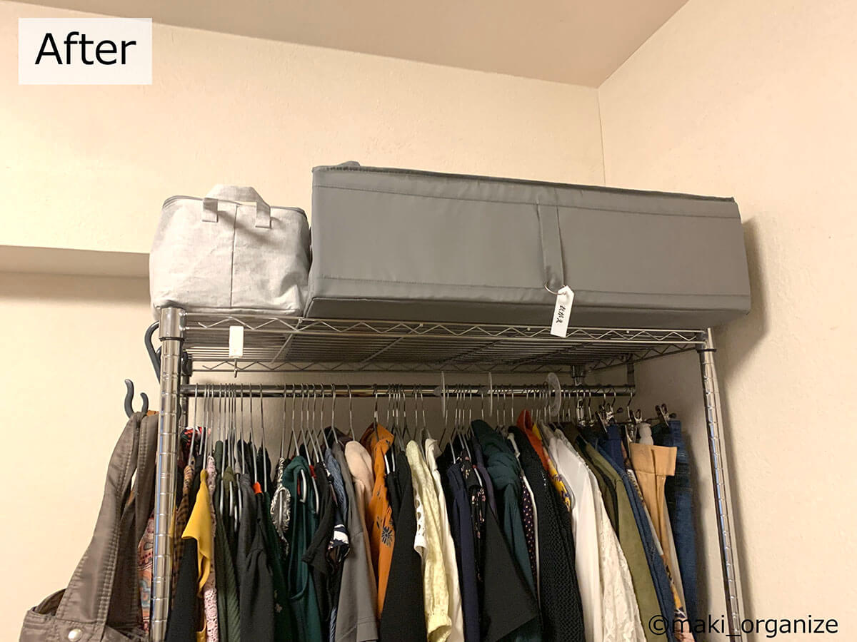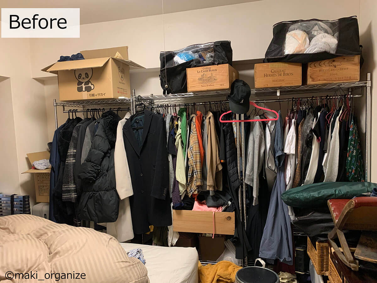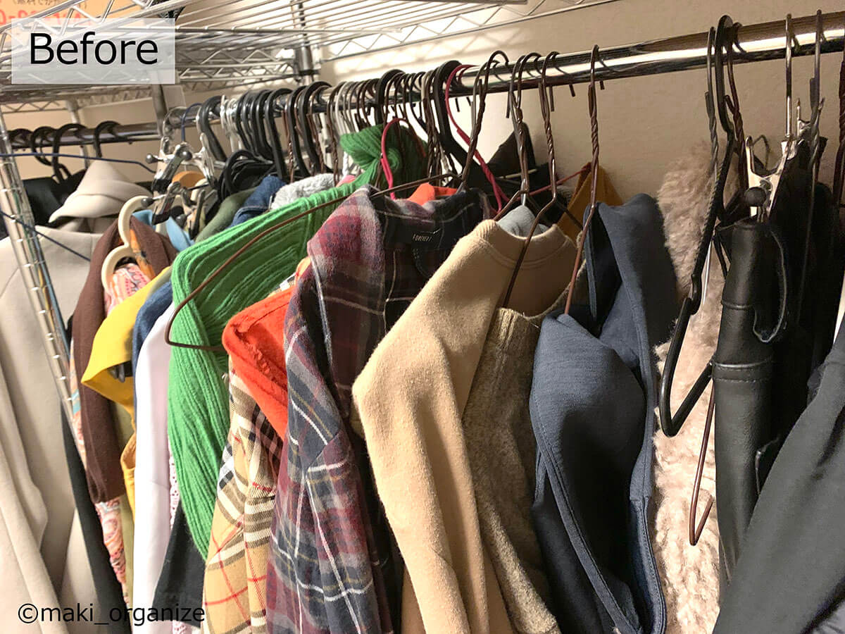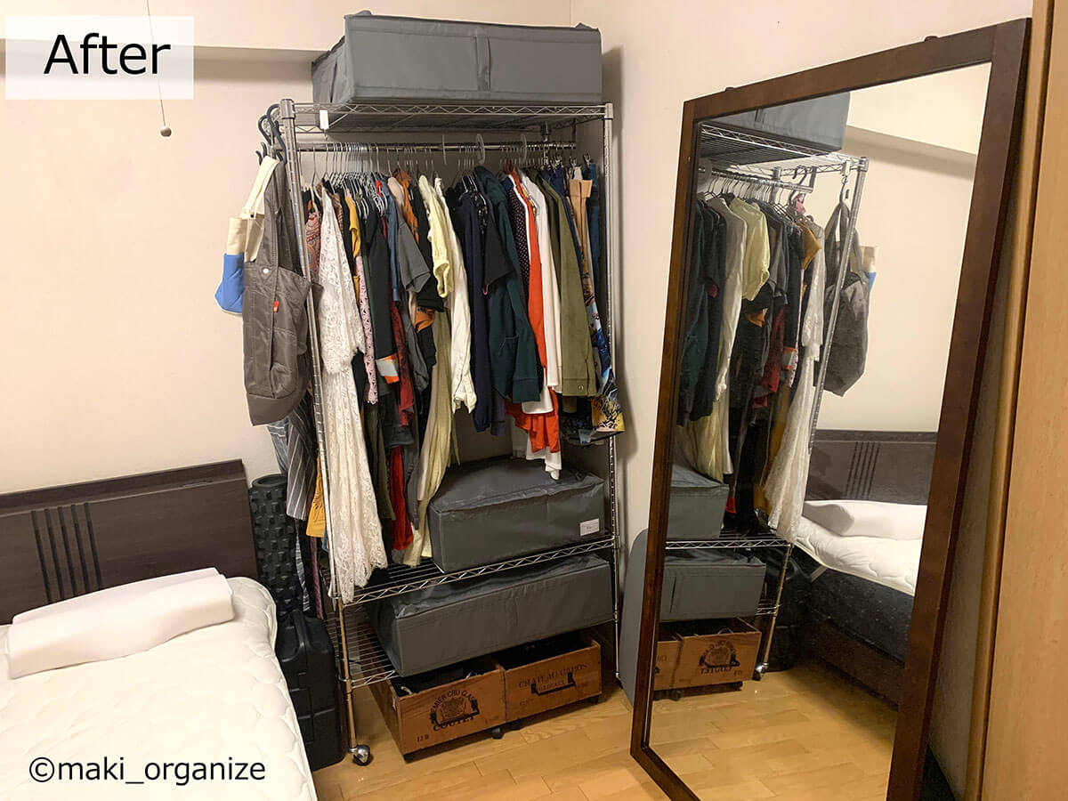 サイゾーウーマン暮らし住まい服のかさばり1/3!?プロの捨てない収納術 暮らし [連載]女たちの「煩悩部屋」ビフォーアフター 【洋服ラックビフォーアフター】かさばりが3分の1に!? プロが教える「捨てない」収納術 2024/09/11 17:00 伊藤まき(収納ライター) 「汚部屋」ビフォーアフター 整理収納アドバイザーの伊藤まきさんが、片付けに悩む読者の自宅を使いやすく生まれ変わらせる連載シリーズ【「煩悩部屋」ビフォーアフター】。 連載企画『ビフォーアフター』新シーズンです。第10回目の片付けモニターは、東京都世田谷区・1SLDKで暮らす3人家族のまいさん(32歳)。今回は、汚部屋の片付けではなく「リノベマンション」の収納を手直しする特別編です。 目次 ・【お悩み】洋服を捨てずに、寝室を広く見せたい ・【洋服を捨てない収納術】1~3 ・【洋服を捨てない収納術】4~6 ・【洋服を捨てない収納術】7~10 ・【まとめ】保管場所と収納法だけで解決! 【お悩み】洋服を捨てずに、寝室を広く見せたい 幅90cmのラックが3台も。歩くスペースがありません(C)maki_organize クライアントプロフィール ・まいさん(32歳) ・保育園の園長先生(フルワーク) ・育児系インフルエンサー“まい先生“としても活躍 ・3人家族 ・1SLDK ・中古マンションをリノベーション購入(持ち家) ・東京都世田谷区在住 収納に関する要望 ・掃除や片付けの頻度を少なくしたい ・子どもが自分で身支度できる仕組みを作りたい ・ベッドルームのレイアウトを変えたい ・シンプルに暮らしたいので、家具を増やしたくない 前回は強力突っ張り棚を使って、寝室のクローゼットを片付けました。今回は写真のワードローブ用ラックを中心に、「洋服を捨てない収納術」を紹介していきます。 【洋服を捨てない収納術1】吊るす収納から「たたむ収納」へ たためる服はクローゼット収納にしました(C)maki_organize 3台のラックから洋服を取り出して「季節と種類」で分類していきます。ワンピースやドレスシャツ、コート類を除いた洋服は「たたむ収納」に変更。クローゼットへ移動させることで、ラックが1台分空きました。 【洋服を捨てない収納術2】コートやスーツの「保管場所」を変える 秋冬/春夏の2シーズンに分けて衣替え(C)maki_organize 次に、秋冬のコート類、使用頻度が低いスーツやイベント服をリビングのクローゼットへ移動。さらに1台分のラックが空きました。保管場所を別の部屋に変更できない場合は、保管サービス付きのクリーニングやベッド下収納などを検討すると良いでしょう。 【洋服を捨てない収納術3】棚板を「cm単位」で調整して収納力UP! ゴムハンマーを用意すると作業が簡単です(C)maki_organize 収納法(たたむ)と保管先(別の部屋)を変えて、ラックが1台だけになりました。この段階で、「棚板の位置」をcm単位で調整し直します。2人で協力すれば、組み立てたままでも変更可能です。 【洋服を捨てない収納術4】キャスターを付けて「可動ラック」に ラック周りは「ほこり」が溜まりやすいため可動式が◎(C)maki_organize 棚の位置を調整したら、同ブランドのキャスター(別売り商品)を購入して取り付けます。可動式のラックに変更することで、寝室のレイアウトも自由自在に。風通しも良く、掃除も簡単になります。 【洋服を捨てない収納術5】最下段は「キャスター付きBOX」を! (Before)ワイン箱に書類や思い出の品がどっさりでした(C)maki_organize (After)ワイン箱に取っ手とキャスターをDIYで取り付け(C)maki_organize ラックの最下段にはキャスター付き収納ボックスを入れるのが正解です。お気に入りのワイン箱ということで、DIYで可動式に変更しました。ネジで取り付けるキャスターのほか、貼るだけタイプも100均にあります。 【洋服を捨てない収納術6】シーズンオフの洋服は「スリムケース」に収納 (Before)使っていない布団袋とメイクボックスは処分(C)maki_organize (After)縦横を変えたら2個置きも可能(C)maki_organize 段ボールや不織布袋に入っていた、シーズンオフの洋服や毛布類は「イケアの収納ケース」へ入れ替えました。高さ19cmなので、コンパクトにまとまります。 【洋服を捨てない収納術7】ハンガーは「スリムタイプ」に統一 (Before)ハンガーがバラバラだと「かさばり」が出る(C)maki_organize (After)いっきにつかみやすいので、衣替えも簡単になります(C)maki_organize ハンガーは同じサイズで揃えるほど収納力がUPします。今回はアマゾンなどで購入できる「すべらないPVC特殊ラバー加工」のスリムハンガーに統一し、洋服のかさばりを減らしました。 【洋服を捨てない収納術8】ラックのサイドで「小物収納」 サイド用の別売りパーツなどで使い方が広がる!(C)maki_organize ラックが1台になったので、サイドにS字フックを引っ掛け、バッグ類を収納できるようになりました。ほかにもワイヤーネットを設置すれば、帽子やアクセサリーなどの小物収納も可能になります。 【洋服を捨てない収納術9】最上段は「出し入れ」しやすさ重視 (Before)出し入れが困難なほど、