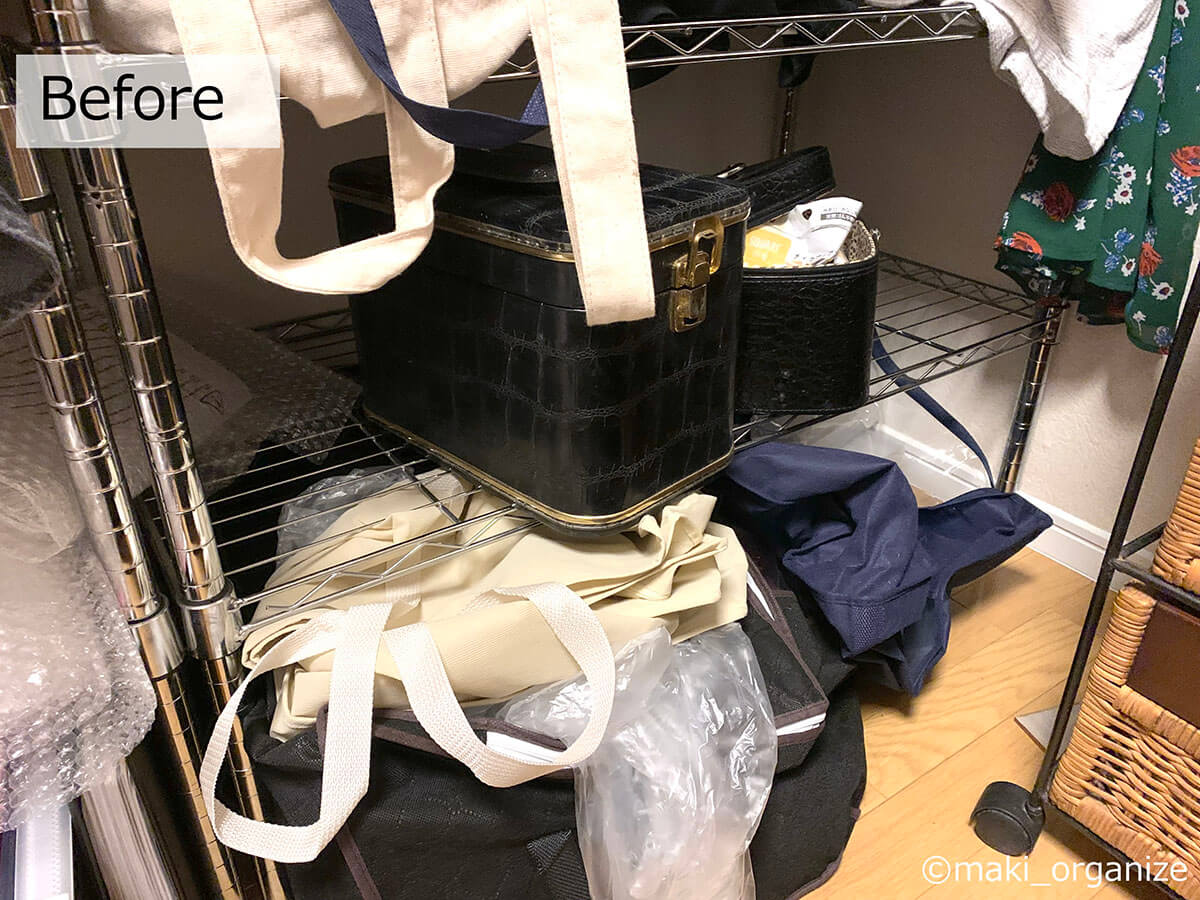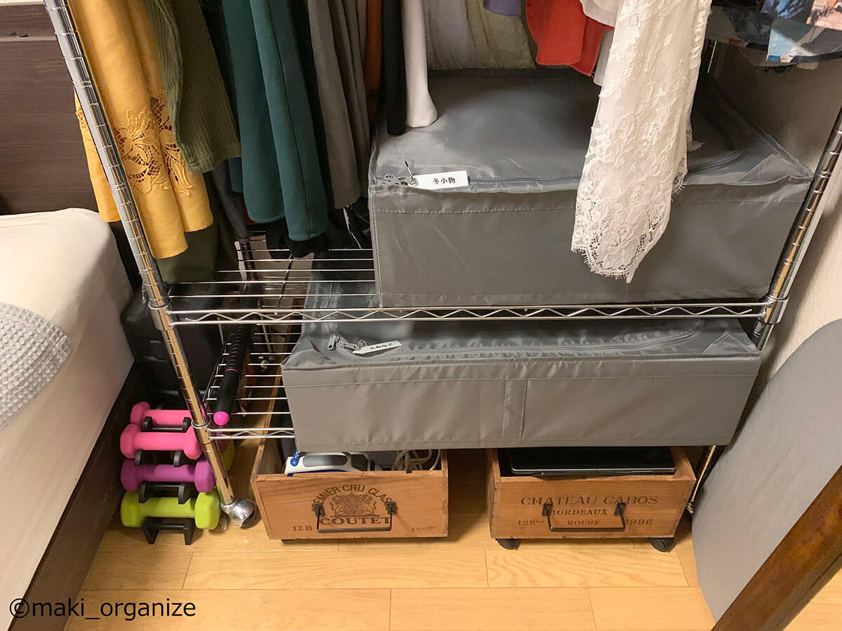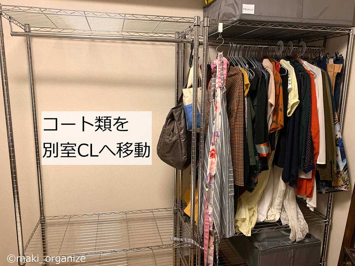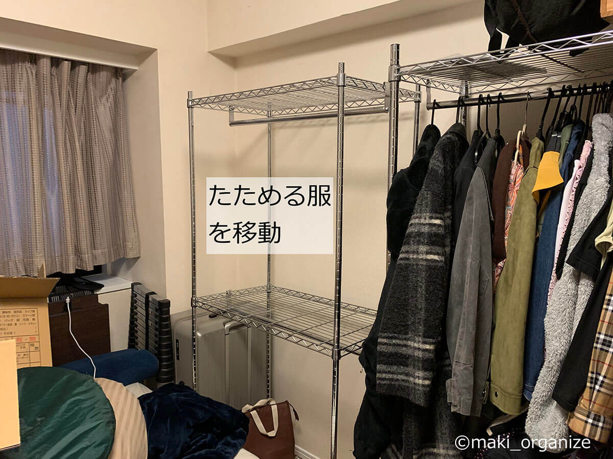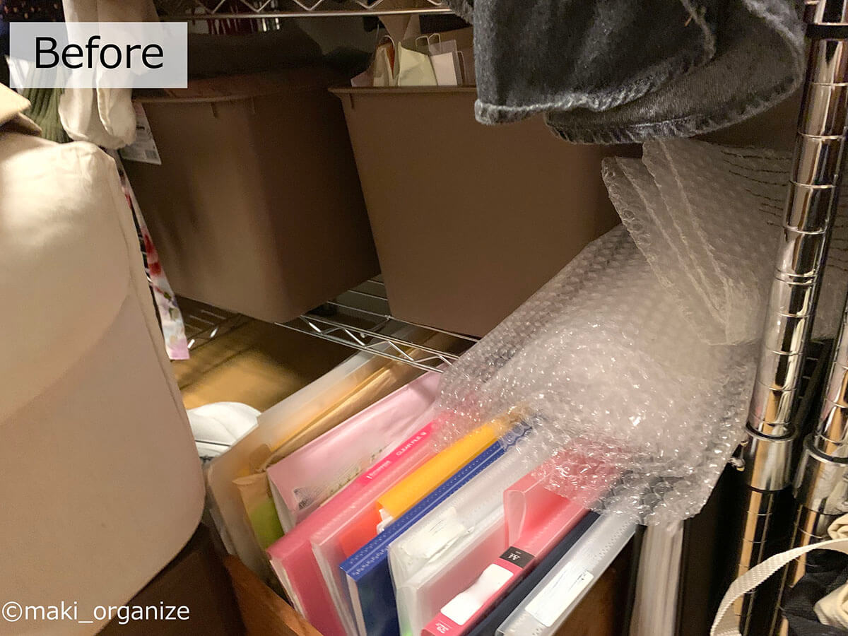 サイゾーウーマン暮らし住まい服のかさばり1/3!?プロの捨てない収納術 暮らし [連載]女たちの「煩悩部屋」ビフォーアフター 【洋服ラックビフォーアフター】かさばりが3分の1に!? プロが教える「捨てない」収納術 2024/09/11 17:00 伊藤まき(収納ライター) 「汚部屋」ビフォーアフター 整理収納アドバイザーの伊藤まきさんが、片付けに悩む読者の自宅を使いやすく生まれ変わらせる連載シリーズ【「煩悩部屋」ビフォーアフター】。 連載企画『ビフォーアフター』新シーズンです。第10回目の片付けモニターは、東京都世田谷区・1SLDKで暮らす3人家族のまいさん(32歳)。今回は、汚部屋の片付けではなく「リノベマンション」の収納を手直しする特別編です。 目次 ・【お悩み】洋服を捨てずに、寝室を広く見せたい ・【洋服を捨てない収納術】1~3 ・【洋服を捨てない収納術】4~6 ・【洋服を捨てない収納術】7~10 ・【まとめ】保管場所と収納法だけで解決! 【お悩み】洋服を捨てずに、寝室を広く見せたい 幅90cmのラックが3台も。歩くスペースがありません(C)maki_organize クライアントプロフィール ・まいさん(32歳) ・保育園の園長先生(フルワーク) ・育児系インフルエンサー“まい先生“としても活躍 ・3人家族 ・1SLDK ・中古マンションをリノベーション購入(持ち家) ・東京都世田谷区在住 収納に関する要望 ・掃除や片付けの頻度を少なくしたい ・子どもが自分で身支度できる仕組みを作りたい ・ベッドルームのレイアウトを変えたい ・シンプルに暮らしたいので、家具を増やしたくない 前回は強力突っ張り棚を使って、寝室のクローゼットを片付けました。今回は写真のワードローブ用ラックを中心に、「洋服を捨てない収納術」を紹介していきます。 【洋服を捨てない収納術1】吊るす収納から「たたむ収納」へ たためる服はクローゼット収納にしました(C)maki_organize 3台のラックから洋服を取り出して「季節と種類」で分類していきます。ワンピースやドレスシャツ、コート類を除いた洋服は「たたむ収納」に変更。クローゼットへ移動させることで、ラックが1台分空きました。 【洋服を捨てない収納術2】コートやスーツの「保管場所」を変える 秋冬/春夏の2シーズンに分けて衣替え(C)maki_organize 次に、秋冬のコート類、使用頻度が低いスーツやイベント服をリビングのクローゼットへ移動。さらに1台分のラックが空きました。保管場所を別の部屋に変更できない場合は、保管サービス付きのクリーニングやベッド下収納などを検討すると良いでしょう。 【洋服を捨てない収納術3】棚板を「cm単位」で調整して収納力UP! ゴムハンマーを用意すると作業が簡単です(C)maki_organize 収納法(たたむ)と保管先(別の部屋)を変えて、ラックが1台だけになりました。この段階で、「棚板の位置」をcm単位で調整し直します。2人で協力すれば、組み立てたままでも変更可能です。 【洋服を捨てない収納術4】キャスターを付けて「可動ラック」に ラック周りは「ほこり」が溜まりやすいため可動式が◎(C)maki_organize 棚の位置を調整したら、同ブランドのキャスター(別売り商品)を購入して取り付けます。可動式のラックに変更することで、寝室のレイアウトも自由自在に。風通しも良く、掃除も簡単になります。 【洋服を捨てない収納術5】最下段は「キャスター付きBOX」を! (Before)ワイン箱に書類や思い出の品がどっさりでした(C)maki_organize (After)ワイン箱に取っ手とキャスターをDIYで取り付け(C)maki_organize ラックの最下段にはキャスター付き収納ボックスを入れるのが正解です。お気に入りのワイン箱ということで、DIYで可動式に変更しました。ネジで取り付けるキャスターのほか、貼るだけタイプも100均にあります。 【洋服を捨てない収納術6】シーズンオフの洋服は「スリムケース」に収納 (Before)使っていない布団袋とメイクボックスは処分(C)maki_organize (After)縦横を変えたら2個置きも可能(C)maki_organize 段ボールや不織布袋に入っていた、シーズンオフの洋服や毛布類は「イケアの収納ケース」へ入れ替えました。高さ19cmなので、コンパクトにまとまります。 【洋服を捨てない収納術7】ハンガーは「スリムタイプ」に統一 (Before)ハンガーがバラバラだと「かさばり」が出る(C)maki_organize (After)いっきにつかみやすいので、衣替えも簡単になります(C)maki_organize ハンガーは同じサイズで揃えるほど収納力がUPします。今回はアマゾンなどで購入できる「すべらないPVC特殊ラバー加工」のスリムハンガーに統一し、洋服のかさばりを減らしました。 【洋服を捨てない収納術8】ラックのサイドで「小物収納」 サイド用の別売りパーツなどで使い方が広がる!(C)maki_organize ラックが1台になったので、サイドにS字フックを引っ掛け、バッグ類を収納できるようになりました。ほかにもワイヤーネットを設置すれば、帽子やアクセサリーなどの小物収納も可能になります。 【洋服を捨てない収納術9】最上段は「出し入れ」しやすさ重視 (Before)出し入れが困難なほど、