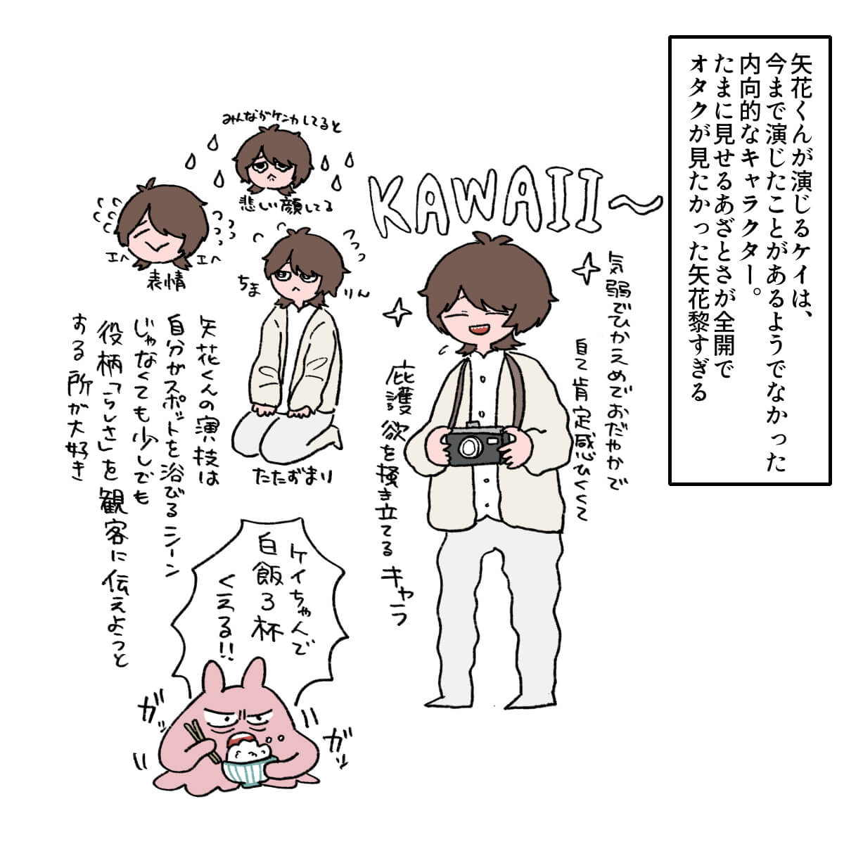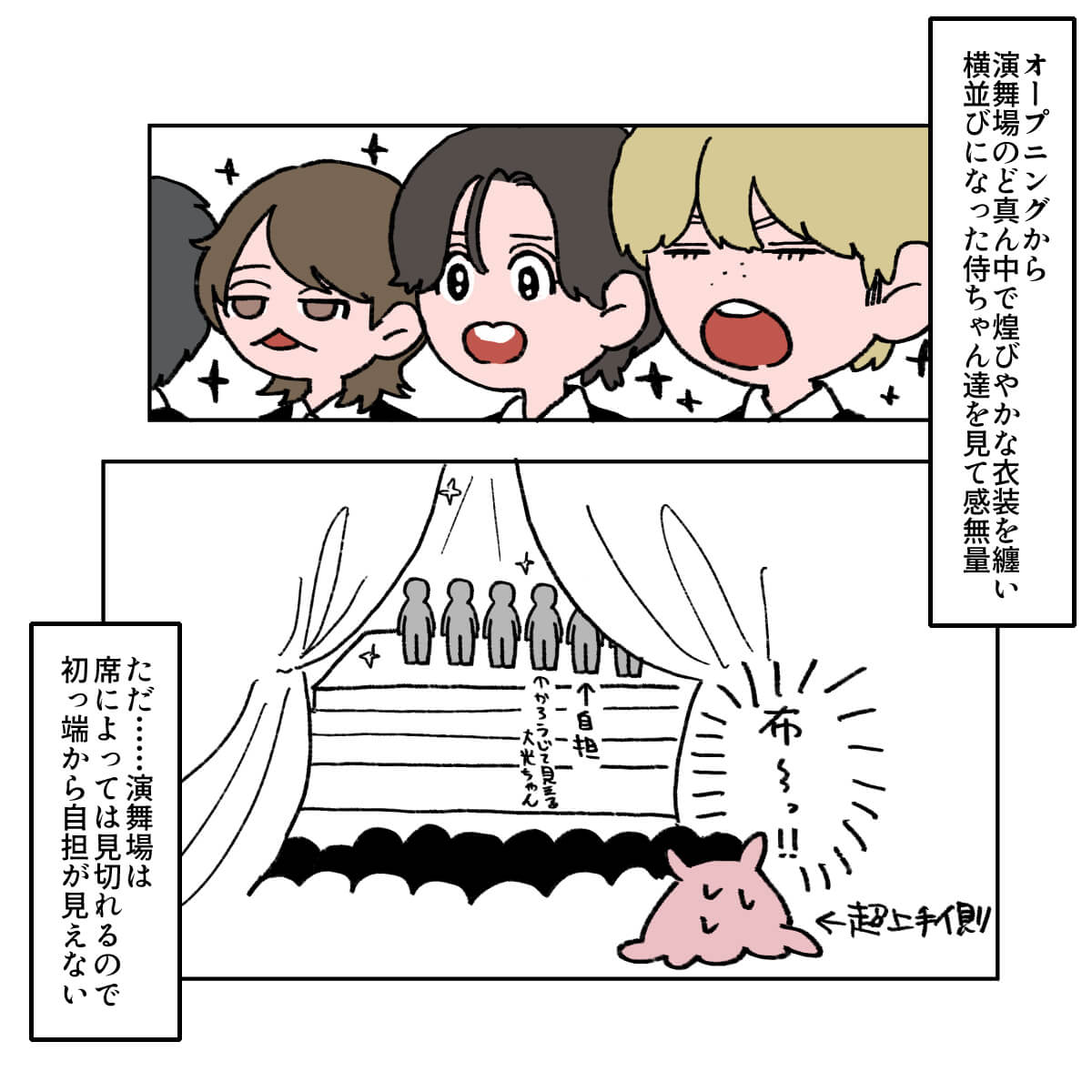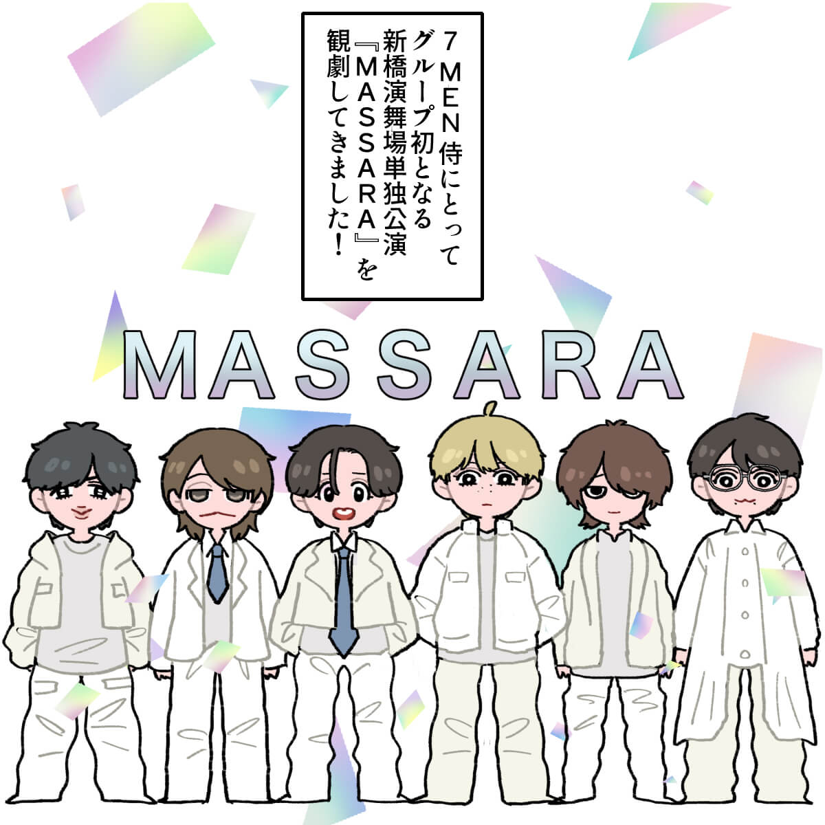 サイゾーウーマン男性アイドルSTARTO(旧ジャニーズ)ジュニア7 MEN 侍7 MEN 侍の初舞台『MASSARA』レポ 男性アイドル [ドルオタ漫画家・竜田トキヒロの“推し事”見聞録]vol.72 7 MEN 侍・矢花黎が“あざとさ全開”! ライブとのギャップに大興奮した初主演舞台『MASSARA』レポ 2024/09/11 21:00 竜田トキヒロ(マンガ家) 男性アイドル7 MEN 侍竜田トキヒロの“推し事”見聞録 ――Twitterで日々、ジャニーズタレントにまつわるイラストを投稿中のジャニオタ漫画家・竜田トキヒロが、現場レポートからドラマや映画、番組レビューまで、“推し事”の様子をお届け! 今回は、9月4日に東京・新橋演舞場で幕を開けた、ジュニア内ユニット・7 MEN 侍による舞台『MASSARA』(9月29日まで全29公演を上演)をレポート! 中村嶺亜、 佐々木大光、 本高克樹、 菅田琳寧、 今野大輝、 矢花黎の6人にとって初主演となった同作は、高校時代をの仲間たちが再会を機に、過去の思い出をなぞりながら自分自身と向き合う物語。 グループの新曲はもちろん、STARTO ENTERTAINMENT(旧ジャニーズ事務所)の先輩たちの名曲も披露しています。 現在、7月から行っている全国ホールツアー『7 MEN 侍 LIVE 2024 and JOY!』の期間中でもあり、大忙しの彼らですが、舞台ではいったいどんな姿を見せているのか……イラストで紹介していきます。 目次 ・7 MEN 侍、新橋演舞場に立つ姿に感無量 ・矢花黎のあざとい姿とは? ・7 MEN 侍のギャップに大興奮! 7 MEN 侍初主演舞台『MASSARA』、新橋演舞場に立つ姿に感無量 7 MEN 侍・矢花黎の“あざとさ全開”な姿とは? 7 MEN 侍のギャップに大興奮! ファンとしてうれしい要素も 7 MEN 侍・矢花黎ファンが思わず涙! 全国ホールツアー『and JOY!』東京公演レポ――Twitterで日々、ジャニーズタレントにまつわるイラストを投稿中のジャニオタ漫画家・竜田トキヒロが、現場レポートからドラマや映画、番組レビューまで、“推し事”の様子を...サイゾーウーマン2024.08.21 坂本昌行が7 MEN 侍に送った“何よりの褒め言葉”とは? 『GIFT for X』最終回イラストレポ――Twitterで日々、STARTO ENTERTAINMENT(旧ジャニーズ事務所)のタレントをはじめとしたイラストを投稿中のドルオタ漫画家・竜田トキヒロが、現場レポー...サイゾーウーマン2024.04.03 【ジャニオタマンガ】中村嶺亜は「不動の皇帝」矢花黎は「軍師」! 7 MEN 侍ステマシート――Twitterで日々、ジャニーズタレントにまつわるイラストを投稿中のジャニオタ漫画家・竜田トキヒロが、現場レポートからドラマや映画、番組レビューまで、“推し事”の様子を...サイゾーウーマン2023.09.06 竜田トキヒロ(マンガ家) 漫画家、イラストレーター。育休中に執筆したエッセイ漫画でKADOKAWAコミックエッセイ大賞受賞。Ameba、ライブドア公式ブロガーを経たのち現在はインフルエンサーとしてエンタメ、オタクに特化した漫画やイラストや体験ルポ等幅広く執筆。著書『コミュ障母さんとごきげん娘』(KADOKAWA) X:@musumenuma 最終更新:2024/09/11 21:12 侍も侍担も忙しすぎる 関連記事 7 MEN 侍・矢花黎ファンが思わず涙! 全国ホールツアー『and JOY!』東京公演レポ坂本昌行が7 MEN 侍に送った“何よりの褒め言葉”とは? 『GIFT for X』最終回イラストレポTOKIO・松岡昌宏、7 MEN 侍・矢花がカバーした「Autumn」の制作秘話明かす【ジャニオタマンガ】中村嶺亜は「不動の皇帝」矢花黎は「軍師」! 7 MEN 侍ステマシート7 MEN 侍・矢花黎、「ファンから一線越えた」――憧れの人からの贈り物に複雑な心境告白 次の記事 WEST.、新曲「まぁいっか!」でBE:FIRSTらとダンスコラボも……初日19.2万枚で前作超えならず >
