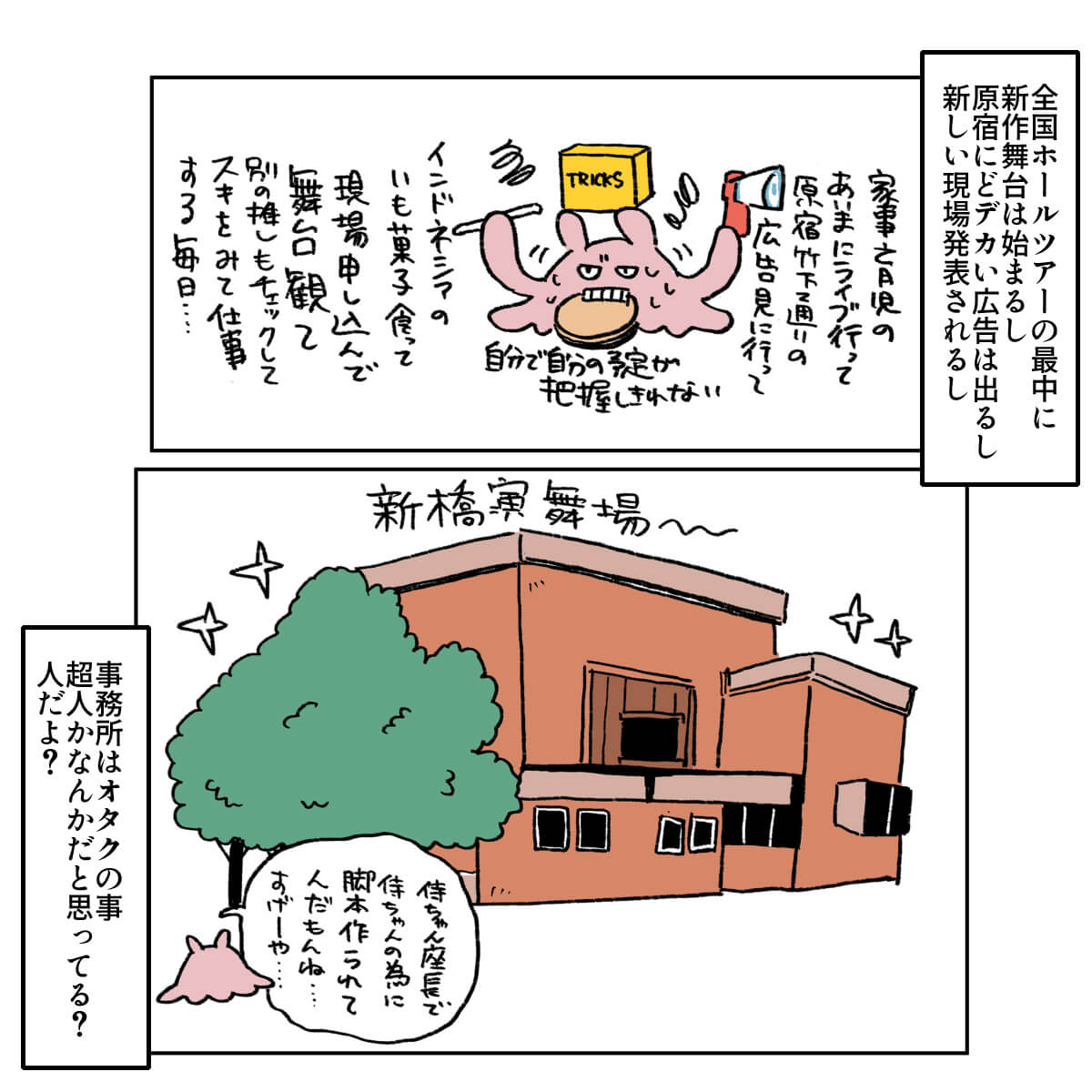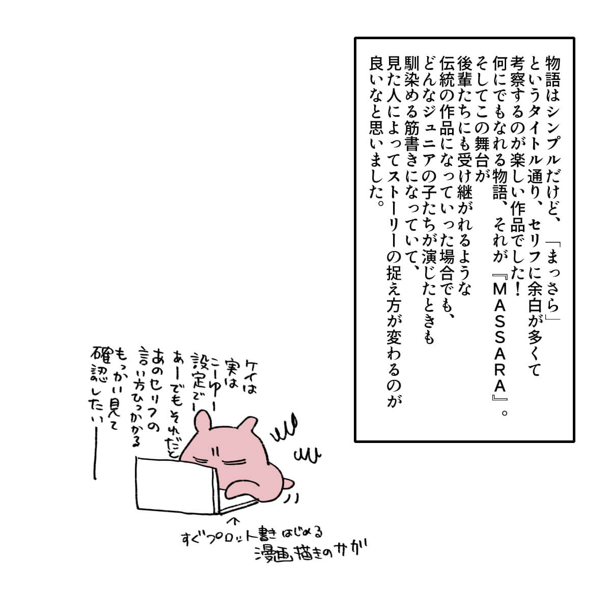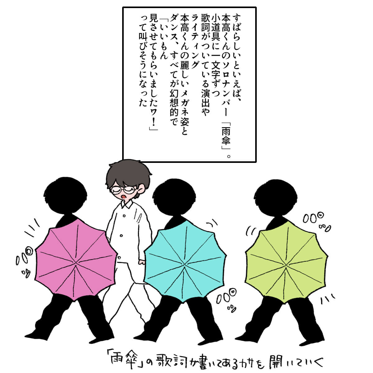 サイゾーウーマン男性アイドルSTARTO(旧ジャニーズ)ジュニア7 MEN 侍7 MEN 侍の初舞台『MASSARA』レポ 男性アイドル [ドルオタ漫画家・竜田トキヒロの“推し事”見聞録]vol.72 7 MEN 侍・矢花黎が“あざとさ全開”! ライブとのギャップに大興奮した初主演舞台『MASSARA』レポ 2024/09/11 21:00 竜田トキヒロ(マンガ家) 男性アイドル7 MEN 侍竜田トキヒロの“推し事”見聞録 ――Twitterで日々、ジャニーズタレントにまつわるイラストを投稿中のジャニオタ漫画家・竜田トキヒロが、現場レポートからドラマや映画、番組レビューまで、“推し事”の様子をお届け! 今回は、9月4日に東京・新橋演舞場で幕を開けた、ジュニア内ユニット・7 MEN 侍による舞台『MASSARA』(9月29日まで全29公演を上演)をレポート! 中村嶺亜、 佐々木大光、 本高克樹、 菅田琳寧、 今野大輝、 矢花黎の6人にとって初主演となった同作は、高校時代をの仲間たちが再会を機に、過去の思い出をなぞりながら自分自身と向き合う物語。 グループの新曲はもちろん、STARTO ENTERTAINMENT(旧ジャニーズ事務所)の先輩たちの名曲も披露しています。 現在、7月から行っている全国ホールツアー『7 MEN 侍 LIVE 2024 and JOY!』の期間中でもあり、大忙しの彼らですが、舞台ではいったいどんな姿を見せているのか……イラストで紹介していきます。 目次 ・7 MEN 侍、新橋演舞場に立つ姿に感無量 ・矢花黎のあざとい姿とは? ・7 MEN 侍のギャップに大興奮! 7 MEN 侍初主演舞台『MASSARA』、新橋演舞場に立つ姿に感無量 7 MEN 侍・矢花黎の“あざとさ全開”な姿とは? 7 MEN 侍のギャップに大興奮! ファンとしてうれしい要素も 7 MEN 侍・矢花黎ファンが思わず涙! 全国ホールツアー『and JOY!』東京公演レポ――Twitterで日々、ジャニーズタレントにまつわるイラストを投稿中のジャニオタ漫画家・竜田トキヒロが、現場レポートからドラマや映画、番組レビューまで、“推し事”の様子を...サイゾーウーマン2024.08.21 坂本昌行が7 MEN 侍に送った“何よりの褒め言葉”とは? 『GIFT for X』最終回イラストレポ――Twitterで日々、STARTO ENTERTAINMENT(旧ジャニーズ事務所)のタレントをはじめとしたイラストを投稿中のドルオタ漫画家・竜田トキヒロが、現場レポー...サイゾーウーマン2024.04.03 【ジャニオタマンガ】中村嶺亜は「不動の皇帝」矢花黎は「軍師」! 7 MEN 侍ステマシート――Twitterで日々、ジャニーズタレントにまつわるイラストを投稿中のジャニオタ漫画家・竜田トキヒロが、現場レポートからドラマや映画、番組レビューまで、“推し事”の様子を...サイゾーウーマン2023.09.06 竜田トキヒロ(マンガ家) 漫画家、イラストレーター。育休中に執筆したエッセイ漫画でKADOKAWAコミックエッセイ大賞受賞。Ameba、ライブドア公式ブロガーを経たのち現在はインフルエンサーとしてエンタメ、オタクに特化した漫画やイラストや体験ルポ等幅広く執筆。著書『コミュ障母さんとごきげん娘』(KADOKAWA) X:@musumenuma 最終更新:2024/09/11 21:12 侍も侍担も忙しすぎる 関連記事 7 MEN 侍・矢花黎ファンが思わず涙! 全国ホールツアー『and JOY!』東京公演レポ坂本昌行が7 MEN 侍に送った“何よりの褒め言葉”とは? 『GIFT for X』最終回イラストレポTOKIO・松岡昌宏、7 MEN 侍・矢花がカバーした「Autumn」の制作秘話明かす【ジャニオタマンガ】中村嶺亜は「不動の皇帝」矢花黎は「軍師」! 7 MEN 侍ステマシート7 MEN 侍・矢花黎、「ファンから一線越えた」――憧れの人からの贈り物に複雑な心境告白 次の記事 WEST.、新曲「まぁいっか!」でBE:FIRSTらとダンスコラボも……初日19.2万枚で前作超えならず >