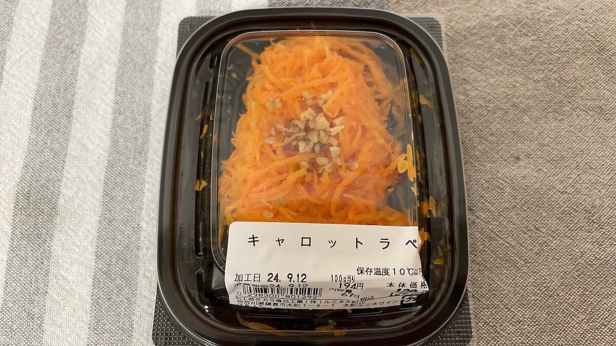 ザ・ガーデンらしいものを一品買って帰ろうと思っても、なにが「らしさ」なのかが見えず、 結局最安だったタカラ食品製造のキャロットラペ129円を購入。