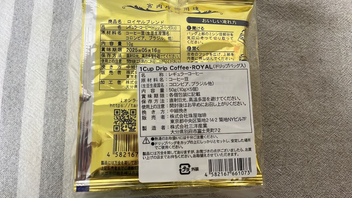 しかし続いて「宮内庁御用達」の文字が輝く、キンキラキンのドリップコーヒーに目が釘付けに。やりすぎなパッケージに高級感をビシビシと感じます