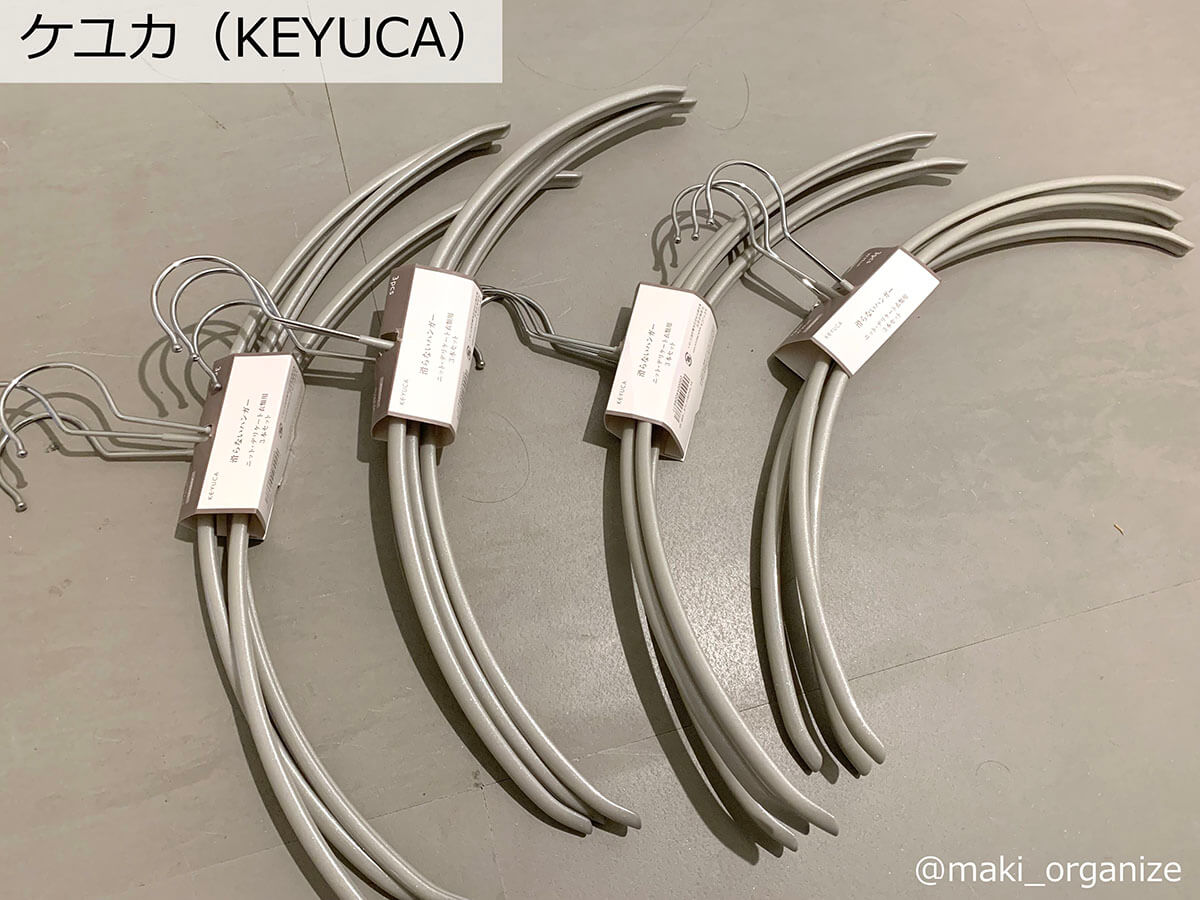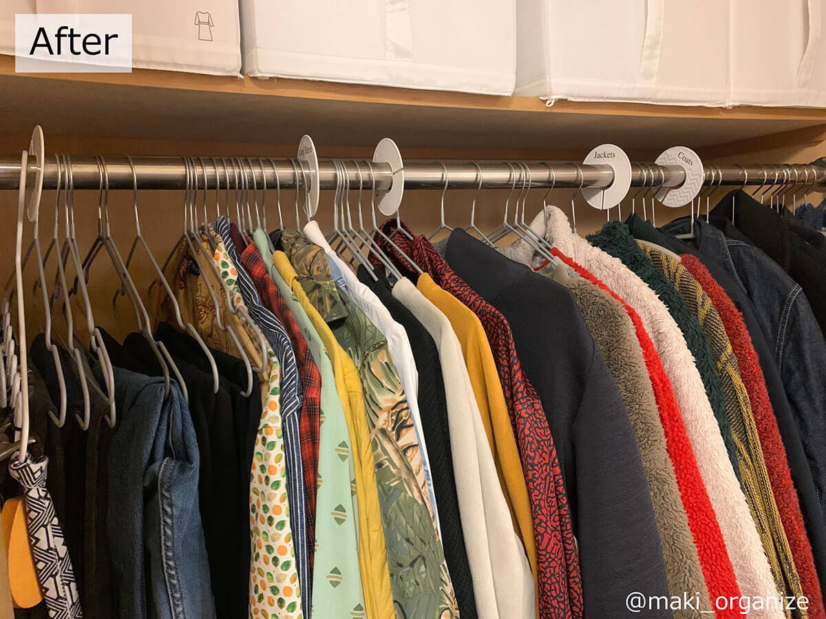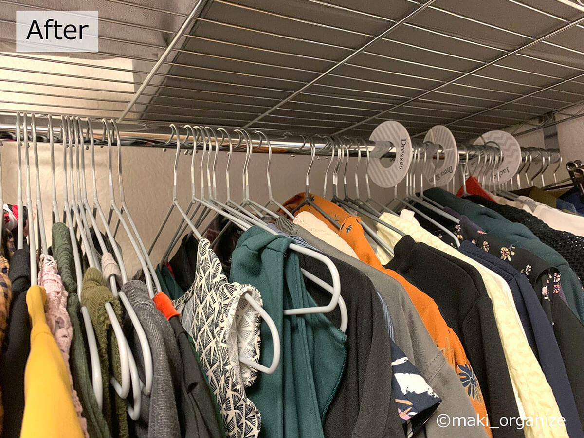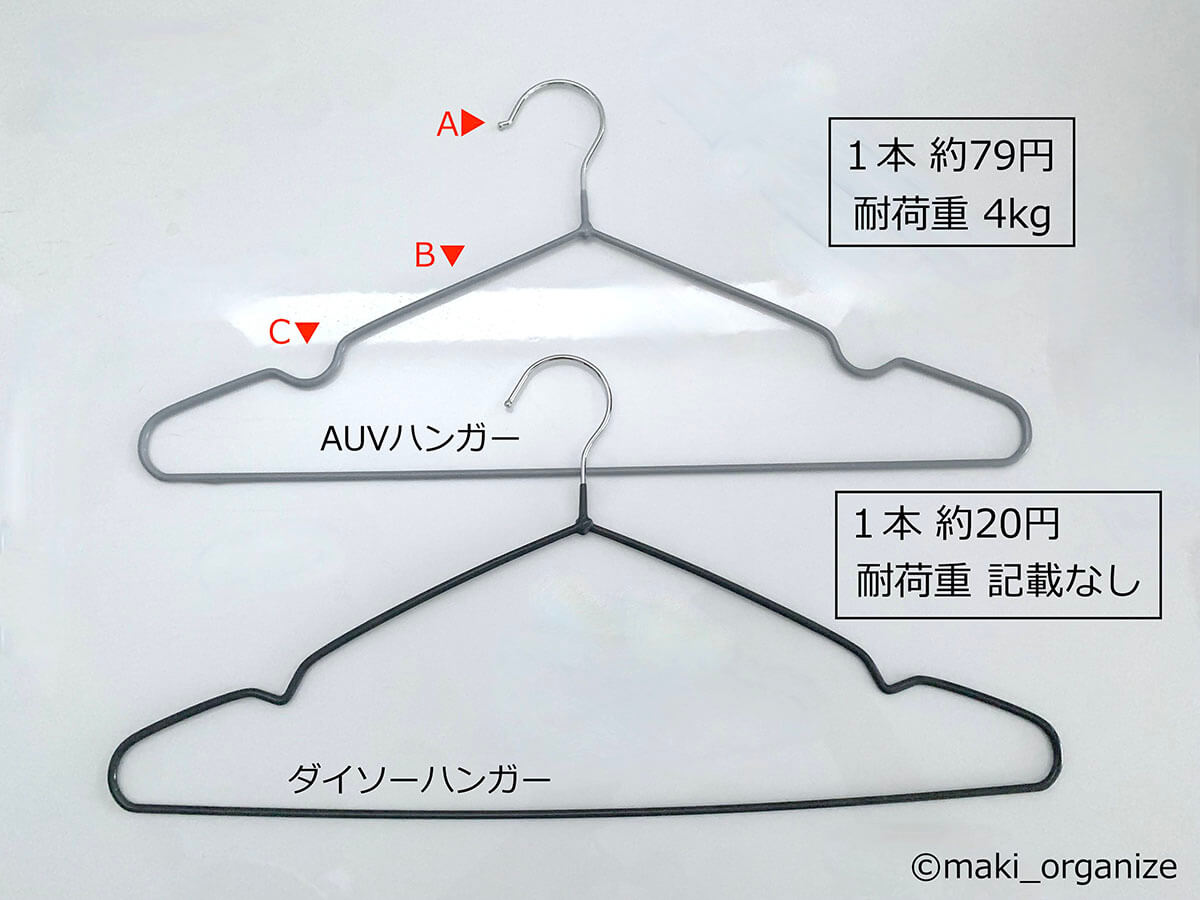 サイゾーウーマン暮らし住まい【ダイソー】1本20円薄型ハンガーで収納力2倍 暮らし [連載]女たちの「煩悩部屋」ビフォーアフター 【ダイソー】1本20円「薄型ハンガー」で収納力が2倍に! プロが選んだおすすめ4選 2024/09/25 17:00 伊藤まき(収納ライター) 「汚部屋」ビフォーアフター 整理収納アドバイザーの伊藤まきさんが、片付けに悩む読者の自宅を使いやすく生まれ変わらせる連載シリーズ【「煩悩部屋」ビフォーアフター】。 連載企画『ビフォーアフター』新シーズンです。第10回目の片付けモニターは、東京都世田谷区・1SLDKで暮らす3人家族のまいさん(32歳)。今回は、汚部屋の片付けではなく「リノベマンション」の収納を手直しする特別編です。 目次 ・ハンガーの色や形がバラバラ! ・プラスチック製ハンガーの厚みを検証 ・【薄型ハンガーのおすすめ1~2】ダイソー・ AUVハンガー ・【薄型「専用」ハンガーのおすすめ1~2】ケユカ ・ダイソー ・【男性の服】クローゼットビフォーアフター ・【女性の服】クローゼットビフォーアフター ・クローゼットラベル&全体まとめ 【お悩み】ハンガーを揃えてクローゼットを使いやすくしたい サイズや素材が違うとからまりやすい(C)maki_organize クライアントプロフィール ・まいさん(32歳) ・保育園の園長先生(フルワーク) ・育児系インフルエンサー“まい先生“としても活躍 ・3人家族 ・1SLDK ・中古マンションをリノベーション購入(持ち家) ・東京都世田谷区在住 収納に関する要望 ・掃除や片付けの頻度を少なくしたい ・子どもが自分で身支度できる仕組みを作りたい ・ベッドルームのレイアウトを変えたい ・シンプルに暮らしたいので、家具を増やしたくない 前回、前々回とクローゼットまわりの洋服収納を見直してきました。見た目もスッキリしてきたので、「ハンガーも揃えてより使いやすくしたい」と要望が。そこで今回は「収納力がUPする薄型ハンガー」について、くわしく解説します。 【検証】プラスチック製ハンガーだと「厚みが2倍」!? 返却できるクリーニング店もあります(C)maki_organize クリーニング店のプラスチック製ハンガーをそのまま使っていませんか? クローゼットの収納力に余裕があれば問題ありませんが、収納力を2倍に増やしたいなら「薄型ハンガー」に統一するのが正解です。 【薄型ハンガーのおすすめ1】ダイソー スベリ止めハンガー 白とグレーの2色展開 JANコード:4550480333977(C)maki_organize 写真は「ダイソー スベリ止めハンガー」。5本110円(1本あたり約20円)で購入できるので、プラスチック製ハンガーを処分する前に、まずはこちらで使用感を試してみてください。 【薄型ハンガーのおすすめ2】AUVハンガー すべらない PVC特殊ラバー加工 凹部にワンピースの紐をかけられます(C)maki_organize ダイソー薄型ハンガーを試して問題なければ、必要に応じて数を増やしていきましょう。とはいえ、人気商品なので一度に大量購入できない場合があります。 そんな時におすすめしたいのが「AUV ハンガー すべらない PVC特殊ラバー加工(30本入り)」2,380円。男女共有できるユニセックスサイズ(W40cm)で、耐荷重4kgと頑丈。1本あたりの価格は約79円になります。 ダイソーとAUVの薄型ハンガーを比較 ほこりや汚れが目立ちにくい「グレー」がおすすめ(C)maki_organize ダイソーとAUVを比較してみました。ともに、塩化ビニル樹脂加工の滑り止めが付いていて、幅3㎜の薄型になります。 1本あたりの価格はダイソーのほうが安いですが、耐荷重の記載がありません。AUVは耐荷重が4㎏で、「ポールに引っ掛けやすい(A)」「肩のラインがなだらか(B)」「凹部分が深く滑りにくい(C)」というメリットがあります。 【薄型ハンガー活用例】1本でスカートやパンツ、ワンピもOK! さまざまな洋服に対応できる(C)maki_organize 「滑り止め付き」なので、ひも付きスカート(A)、パンツ(B)、ロングワンピース(C)にも対応できます。ただし例外の洋服もあるので、その場合は別の「専用」ハンガーを用意するようにしましょう。 【薄型「専用」ハンガー】必要な数に応じて揃える 必要個数を確認してから別途購入する(C)maki_organize 折りじわを残したくないパンツと、ひもがついていないスカートのみ「専用のハンガー」を用意します。事前に個数を確認してから、必要な数だけ揃えるようにしてください。 パンツ用はストッパー付き(A)、スカート用はクリップの位置を調整できる(B)ものを選ぶと良いでしょう。 【薄型「専用」ハンガーのおすすめ1】ケユカ 滑らないハンガー サイズ(W39×D1×H23.5cm)(C)maki_organize 重たいコート類、型崩れを防ぎたいセーター、ドレスシャツ用には「KEYUCA 滑らないハンガー(30本入り)」3,190円(1本あたり約106円)を揃えます。 100均にもこのようなデザインのハンガーがありますが、ケユカのハンガーはネックが長いので、「取り出しやすく美しい」収納が叶います。他メーカーと比較検証した記事で、違いを確認してみてください。 【薄型「専用」ハンガーのおすすめ2】ダイソ