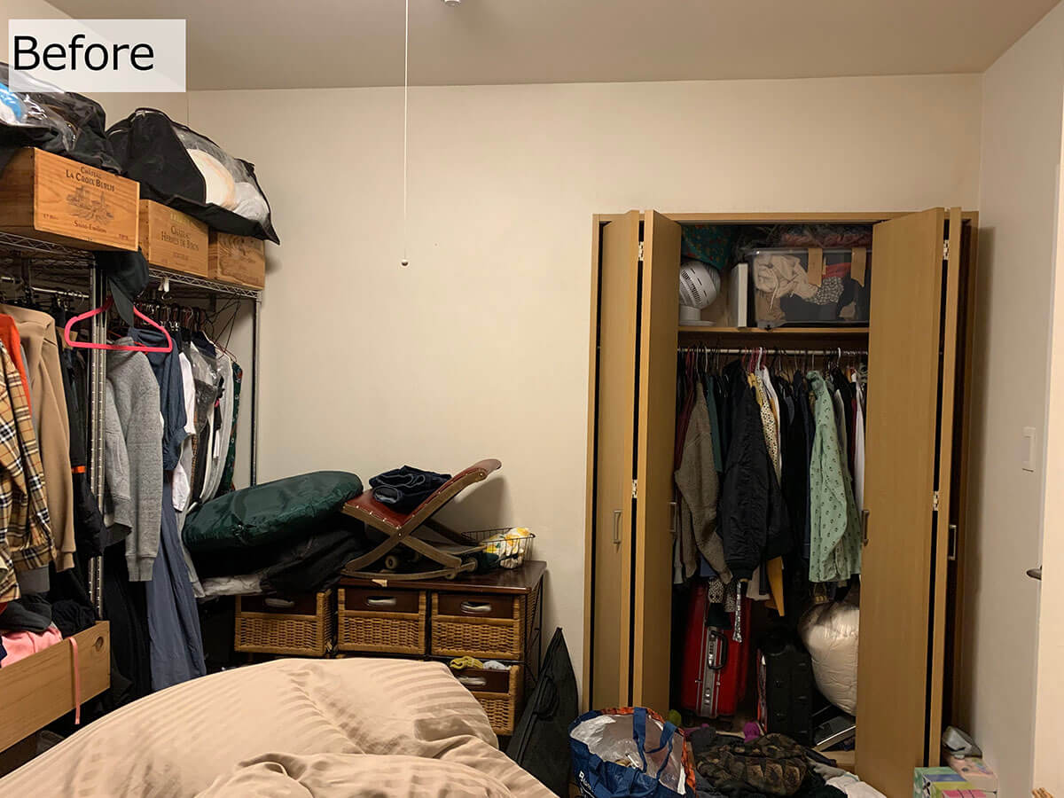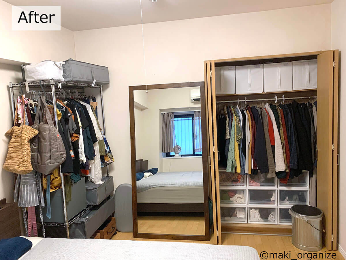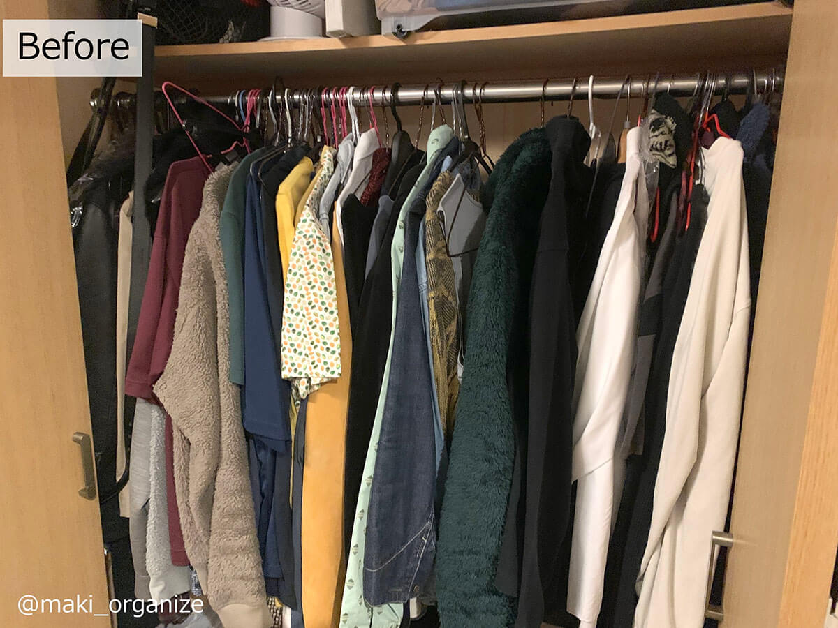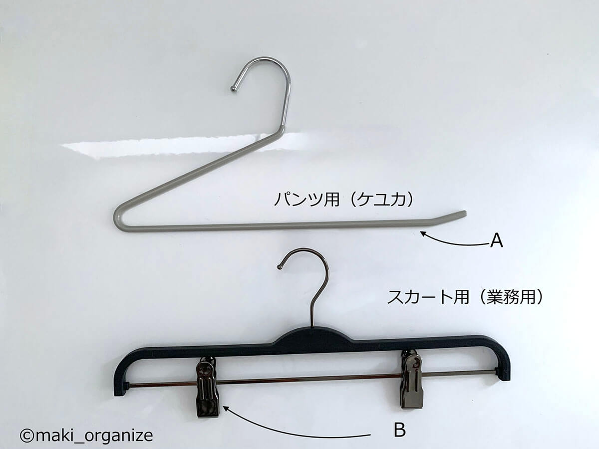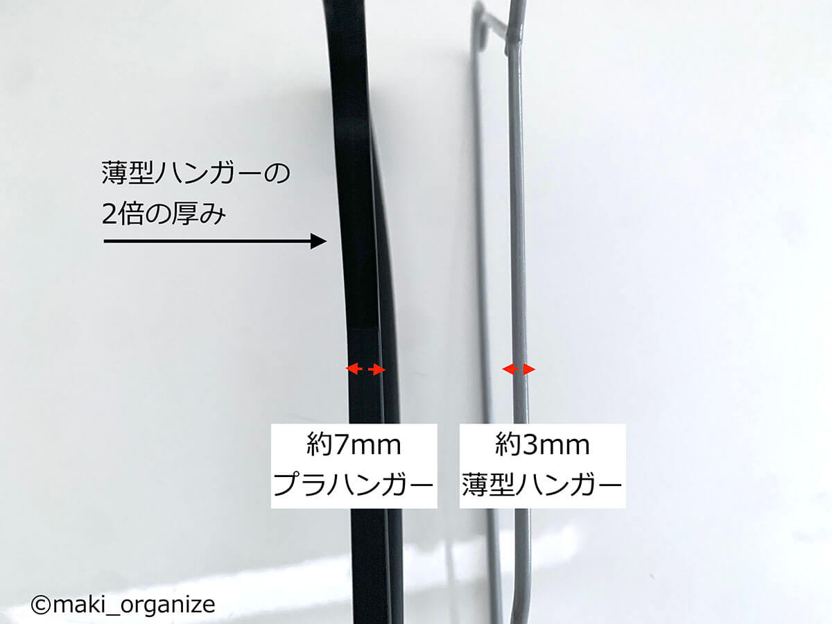 サイゾーウーマン暮らし住まい【ダイソー】1本20円薄型ハンガーで収納力2倍 暮らし [連載]女たちの「煩悩部屋」ビフォーアフター 【ダイソー】1本20円「薄型ハンガー」で収納力が2倍に! プロが選んだおすすめ4選 2024/09/25 17:00 伊藤まき(収納ライター) 「汚部屋」ビフォーアフター 整理収納アドバイザーの伊藤まきさんが、片付けに悩む読者の自宅を使いやすく生まれ変わらせる連載シリーズ【「煩悩部屋」ビフォーアフター】。 連載企画『ビフォーアフター』新シーズンです。第10回目の片付けモニターは、東京都世田谷区・1SLDKで暮らす3人家族のまいさん(32歳)。今回は、汚部屋の片付けではなく「リノベマンション」の収納を手直しする特別編です。 目次 ・ハンガーの色や形がバラバラ! ・プラスチック製ハンガーの厚みを検証 ・【薄型ハンガーのおすすめ1~2】ダイソー・ AUVハンガー ・【薄型「専用」ハンガーのおすすめ1~2】ケユカ ・ダイソー ・【男性の服】クローゼットビフォーアフター ・【女性の服】クローゼットビフォーアフター ・クローゼットラベル&全体まとめ 【お悩み】ハンガーを揃えてクローゼットを使いやすくしたい サイズや素材が違うとからまりやすい(C)maki_organize クライアントプロフィール ・まいさん(32歳) ・保育園の園長先生(フルワーク) ・育児系インフルエンサー“まい先生“としても活躍 ・3人家族 ・1SLDK ・中古マンションをリノベーション購入(持ち家) ・東京都世田谷区在住 収納に関する要望 ・掃除や片付けの頻度を少なくしたい ・子どもが自分で身支度できる仕組みを作りたい ・ベッドルームのレイアウトを変えたい ・シンプルに暮らしたいので、家具を増やしたくない 前回、前々回とクローゼットまわりの洋服収納を見直してきました。見た目もスッキリしてきたので、「ハンガーも揃えてより使いやすくしたい」と要望が。そこで今回は「収納力がUPする薄型ハンガー」について、くわしく解説します。 【検証】プラスチック製ハンガーだと「厚みが2倍」!? 返却できるクリーニング店もあります(C)maki_organize クリーニング店のプラスチック製ハンガーをそのまま使っていませんか? クローゼットの収納力に余裕があれば問題ありませんが、収納力を2倍に増やしたいなら「薄型ハンガー」に統一するのが正解です。 【薄型ハンガーのおすすめ1】ダイソー スベリ止めハンガー 白とグレーの2色展開 JANコード:4550480333977(C)maki_organize 写真は「ダイソー スベリ止めハンガー」。5本110円(1本あたり約20円)で購入できるので、プラスチック製ハンガーを処分する前に、まずはこちらで使用感を試してみてください。 【薄型ハンガーのおすすめ2】AUVハンガー すべらない PVC特殊ラバー加工 凹部にワンピースの紐をかけられます(C)maki_organize ダイソー薄型ハンガーを試して問題なければ、必要に応じて数を増やしていきましょう。とはいえ、人気商品なので一度に大量購入できない場合があります。 そんな時におすすめしたいのが「AUV ハンガー すべらない PVC特殊ラバー加工(30本入り)」2,380円。男女共有できるユニセックスサイズ(W40cm)で、耐荷重4kgと頑丈。1本あたりの価格は約79円になります。 ダイソーとAUVの薄型ハンガーを比較 ほこりや汚れが目立ちにくい「グレー」がおすすめ(C)maki_organize ダイソーとAUVを比較してみました。ともに、塩化ビニル樹脂加工の滑り止めが付いていて、幅3㎜の薄型になります。 1本あたりの価格はダイソーのほうが安いですが、耐荷重の記載がありません。AUVは耐荷重が4㎏で、「ポールに引っ掛けやすい(A)」「肩のラインがなだらか(B)」「凹部分が深く滑りにくい(C)」というメリットがあります。 【薄型ハンガー活用例】1本でスカートやパンツ、ワンピもOK! さまざまな洋服に対応できる(C)maki_organize 「滑り止め付き」なので、ひも付きスカート(A)、パンツ(B)、ロングワンピース(C)にも対応できます。ただし例外の洋服もあるので、その場合は別の「専用」ハンガーを用意するようにしましょう。 【薄型「専用」ハンガー】必要な数に応じて揃える 必要個数を確認してから別途購入する(C)maki_organize 折りじわを残したくないパンツと、ひもがついていないスカートのみ「専用のハンガー」を用意します。事前に個数を確認してから、必要な数だけ揃えるようにしてください。 パンツ用はストッパー付き(A)、スカート用はクリップの位置を調整できる(B)ものを選ぶと良いでしょう。 【薄型「専用」ハンガーのおすすめ1】ケユカ 滑らないハンガー サイズ(W39×D1×H23.5cm)(C)maki_organize 重たいコート類、型崩れを防ぎたいセーター、ドレスシャツ用には「KEYUCA 滑らないハンガー(30本入り)」3,190円(1本あたり約106円)を揃えます。 100均にもこのようなデザインのハンガーがありますが、ケユカのハンガーはネックが長いので、「取り出しやすく美しい」収納が叶います。他メーカーと比較検証した記事で、違いを確認してみてください。 【薄型「専用」ハンガーのおすすめ2】ダイソ