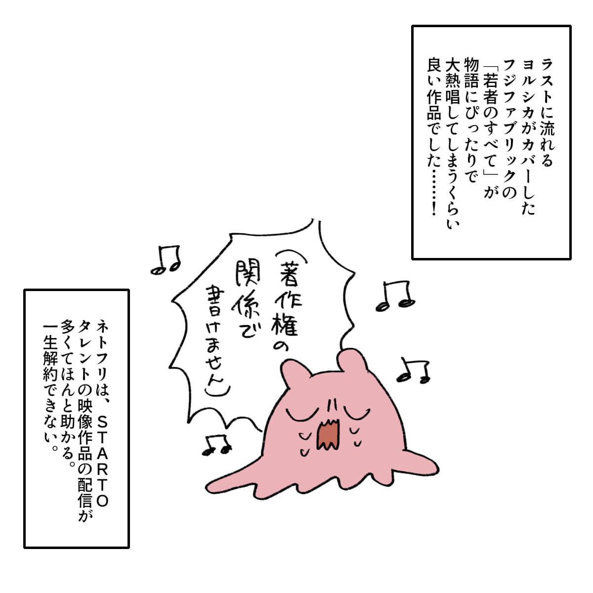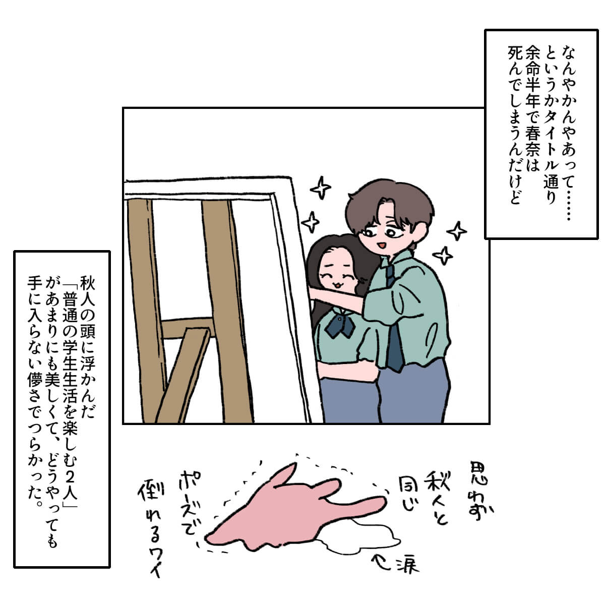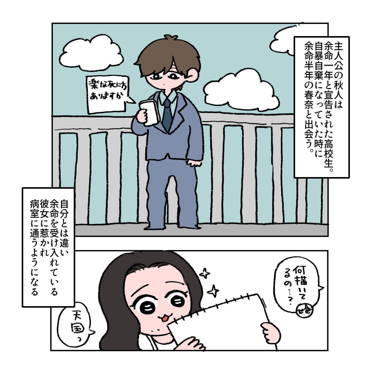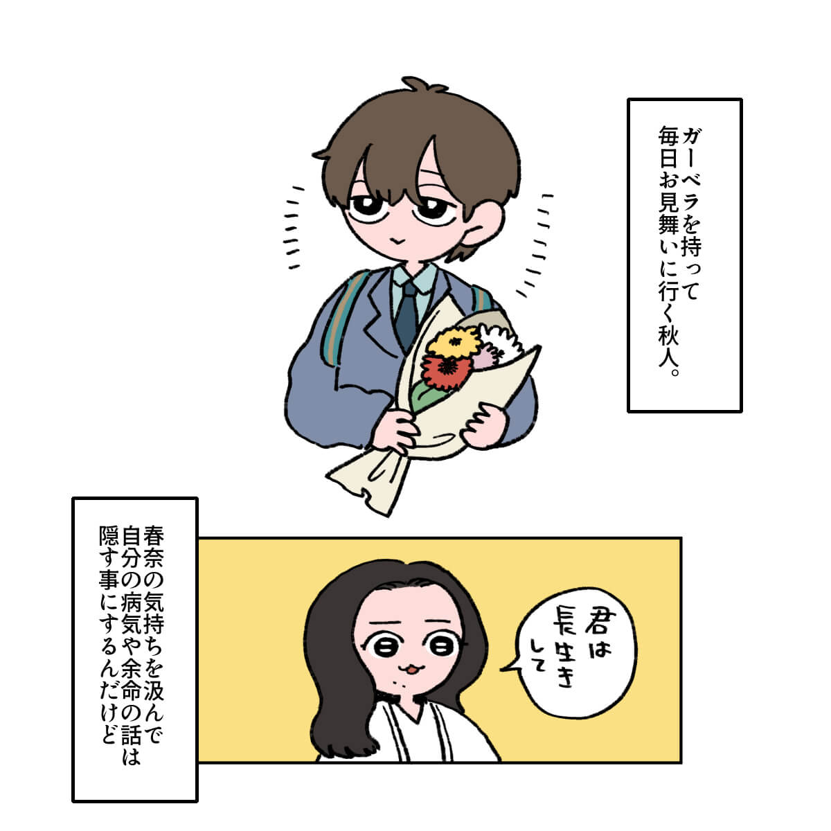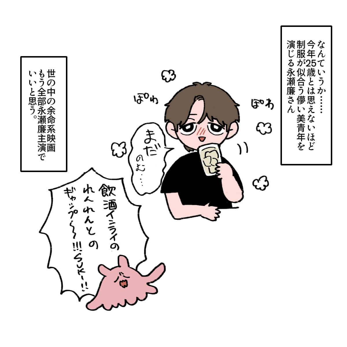 サイゾーウーマン男性アイドルSTARTO(旧ジャニーズ)King&Prince永瀬廉『よめぼく』永瀬廉を見てモンペ化 男性アイドル [ドルオタ漫画家・竜田トキヒロの“推し事”見聞録]vol.74 キンプリ・永瀬廉を見て思わず“モンペ”化! Netflix映画『よめぼく』レビュー 2024/09/27 21:30 竜田トキヒロ(マンガ家) 永瀬廉King&Prince竜田トキヒロの“推し事”見聞録 ――Twitterで日々、ジャニーズタレントにまつわるイラストを投稿中のジャニオタ漫画家・竜田トキヒロが、現場レポートからドラマや映画、番組レビューまで、“推し事”の様子をお届け! 今回は、Netflixで配信されている、King&Prince・永瀬廉主演映画『余命一年の僕が、余命半年の君と出会った話。』(以下、『よめぼく』)をレビュー! 同作は、森田碧による同名ベストセラー小説(ポプラ社)の実写版。余命1年と宣告を受けた主人公・早坂秋人(永瀬)が、余命半年のヒロイン・桜井春奈(出口夏希)と出会い、期限付きの恋をするラブストーリーです。 Netflix作品初参加かつ王道ラブストーリー映画に初挑戦した永瀬がいったいどんな演技を見せているのか、イラストで振り返っていきます! 目次 ・永瀬廉、25歳と思えないほど制服が似合う! ・永瀬廉演じる主人公の“モンペ”と化したワケ ・出口夏希の振る舞いを見て反省 映画『よめぼく』、King&Prince・永瀬廉が25歳と思えない! 映画『よめぼく』を見て、King&Prince・永瀬廉演じる主人公の“モンペ”と化したワケ 映画『よめぼく』、出口夏希演じるヒロインの振る舞いを見て“浅はかさ”に反省 『東京タワー』キンプリ・永瀬廉は目が死んでる役が似合う! 詩史との食事シーンが美しいわけ――Twitterで日々、STARTO ENTERTAINMENT(旧ジャニーズ事務所)のタレントをはじめとしたイラストを投稿中のドルオタ漫画家・竜田トキヒロが、現場レポー...サイゾーウーマン2024.05.08 キンプリ・永瀬廉の“気配り”に感動! 高橋海人は「特大の惚気」発言? 『RIDE ON TIME』レビュー――Twitterで日々、STARTO ENTERTAINMENT(旧ジャニーズ事務所)のタレントをはじめとしたイラストを投稿中のドルオタ漫画家・竜田トキヒロが、現場レポー...サイゾーウーマン2024.06.26 【ジャニオタマンガ】映画『法廷遊戯』で気づいた、キンプリ・永瀬廉の“声”の良さ――Twitterで日々、ジャニーズタレントにまつわるイラストを投稿中のジャニオタ漫画家・竜田トキヒロが、現場レポートからドラマや映画、番組レビューまで、“推し事”の様子を...サイゾーウーマン2023.11.15 竜田トキヒロ(マンガ家) 漫画家、イラストレーター。育休中に執筆したエッセイ漫画でKADOKAWAコミックエッセイ大賞受賞。Ameba、ライブドア公式ブロガーを経たのち現在はインフルエンサーとしてエンタメ、オタクに特化した漫画やイラストや体験ルポ等幅広く執筆。著書『コミュ障母さんとごきげん娘』(KADOKAWA) X:@musumenuma 最終更新:2024/09/28 06:47 号泣必至なので、電車など移動中は見ないように! 関連記事 『東京タワー』キンプリ・永瀬廉は目が死んでる役が似合う! 詩史との食事シーンが美しいわけキンプリ・永瀬廉の“気配り”に感動! 高橋海人は「特大の惚気」発言? 『RIDE ON TIME』レビュー【ジャニオタマンガ】映画『法廷遊戯』で気づいた、キンプリ・永瀬廉の“声”の良さ【ジャニオタマンガ】『King&Princeる。』最終回で見た、メンバー5人の愛され度キンプリ・高橋海人の体幹、BE:FIRST・SOTAの動きがすごい! 『THE MUSIC DAY』レビュー 次の記事 メーガン夫人、 「理想的な最高の上司」で炎上 >