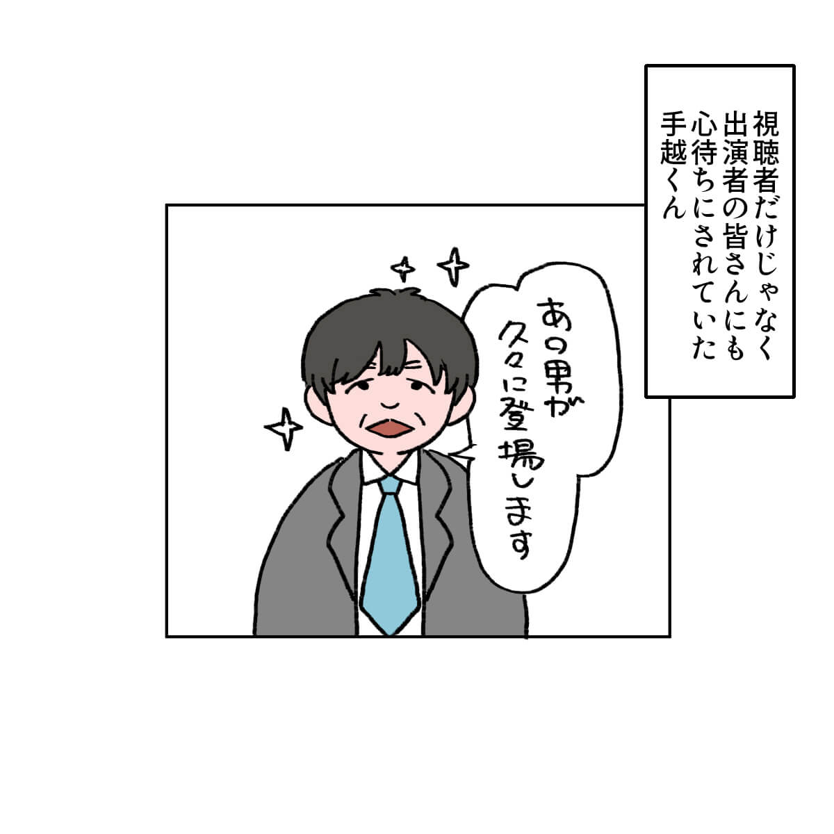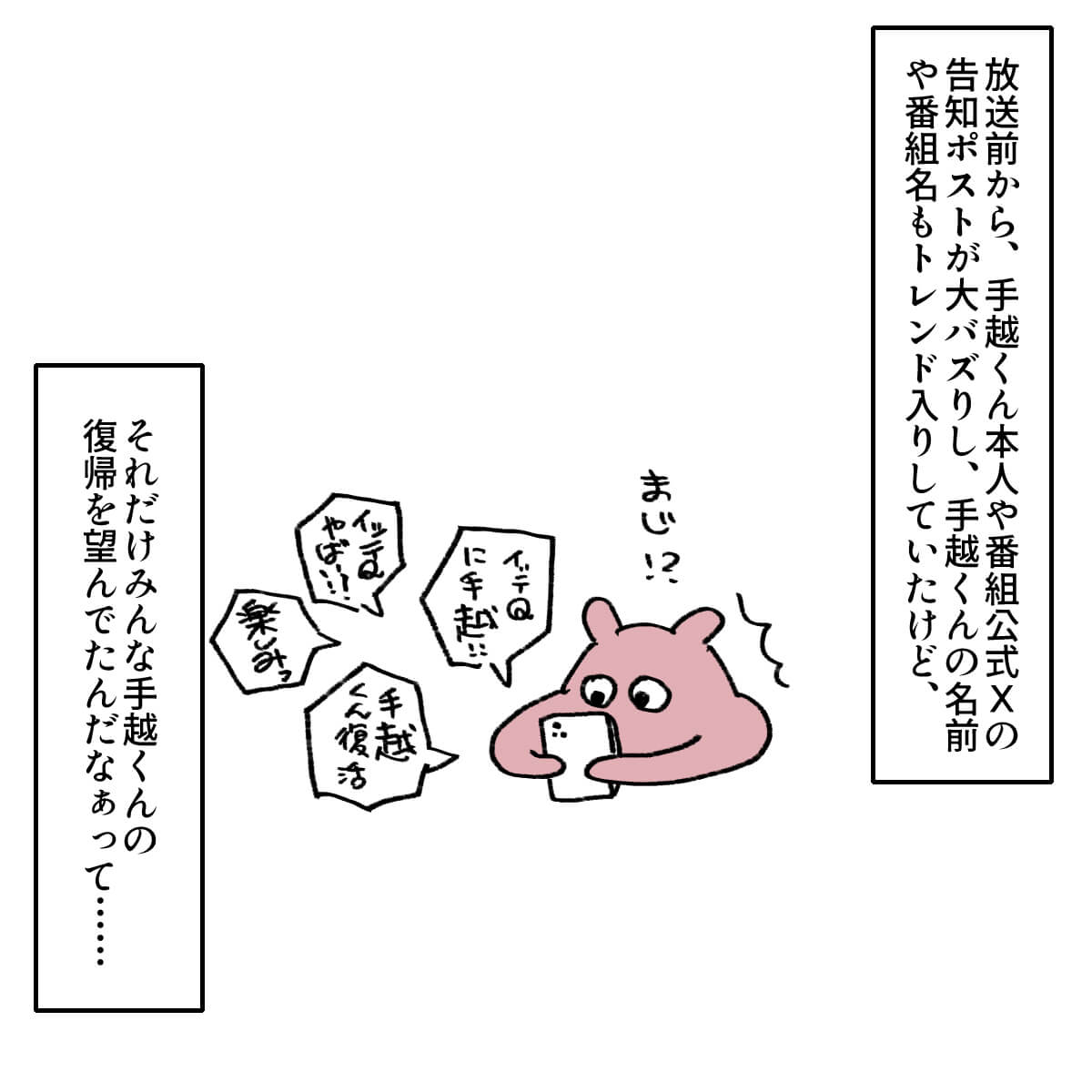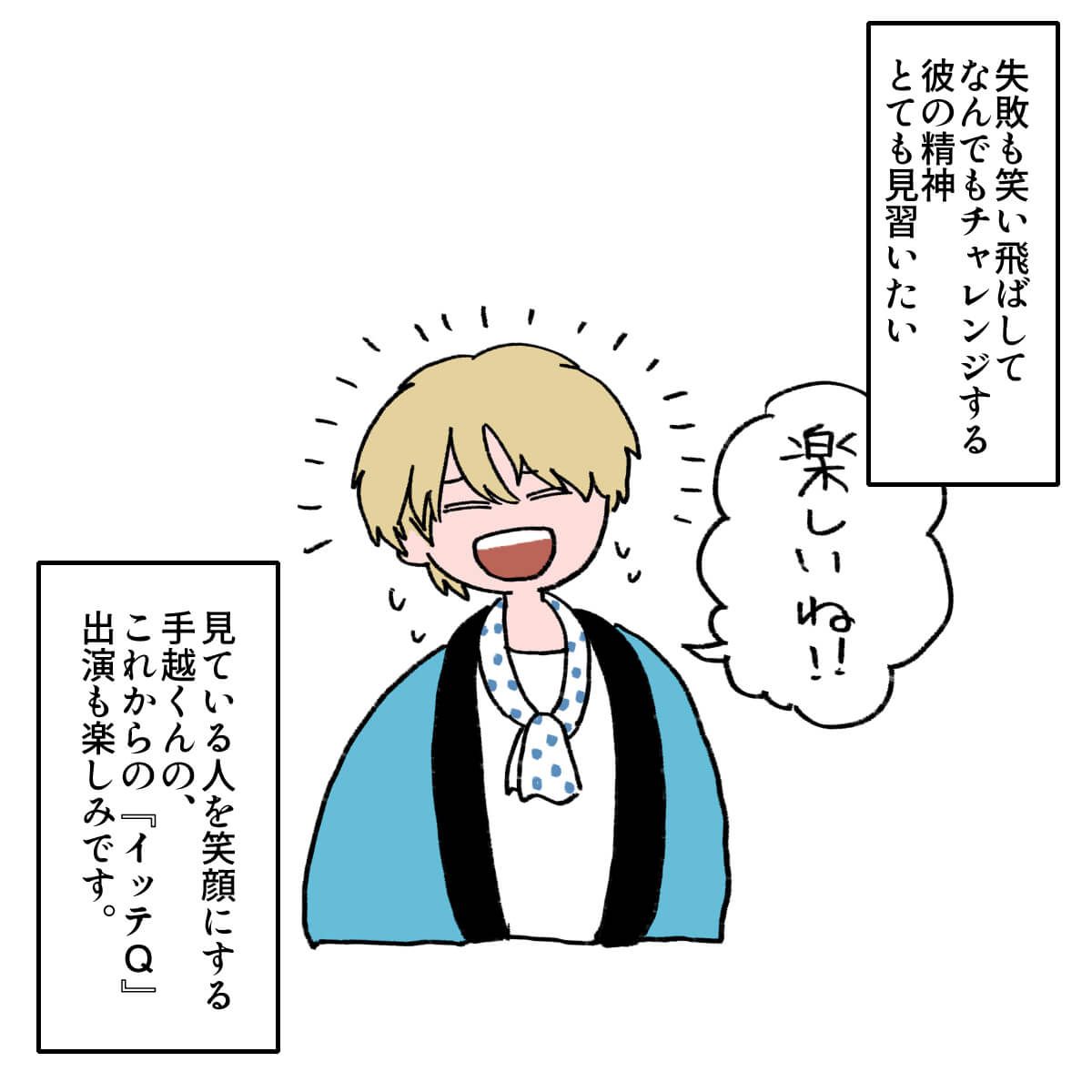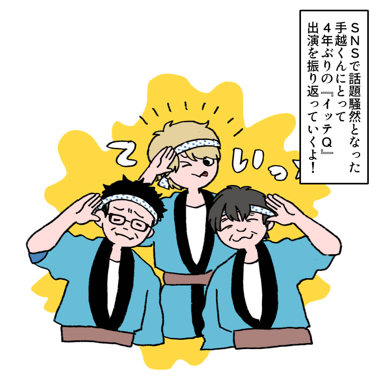 サイゾーウーマン男性アイドルSTARTO(旧ジャニーズ)元ジャニーズ手越祐也手越、『イッテQ』での“自信家っぷり”が最高 男性アイドル [ドルオタ漫画家・竜田トキヒロの“推し事”見聞録]vol.77 手越祐也、相変わらずの“自信家っぷり”が最高! 4年ぶり『イッテQ』出演で高視聴率 2024/10/16 21:00 竜田トキヒロ(マンガ家) 竜田トキヒロの“推し事”見聞録手越祐也 ――Twitterで日々、ジャニーズタレントにまつわるイラストを投稿中のジャニオタ漫画家・竜田トキヒロが、現場レポートからドラマや映画、番組レビューまで、“推し事”の様子をお届け! 今回は、手越祐也の出演で大きな話題を呼んだ、10月13日放送の『世界の果てまでイッテQ!』(日本テレビ系、以下、『イッテQ』)をレビュー! 目次 ・手越祐也と『イッテQ』のこれまで ・手越祐也、『イッテQ』出演で宮川大輔が涙 ・手越祐也、相変わらずの自信家っぷり 手越祐也と『イッテQ』のこれまで 2007年2月の番組放送開始時からレギュラー出演していた手越は、底抜けに明るいキャラクターで過酷なロケにも体当たりで挑み、お茶の間からの人気を獲得。しかし20年6月、コロナ禍の度重なる“自粛破り”が発端となり旧ジャニーズ事務所(現STARTO ENTERTAINMENT)から契約を解除され、番組も事実上の降板となりました。 それから4年5カ月がたった今回、宮川大輔メインの人気企画「世界で一番盛り上がるのは何祭り? 」のイタリアロケに参加。 番組MCの内村光良も含めた3人で、北部のコマッキオで行われた「ウナギ祭り」の立ち漕ぎボートレース(金のパラデッロレース)に挑戦することに。 手越の出演が発表されるとSNS上は大盛り上がりで、実際の放送も世帯平均視聴率13.5%(ビデオリサーチ調べ、関東地区)を記録。今年の同番組最高を更新したそう。 久々の『イッテQ』で手越はいったいどんな姿を見せたのか、イラストで振り返っていきます! 手越祐也、4年ぶり『イッテQ』出演で宮川大輔が感極まり涙 手越祐也、撮れ高◎! 相変わらずの自信家っぷりが最高 ★これまでの連載記事はこちらから 竜田トキヒロ(マンガ家) 漫画家、イラストレーター。育休中に執筆したエッセイ漫画でKADOKAWAコミックエッセイ大賞受賞。Ameba、ライブドア公式ブロガーを経たのち現在はインフルエンサーとしてエンタメ、オタクに特化した漫画やイラストや体験ルポ等幅広く執筆。著書『コミュ障母さんとごきげん娘』(KADOKAWA) X:@musumenuma 最終更新:2024/10/16 21:00 スタジオ復帰もかなうといいね 関連記事 手越祐也『イッテQ』4年ぶり復帰へ……なにわ男子・大橋和也が後釜になれなかったワケ手越祐也に再評価の声! 『トークサバイバー!3』で柏木由紀と熱愛芸人が言わせたこととは?手越祐也、朝倉未来&平本蓮が『超RIZIN.3』国歌斉唱に反発で辞退――「大人の対応」と称賛集まるHey! みんな元気かい? 錦戸亮、手越祐也、近藤真彦……元ジャニーズたちの2023年春手越祐也、キー局から消えるも……九州でローカルタレント化! ライバルは波田陽区 次の記事 スノ、新曲初日2.9万DLの要因 >