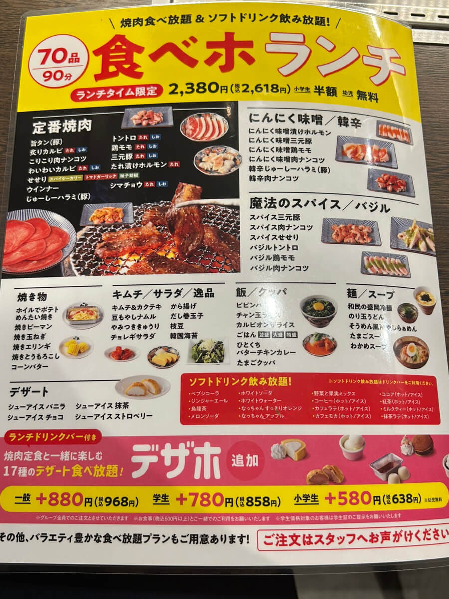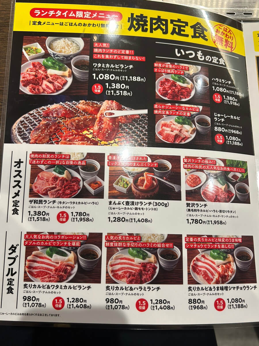 サイゾーウーマン暮らし食べ物【焼肉の和民】768円ランチが驚きの満足度 暮らし [実食レビュー] ワタミ売上高7.6%増、【焼肉の和民】768円ランチ食べたら驚きの満足度! 2024/11/20 13:00 サイゾーウーマン編集部 食べ物 焼肉の和民の外眼(C)サイゾーウーマン かつて居酒屋界で隆盛を誇った「和民」。現在は、「焼肉の和民」へと業態を変え、埼玉、東京、神奈川、愛知、大阪、兵庫、奈良の1都1府5県に24店舗を展開しています(2024年4月9日時点)。どんな店なのか? 実際に利用してきました。 目次 ・【ワタミ】売上高7.6%増! ・「和民」撤退と【焼肉の和民】出店の流れ ・【焼肉の和民】メニューが充実! ・平日限定768円ランチ定食を実食! ・【焼肉の和民】お一人様でも入りやすい! ※2024年4月9日公開の記事を再編集しています。 ※価格はすべて税込 ※メニューや値段は4月9日時点の情報です ※店舗によって取り扱い商品が異なります ※最新の情報は公式サイトや公式SNSをご確認ください 【ワタミ】売上高7.6%増! 居酒屋「和民」をはじめ、複数の外食チェーンを展開するワタミ株式会社。最近では世界最大のサンドイッチチェーン「サブウェイ」の日本事業を買収して世間を驚かせました。 11月14日に発表したワタミの2024年7〜9月決算によると、売上高は433億8600万円(前年同期比7.6%増)、営業利益は22億1500万円(22.5%増)と伸びています。消費の回復や値上げにより、国内外食事業や海外事業における増収が進んだとのことです。 一方で経常利益、当期利益は為替の影響で大幅な減益となっています。 居酒屋「和民」撤退で新業態「焼肉の和民」出店へ ワタミ株式会社の看板ブランドとして、2012年時点で全国に700店舗存在した「和民」ですが、若者の居酒屋離れや、消費税の増税、さらには従業員に対するブラックな雇用実態が明らかとなったことによるイメージダウンもあり、客が激減。17年3月時点で137店舗まで規模を縮小しました。 その後も業績不振による閉店が相次ぎ、コロナ禍のあおりを受けたこともあって20年10月には、既存の居酒屋業態120店舗を焼肉の新業態「焼肉の和民」に転換し、1号店を東京・大田区に出店。 当初は、「ミライザカ」や「三代目 鳥メロ」などのの居酒屋業態も順次「焼肉の和民」に切り替え、5年で400店舗の出店を目指していたものの、居酒屋業態が回復。 23年3月期の連結営業利益は、14億7400万円と3期ぶりに黒字となり、売上高も779億2200万円と、コロナ前の19年3月期と比べ、80%弱まで業績を戻しました。 【焼肉の和民】平日限定ランチメニューが768円! 今回、私が公式サイトを見て気になった、平日限定のランチメニューが以下の4品。1,000円以下で手軽に焼肉ランチが味わえるという、破格の値段設定です。 ・「炙りカルビ&しお豚バラランチ」768円 ・「炙りカルビ&しお豚バラランチ 1.5倍盛」988円 ・「炙りカルビ&うま味噌鶏モモランチ」768円 ・「炙りカルビ&うま味噌鶏モモランチ 1.5倍盛」988円 ※全品、ごはん、スープ、ナムル付き 700円台も展開していることに驚き。 「食べホランチ」2,618円のメニュー(C)サイゾーウーマン ほかにも、午前11時~午後4時のランチタイム(一部店舗は2時半まで)限定の焼肉食べ放題&ソフトドリンク飲み放題メニュー「食べホランチ」70分90品2,618円(小学生半額、幼児無料)や、平日限定の「学割食べホ」70分90品2,500円、そのほか定食セットも複数あり、メニューが実に豊富! 定食メニューも充実のラインアップ(C)サイゾーウーマン 「いつもの定食」の「じゅーしーカルビランチ」や、「ダブル定食」の「炙りカルビ&うま味噌シマチョウランチ」は、休日でも1,000円以内の968円という安さで食べられます。 こんなにあると、選ぶのも一苦労(C)サイゾーウーマン そのほかの食べ放題メニューや、お肉や野菜、フード、デザートの単品メニューをはじめ、アルコールも多数用意されているほか、 ソフトドリンクバーもあり、充実のラインアップで、なにかと使い勝手が良さそうだなと感じました。 【焼肉の和民】「炙りカルビ&しお豚バラランチ」768円、想像以上! カウンターは2人席になっていて、1人だと広すぎるくらいです(C)サイゾーウーマン 私が注文したのは、「炙りカルビ&しお豚バラランチ」768円。店員さんが手渡してくれたメニュー表に載っていなかったので、「もしやこの店では販売していない?」と不安がよぎりましたが、卓上のタッチパネルの「焼肉定食」の欄にしっかり載っていました。 平日限定ランチは、「焼肉定食」のコーナーに載っています(C)サイゾーウーマン そうして注文を完了すると、10分たたないうちに目の前の特急レーンに定食セットが運ばれてきます。回転寿司みたいで、思わずテンションが上がりました。 ビューンとレーンに乗ってお盆ごと運ばれてきます(C)サイゾーウーマン 炙りカルビ3枚と、しお豚バラが4枚、ピーマン半分、エリンギ1本に、ごはんとスープ、ナムルがセットになっています。 ご飯とスープの位置が逆なのがやや気になりました