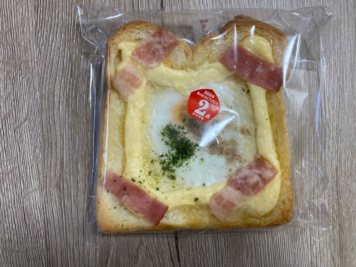 食パンにマヨネーズと目玉焼きとベーコンを乗っけてトーストにした一品。朝ご飯がコレ1品で完了しますね。見たとおりの間違いない味で、ペロッと食べられて、まったく飽きないパン。