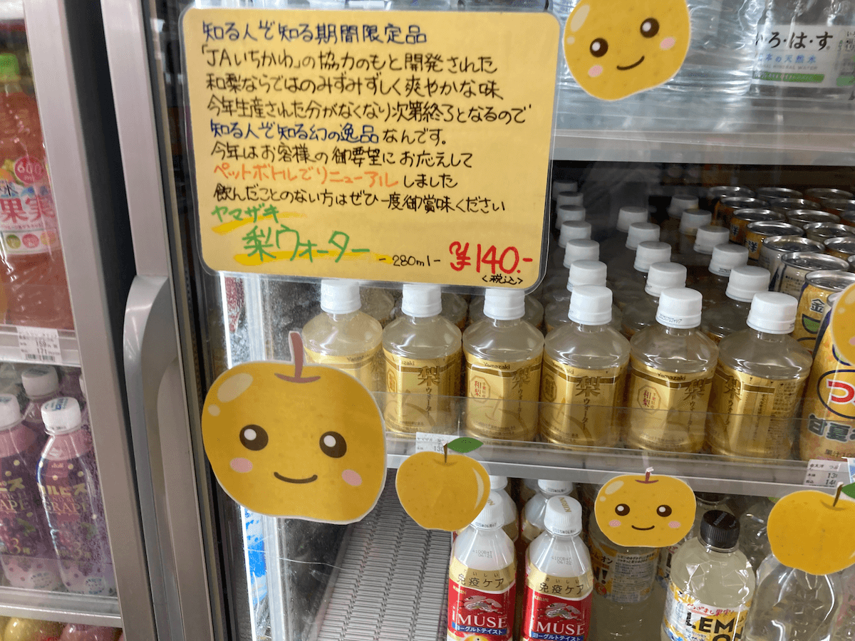 11月上旬、愛鷹パーキングエリアのデイリーヤマザキで見つけた「梨ウォーター」。初めて目にしたのですが、調べてみるとデイリーヤマザキとJAいちかわの共同開発による商品なんだとか。