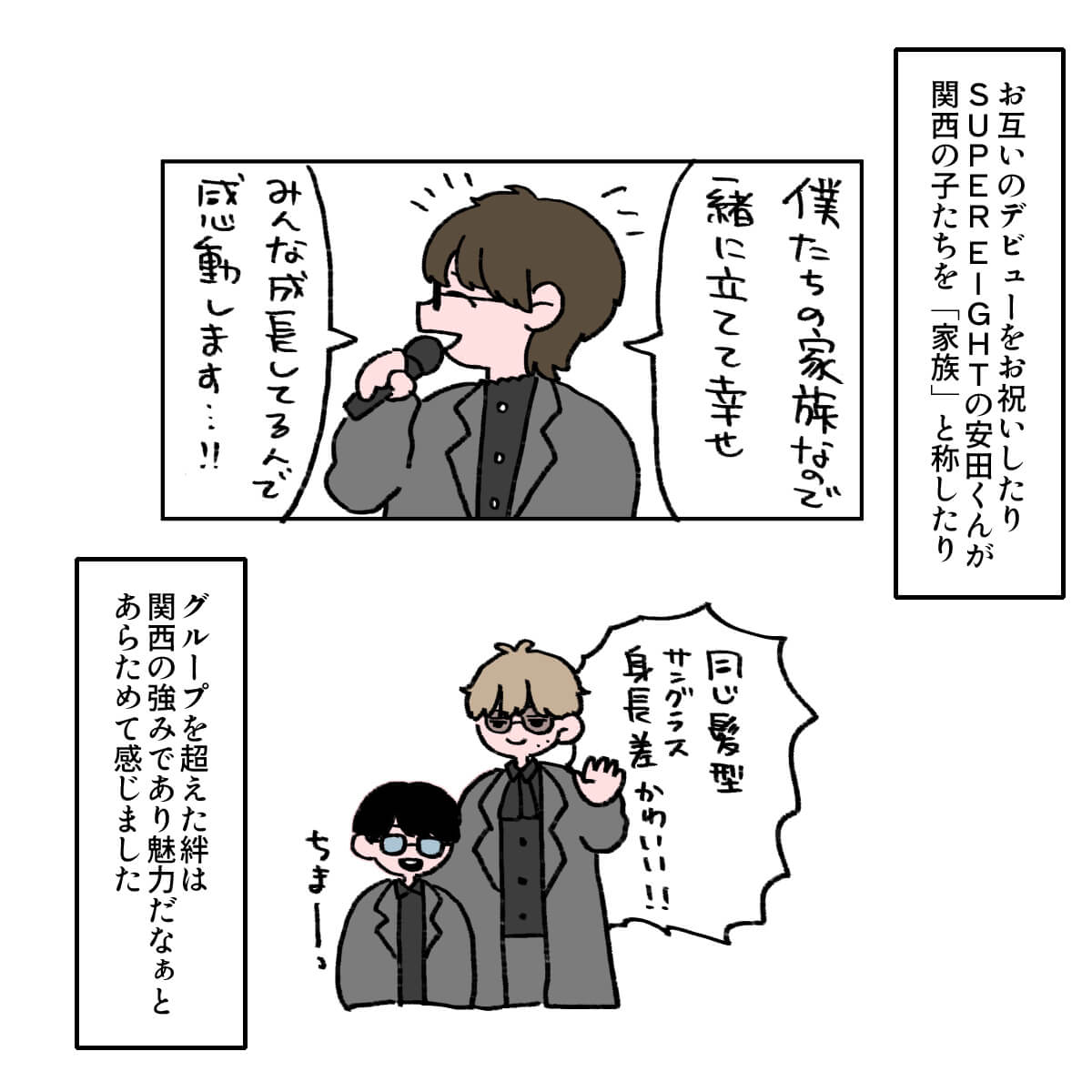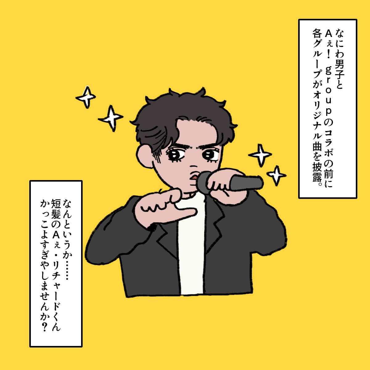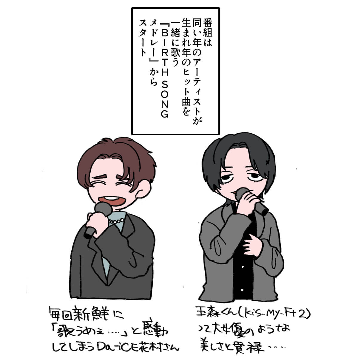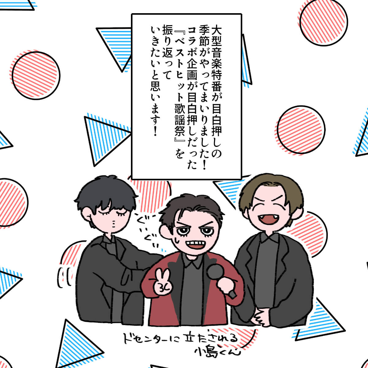 サイゾーウーマン男性アイドル『ベストヒット歌謡祭』プレイバック 男性アイドル [ドルオタ漫画家・竜田トキヒロの“推し事”見聞録]vol.81 『ベストヒット歌謡祭』で感じた、SUPER EIGHT・なにわ男子ら関西勢の“強みと魅力” 2024/11/20 21:30 竜田トキヒロ(マンガ家) 竜田トキヒロの“推し事”見聞録M!LKEBiDAN ――Twitterで日々、ボーイズグループのメンバーにまつわるイラストを投稿中のドルオタ漫画家・竜田トキヒロが、現場レポートからドラマや映画、番組レビューまで、“推し事”の様子をお届け! 今回は、11月14日午後7時から3時間にわたって放送された音楽特番『ベストヒット歌謡祭2024』(日本テレビ系)をレビューします! 目次 ・『ベストヒット歌謡祭2024』の見どころ ・Kis-My-Ft2・藤ヶ谷太輔の“色気”がだだ漏れ!? 『ベストヒット歌謡祭2024』は、見どころが盛りだくさん! 14日、大阪城ホールから生放送された『ベストヒット歌謡祭 2024』(以下、『ベストヒット歌謡祭』)には、今年の音楽シーンを彩った豪華アーティスト25組が登場し、最新のヒット曲を披露しました。 また、同い年のアーティストが事務所の垣根枠を超え、生まれ年に“ベストヒット”を果たした楽曲をパフォーマンスする「BIRTH SONGメドレー」では、91年生まれのKis-My-Ft2・玉森裕太とDa-iCE・花村想太が米米CLUB「浪漫飛行」、83年生まれのSUPER EIGHT・丸山隆平、DA PUMP・KIMIとU-YEAHがラッツ&スターの「め組のひと」を歌唱しました。 さらに、SNSを中心に話題となったダンスチューンを出演アーティストがパフォーマンスする「みんなで踊ろう!ヒットダンスメドレー2024」などの特別企画も実施。 そのほか、STARTO ENTERTAINMENT(旧ジャニーズ事務所)からは、なにわ男子とAぇ! groupがジュニア時代の思い出の曲を関西ジュニアと共に歌唱したり、SUPER EIGHTとなにわ男子、Aぇ! groupのコラボも。エンディングでは、SUPER EIGHT・横山裕がAぇ! group・小島健をステージ中央に引っ張り出すなど、仲のいい関西ジャニーズならではの絡みも見られました。 そんな見どころが盛りだくさんだった同番組について、ドルオタの竜田トキヒロが、印象に残ったパフォーマンスをイラストで振り返っていきます! 『ベストヒット歌謡祭』Kis-My-Ft2・藤ヶ谷太輔の“色気”がだだ漏れ!? SUPER EIGHT、なにわ男子、Aぇ! groupら“関西勢”の強みと魅力 ★これまでの連載記事はこちらから 竜田トキヒロ(マンガ家) 漫画家、イラストレーター。育休中に執筆したエッセイ漫画でKADOKAWAコミックエッセイ大賞受賞。Ameba、ライブドア公式ブロガーを経たのち現在はインフルエンサーとしてエンタメ、オタクに特化した漫画やイラストや体験ルポ等幅広く執筆。著書『コミュ障母さんとごきげん娘』(KADOKAWA) X:@musumenuma 最終更新:2024/11/20 21:30 関連記事 なにわ男子・藤原丈一郎、『ベストヒット歌謡祭』に「チケットの招待とかない」! 家族の観覧当選を報告『ベストヒット歌謡祭』炎上まとめ――SMAPを「懐かしのアイドル」扱い、乃木坂46「アポロ」生歌が物議Snow Manから&TEAM、JO1まで……『ベストアーティスト』名場面をプレイバック!BE:FIRST・SOTA、Snow Manラウールら『FNS歌謡祭』ダンスコラボ7名の魅力とは?BE:FIRST・SOTAが謙虚すぎ! TBS「ダンサーランキング」を振り返る【結果一覧あり】 次の記事 timelesz初日21万枚売り上げ! >