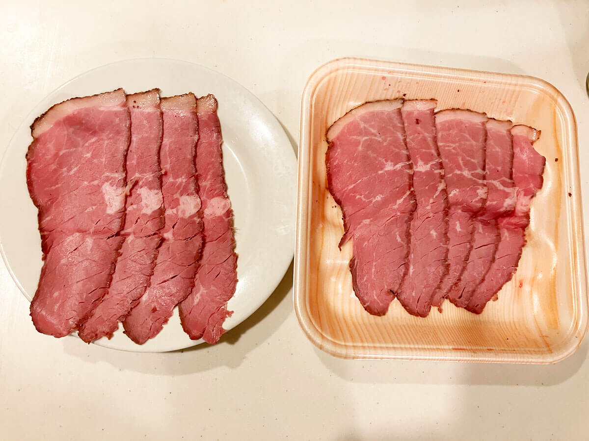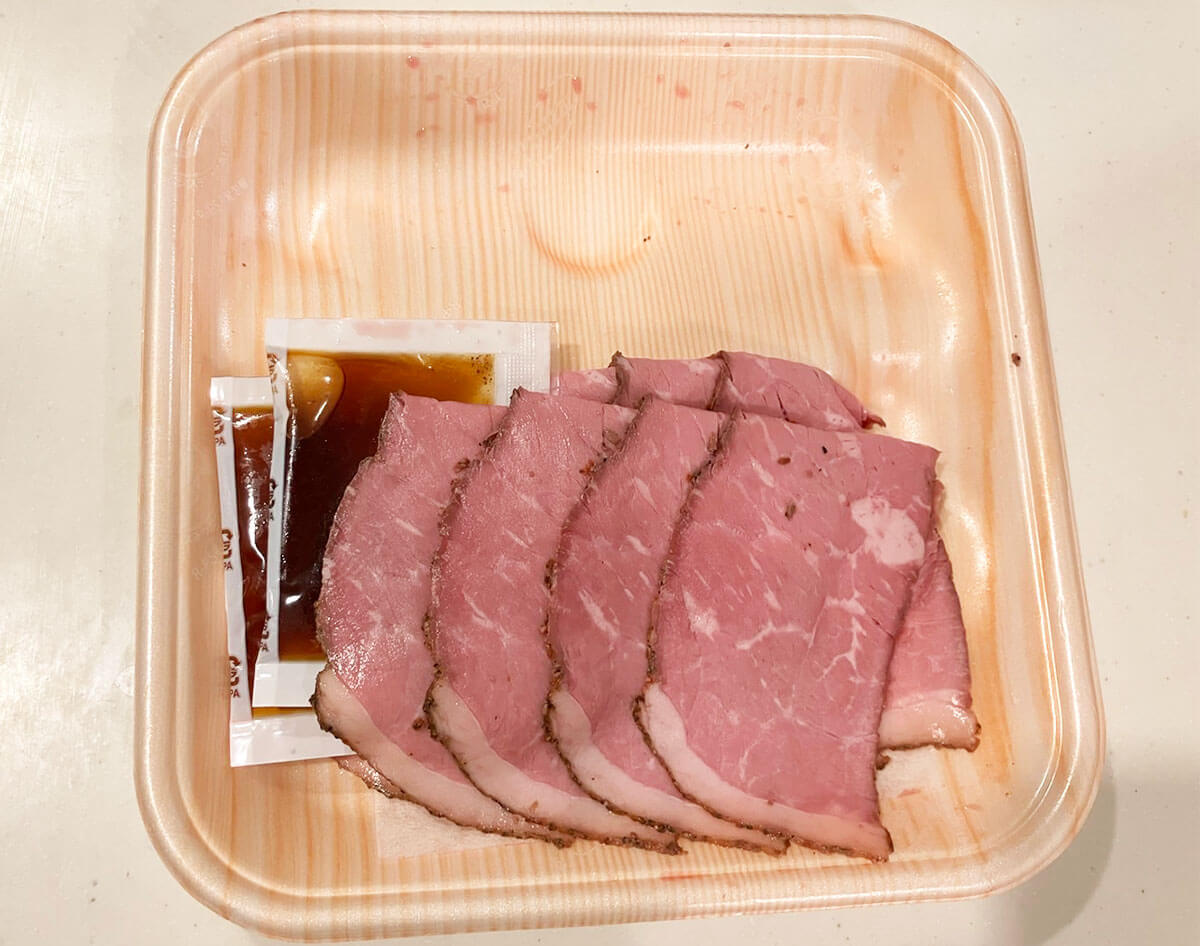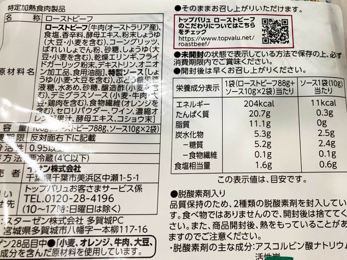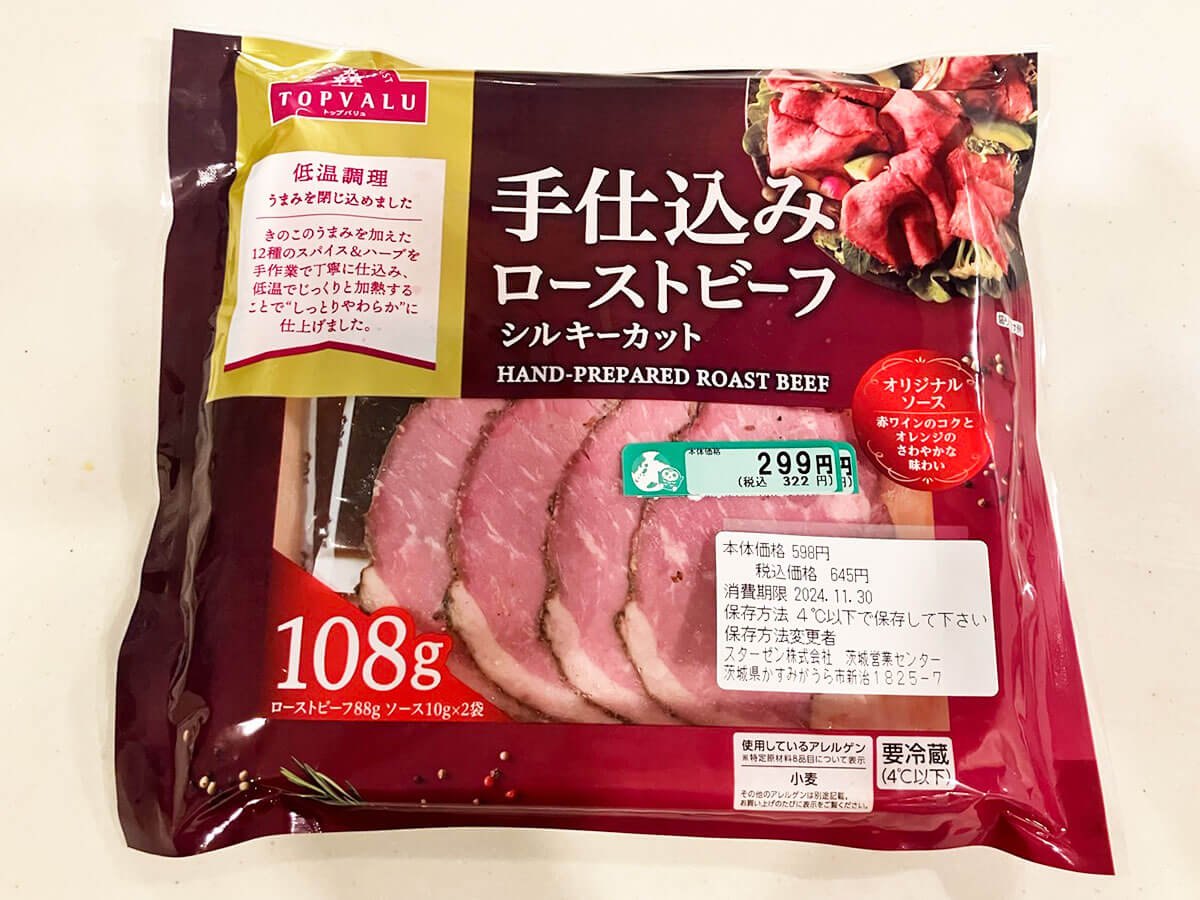 サイゾーウーマン暮らし食べ物『ジョブチューン』合格したローストビーフ実食 暮らし トレンド商品ガチレビュー 大幅減益の【イオン】『ジョブチューン』パーフェクト合格のトップバリュ「645円惣菜」は? 大きな肉にびっくり! 2024/12/04 15:00 仲宗根由紀子(エンタメライター) 暮らしスーパーイオン イオンの外観(写真:サイゾーウーマン) 5月放送の『ジョブチューン』(TBS系)でジャッジされたイオンのトップバリュ商品。パーフェクト合格となった5品のうち、「手仕込みローストビーフ シルキーカット」を実食レビューします。 目次 ・【イオン】トップバリュ、売上高は1.4兆円でさらに強化 ・『ジョブチューン』パーフェクト合格の「トップバリュ」5品は? ・トップバリュ「手仕込みローストビーフ シルキーカット」をチェック ・トップバリュ「手仕込みローストビーフ シルキーカット」を実食 【イオン】トップバリュ、売上高は1.4兆円で今後さらに強化 イオン系列のスーパーマーケットやコンビニなどで販売されているプライベートブランド「トップバリュ」ですが、その売上は2024年2月期では売上高1兆4000億円で1兆円の大台を突破。さらに、24年3~8月の売上高は前年比7%増の5,362億円を記録し、好調の波は続いています。 しかし、イオン全体の24年3〜8月までの営業収益は前年同期比6.1%増の4兆9994億3,500万円だった一方、営業利益は16.2%減の986億円、経常利益は19.7%減の898億1,900万円、純利益は76.5%減の54億8,800万円となり、大幅に減益。 そんな状況を踏まえ、先月の決算説明会でイオンは、売上構成比で20%ほどを占める「トップバリュ」をさらに強化すると強調していました。 『ジョブチューン』パーフェクト合格の【トップバリュ】5品は? 5月18日の『ジョブチューン~アノ職業のヒミツぶっちゃけます!』(TBS系)では、一流料理人がイオンのPB「トップバリュ」をジャッジする「イオントップバリュ×超一流料理人」を放送。その結果、パーフェクト合格となったのは以下の5商品でした。 ・むね肉から揚げ ・ガパオ ・タスマニアビーフ100%ハンバーグステーキ ・手仕込みローストビーフシルキーカット ・ギョーザ 非公開: 【ジョブチューン】トップバリュTOP10「合格・不合格」結果まとめ! 「肉汁あふれる豚シューマイ」実食レポ 5月18日の『ジョブチューン~アノ職業のヒミツぶっちゃけます!』(TBS系)で、一流料理人がイオンのPB「トップバリュ」をジャッジする「イオントップバリュ×超一流...サイゾーウーマン2024.05.18 【トップバリュ】「手仕込みローストビーフ シルキーカット」645円をチェック 今回はパーフェクト合格した商品の中から、トップバリュの生食部門で7年連続売上1位を誇るという「手仕込みローストビーフ シルキーカット」を実食します。 (写真:サイゾーウーマン) こちらがイオン傘下のスーパーマーケット「カスミ」で購入した商品。通常は645円ですが、見切り品コーナーにて半額の322円でゲットできました。 「スターゼン」の文字!(写真:サイゾーウーマン) 製造している食品会社が「スターゼン」であることに気づき、思わずテンションアップ! 実は筆者、スーパーの冷凍食品売り場に置かれているスターゼンの「チーズインハンバーグ」のファンで、5年以上もリピート買いを繰り返しているのです。これは期待が高まります。 【業スー、西友、イオン】冷凍&チルド「チーズインハンバーグ」食べ比べレポ! 108円“5種のチーズ”に揺さぶられた!!――業務スーパーマニアの節約大好き俳優・布川隼汰が、業スーのポテンシャルを今一度見つめ直すべく、ほかの人気スーパーの商品とガチ食べ比べ! 今回はチーズインハンバーグ3種を調...サイゾーウーマン2022.02.03 商品説明(写真:サイゾーウーマン) 商品説明によれば、きのこの旨味を加えた12種類のスパイス&ハーブで仕込み、低温調理したとのこと。「しっとりやわらか」を強調しています。 原材料など(写真:サイゾーウーマン) 牛肉はオーストラリア産を使用。ほかに、酵母エキス、粉末しょうゆ、乾燥エリンギ、フライドガーリック粉末などがローストビーフの調理に使われているようです。 一方、特製ソースには、しょうゆ、醸造酢、デミグラスソース、セロリパウダー、ワイン、濃縮オレンジ果汁などが入っています。 中身(写真:サイゾーウーマン) 中のトレーを取り出すと、半分に折りたたまれたローストビーフと、2袋のソースが入っていました。 トレーの3分の1は謎の空間(写真:サイゾーウーマン) パッケージの印刷で隠れていた部分に何もない謎の空間があり、「セブン‐イレブン」の“底上げ騒動”を思い出しました。 お肉は9切れ(写真:サイゾーウーマン) 半分にたたまれていたローストビーフを広げてみると、お肉は9切れ入っていました。一般的なハムほどの厚さながら、1切れの長さは15cmほどあり、想像よりも大きくてびっくり! 通常価格で買うと、1枚あたり72円です。 【トップバリュ】「手仕込みローストビーフ シルキーカット」645円を実食 ソ