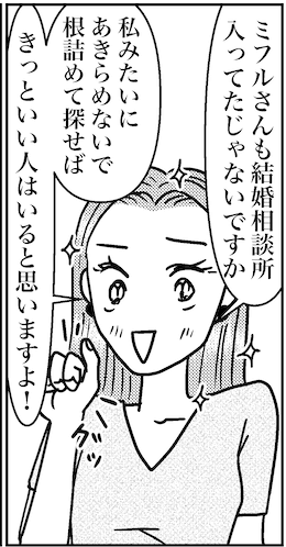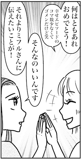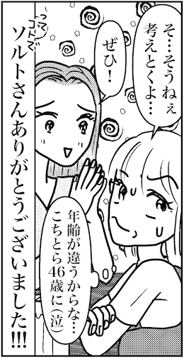 サイゾーウーマンカルチャーマンガプロポーズの後に初夜だった カルチャー まんが『オバサンと言われても結婚したい!』読者編 【アラフォー婚活ルポ】プロポーズの後に初夜だったのね 2024/12/04 13:30 白戸ミフル(マンガ家) オバサンと言われても結婚したい! ――合コン歴20年以上、累計回数2,500回以上、30代なかばに乳がんで闘病するも、現在は絶賛婚活中のライター・漫画家の白戸ミフルが「アラフォー婚活」の実体験をほぼリアルタイムでお届けします! アラフォー中の結婚は成就するのか……!? 【前回まで】 しばらくは「番外編」で読者の婚活体験をご紹介! 32歳で結婚相談所に入会、ハイスペ医師と仮交際になったソルトさん。彼のマウント発言にブチギレたことがきっかけで、真剣交際・プロポーズまでこぎつけた。 読者エピソード編『プロポーズの後に初夜だったのね』 ――続きは12月8日公開! 作者・白戸ミフルさんと婚活話をしたい方、大募集! 連載『オバサンといわれても結婚したい!』の作者・白戸ミフルさんと婚活の体験談をおしゃべりしてくれる方を大募集! 連載内で漫画化させていただきます。 ご応募はこちらのGoogleフォーム(婚活インタビュー大募集)からお願いします。 【アラフォー婚活ルポ】「お前、もう結婚はあきらめたのか?」――合コン歴20年以上、累計回数2,500回以上、30代なかばに乳がんで闘病するも、現在は絶賛婚活中のライター・漫画家の白戸ミフルが「アラフォー婚活」の実体験をほぼリアルタ...サイゾーウーマン2024.11.06 【アラフォー婚活ルポ】姉がアプリでゲットした再婚相手に驚き!――合コン歴20年以上、累計回数2,500回以上、30代なかばに乳がんで闘病するも、現在は絶賛婚活中のライター・漫画家の白戸ミフルが「アラフォー婚活」の実体験をほぼリアルタ...サイゾーウーマン2024.11.03 ――バックナンバーはこちら 白戸ミフル(マンガ家) 神奈川県出身。漫画家・ライター。タレント活動の後、マスコミ系の職業を渡り歩き、現在は化粧品メーカーに勤務。合コン歴20年以上、累計回数2500回以上。女性向けwebメディアほか、男性向けメディア、旅系メディア等でライターとして幅広く執筆。著書『合コン・アンド・ザ・シティ 恋活・婚活女子の合コンマニュアル』(ごきげんビジネス出版)、 『乳がんステージ4だった私が、それでも合コンに行きまくって救われた話』(キノブックス) 記事一覧 X:@takara0722 Instagram:@tamifull0722 【アラフォー闘病&婚活記】 最終更新:2024/12/04 13:34 ハリーウィストン、長谷川理恵と同じじゃん! 関連記事 【アラフォー婚活ルポ】「お前、もう結婚はあきらめたのか?」【アラフォー婚活ルポ】姉がアプリでゲットした再婚相手に驚き!【アラフォー婚活ルポ】バリキャリになりたいわけじゃないし、結婚はしたい【アラフォー婚活ルポ】運命だって言ってくれたのに【アラフォー婚活ルポ】オッパイのこと? 大丈夫だろ~? その他の作品を読む 次の記事 男性アイドル生写真売り上げ11月ベスト10 >