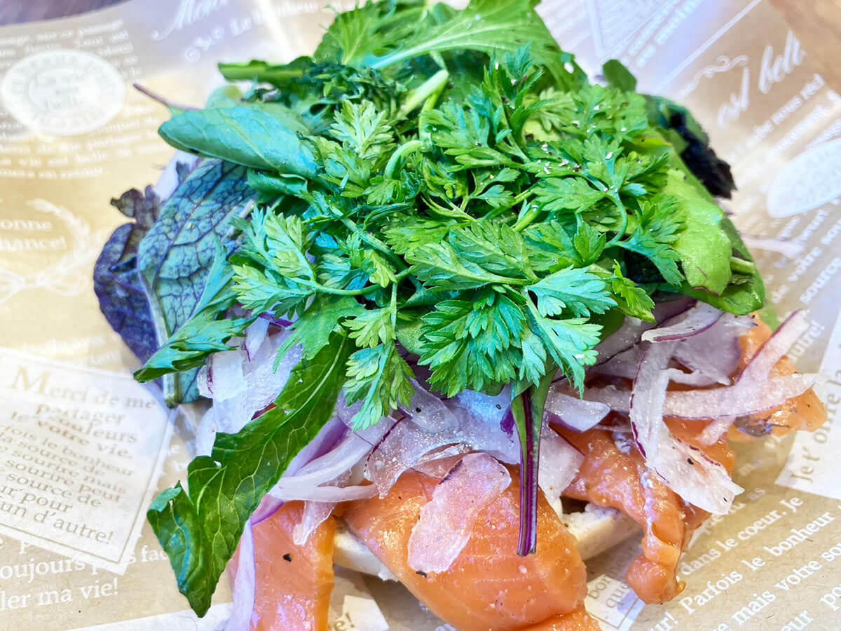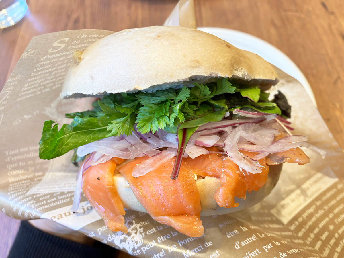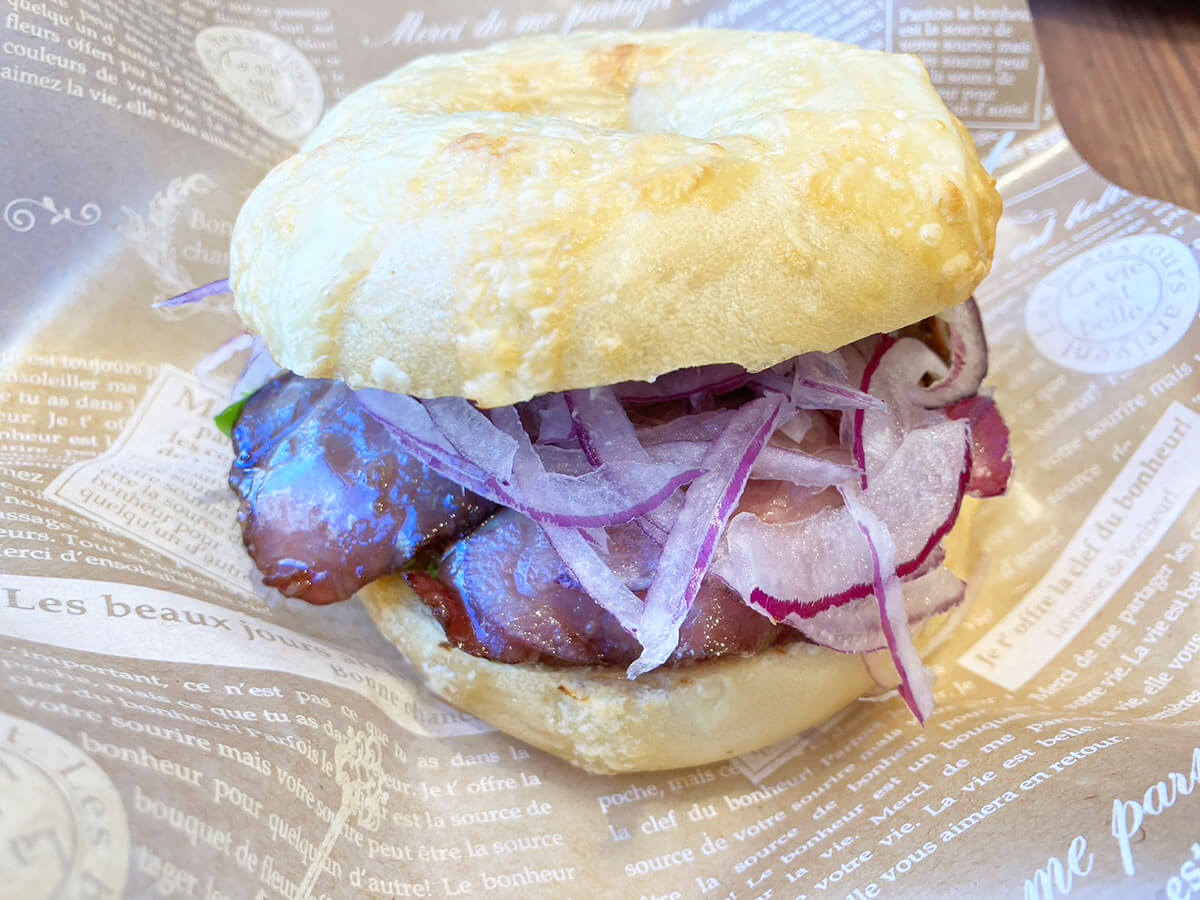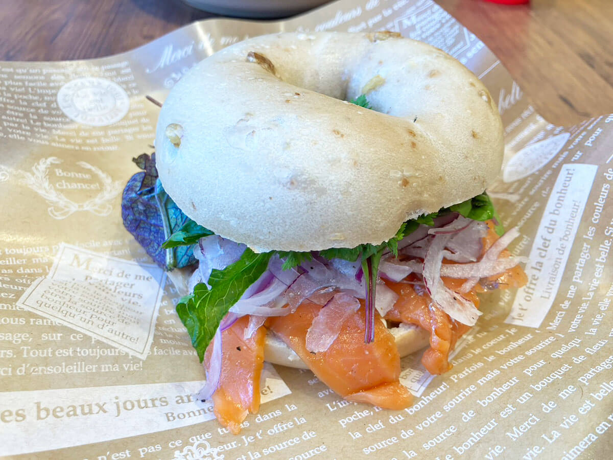 サイゾーウーマン暮らし食べ物店舗数減少の「ベーグル&ベーグル」実食 暮らし あの人気チェーン店は今…… 店舗数が半減【ベーグル&ベーグル】、1,045円サンドを食べたら感動! そして反省したワケ 2024/12/06 15:00 仲宗根由紀子(エンタメライター) 暮らしベーグル&ベーグル 「ベーグル&ベーグル」の外観(写真:サイゾーウーマン) かつて1号店の出店を皮切りに日本でベーグルブームを引き起こしたベーグル専門店チェーン「ベーグル&ベーグル」。ブームが去って久しい今、カフェ業態の店舗で人気商品を食べてみます。 目次 ・【ベーグル&ベーグル】店舗数が半分以下まで減少 ・【ベーグル&ベーグル】カフェメニューをチェック ・「サーモン&クリームチーズ」1,045円を実食 ・【ベーグル&ベーグル】「ローストビーフ」も実食 ・【ベーグル&ベーグル】おいしさにびっくり ※価格はすべて税込み。 ※店舗によって取り扱い商品や価格が異なります。 ※2024年11月30日の情報です。 【ベーグル&ベーグル】店舗数がピーク時の半分以下に減少 JFLAホールディングスの子会社であるアルテゴが運営するベーグル&ベーグル。まだ日本でベーグルが珍しかった1997年8月に東京都・新宿で開業。 もちもち食感やおしゃれな見た目、原材料が「水、小麦粉、練り込み素材のみ」というローファット食品であることから女性を中心にブームとなり、14年ほど前には約70店舗まで拡大しました。 しかし、その後はブームも落ち着き、徐々に減少。2024年も千葉県や愛知県で閉店が続き、現在は北は宮城県、南は徳島県までの30店舗(公式サイトの店舗一覧より)となっており、実店舗はピーク時の半分以下まで減少しています。 【ベーグル&ベーグル】カフェメニューをチェック! ベーグル&ベーグルの実店舗には物販専門店とカフェがありますが、今回はカフェ業態の店舗へ。 入口でカフェ利用か持ち帰りかを問われ、カフェ利用であることを伝えると「お好きな席へどうぞ」と促されました。 女性をターゲットにした内装(写真:サイゾーウーマン) 注文は各テーブルにあるQRコードを読み取り、自分のスマホから送信するシステム。 食事メニューは大きく分けて「ベーグルプレート」「ベーグルサンドイッチ」「クリームチーズサンドイッチ」の3種類で、ほかにキッズプレートやスープ、ケーキなどがありました。 ベーグル、サラダ、デリがのったベーグルプレート(写真:サイゾーウーマン) ボリューミーなベーグルサンドイッチ(写真:サイゾーウーマン) クリームチーズサンドイッチなど(写真:サイゾーウーマン) 今回は、メニュー表に「No.1オススメ」と書かれていた「サーモン&クリームチーズ」(1,045円)を注文することに。ベーグルが数種類から選べたので、「メープルとクルミ」にしてみました。 【ベーグル&ベーグル】「サーモン&クリームチーズ」1,045円を実食 「サーモン&クリームチーズ」が到着(写真:サイゾーウーマン) ほどなくして、テーブルに商品が運ばれてきました。さすが1,000円超えのサンドイッチ、見るからにボリューミーです。 上のベーグルを外すと草原のよう(写真:サイゾーウーマン) 商品説明によると、ベーグルにサンドされている具材はスモークサーモン、クリームチーズ、オニオン、ケーパー、ベビーリーフ、フレッシュハーブ(ミント、ディル、イタリアンパセル、セルフィーユ)、ハーブ岩塩、ブラックペッパーとのこと。 おしゃれなハーブがたくさん入っていて、うれしくなります。 いただきます!(写真:サイゾーウーマン) 大口でかぶりついてみると、ベーグルのもちもち感、脂がのったサーモンのスモーキーさ、クリームチーズのまろやかさ、ケーパーやハーブの鼻に抜ける香り、フレッシュオニオンのシャキシャキ感……それらが合わさり、まさに絶品! 食感と味のバランスが最高です。 【ベーグル&ベーグル】「ローストビーフ」サンドとマフィンも実食 ローストビーフのベーグルサンド(写真:サイゾーウーマン) こちらは同行者が注文したベーグルサンド「ローストビーフ」(880円)です。ベーグルはチーズがのっている「ヴォルケーノ – 焦がしチーズ -」をセレクト。 一口もらいましたが、ローストビーフがたっぷり入っていて、ジューシー。ただ、思いのほか味付けが薄めなので、パンチは期待しないほうがいいかも。 マフィン「抹茶&ホワイトチョコ」(写真:サイゾーウーマン) こちらは同行者が頼んだマフィン「抹茶&ホワイトチョコ」(329円)。店の入口あたりにも常温のマフィンが並んでいましたが、店内で注文すると温かい状態で運ばれてきます。 一口もらったところ、一般的なマフィンよりもフワフワで、スチームケーキに近い印象。濃いめの抹茶の風味と溶けたホワイトチョコがあまりにもおいしかったので、会計時にテイクアウトで追加購入しました。 【ベーグル&ベーグル】「こんなにおいしかったっけ?」とびっくり 「サーモン&クリームチーズ」のおいしさに感動しっぱなしだった今回の実食。筆者は6年ほど前に