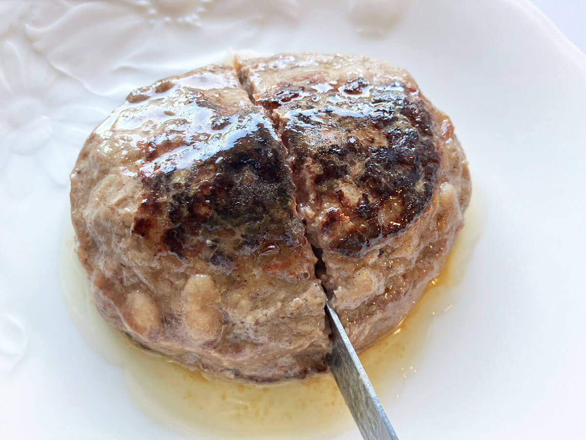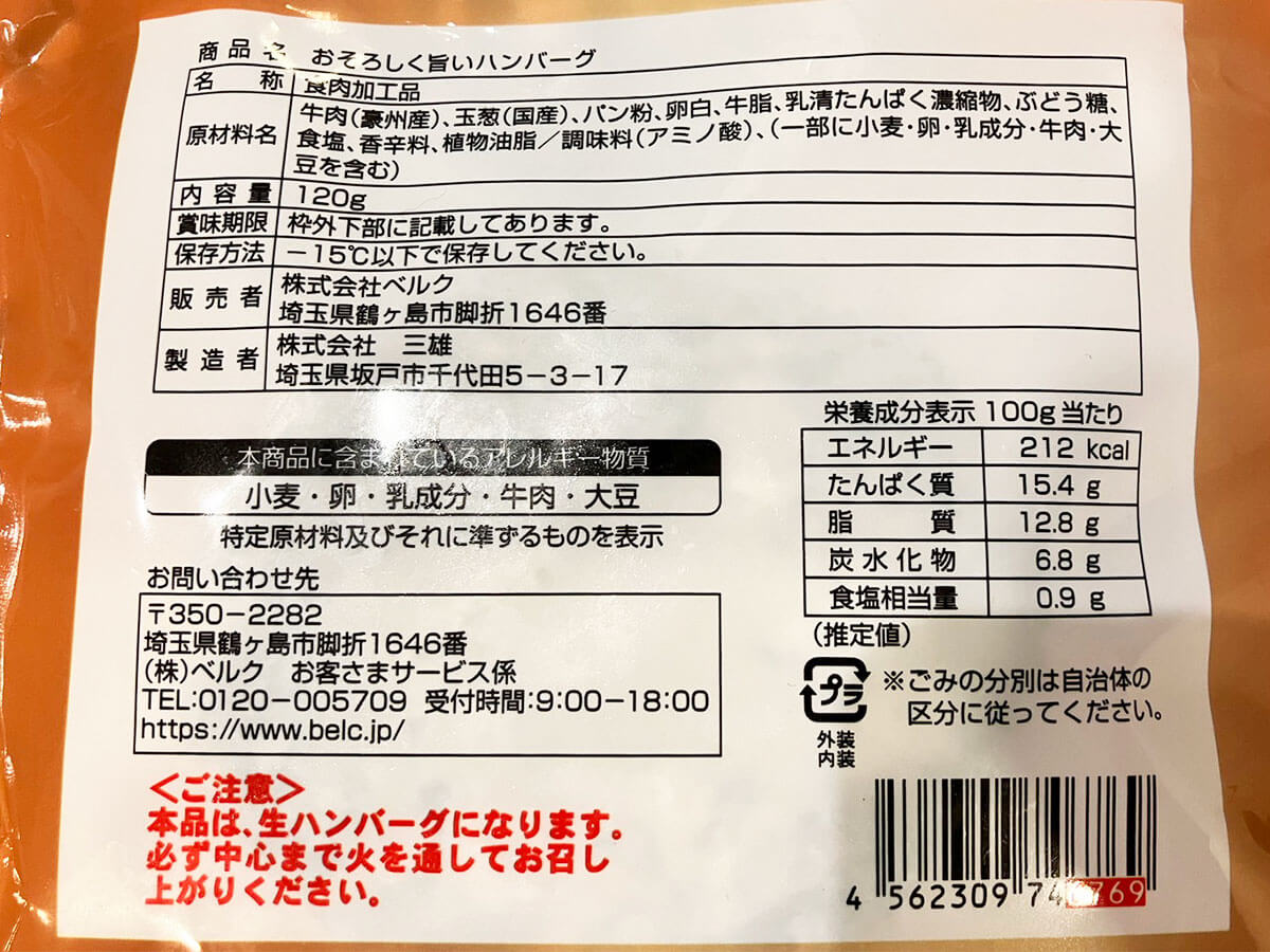 サイゾーウーマン暮らし食べ物ベルク「おそろしく旨いハンバーグ」実食 暮らし スーパー新商品ガチレビュー 【ベルク新商品】388円「おそろしく旨いハンバーグ」は本当か? 食べたら○○に驚き! 2024/12/22 15:00 仲宗根由紀子(エンタメライター) 暮らしスーパーベルク ベルクの外観(C)サイゾーウーマン 埼玉、群馬を中心に関東で142店舗(2024年11月末現在)を展開する人気スーパーマーケット「ベルク」。こちらのプライベートブランドに「ものすごい商品名のハンバーグが登場した」というので、早速食べてみました。 目次 ・イオン傘下【ベルク】PB商品の売上割合が増加 ・「おそろしく旨いハンバーグ」388円をチェック ・「おそろしく旨いハンバーグ」388円を実食 イオン傘下【ベルク】PB商品の売上割合が増加! 埼玉に本社を置くベルクは、ディスカウント路線の地域密着型スーパーマーケット。10月に発表された2025年2月期第2四半期(中間期)の決算によると、前年が大幅な増収増益となったことから前年同期比で増収減益だったものの、売上高・客数・客単価は増加しているといいます。 そんなベルクは、今年11月に埼玉県に「杉戸下高野店」がオープンしたほか、来年5月にも神奈川県に「厚木下川入店」がオープン予定であるなど、今後も拡大が続きそう。 さらに、プライベートブランド「くらしにベルク」の売上も好調で、売上構成比では同PB商品が占める割合が年々上昇しているとか。 商品数もどんどん増えているという「くらしにベルク」ですが、中には「わりとおいしいブラックコーヒー無糖」や「いとしのバナナカステラたち」など、少々変わった商品名が散見されるのも特徴。売り場で二度見した結果、思わずカゴに入れてしまう……なんて効果もありそうです。 【ベルク】「おそろしく旨いハンバーグ」388円をチェック 今回紹介するのは、今年10月に登場した「くらしにベルク」の冷凍商品「おそろしく旨いハンバーグ」(388円)です。 “クセ強”な文字が並ぶパッケージ(C)サイゾーウーマン 自らハードルを上げまくった商品名もさることながら、「俺でなきゃ見逃しちゃうね」という『HUNTER×HUNTER』(集英社)のネットミーム化したセリフが書かれているなど、クセの強いパッケージが印象的です。 なお、こちらはベルクの「肉肉研究会」というチームが開発した商品。筆者は同シリーズの瓶入りスパイス「集まれ肉好き!万能スパイス」を愛用しているため、味への期待が高まります。 原材料など(写真:サイゾーウーマン) 賞味期限は購入日の約半年後と長め。製造は、埼玉の「三雄」という食品メーカーが請け負っているようです。 内容量は120gで、熱量は100gあたり212kcal。牛肉は豪州産で、ほかに国産の玉ねぎ、パン粉、卵白、牛脂などが入っています。 赤字で強調(写真:サイゾーウーマン) パッケージの表と裏に、赤字で「本品は、生ハンバーグになります。必ず中心まで火を通してお召し上がりください」という注意書きが。てっきり火が通ったハンバーグかと思いきや、生ハンバーグのようです。 カチカチに凍ったハンバーグ(C)サイゾーウーマン 外袋を開けると、パウチされたハンバーグが1個出てきました。表面にしっかりと焦げ目がついていますが、「生ハンバーグ」ということなので中心部は生なのかもしれません。 調理方法の説明(写真:サイゾーウーマン) 調理方法は、湯煎か電子レンジの2種類。今回は失敗の少ない湯煎でいきたいと思います。 表示どおりパウチごと15分湯煎しました(写真:サイゾーウーマン) 【ベルク】「おそろしく旨いハンバーグ」388円を実食 牛100%のハンバーグ(C)サイゾーウーマン ハンバーグは結構な厚みがあり、メインおかずとして相応しいサイズ感。表面がカリっと焼かれたハンバーグにナイフを入れると、ジューシーな肉汁が流れ出ました。 切った感触からも、肉が粗びきであることがわかります(写真:サイゾーウーマン) 何も付けずにいただきます(C)サイゾーウーマン 食べてみると、過度な脂っぽさがなく、粗びき肉の食感が実に肉肉しい! 噛むたびに適度な肉汁が出るのでパサつきは感じません。 そして、味つけは想像以上にスパイシーで、黒こしょうがしっかりときいていておいしい! 塩気もあるので、ソースを付けなくても十分ごはんが進みそうです。 もちろん、お好みのソースを付けても◎(写真:サイゾーウーマン) 「おそろしく旨いハンバーグ」という商品名に対し、売り場で「そんなにおいしいのか?」と疑っていた筆者。実際食べてみると、スーパーの冷凍ハンバーグとは思えない本格的な食感と味に驚きました。 調理方法も簡単ですし、何よりこのクオリティーで388円というのは、かなり良心的な印象。賞味期限も長いので、冷凍庫に家族の人数分をストックしておけば、いざという時に重宝しそうです。 商品名にまんまとつられて購入したところ、“当たり”だった今回の実食。味が気になる方は、ぜひ一度試してみては? 【ベルク新商品】215円「紅茶が湧き