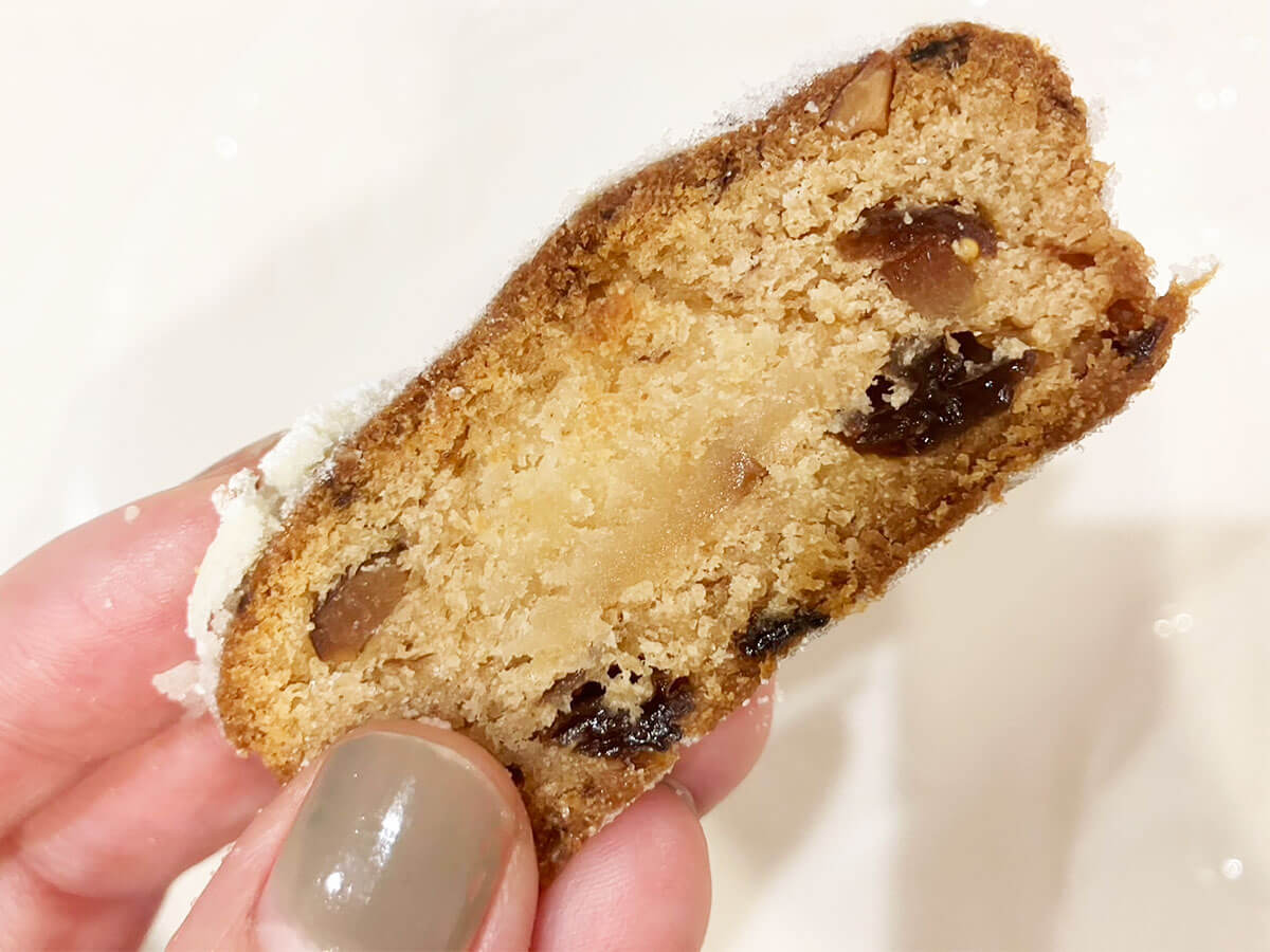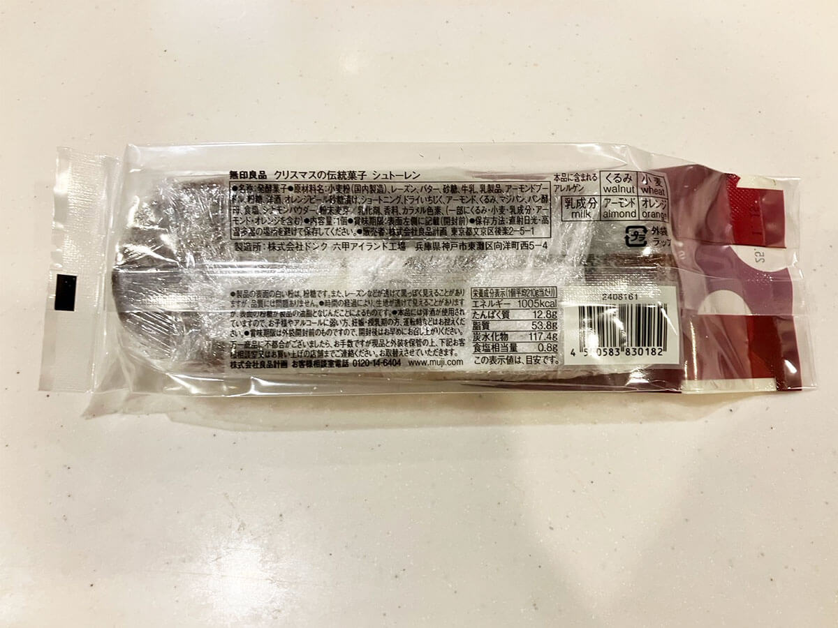サイゾーウーマン暮らし食べ物【無印良品】シュトーレンに仰天! 暮らし トレンド商品ガチレビュー 【無印良品】クリスマス限定「シュトーレン」食べて仰天! 高級ベーカリー製造なのにこの価格 2024/12/21 15:00 仲宗根由紀子(エンタメライター) 無印良品暮らし 無印良品の店頭(C)サイゾーウーマン クリスマスを待ちながら少しずつ食べるドイツ発祥のお菓子・シュトーレン。「無印良品」で販売されているシュトーレンは「実はあの高級パン屋さんが作っている」と毎年話題になっています。購入して、その味をお伝えいたします。 目次 ・【無印良品】営業収益が過去最高 ・シュトーレン1,200円は「ドンク」が製造 ・【無印良品】シュトーレンを実食 ※2024年12月19日時点の情報です。 ※価格はすべて税込み。 ※店舗によって内容・価格が異なる場合があります。 ※最新情報は各店公式サイトをご確認ください。 【無印良品】営業収益が過去最高 株式会社良品計画が運営するチェーン店「無印良品」は、国内655店舗、海外709店舗を展開(2024年8月期末時点。ライセンスドストア、カフェミール、イデー含む)を展開。 自社で開発したオリジナル商品を提供していますが、そのジャンルは実に幅広く、家具、衣料品、食品などに留まらず、住宅の販売やホテル事業なども手掛けています。 また、10月11日に発表された2024年8月期決算では、営業収益と各段階利益がすべて過去最高を更新。営業利益は前年比69.4%増となる561億3,500万円となり、まさに絶好調の企業といえます。 【無印良品】「シュトーレン」1,200円は「ドンク」が製造 無印良品の季節限定商品「クリスマスの伝統菓子 シュトーレン」を紹介します。 雪だるまが描かれたパッケージ(C)サイゾーウーマン 毎年かなり人気のようで、「シュトーレンは無印で買う!」と決めている人もいるとか。公式通販サイトでは早々に「在庫なし」となっていました。ただ、店頭では大量に並んでいたので、まだゲットできるかもしれません。 昨年は1,050円でしたが、今年は1,200円に値上げ。賞味期限は購入から約1か月後の来年1月15日でした。 パッケージ裏面(写真:サイゾーウーマン) 原材料を見ると、洋酒が使用されていて、フルーツはレーズン、オレンジピール砂糖漬け、ドライいちじくが入っています。 製造所に注目(C)サイゾーウーマン 製造者には老舗ベーカリーを営む「株式会社ドンク」の工場名が書かれていました。同社は国内に「ドンク」(113店舗)や「ミニワン」(132店舗)などを展開。フランスパンやミニクロワッサンなどが人気で、デパートにも入っていることから「高級店」と認識している消費者も多いようです。 なお、ドンクの今年のシュトーレンは2,484円(店頭価格)で販売されているもよう。サイズなどの違いはありますが、価格で無印良品を選ぶのもありなのではないでしょうか。 長さは16cmほど(写真:サイゾーウーマン) 裏側。ラップにしっかりとくるまれています(C)サイゾーウーマン ラップを外したところ(写真:サイゾーウーマン) ラップを外す際、表面についている白いマジパンがベロっとはがれそうになりました。この作業は慎重にやったほうがよさそう。 【無印良品】ドンク製造「シュトーレン」を実食 中にはくるみやドライフルーツ(C)サイゾーウーマン 無印良品のシュトーレンは初体験の筆者ですが、これまでパサついたシュトーレンしか食べたことがなく、実はあまり「おいしい」と思ったことがなかったのです。 しかし、無印良品の商品をナイフでカットすると、中は驚くほどしっとり! こんなに瑞々しいシュトーレンは初めてなので、早くも胸が高鳴ります。 いただきます!(写真:サイゾーウーマン) スライスしたものを食べてみると、やはりしっとり食感に仰天! 筆者がこれまで食べてきたパサついたシュトーレンは一体なんだったのでしょか……。 味はシナモン風味がしっかりきいており、くるみやドライフルーツもたっぷり入っているので、上品でリッチな味わいです。当初は「クリスマスまで毎日少しずつ食べよう」と思っていましたが、甘すぎず食べやすいため、結局2日で完食してしまいました……。 ドンクが製造しているだけあって、クオリティーの高さが印象的だった無印良品のシュトーレン。「毎年買いたい!」と思わせてくれる素敵な味でした。 非公開: 【ジョブチューン】無印良品TOP10「合格・不合格」結果まとめ! 「トマトの煮込みハンバーグ」350円実食レポ 11月30日の『ジョブチューン~アノ職業のヒミツぶっちゃけます!』(TBS系)で、一流料理人が無印良品の人気メニューをジャッジする「無印良品×超一流料理人」がオ...サイゾーウーマン2024.11.30『ジョブチューン』9品合格【無印良品】、350円「かぶと豚肉のとろみスープ」も絶品! プロも「やみつき」認定 毎日、当たり前に食事や料理をしている中で浮かんだ食のお悩みについて、調味料ソムリエ・野菜ソムリエ、食養士のMICHIKOさんに解決策を教えてもらいます! 今回は、...サイゾーウー