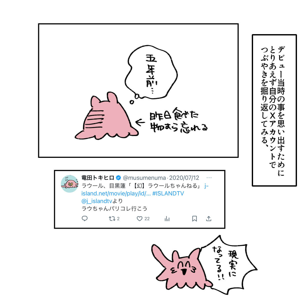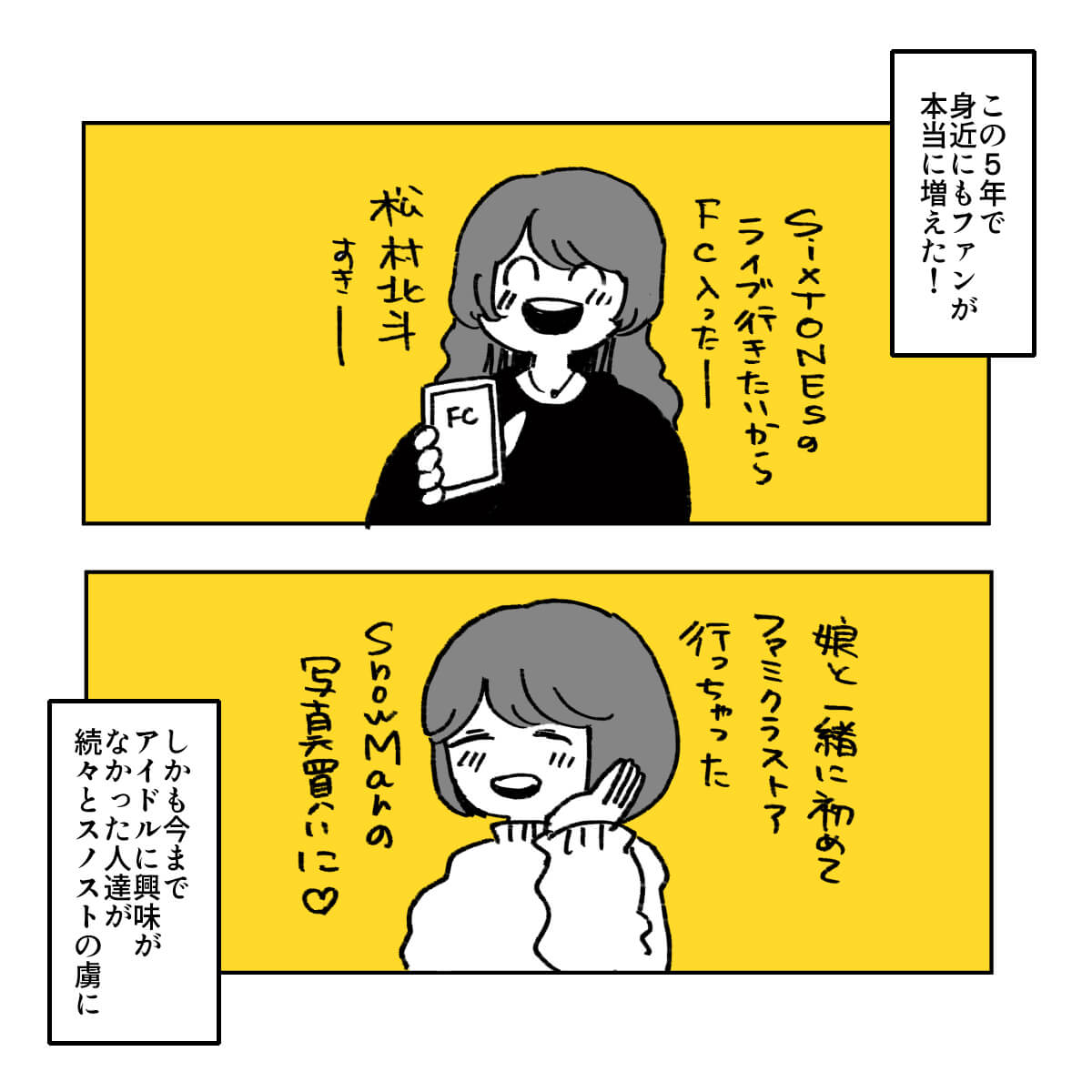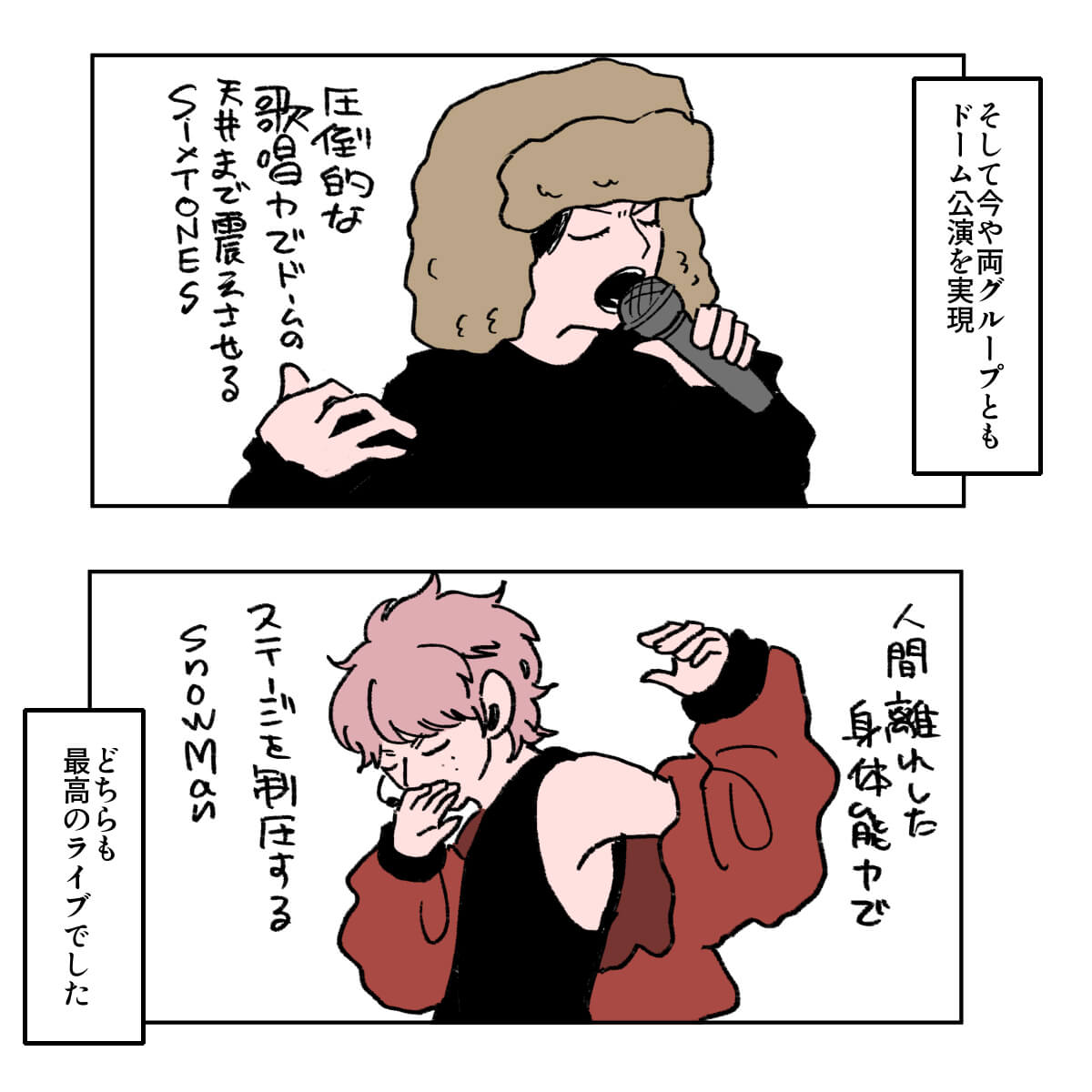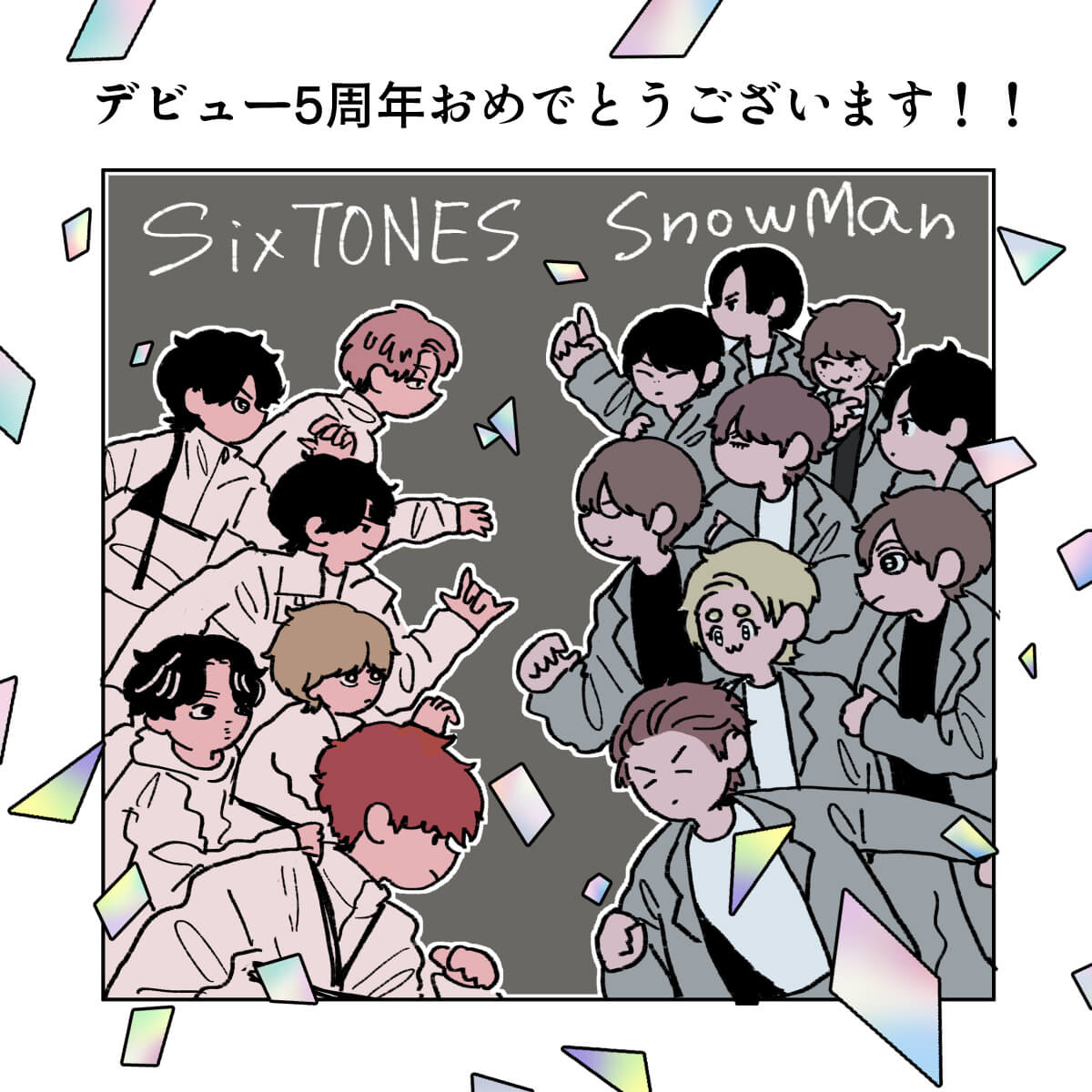 サイゾーウーマン男性アイドルSTARTO(旧ジャニーズ)SixTONESスノ・佐久間がデビュー当時に語っていたこと 男性アイドル [ドルオタ漫画家・竜田トキヒロの“推し事”見聞録]vol.90 SixTONES&Snow Man、祝デビュー5周年! 佐久間大介が語っていた「乗り越えたいこと」とは? 2025/01/22 21:30 竜田トキヒロ(マンガ家) Snow ManSixTONES竜田トキヒロの“推し事”見聞録 ――Twitterで日々、ボーイズグループのメンバーにまつわるイラストを投稿中のドルオタ漫画家・竜田トキヒロが、現場レポートからドラマや映画、番組レビューまで、“推し事”の様子をお届け! 今回は、2020年1月22日に同時CDデビューを果たし、5周年記念イヤーに突入したSixTONESとSnow Manのこれまでを振り返ります。 目次 ・SixTONES&Snow Man、デビュー5周年記念イヤー突入 ・ラウール、5年前のつぶやきが現実に!? ・ジェシー&岩本照は「シンメのよう」? ・佐久間大介がデビュー前に語っていた「乗り越えたいこと」 SixTONES&Snow Man、CDデビュー5周年記念イヤー突入 2015年5月1日に結成されたSixTONESは、ジェシー、京本大我、松村北斗、高地優吾、森本慎太郎、田中樹からなる6人組グループ。 一方、岩本照、深澤辰哉、渡辺翔太、阿部亮平、宮舘涼太、佐久間大介の6人で12年5月3日に結成されたSnow Manは、19年1月に少年忍者のラウール、関西ジュニア(当時はジャニーズJr.)の向井康二、宇宙Six(20ねん10月に解散)の目黒蓮の3人が加わり9人体制へ。 ジュニア時代から切磋琢磨し合いながら活動していた2組は、19年8月に東京ドームで開催された合同コンサート『ジャニーズJr.8.8祭り〜東京ドームから始まる〜』にて、20年1月22日に事務所初の“同時CDデビュー”することを発表。 そして、「ライバルがいるって最高だ」というキャッチコピーのもと、「SixTONES vs Snow Man」名義でリリースしたデビューシングル「Imitation Rain/D.D.」は、初日77.3万枚を売り上げ、「オリコンデイリーランキング」で初登場1位を記録。リリース3日目には、109.4万枚を売り上げ、ミリオンセラーを達成しました。 以降、グループのみならず、それぞれ個人としても目覚ましい活躍を見せている2組。この記事では、竜田トキヒロが2組のデビュー当時をイラストで振り返っていきます。 Snow Man・ラウール、5年前のつぶやきが現実に!? SixTONES・ジェシー&Snow Man・岩本照は「シンメのよう」? Snow Man・佐久間大介がデビュー前に語っていた「乗り越えたいこと」とは? ★これまでの連載記事はこちらから Snow Manに「エグい」と目ん玉飛び出た!? 年越しYouTube生配信レビュー――Twitterで日々、ボーイズグループのメンバーにまつわるイラストを投稿中のドルオタ漫画家・竜田トキヒロが、現場レポートからドラマや映画、番組レビューまで、“推し事”の...サイゾーウーマン2025.01.08 田中樹の“ファンサ”に沼る!? SixTONESドーム公演『VVS』レポート――Twitterで日々、STARTO ENTERTAINMENT(旧ジャニーズ事務所)のタレントをはじめとしたイラストを投稿中のドルオタ漫画家・竜田トキヒロが、現場レポー...サイゾーウーマン2024.04.24 【ジャニオタマンガ】Snow Man&SixTONES『少クラ』卒業回をプレイバック!――Twitterで日々、ジャニーズタレントにまつわるイラストを投稿中のジャニオタ漫画家・竜田トキヒロが、現場レポートからドラマや映画、番組レビューまで、“推し事”の様子を...サイゾーウーマン2023.04.12 竜田トキヒロ(マンガ家) 漫画家、イラストレーター。育休中に執筆したエッセイ漫画でKADOKAWAコミックエッセイ大賞受賞。Ameba、ライブドア公式ブロガーを経たのち現在はインフルエンサーとしてエンタメ、オタクに特化した漫画やイラストや体験ルポ等幅広く執筆。著書『コミュ障母さんとごきげん娘』(KADOKAWA) X:@musumenuma 最終更新:2025/01/22 21:41 5周年おめでとう! 関連記事 田中樹の“ファンサ”に沼る!? SixTONESドーム公演『VVS』レポート【ジャニオタマンガ】SixTONES・ジェシーの悪役が怖すぎる!? 映画『リボルバー・リリー』レビュー【ジャニオタマンガ】SixTONESが初ドームでマッドマックス化? 『慣声の法則』参戦レポ【ジャニオタマンガ】Snow Man&SixTONES『少クラ』卒業回をプレイバック!Snow Manに「エグい」と目ん玉飛び出た!? 年越しYouTube生配信レビュー 次の記事 【伊勢丹新宿店】サブレ自主回収 >
