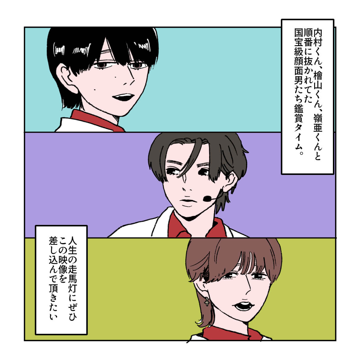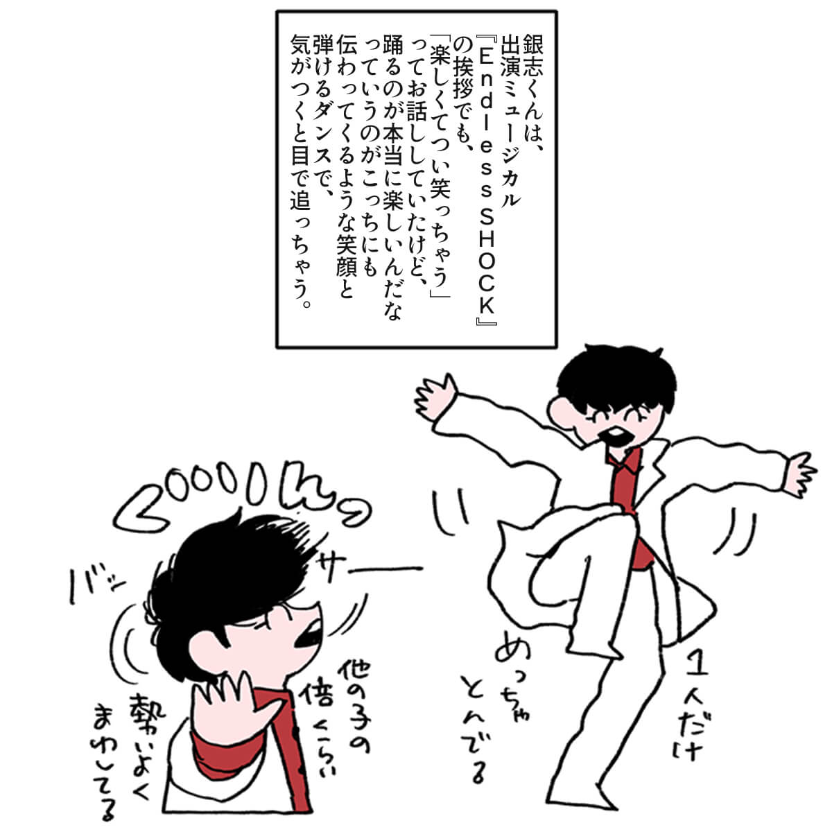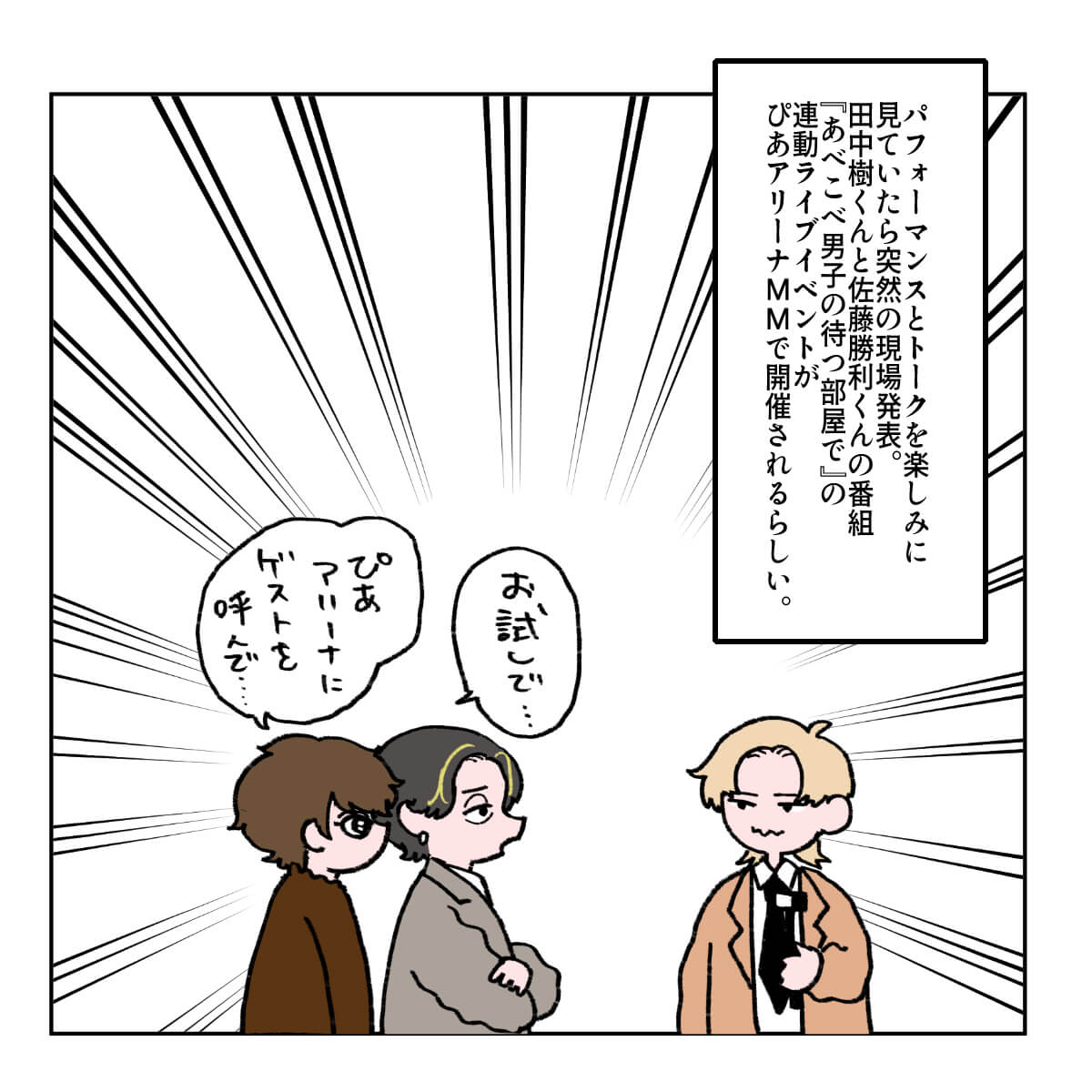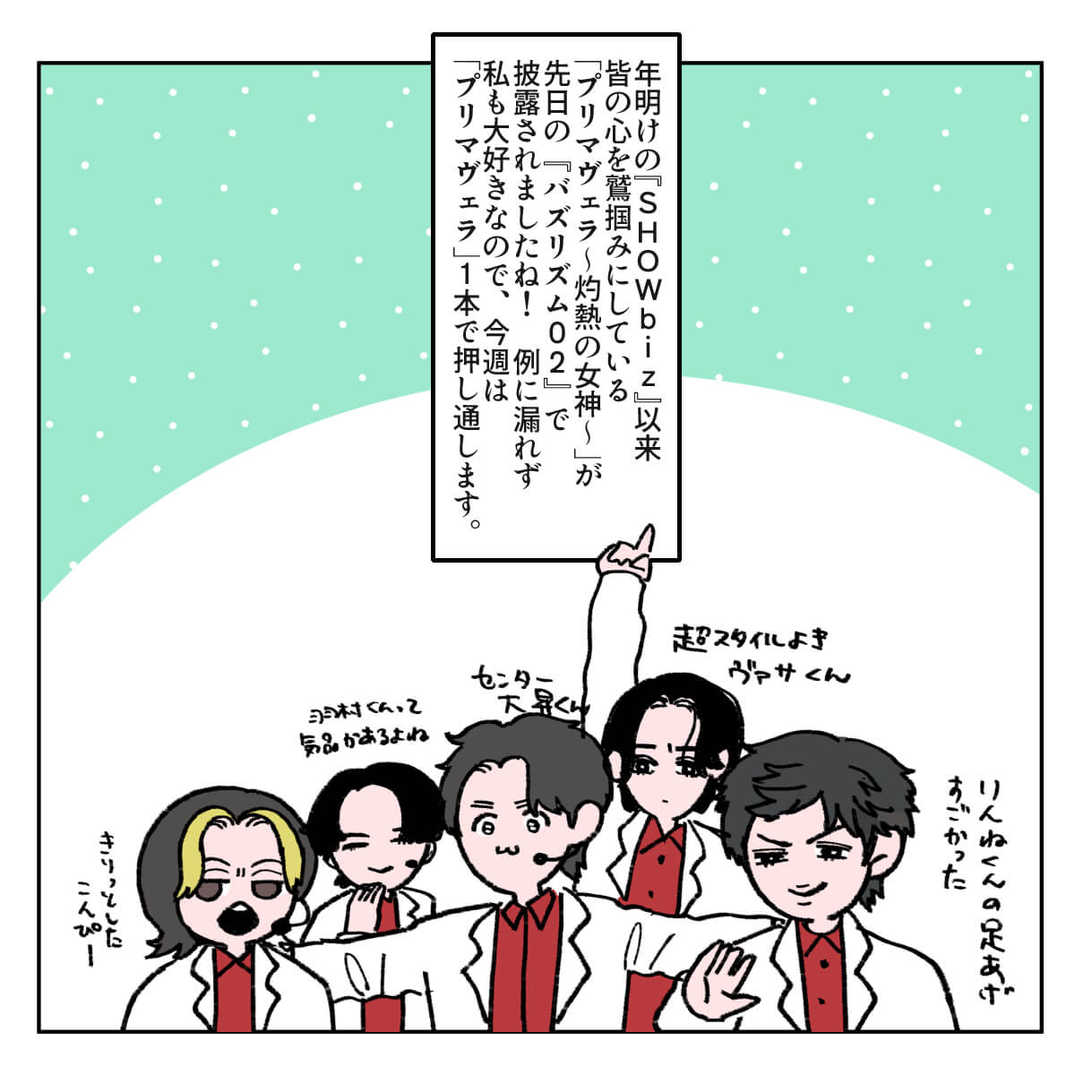 サイゾーウーマン男性アイドルSTARTO(旧ジャニーズ)ジュニアジュニア「プリマヴェラ」に見る事務所イズム 男性アイドル [ドルオタ漫画家・竜田トキヒロの“推し事”見聞録]vol.92 ジュニアが『バズリズム02』で披露! 少年隊の名曲「プリマヴェラ」に見る“事務所イズム” 2025/02/05 21:00 竜田トキヒロ(マンガ家) 竜田トキヒロの“推し事”見聞録ジュニア ――Twitterで日々、ボーイズグループのメンバーにまつわるイラストを投稿中のドルオタ漫画家・竜田トキヒロが、現場レポートからドラマや映画、番組レビューまで、“推し事”の様子をお届け! 今回は、STARTO ENTERTAINMENT(旧ジャニーズ事務所)のジュニアが数名出演した、1月31日深夜放送の音楽番組『バズリズム02』(日本テレビ系)をレビューします。 目次 ・ジュニア19名の『バズリズム02』出演にファン混乱 ・少年忍者・檜山光成、バズリズムとの独特なトーク ・ジュニアが踊る、「プリマヴェラ」の魅力 ・「カメラ抜かれ顔」1位のジュニアとは? ジュニア19名の『バズリズム02』出演にファン混乱のワケ 1月24日深夜放送回終了後、『バズリズム02』公式サイトの「ネクストアーティスト」欄で「ジュニア」の出演が予告され、ジュニア公式サイトでも告知されていた一方、グループ名や個人名の記載はなく、ネット上では「いったい誰が出るの?」などと混乱するファンが多かった今回。 放送を翌日に控えた30日には、番組公式インスタグラムが、「#ジュニア の皆様が19名で少年隊の名曲 #プリマヴェラ ~灼熱の女神~ をパフォーマンス」などとつづりながら、出演者の集合写真をアップ。 また番組公式YouTubeチャンネルにも予告動画が公開され、美 少年・岩崎大昇(※崎はたつさき)、7 MEN 侍から中村嶺亜、菅田琳寧、今野大輝の3名、少年忍者から田村海琉、内村颯太、檜山光成、久保廉、元木湧、安嶋秀生、ヴァサイェガ渉、川崎星輝(※崎はたつさき)、長瀬結星、豊田陸人の10名、Go!Go!kidsから松浦銀志、羽村仁成の2名、そしてグループ無所属の阿達慶、千井野空翔 、竹村実悟ら19名の出演が明らかとなりました。 グループの垣根を越えた顔ぶれだけに、ファンからは驚きの声が上がった中、31日の放送では、彼らの先輩であるtimelesz・佐藤勝利、SixTONES・田中樹のレギュラートークバラエティ『あべこべ男子の待つ部屋で』(同)と連動したライブイベント『駆アガル!〜あべこべ男子に憧れて〜』(3月22~23日、神奈川・ぴあアリーナMM)の開催も発表。 このように、驚きの展開が続いたジュニアの『バズリズム02』出演を、竜田トキヒロがイラストで振り返っていきます。 少年忍者・檜山光成、バズリズムとの独特なトークが面白すぎる ジュニアが踊る、少年隊の名曲「プリマヴェラ~灼熱の女神~」の魅力 『バズリズム02』、「カメラ抜かれ顔」1位のジュニアとは? ★これまでの連載記事はこちらから 『SHOWbiz 2025』少年忍者・内村颯太に「ヒェェ」! ジュニア合同現場の魅力とは?――Twitterで日々、ボーイズグループのメンバーにまつわるイラストを投稿中のドルオタ漫画家・竜田トキヒロが、現場レポートからドラマや映画、番組レビューまで、“推し事”の...サイゾーウーマン2025.01.15 『Endless SHOCK』堂本光一と上田竜也の姿に号泣! 大千秋楽ライブビューイング鑑賞レポ――Twitterで日々、ボーイズグループのメンバーにまつわるイラストを投稿中のドルオタ漫画家・竜田トキヒロが、現場レポートからドラマや映画、番組レビューまで、“推し事”の...サイゾーウーマン2024.12.04 7 MEN 侍・佐々木大光が「プロ」で感動! ダンスバトル番組『R4SD』レビュー――Twitterで日々、ボーイズグループのメンバーにまつわるイラストを投稿中のドルオタ漫画家・竜田トキヒロが、現場レポートからドラマや映画、番組レビューまで、“推し事”の...サイゾーウーマン2024.12.18 竜田トキヒロ(マンガ家) 漫画家、イラストレーター。育休中に執筆したエッセイ漫画でKADOKAWAコミックエッセイ大賞受賞。Ameba、ライブドア公式ブロガーを経たのち現在はインフルエンサーとしてエンタメ、オタクに特化した漫画やイラストや体験ルポ等幅広く執筆。著書『コミュ障母さんとごきげん娘』(KADOKAWA) X:@musumenuma 最終更新:2025/02/05 21:00 地上波で「プリマヴェラ」が見れたのはうれしかったよ 関連記事 『SHOWbiz 2025』少年忍者・内村颯太に「ヒェェ」! ジュニア合同現場の魅力とは?7 MEN 侍・佐々木大光が「プロ」で感動! ダンスバトル番組『R4SD』レビュー『Endless SHOCK』堂本光一と上田竜也の姿に号泣! 大千秋楽ライブビューイング鑑賞レポSixTONESの“本気度”と新たな可能性が感じられた、ドーム公演『YOUNG OLD』レポートSixTONES&Snow Man、祝デビュー5周年! 佐久間大介が語っていた「乗り越えたいこと」とは? 次の記事 ジュニア、評価基準明示で面白さなくなる? >