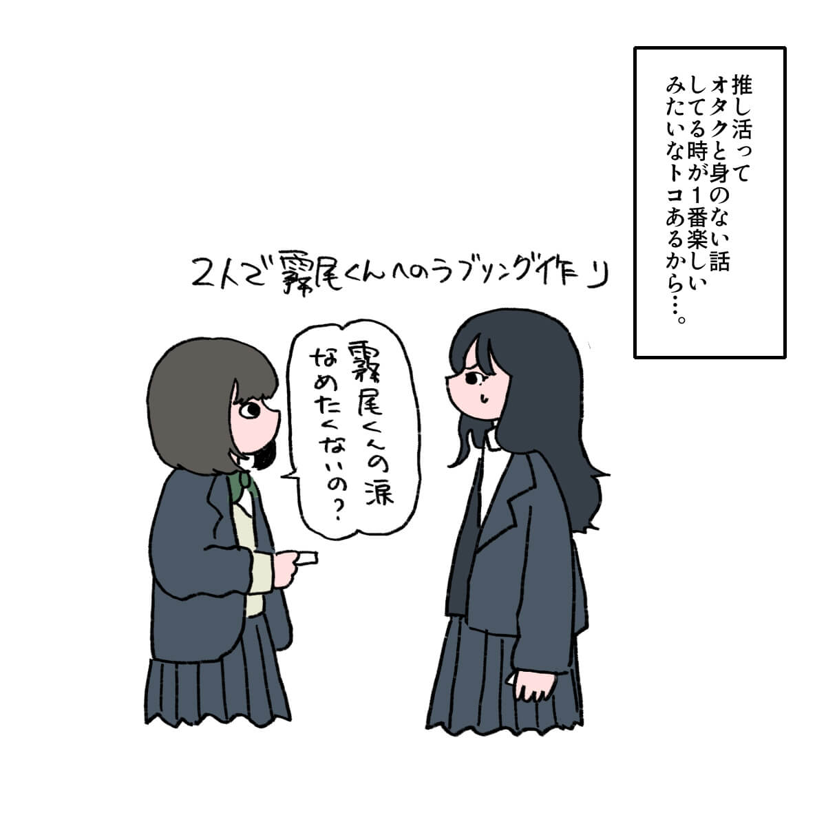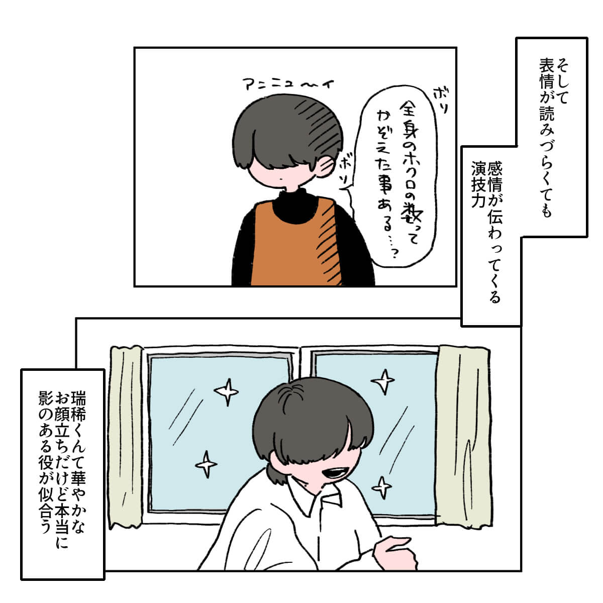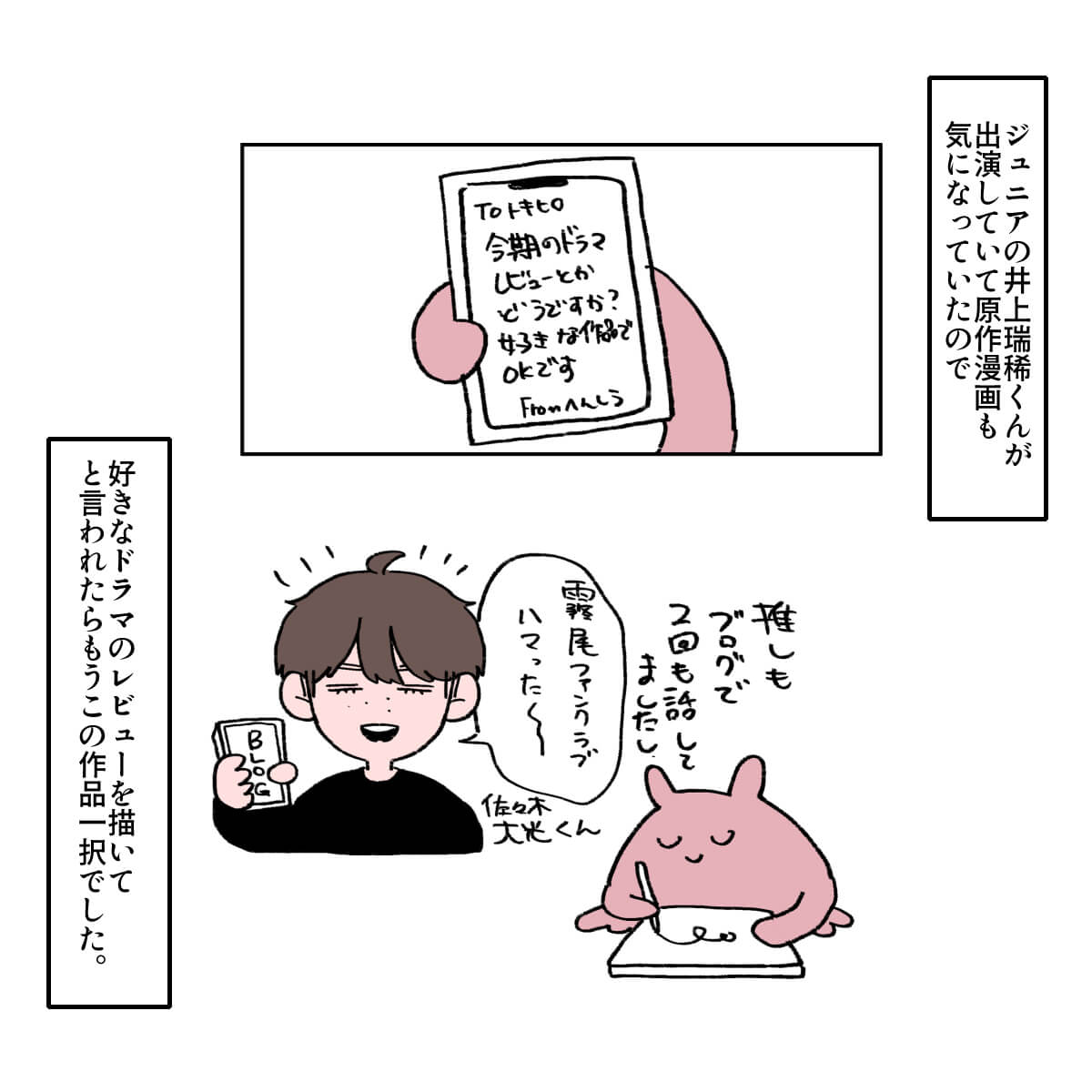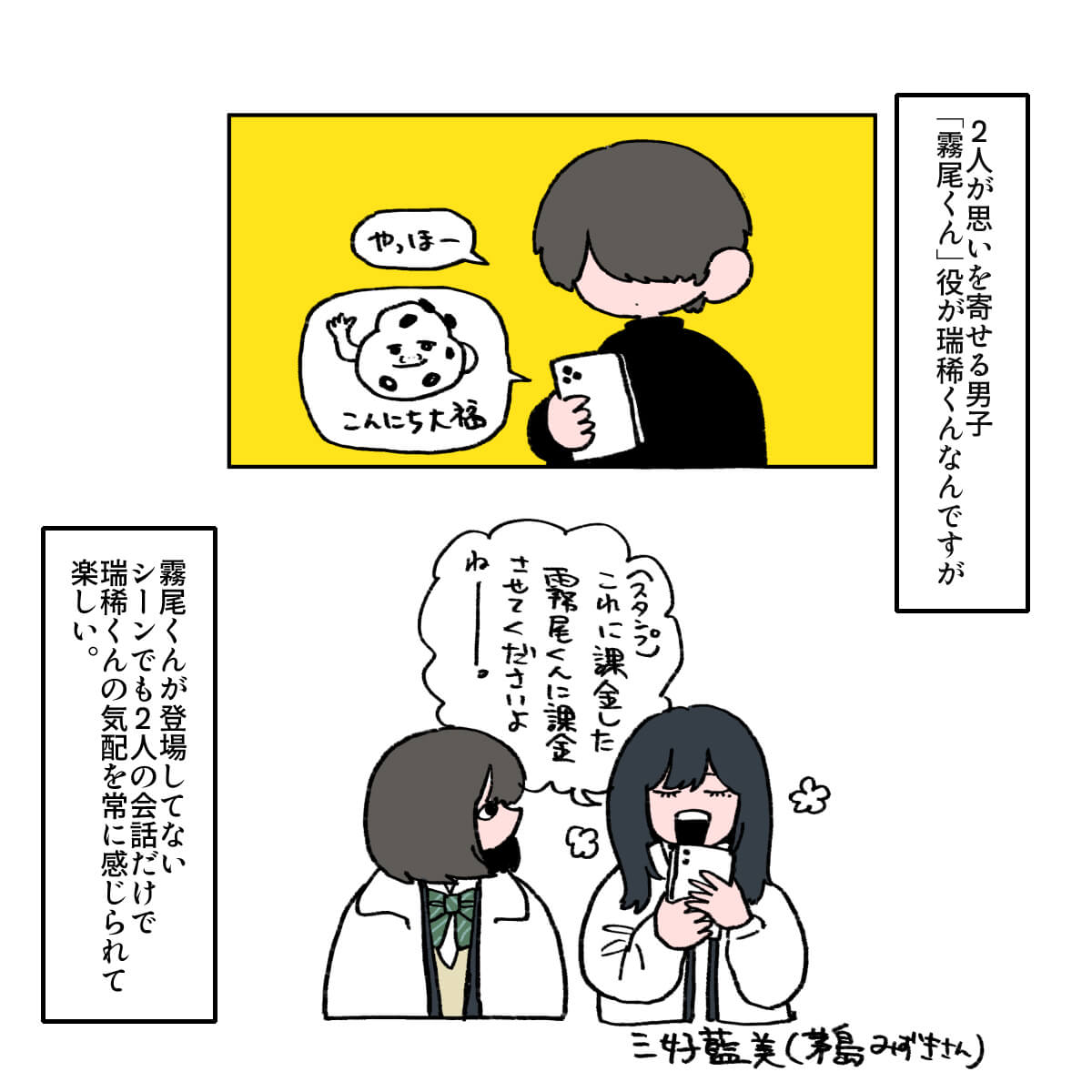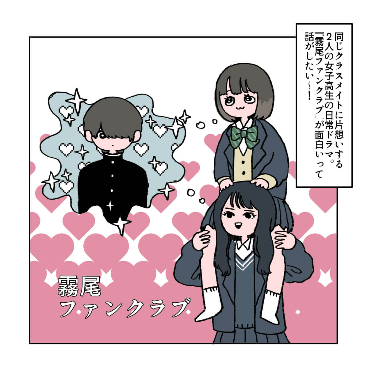 サイゾーウーマン男性アイドルSTARTO(旧ジャニーズ)ジュニアKEY TO LIT井上瑞稀ドルオタが見る『霧尾ファンクラブ』の魅力 男性アイドル [ドルオタ漫画家・竜田トキヒロの“推し事”見聞録]vol.102 井上瑞稀は「影のある役」が似合う! ドルオタが見る、ドラマ『霧尾ファンクラブ』の魅力 2025/04/23 21:30 竜田トキヒロ(マンガ家) 竜田トキヒロの“推し事”見聞録ジュニア井上瑞稀 【サイゾーオンラインより】 ――Twitterで日々、ボーイズグループのメンバーにまつわるイラストを投稿中のドルオタ漫画家・竜田トキヒロが、現場レポートからドラマや映画、番組レビューまで、“推し事”の様子をお届け! 今回は、井上瑞稀(KEY TO LIT)が出演中のドラマ『霧尾ファンクラブ』(日本テレビ系)をレビューします。 目次 ・ドラマ『霧尾ファンクラブ』の概要とあらすじ ・『霧尾ファンクラブ』、女子高生2人にオタクが共感 ・井上瑞稀は「影のある役」が似合いすぎ! ドラマ『霧尾ファンクラブ』の概要とあらすじ 『霧尾ファンクラブ』は、地球のお魚ぽんちゃん氏が、実業之日本社のウェブコミックサイト「COMICリュエル」にて2022年6月から24年8月まで連載していた同名漫画が原作。 24年から2年連続で宝島社『このマンガがすごい!』オンナ編のトップ10にランクイン(24年:第6位、25年:第10位)した注目作の実写版で、クラスメートの霧尾くんに好意を寄せる女子高生2人の “一方通行”な恋心を描いた甘酸っぱい青春ラブコメディです。 主人公・三好藍美を茅島みずき、その親友で恋のライバルでもある染谷波を莉子が演じているほか、2人の想い人・霧尾賢役として井上が出演中です。 なお、霧尾は原作同様、劇中でも全顔が見えない演出となっているものの、ネット上のファンからは「顔や表情が見えない分、瑞稀くんのセリフの抑揚や声がよく伝わってきてよかった」「顔の一部しか見えなくても霧尾くんの感情が見えるのがすごい」などと絶賛の声が寄せられています。 この記事では、そんな同ドラマの魅力を、竜田トキヒロがイラストで紹介していきます! ドラマ『霧尾ファンクラブ』、女子高生2人にオタクが共感のワケ 『霧尾ファンクラブ』、井上瑞稀は「影のある役」が似合いすぎ! ★これまでの連載記事はこちらから 映画『山田くんとLv999の恋をする』、作間龍斗を撮る監督の“気合”と「解釈一致」なキャスティングの妙【サイゾーオンラインより】 ――Twitterで日々、ボーイズグループのメンバーにまつわるイラストを投稿中のドルオタ漫画家・竜田トキヒロが、現場レポートからドラマや映画、...サイゾーウーマン2025.04.16 「もはや職人」? 『Golden SixTONES』でメンバー6人が見せた、“お笑い瞬発力”【サイゾーオンラインより】 ――Twitterで日々、ボーイズグループのメンバーにまつわるイラストを投稿中のドルオタ漫画家・竜田トキヒロが、現場レポートからドラマや映画、...サイゾーウーマン2025.04.09 Snow ManがLDH本社へ――BLACKPINK・LISAも登場の『それスノ』ダンス企画がアツい!【サイゾーオンラインより】 ――Twitterで日々、ボーイズグループのメンバーにまつわるイラストを投稿中のドルオタ漫画家・竜田トキヒロが、現場レポートからドラマや映画、...サイゾーウーマン2025.04.02 竜田トキヒロ(マンガ家) 漫画家、イラストレーター。育休中に執筆したエッセイ漫画でKADOKAWAコミックエッセイ大賞受賞。Ameba、ライブドア公式ブロガーを経たのち現在はインフルエンサーとしてエンタメ、オタクに特化した漫画やイラストや体験ルポ等幅広く執筆。著書『コミュ障母さんとごきげん娘』(KADOKAWA) X:@musumenuma 最終更新:2025/04/23 21:30 関連記事 映画『山田くんとLv999の恋をする』、作間龍斗を撮る監督の“気合”と「解釈一致」なキャスティングの妙「もはや職人」? 『Golden SixTONES』でメンバー6人が見せた、“お笑い瞬発力”Snow ManがLDH本社へ――BLACKPINK・LISAも登場の『それスノ』ダンス企画がアツい!SixTONES・ジェシーの“スパダリ”っぷりに胸キュン! 映画『お嬢と番犬くん』レビューKEY TO LIT・佐々木大光の役とジュニア事情が重なり大号泣! 舞台『ダッドシューズ2025』観劇レポ 次の記事 BE:FIRST・RYOKI、“婚約破棄”報道の衝撃度 >