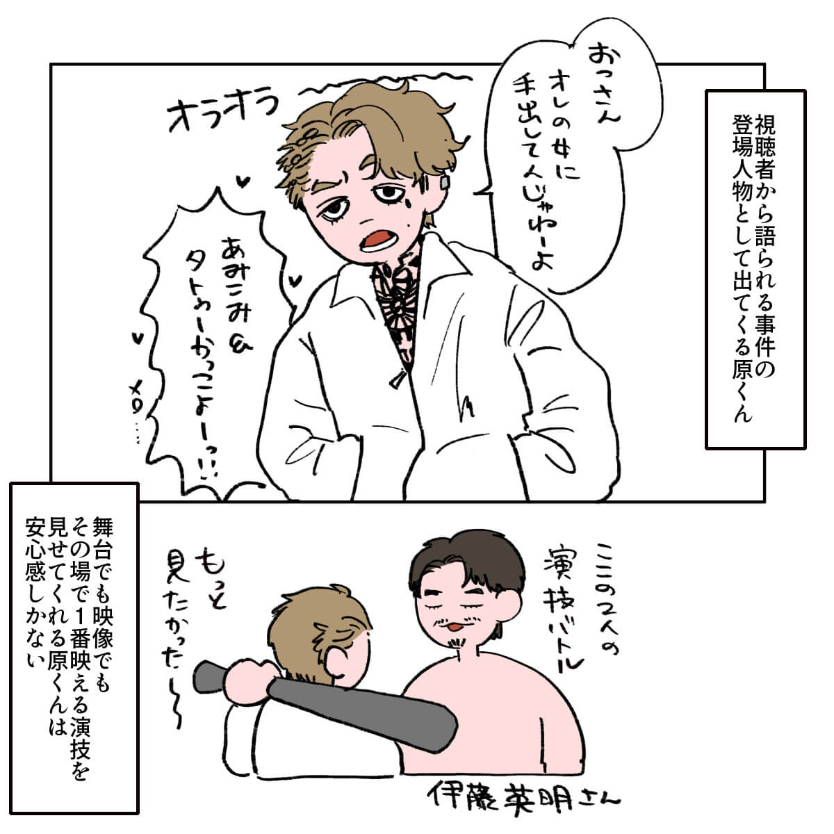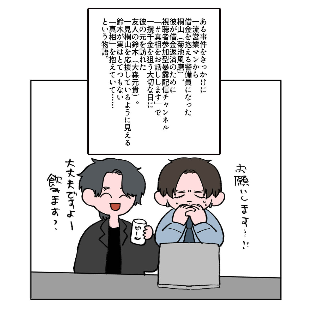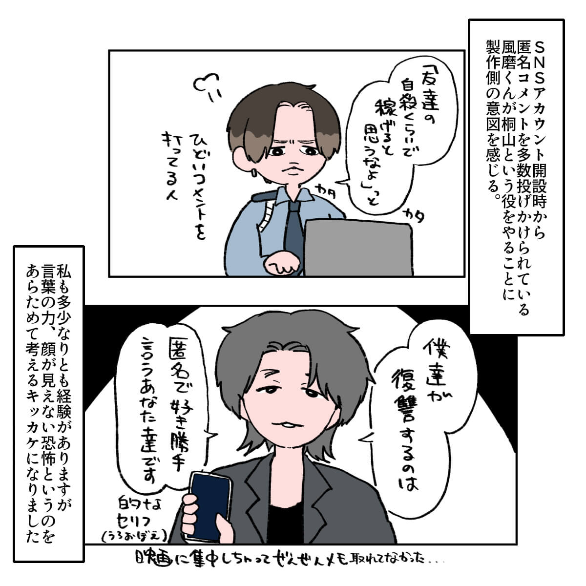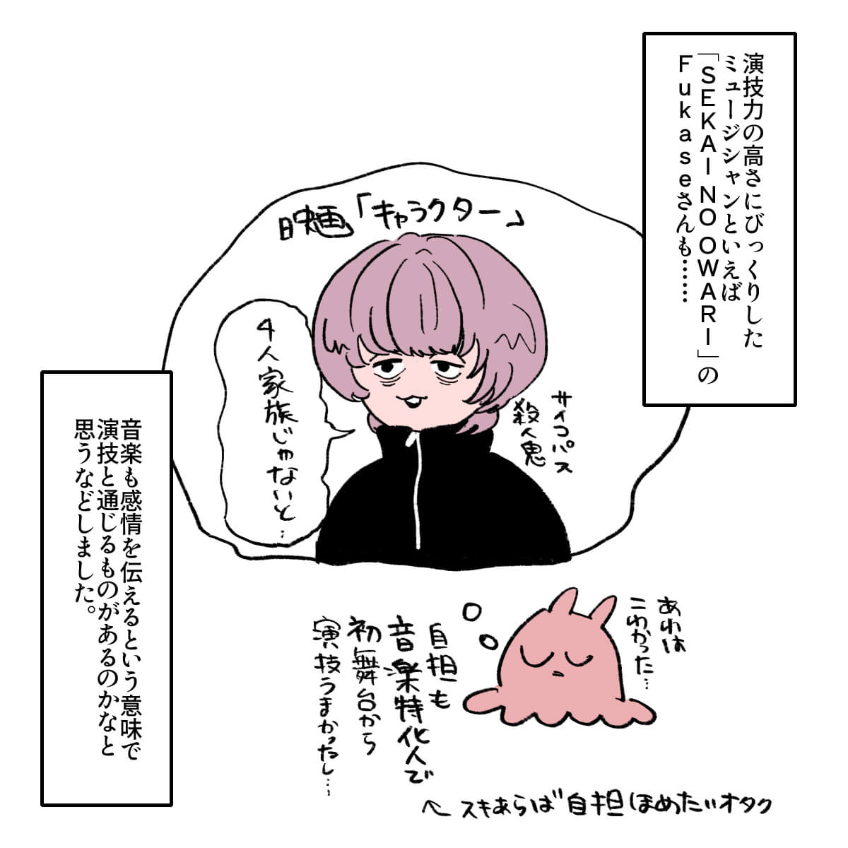 サイゾーウーマン男性アイドルSTARTO(旧ジャニーズ)timelesz菊池風磨『#真相をお話しします』風磨を起用した“意図” 男性アイドル [ドルオタ漫画家・竜田トキヒロの“推し事”見聞録]vol.103 菊池風磨を起用した製作側の“意図”とは? 大森元貴は演技がうますぎ! 映画『#真相をお話しします』レビュー 2025/04/30 22:00 竜田トキヒロ(マンガ家) 菊池風磨竜田トキヒロの“推し事”見聞録timelesz 【サイゾーオンラインより】 ――Twitterで日々、ボーイズグループのメンバーにまつわるイラストを投稿中のドルオタ漫画家・竜田トキヒロが、現場レポートからドラマや映画、番組レビューまで、“推し事”の様子をお届け! 今回は、Mrs. GREEN APPLE・大森元貴とtimelesz・菊池風磨がダブル主演を務めている映画『#真相をお話しします』をレビューします。 目次 ・映画『#真相をお話しします』の概要とあらすじ ・『ドッキリGP』の菊池風磨がチラつく? ・Mrs. GREEN APPLE・大森元貴、演技がうますぎ! ・菊池風磨を起用した製作側の“意図” 映画『#真相をお話しします』の概要とあらすじ 『#真相をお話しします』は、小説家・結城真一郎氏の同題ミステリー作品(新潮社)が原作。生配信暴露チャンネルで次々と暴かれていくさまざまな事件の「#真相」を描いた物語で、菊池は警備員の桐山、大森はその友人で謎めいた男・鈴木を演じています。 そのほか、中条あやみ、岡山天音、福本莉子、伊藤健太郎、柳俊太郎、綱啓永、田中美久、齊藤京子、timelesz・原嘉孝、桜井ユキ、山中崇、秋元才加、大水洋介、伊藤英明といった個性豊かな面々が出演。 さらに、まさかの“あの人”もサプライズで登場しており、主演の2人も試写まで知らされていなかったとか。 いったい誰が出演していたのか、そして映画の見どころについて、竜田トキヒロがイラストで紹介していきます! 映画『#真相をお話しします』、『ドッキリGP』の菊池風磨がチラつく 「音楽と演技は通じる?」 Mrs. GREEN APPLE・大森元貴の演技がうますぎ! 映画を見てわかった、菊池風磨を起用した製作側の“意図” ★これまでの連載記事はこちらから 映画『山田くんとLv999の恋をする』、作間龍斗を撮る監督の“気合”と「解釈一致」なキャスティングの妙【サイゾーオンラインより】 ――Twitterで日々、ボーイズグループのメンバーにまつわるイラストを投稿中のドルオタ漫画家・竜田トキヒロが、現場レポートからドラマや映画、...サイゾーウーマン2025.04.16 SixTONES・ジェシーの“スパダリ”っぷりに胸キュン! 映画『お嬢と番犬くん』レビュー【サイゾーオンラインより】 ――Twitterで日々、ボーイズグループのメンバーにまつわるイラストを投稿中のドルオタ漫画家・竜田トキヒロが、現場レポートからドラマや映画、...サイゾーウーマン2025.03.26 『劇場版 トリリオンゲーム』目黒蓮&佐野勇斗を見て、『プリキュア』鑑賞の女児のようになったワケ【サイゾーオンラインより】 ――Twitterで日々、ボーイズグループのメンバーにまつわるイラストを投稿中のドルオタ漫画家・竜田トキヒロが、現場レポートからドラマや映画、...サイゾーウーマン2025.02.26 竜田トキヒロ(マンガ家) 漫画家、イラストレーター。育休中に執筆したエッセイ漫画でKADOKAWAコミックエッセイ大賞受賞。Ameba、ライブドア公式ブロガーを経たのち現在はインフルエンサーとしてエンタメ、オタクに特化した漫画やイラストや体験ルポ等幅広く執筆。著書『コミュ障母さんとごきげん娘』(KADOKAWA) X:@musumenuma 最終更新:2025/05/02 09:59 ニノの出演シーンが気になる! 関連記事 映画『山田くんとLv999の恋をする』、作間龍斗を撮る監督の“気合”と「解釈一致」なキャスティングの妙SixTONES・ジェシーの“スパダリ”っぷりに胸キュン! 映画『お嬢と番犬くん』レビュー『劇場版 トリリオンゲーム』目黒蓮&佐野勇斗を見て、『プリキュア』鑑賞の女児のようになったワケFANTASTICS・八木勇征のキャスティングが天才! 映画『矢野くんの普通の日々』レビューキンプリ・永瀬廉を見て思わず“モンペ”化! Netflix映画『よめぼく』レビュー 次の記事 BE:FIRST、新曲が前作より1.3万ダウン >
