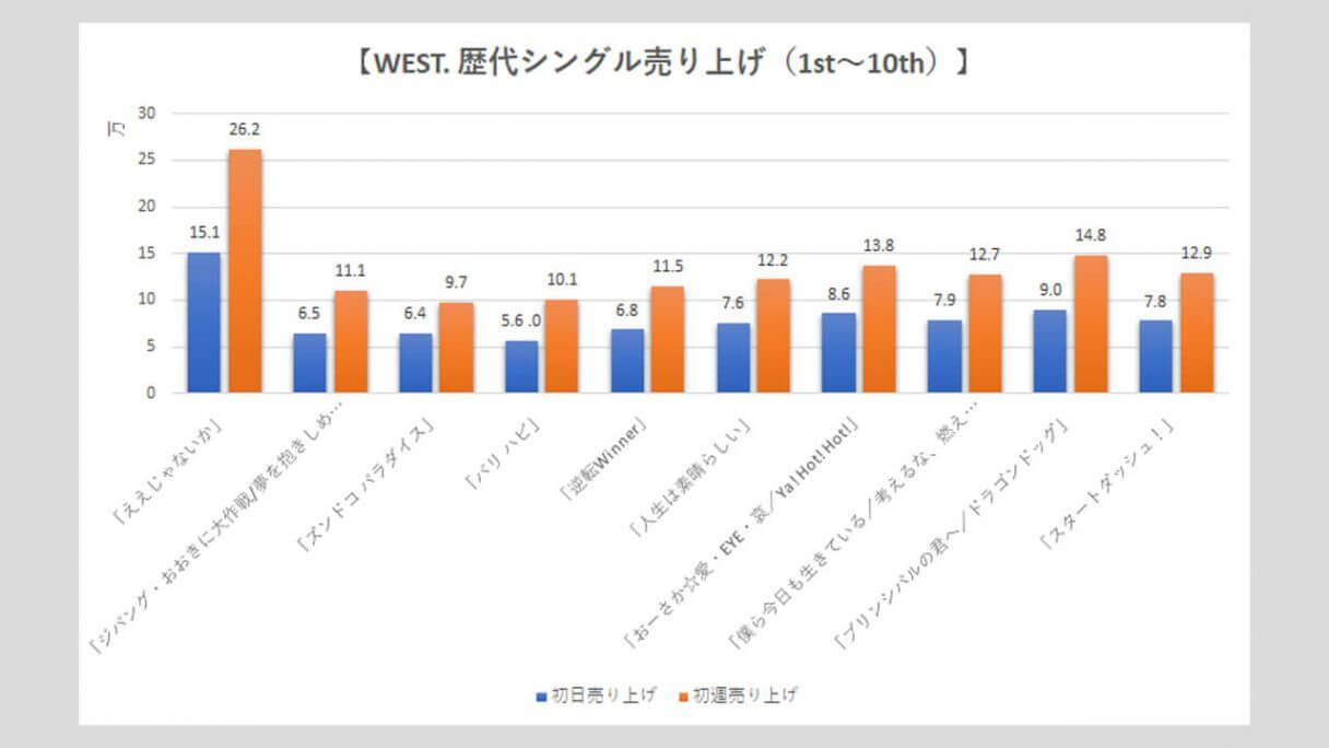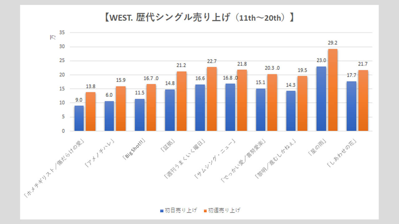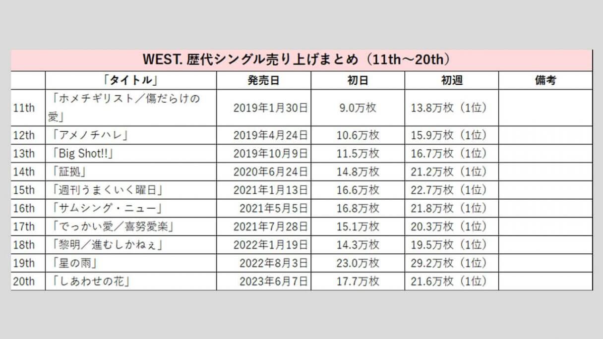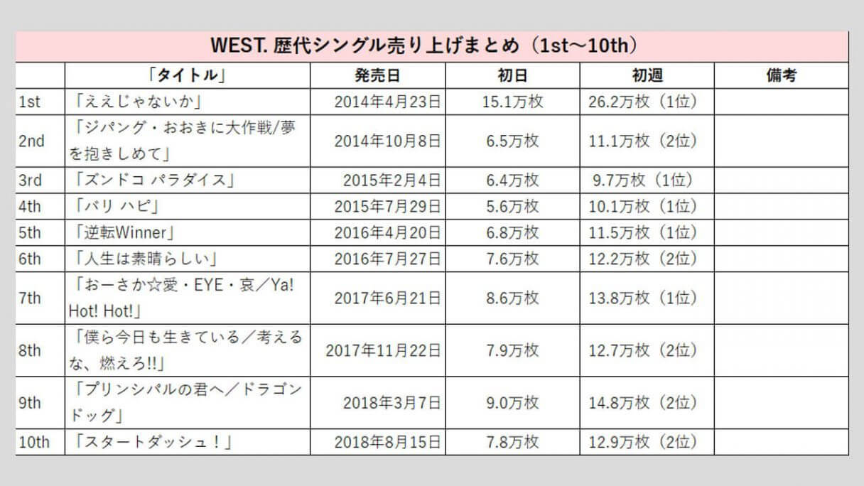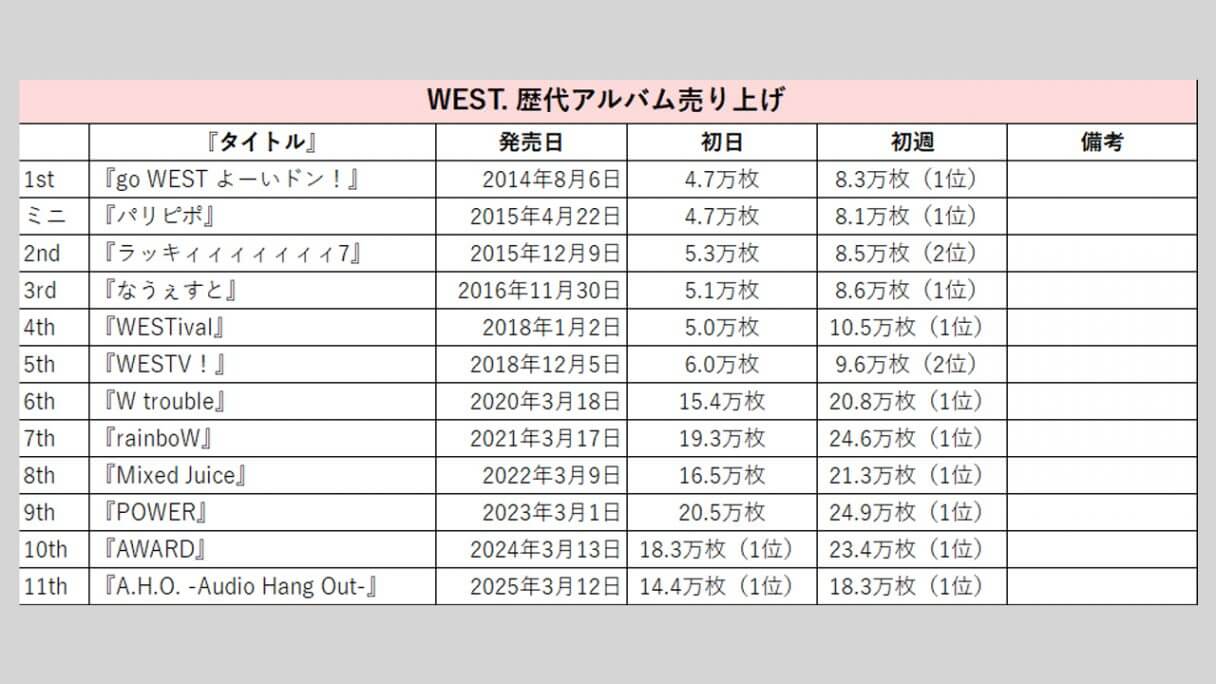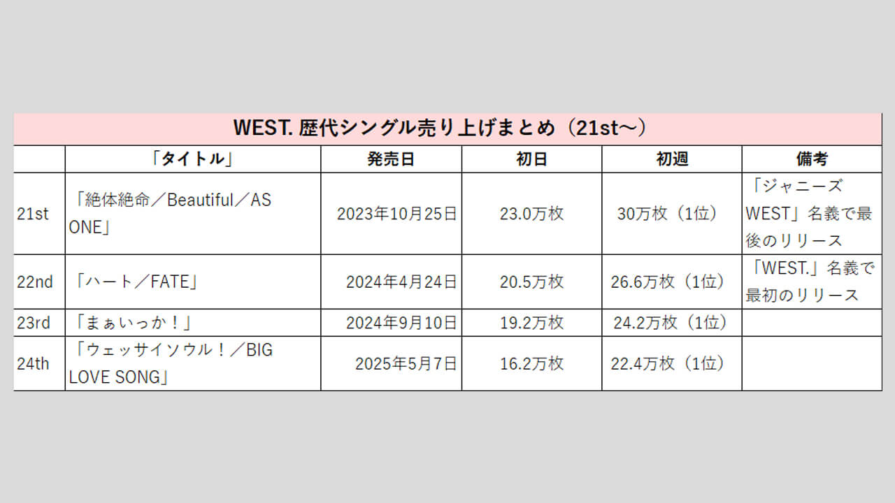サイゾーウーマン男性アイドルSTARTO(旧ジャニーズ)WEST.【WEST.】歴代売上データ一覧 男性アイドル [STARTOグループ別売り上げデータ] 【WEST.】歴代シングル・アルバム売り上げ枚数データ一覧|2025年5月15日最新情報 2025/05/15 08:00 サイゾーウーマン編集部 WEST.STARTO 【サイゾーオンラインより】 デビュー10周年を迎えたWEST.(写真:サイゾーウーマン) ――オリコンリサーチ株式会社が毎週月曜からの7日間を集計期間として、CD・DVD・書籍等の売り上げを発表する「オリコンランキング」。販売データとしての側面はもちろん、結果からはその時々の流行がわかるほか、アーティストにとっては人気の“指標”にもなるため、業界関係者のみならず、ファンたちも日々公開される売り上げランキングの動向を注視していることだろう。サイゾーウーマンでは、STARTO ENTERTAINMENT(旧ジャニーズ事務所)所属アーティストのシングル、アルバムの打ち上げ枚数の推移を、各アーティストごとに表やグラフで一挙に紹介! 目次 ・歴代シングル売り上げまとめ【2025年5月15日更新】 ・歴代アルバム売り上げまとめ【2025年3月20日更新】 WEST. 歴代シングル売り上げまとめ【2025年5月15日更新】 ※数字はすべてオリコン調べ ※画像クリックで拡大表示(C)サイゾーウーマン ※画像クリックで拡大表示(C)サイゾーウーマン ※画像クリックで拡大表示(C)サイゾーウーマン ※画像クリックで拡大表示(C)サイゾーウーマン ※画像クリックで拡大表示(C)サイゾーウーマン ※画像クリックで拡大表示(C)サイゾーウーマン 2014年4月23日に「ええじゃないか」でデビューした彼ら。初週売り上げ26.2万枚という記録をなかなか更新できずにいた中、22年8月3日発売の19枚目シングル「星の雨」で、初日23万331枚という好スタートを切り、初週売り上げは29万2,110をマーク。 20枚目の「しあわせの花」(23年6月7日発売)で再び数字を落としたが、21枚目のトリプルA面シングル「絶体絶命/Beautiful/AS ONE」(同年10月23日発売)で、初日は22万9,935枚とわずかに及ばずも、初週29万9,584枚を売り上げた。 なお、彼らは旧ジャニーズ事務所創業者であるジャニー喜多川氏の性加害問題の影響で、23年10月18日にグループ名を「ジャニーズWEST」から「WEST.」に改名。ジャニーズWESTとして最後のシングルで自己最高記録を更新した。 その後、24年4月24日にリリースした「ハート/FATE」は、初日20万4,514枚、初週26万5,995枚で「WEST.」名義初、そしてデビュー10周年のアニバーサリーイヤーを飾ったが、売り上げは前作よりダウン。 以降も売り上げは右肩下がりで、今年5月7日発売の最新作「ウェッサイソウル!/BIG LOVE SONG」は初日16.2万枚、初週は22.4万枚という結果に。3作連続で売り上げが低迷しているが、次のシングルで初週20万台をキープできるだろうか……。 WEST. 歴代アルバム売り上げまとめ【2025年3月20日更新】 ※画像クリックで拡大表示(C)サイゾーウーマン ※画像クリックで拡大表示(C)サイゾーウーマン 14年8月6日に発売したファーストアルバム『go WEST よーいドン!』以降、初週売り上げは8~10万台前半となっていたが、6枚目の『W trouble』(20年3月18日発売)からいきなり20万台へ大きくジャンプアップ。 7人グループでCDデビュー7年目、7枚目のフルアルバムという「7」づくしの『rainboW』(21年3月17日発売)では、初週24万5,908枚を売り上げ、9枚目の『POWER』(23年3月1日発売)は、それを約3,000枚上回り、初週24万8,942枚に到達。 そのままの勢いで、「WEST.」として初のアルバムで、グループにとって初めてのベスト盤となった『AWARD』(24年3月13日発売)も好セールスを記録するかと思われたが、初日は18万2,933枚と前作から約2万枚ダウン。初週では23万4,128枚まで伸ばしたが、前作には及ばなかった。 25年3月12日リリースの最新アルバム『A.H.O. -Audio Hang Out-』はさらに数字を落とし、初日14.4万枚、初秋18.3万枚と20万枚を下回る結果に。ひとまずは、再び20万の大台に乗ることが今後の課題といえるだろう。 WEST.、新曲「まぁいっか!」でBE:FIRSTらとダンスコラボも……初日19.2万枚で前作超えならず WEST.のニューシングル「まぁいっか!」が、9月10日付の「オリコンデイリーシングルランキング」で初登場1位を獲得。今年4月リリースの「ハート/FATE」の初日...サイゾーウーマン2024.09.12 ジャニーズWEST、最後のシングルが初日22万台の好スタートのウラで……桐山照史がブログで“疑惑”否定 ジャニーズWESTから改名した7人組グループ・WEST.(ウエスト)のニューシングル「絶体絶命/Beautiful/AS ONE」が、10月24、25日付の「オリ...サイゾーウーマン2023.10.27 ジャニーズWEST、アルバム売り上げ約3万枚ダウン! 藤井流星の“女遊び”暴露動画も波紋広がる ジャニーズWESTにとって8枚目となるアルバム『Mixed Juice』が、3月8日付のオリコンデイリーアルバムランキングで初登場1位に輝いた。売り上げは16万台...サイゾーウーマン2022.03.10 サイゾーウーマン編集部 芸能・ジャニーズ・美容・暮らし・カルチャーなど、さまざまな情報を独自の切り口で発信するニ