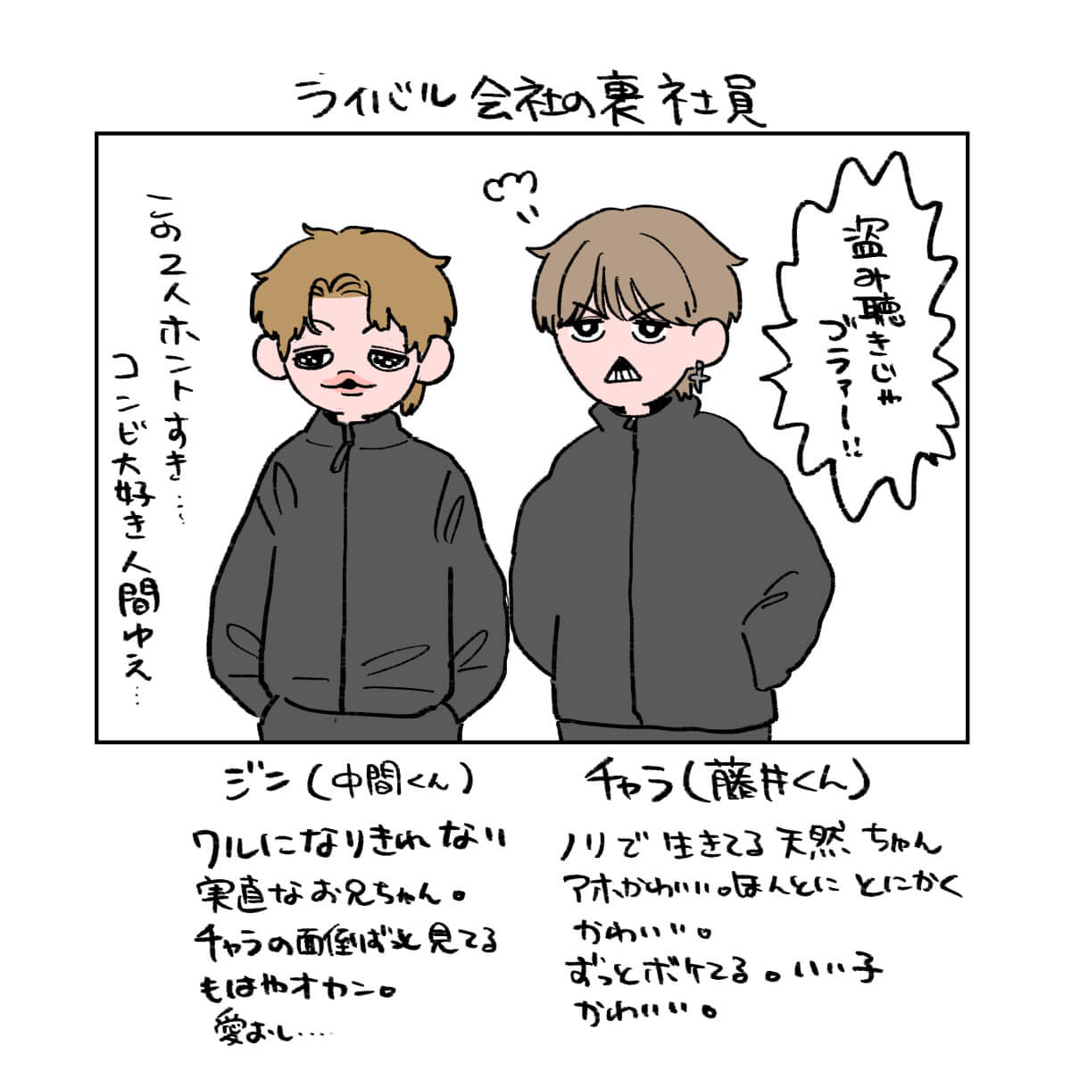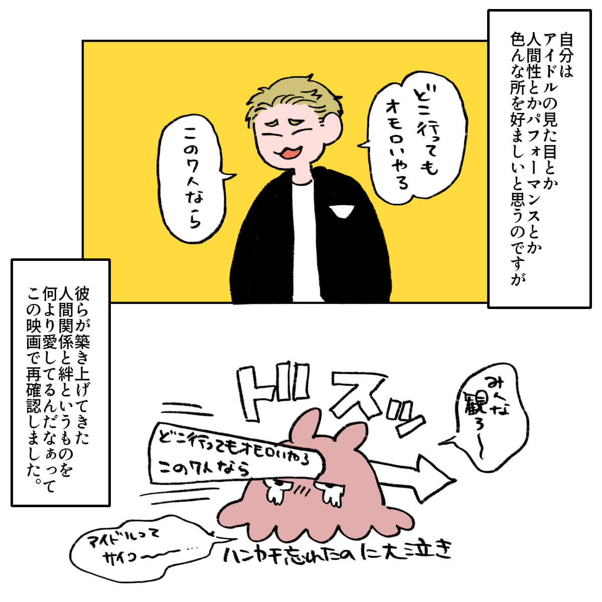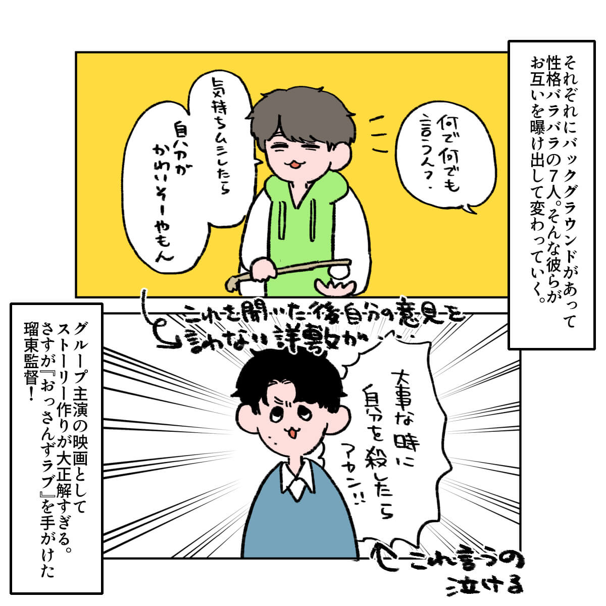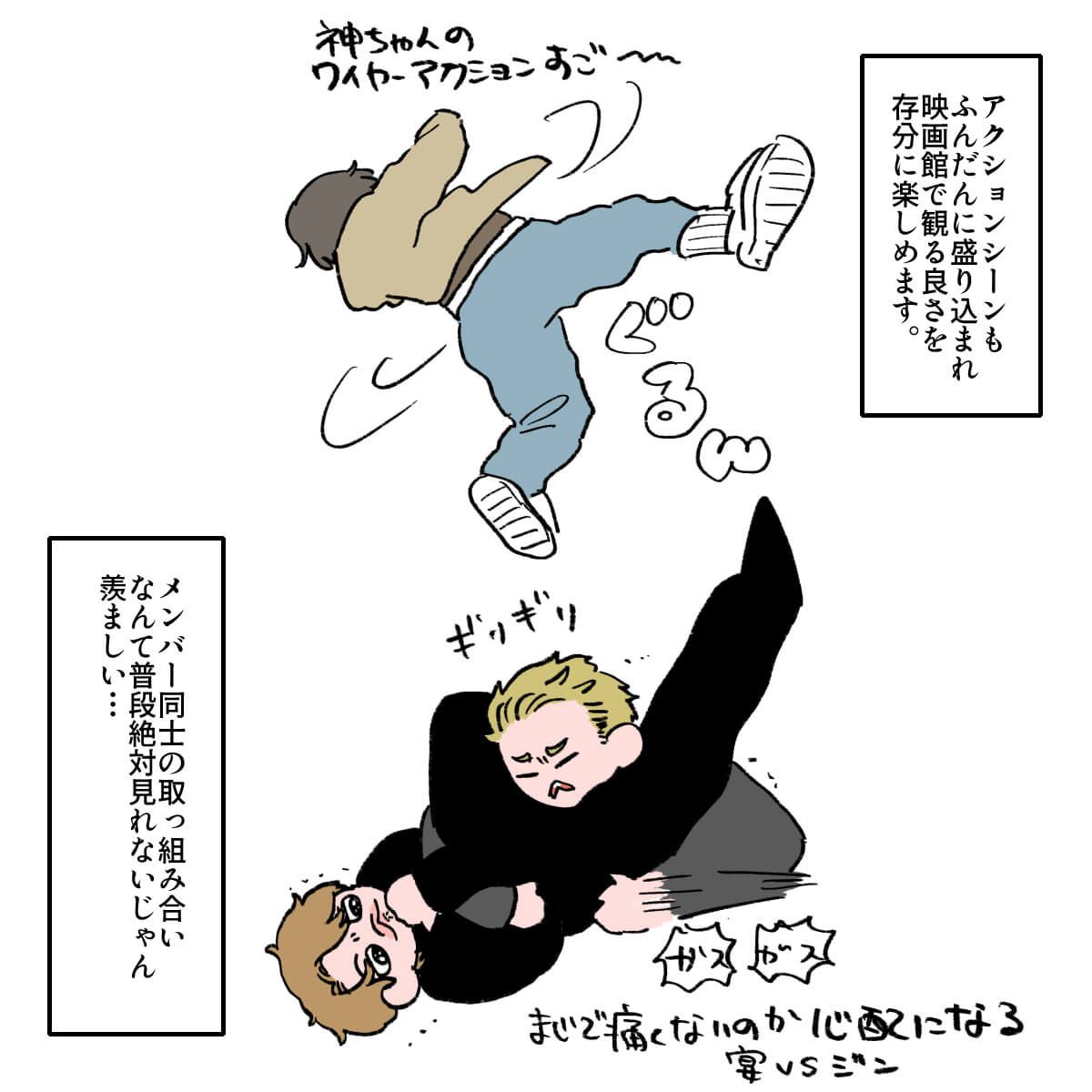 サイゾーウーマン男性アイドルSTARTO(旧ジャニーズ)WEST.WEST.の“絆”を再確認した映画『裏社員。』レビュー 男性アイドル [ドルオタ漫画家・竜田トキヒロの“推し事”見聞録]vol.105 WEST.の“絆”を再確認! グループ初の劇映画主演作として大正解だった『裏社員。』レビュー 2025/05/14 22:00 竜田トキヒロ(マンガ家) 竜田トキヒロの“推し事”見聞録WEST. 【サイゾーオンラインより】 ――Twitterで日々、ボーイズグループのメンバーにまつわるイラストを投稿中のドルオタ漫画家・竜田トキヒロが、現場レポートからドラマや映画、番組レビューまで、“推し事”の様子をお届け! 今回は、WEST.主演映画『裏社員。-スパイやらせてもろてます-』をレビューします。 目次 ・映画『裏社員。-スパイやらせてもろてます-』の概要とあらすじ ・キャラが立ったWEST.7人の役どころ ・映画を見て再確認した、WEST.の“絆” WEST.劇映画初主演作『裏社員。-スパイやらせてもろてます-』の概要とあらすじ 『裏社員。-スパイやらせてもろてます-』は、2024年にデビュー10周年を迎えたWEST.が、初めて全員で劇映画の主演を務めたアクションコメディ。19年公開の『劇場版おっさんずラブ~LOVE or DEAD~』などを手掛けた瑠東東一郎監督がメガホンを取りました。 表では解決できない問題を秘密裏に処理をする会社員、通称「裏社員」たちの活躍を描いた作品で、複合商業施設建設のため、さびれた商店街を潰そうと社長から指令を受けた裏社員とライバル社の裏社員が火花を散らしながらそれぞれ奮闘するが、動けば動くほどなぜか商店街の住人たちに愛されてしまう。一方で商店街を立て直そうとする熱血漢や、謎多き訳あり男、彼らに恋心を抱かせる幼なじみも現れ、事態は思わぬ方向に――という物語が展開します。 WEST.・桐山照史、神山智洋、濵田崇裕が阿川建設の裏社員、中間淳太と藤井流星が川端建設の裏社員、重岡大毅と小瀧望が商店街の住人をそれぞれ演じ、共演者には、恒松祐里、森香澄、剛力彩芽、赤井英和、トータス松本、有野晋哉(よゐこ)、モモコ(ハイヒール)、藤原紀香、竹中直人ら、豪華な顔ぶれが揃いました。 この記事では、メンバーそれぞれが演じている役柄や見どころなどを、竜田トキヒロがイラストで振り返ります。 さすが関西グループ! キャラが立ったWEST.7人の役どころ グループの主演映画として大正解! 映画を見て再確認した、WEST.の“絆” ★これまでの連載記事はこちらから 菊池風磨を起用した製作側の“意図”とは? 大森元貴は演技がうますぎ! 映画『#真相をお話しします』レビュー【サイゾーオンラインより】 ――Twitterで日々、ボーイズグループのメンバーにまつわるイラストを投稿中のドルオタ漫画家・竜田トキヒロが、現場レポートからドラマや映画、...サイゾーウーマン2025.04.30 映画『山田くんとLv999の恋をする』、作間龍斗を撮る監督の“気合”と「解釈一致」なキャスティングの妙【サイゾーオンラインより】 ――Twitterで日々、ボーイズグループのメンバーにまつわるイラストを投稿中のドルオタ漫画家・竜田トキヒロが、現場レポートからドラマや映画、...サイゾーウーマン2025.04.16 SixTONES・ジェシーの“スパダリ”っぷりに胸キュン! 映画『お嬢と番犬くん』レビュー【サイゾーオンラインより】 ――Twitterで日々、ボーイズグループのメンバーにまつわるイラストを投稿中のドルオタ漫画家・竜田トキヒロが、現場レポートからドラマや映画、...サイゾーウーマン2025.03.26 竜田トキヒロ(マンガ家) 漫画家、イラストレーター。育休中に執筆したエッセイ漫画でKADOKAWAコミックエッセイ大賞受賞。Ameba、ライブドア公式ブロガーを経たのち現在はインフルエンサーとしてエンタメ、オタクに特化した漫画やイラストや体験ルポ等幅広く執筆。著書『コミュ障母さんとごきげん娘』(KADOKAWA) X:@musumenuma 最終更新:2025/05/15 08:32 ぜひ劇場へ! 関連記事 菊池風磨を起用した製作側の“意図”とは? 大森元貴は演技がうますぎ! 映画『#真相をお話しします』レビュー映画『山田くんとLv999の恋をする』、作間龍斗を撮る監督の“気合”と「解釈一致」なキャスティングの妙SixTONES・ジェシーの“スパダリ”っぷりに胸キュン! 映画『お嬢と番犬くん』レビュー『劇場版 トリリオンゲーム』目黒蓮&佐野勇斗を見て、『プリキュア』鑑賞の女児のようになったワケFANTASTICS・八木勇征のキャスティングが天才! 映画『矢野くんの普通の日々』レビュー 次の記事 【WEST.】歴代売上データ一覧 >