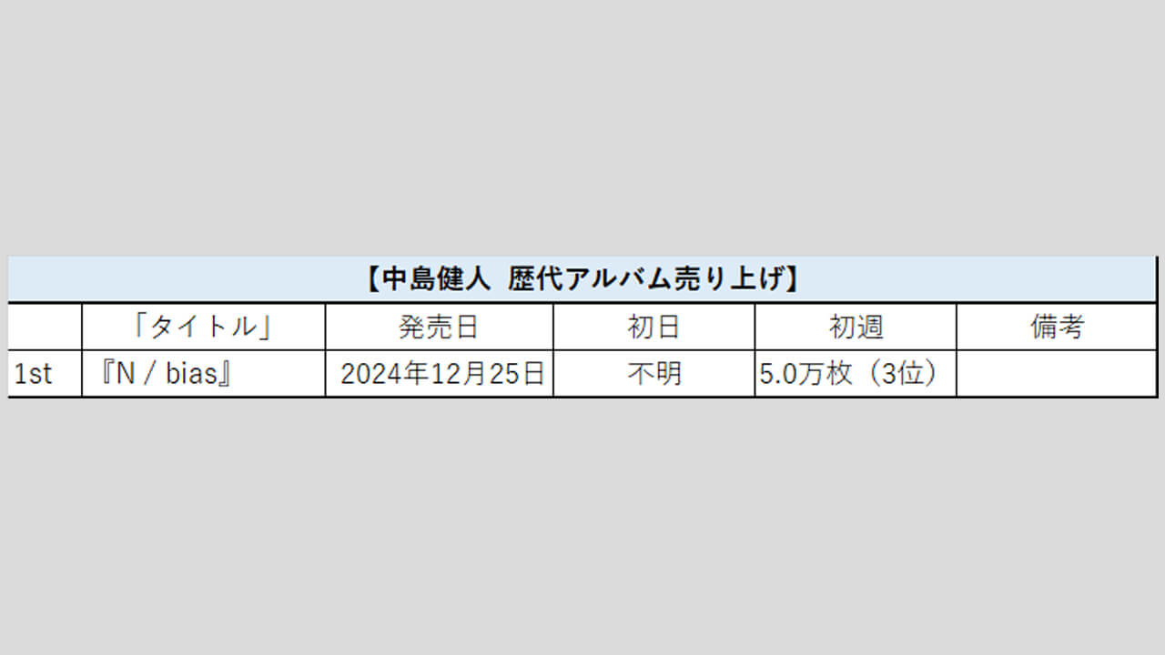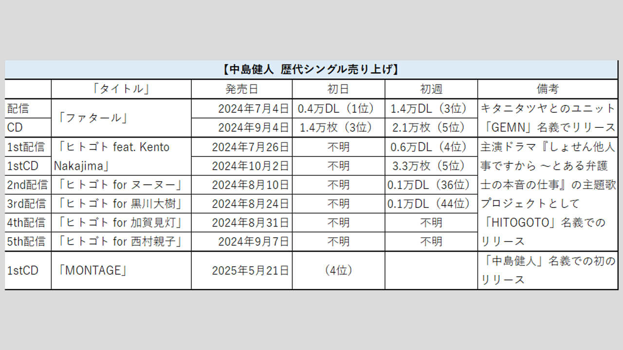 サイゾーウーマン男性アイドルSTARTO(旧ジャニーズ)中島健人【中島健人】歴代売上データ一覧 男性アイドル [STARTOグループ別売り上げデータ] 【中島健人】歴代シングル・アルバム売り上げ枚数データ一覧|2025年5月22日最新情報 2025/05/22 08:00 サイゾーウーマン編集部 中島健人STARTO 【サイゾーオンラインより】 (写真:サイゾーウーマン) ――オリコンリサーチ株式会社が毎週月曜からの7日間を集計期間として、CD・DVD・書籍等の売り上げを発表する「オリコンランキング」。販売データとしての側面はもちろん、結果からはその時々の流行がわかるほか、アーティストにとっては人気の“指標”にもなるため、業界関係者のみならず、ファンたちも日々公開される売り上げランキングの動向を注視していることだろう。サイゾーウーマンでは、STARTO ENTERTAINMENT(旧ジャニーズ事務所)所属アーティストのシングル、アルバムの打ち上げ枚数の推移を、各アーティストごとに表やグラフで一挙に紹介! 目次 ・歴代シングル売り上げまとめ【2025年5月22日更新】 ・歴代アルバム売り上げまとめ【2025年5月22日更新】 中島健人 歴代シングル売り上げまとめ【2025年5月22日更新】 ※数字はすべてオリコン調べ (C)サイゾーウーマン 2024年3月末にSexy Zone(現timelesz)を卒業後、ソロに転向した中島健人。同年6月30日、テレビアニメ『【推しの子】第2期』(TOKYO MXほか)のオープニング主題歌「ファタール」を担当したユニット「GEMN(ジェム)」の正体が、中島とシンガーソングライター・キタニタツヤであることが発表され、7月4日に同曲を配信リリース。その後、9月4日にCDとして発売され、初週で2.1万枚を売り上げた。 その後、同年7月期放送の主演ドラマ『しょせん他人事ですから 〜とある弁護士の本音の仕事』(テレビ東京系)の主題歌として、歌唱・作詞を自ら務める音楽プロジェクト「HITOGOTO」名義で5曲を発表。10月には全曲を収録したCD「ヒトゴト feat. Kento Nakajima」を発売し、初週3.3万枚を記録している。 今年5月21日には、「中島健人」として初のCD「MONTAGE」をリリースし、初日は4位に初登場。売り上げ枚数は不明だが、3位にランクインしたIS:SUEの「EXTREME DIAMOND(SHINING)」がマークした4.4万枚より低いことは確かだろう。 初週では、昨年12月にリリースした1stアルバム『N / bias』の5.0万枚を超えられるだろうか――。 中島健人 歴代アルバム売り上げまとめ【2025年5月22日更新】 (C)サイゾーウーマン 24年12月25日に、「中島健人」としてのデビューアルバム『N / bias』を発売。「個人の体験や感情にフォーカスをあてた内容」で、「これまでの中島健人に対しての評価や偏見を振り払い、人間として殻をやぶっていく決意をこめたアルバム作品」(公式サイトより)になっているそう。 記念すべき初のソロアルバムは、初週で5.0万枚を売り上げ、同年10月にリリースしたCD「ヒトゴト feat. Kento Nakajima」の初週3.3万枚を上回る結果に。 なお、中島は同作を引っ提げた初の全国ツアー『KENTO NAKAJIMA 1st Tour 2025 “N / bias” 巡』を今年4月から開催しており、全7都市で12公演を行う予定だ。 Snow Man、ベスト盤デジタル解禁でIMP.&中島健人にDL数及ばず……ストリーミングの週間総再生数2位の要因【サイゾーオンラインより】 Snow Manのベストアルバム『THE BEST 2020 - 2025』が初週7,491ダウンロード(以下、DL)を記録し、...サイゾーウーマン2025.04.17 SixTONES・松村北斗、中島健人を「絶対に許してない!」 15年前の“遺恨”とは? 11月16日深夜放送のラジオ『SixTONESのオールナイトニッポンサタデースペシャル』(ニッポン放送)に、松村北斗と高地優吾が登場。松村が中島健人に対して、いま...サイゾーウーマン2024.11.18 中島健人、ソロ初CDの初日売り上げJO1に及ばず……timelesz・菊池風磨は「買わなきゃね」発言? Sexy Zone(現timelesz)の元メンバー・中島健人が歌唱・作詞で参加している音楽プロジェクト「HITOGOTO」が、シングル「ヒトゴト feat. K...サイゾーウーマン2024.10.03 サイゾーウーマン編集部 芸能・ジャニーズ・美容・暮らし・カルチャーなど、さまざまな情報を独自の切り口で発信するニュースサイト X:@CyzowomanC Instagram:@cyzowoman オンナを刺激するニュースブログ[サイゾーウーマン] 最終更新:2025/05/22 09:14 初週売り上げに注目! 関連記事 Snow Man、ベスト盤デジタル解禁でIMP.&中島健人にDL数及ばず……ストリーミングの週間総再生数2位の要因SixTONES・松村北斗、中島健人を「絶対に許してない!」 15年前の“遺恨”とは?中島健人、ソロ初CDの初日売り上げJO1に及ばず……timelesz・菊池風磨は「買わなきゃね」発言?中島健人、主演ドラマ盛り上がらず……キタニタツヤとのシングルは初週2万枚売り上げSexy Zone・菊池風磨、“シンメ”中島健人脱退でファンに懇願「メンバーを悪く言わないで」 次の記事 Aぇ、お見送り会でのスタッフの“剥がし”に不満噴出 >