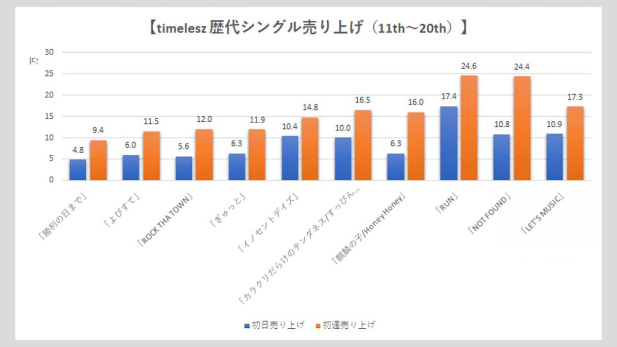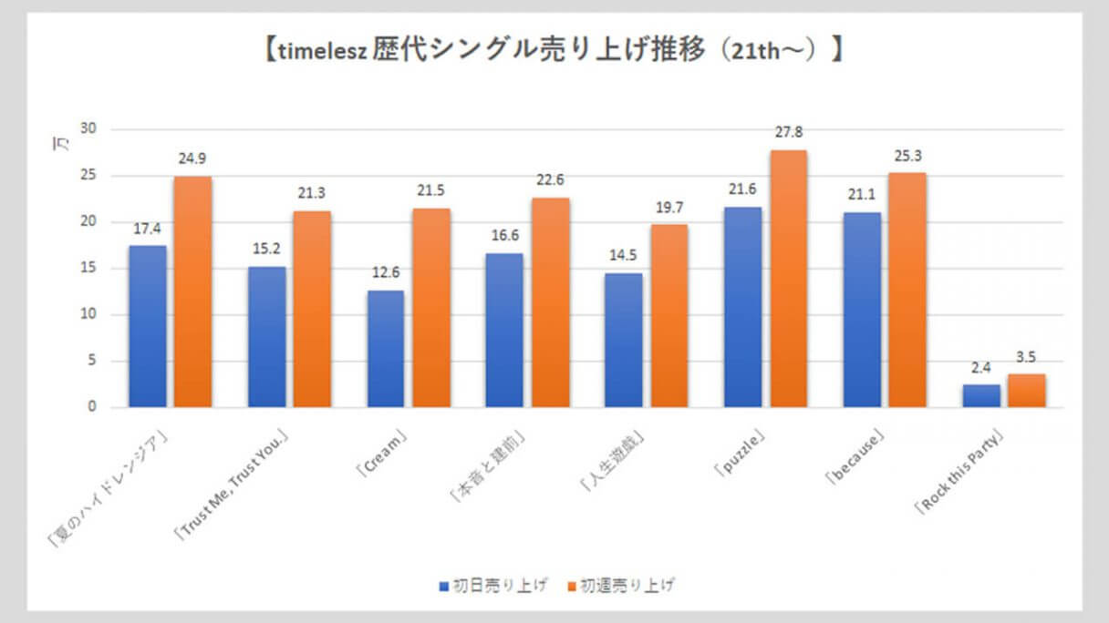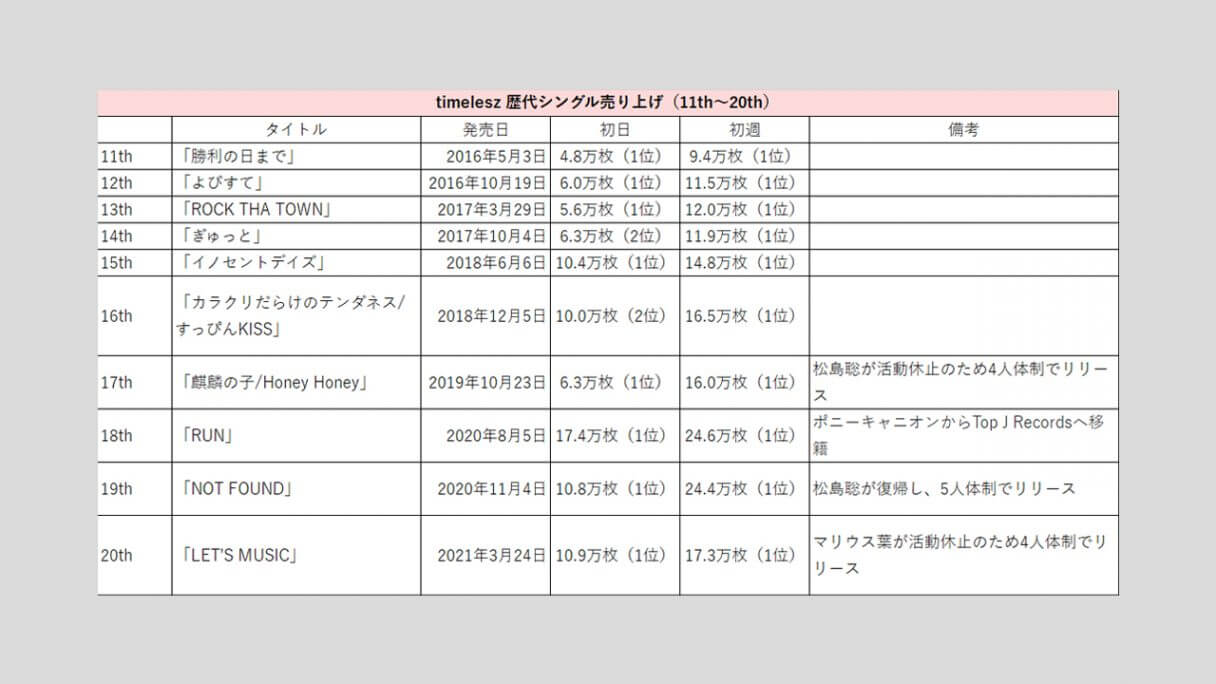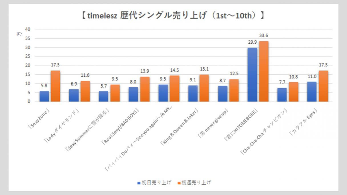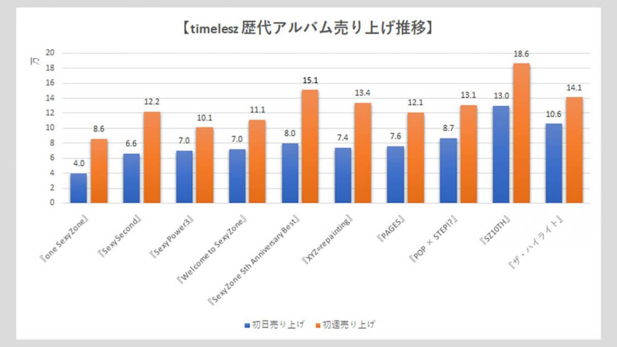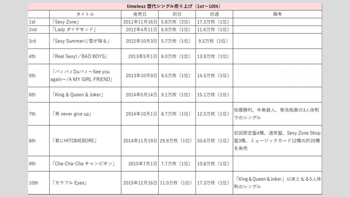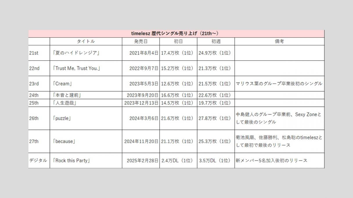 サイゾーウーマン男性アイドルSTARTO(旧ジャニーズ)timelesz【timelesz】歴代売上データ一覧 男性アイドル [STARTOグループ別売り上げデータ] 【timelesz】歴代シングル・アルバム売上枚数データ一覧|2025年6月18日最新情報 2025/06/18 19:00 サイゾーウーマン編集部 timelesz 【サイゾーオンラインより】 (写真:サイゾーウーマン) ――オリコンリサーチ株式会社が毎週月曜からの7日間を集計期間として、CD・DVD・書籍等の売り上げを発表する「オリコンランキング」。販売データとしての側面はもちろん、結果からはその時々の流行がわかるほか、アーティストにとっては人気の“指標”にもなるため、業界関係者のみならず、ファンたちも日々公開される売り上げランキングの動向を注視していることだろう。サイゾーウーマンでは、各STARTO ENTERTAINMENT所属グループのシングル、アルバムの打ち上げ枚数の推移を、各アーティストごとに表やグラフで一挙に紹介! 目次 ・歴代シングル売り上げまとめ【2025年3月6日更新】 ・歴代アルバム売り上げまとめ【2025年6月18日更新】 timelesz 歴代シングル売り上げまとめ【2025年3月6日更新】 ※数字はすべてオリコン調べ ※画像クリックで拡大表示(C)サイゾーウーマン ※画像クリックで拡大表示(C)サイゾーウーマン ※画像クリックで拡大表示(C)サイゾーウーマン ※画像クリックで拡大表示(C)サイゾーウーマン ※画像クリックで拡大表示(C)サイゾーウーマン ※画像クリックで拡大表示(C)サイゾーウーマン 2011年11月16日にCDデビューして以降、全ての作品で「オリコン週間シングルランキング」1位を獲得してきたSexy Zone。 24年3月6日には、中島健人主演ドラマ『リビングの松永さん』(フジテレビ系)の主題歌に起用されている26枚目シングル「puzzle」をリリース。同作は、同月末をもってグループを“卒業”する中島が参加する最後の作品かつ、4月1日にSexy Zone名義のラストシングルで、初日売り上げは21.6万枚、初週売り上げは27.8万枚を記録。14年11月19日発売の8枚目「君にHITOMEBORE」に次ぐ歴代2位の好セールスとなった。 そして、4月から佐藤勝利、菊池風磨、松島聡の3人体制で「timelesz」として再始動した彼らは、新たな仲間を迎えるべく『timelesz project -AUDITION-』(以下、タイプロ)と題したオーディションを開催。今年2月に一般公募から橋本将生、猪俣周杜、篠塚大輝の3人と、STARTO の「俳優部」に所属していた寺西拓人と原嘉孝(2人は4次審査から参加)の加入が発表された。 2月28日には、オーディションの最終審査での課題曲「Rock this Party」を、8人体制初の楽曲としてデジタルリリース。初日2.4万ダウンロード(以下、DL)で発進後、初週は3.5万DLをマークした。 22年10月28日に1stデジタルシングル「JUST DANCE!」で全世界デビューし、配信開始から3日間で6万6,716DLを記録したTravis Japanと比べると、物足りない結果といえるだろう。 timelesz 歴代アルバム売り上げまとめ【2025年6月18日更新】 ※画像クリックで拡大表示(C)サイゾーウーマン ※画像クリックで拡大表示(C)サイゾーウーマン ※画像クリックで拡大表示(C)サイゾーウーマン 海外進出を視野に入れた活動を本格的にスタートするため、デビュー以来所属していたポニーキャニオンを離れ、20年8月5日発売の18枚目シングル「RUN」から、ジャニーズ事務所とユニバーサルミュージックがタッグを組んで設立した新レーベル「Top J Records」に移籍した彼ら。以降、シングル同様にアルバムの売り上げも好調で、21年3月3日発売の2枚目のベストアルバム『SZ10TH』は自己最高の初週18.6万枚を売り上げた。 23年6月7日に発売した9枚目アルバム『Chapter II』の初週売り上げは15.0万枚を記録し、前作『ザ・ハイライト』の14.1万枚を上回る結果に。16年11月16日発売のベストアルバム『Sexy Zone 5th Anniversary Best』に次いで、歴代3位の売り上げとなった。 24年3月31日の中島健人脱退後初のリリースとなった最新作『timelesz』(6月19日発売)は、初日7.4万枚、初週10.0万枚をマーク。同作は、シングルとアルバムの中間にあたる「EP」でアルバムと比べると収録曲数も少ないため単純比較はできないが、『Chapter II』から約5万枚売り上げがダウン。 また、25年2月28日にデジタルシングル「Rock this Party」と同時に、デジタルコンピレーションアルバム『Hello! We’re timelesz』をリリースしたが、初週0.8万DLで1万台には届かず。Sexy Zone時代の楽曲を含む12曲が収録されているものの、新曲は含まれていなかったことも、売り上げが振るわなかった一因かもしれない。 一方で、6月11日に発売した新体制初のアルバム『FAM』は、初日に48.5万枚を売り上げ、2日目に5.3万枚を記録しハーフミリオンを突破。初週では61.9万枚まで数字を伸ばし、自己最高売上を更新した。 『タイプロ』で世間の注目を集め、人気急上昇中のtimelesz。今後、売り上げがどのように推移していくか注目だ。 timelesz・寺西拓人、過密すぎる個人仕事で体調面気遣う声も……気になる新規ファンの“観劇マナー問題”【サイゾーオンラインより】 Netflixで