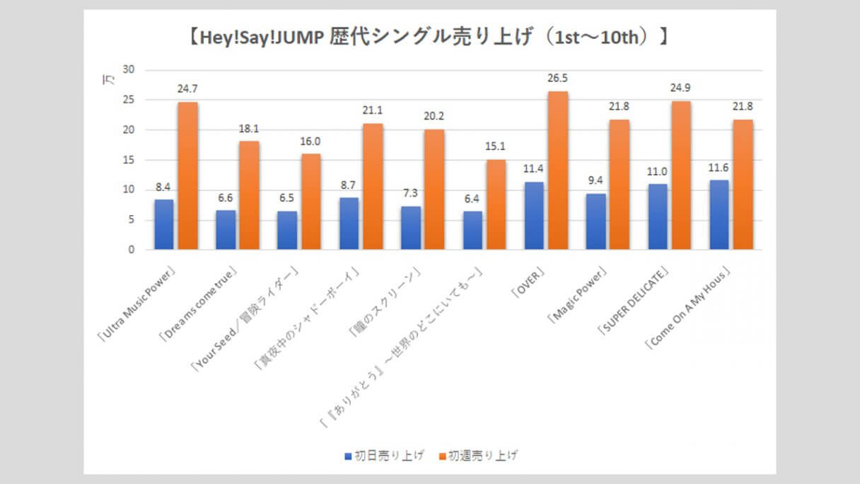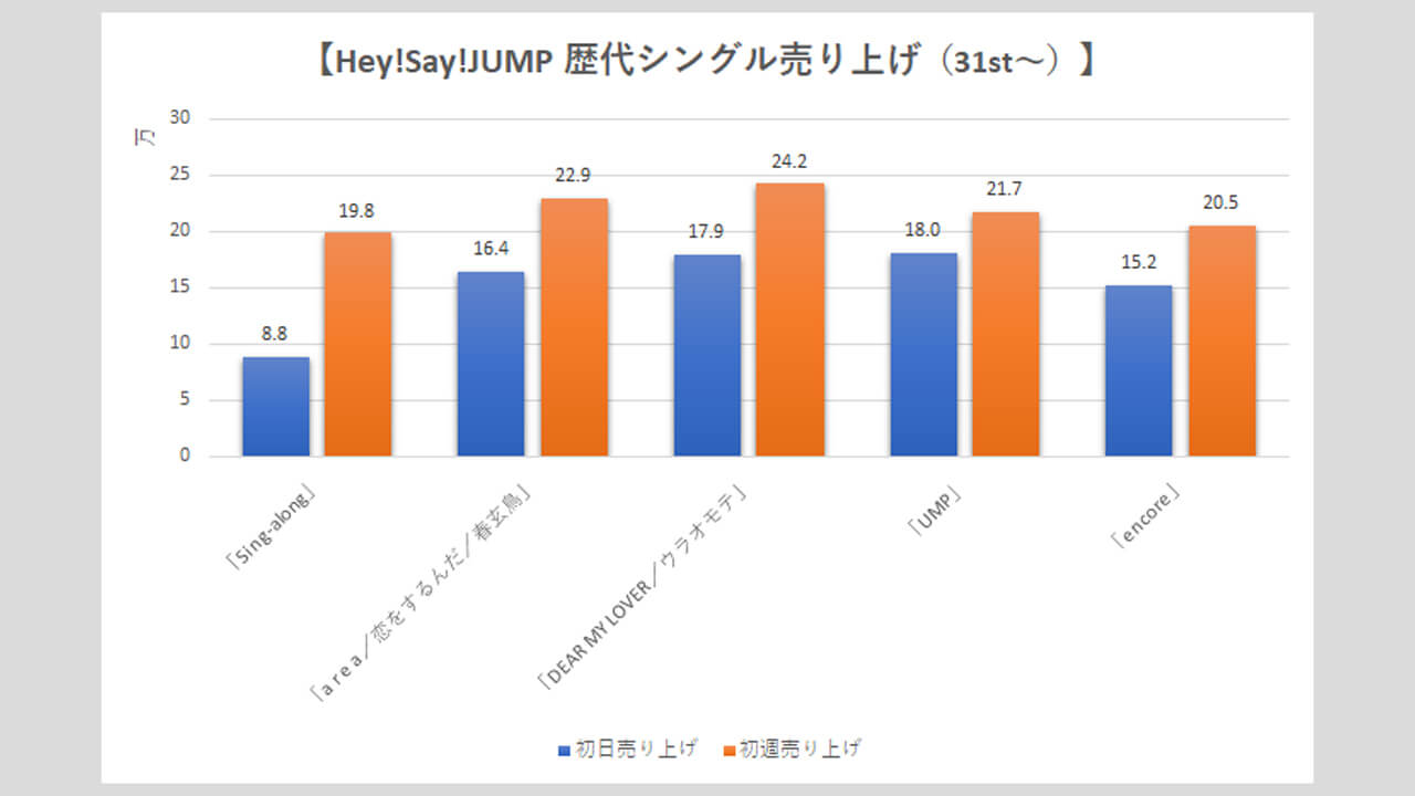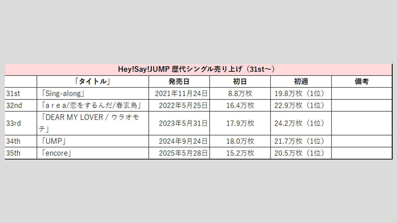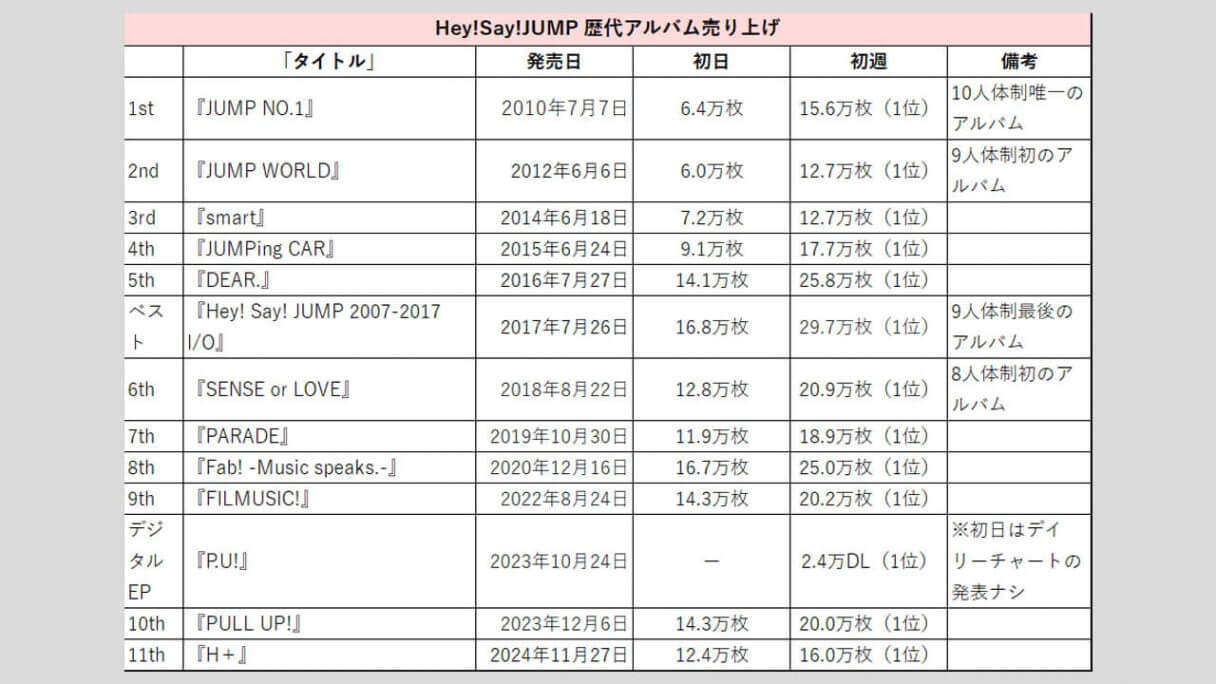 サイゾーウーマン男性アイドルSTARTO(旧ジャニーズ)Hey!Say!JUMP【Hey!Say!JUMP】歴代売上データ一覧 男性アイドル [STARTOグループ別売り上げデータ] 【Hey!Say!JUMP】歴代シングル・アルバム売り上げ枚数データ一覧|2025年6月5日最新情報 2025/06/05 08:00 サイゾーウーマン編集部 Hey! Say! JUMP 【サイゾーオンラインより】 2024年に結成18年目を迎えたHey!Say!JUMP(写真:サイゾーウーマン) ――オリコンリサーチ株式会社が毎週月曜からの7日間の集計期間中に、CD・DVD・書籍等の売り上げを集計する「オリコンランキング」。販売データとしての側面はもちろん、結果からはその時々の流行がわかるほか、アーティストにとっては人気の“指標”にもなるため、業界関係者のみならず、ファンたちも日々公開される売り上げランキングの動向に注視していることだろう。サイゾーウーマンでは、STARTO(旧ジャニーズ事務所)の各所属アーティストのシングル、アルバムの打ち上げ枚数の推移を、表やグラフで一挙に紹介! 目次 ・歴代シングル売り上げまとめ【2025年6月5日更新】 ・Hey!Say!JUMP、シングル売り上げの最高枚数は? ・歴代アルバム売り上げまとめ【2025年4月27日更新】 ・Hey!Say!JUMP、アルバム売り上げの最高枚数は? Hey!Say!JUMP 歴代シングル売り上げまとめ【2025年6月5日更新】 ※数字はすべてオリコン調べ ※画像クリックで拡大表示(C)サイゾーウーマン ※画像クリックで拡大表示(C)サイゾーウーマン ※画像クリックで拡大表示(C)サイゾーウーマン ※画像クリックで拡大表示(C)サイゾーウーマン ※画像クリックで拡大表示(C)サイゾーウーマン ※画像クリックで拡大表示(C)サイゾーウーマン ※画像クリックで拡大表示(C)サイゾーウーマン ※画像クリックで拡大表示(C)サイゾーウーマン Hey!Say!JUMP、シングル売り上げの最高枚数は? 2007年11月14日、山田涼介、中島裕翔、知念侑李、森本龍太郎、岡本圭人、薮宏太、八乙女光、有岡大貴、伊野尾慧、高木雄也の10人で「Ultra Music Power」でデビューしたHey!Say!JUMP。 その後、森本は11年6月に「週刊女性」(主婦と生活社)で未成年時の喫煙写真を報じられた一件が引き金となって脱退し、事務所も退所。また、海外留学のため18年8月末から芸能活動を休業していた岡本圭人も、21年4月にグループから完全に離脱。現在は8人体制で活動している。 まず、シングルの売り上げを見ていくと、6枚目の「『ありがとう』~世界のどこにいても~」(10年12月15日発売)まで、初日の数字は1ケタ台を連発。以降はアップダウンを繰り返し、10万台を割ることもあるものの、近年は13~17万台を推移。 33枚目の「DEAR MY LOVER/ウラオモテ」(5月31日発売)は、17.9万枚で発進し、初週売り上げは24.2万枚と過去5年間で最も高い数字となった。なお、歴代最高の初週記録は、21作目「White Love」(17年12月20日発売)の28.7万枚。 そして、グループ結成日に発売された34枚目の「UMP」(24年9月24日)は、初日18.0万枚とCDシングルでは最高のスタートを切ったものの、初週は21.7万枚にとどまった。前作から1年4カ月ぶりとなる待望のシングルであることを考えると、物足りない数字といえる。 今年5月28日にはニューシングル「encore」をリリースし、初日は15.2万枚、初週では20万枚の大台には乗ったが、前作より1.2万枚ダウンした。「DEAR MY LOVER/ウラオモテ」以降、売り上げは下降気味だけに、次作では25万枚超えを目指し、売り上げアップを図りたいところだろう。 Hey!Say!JUMP 歴代アルバム売り上げまとめ【2025年3月28日更新】 ※画像クリックで拡大表示(C)サイゾーウーマン ※画像クリックで拡大表示(C)サイゾーウーマン ※画像クリックで拡大表示(C)サイゾーウーマン Hey!Say!JUMP、アルバム売り上げの最高枚数は? 続いて、アルバムの売り上げをみていくと、初日、初週ともに最も売り上げがよかったのは、デビュー10周年を迎える17年7月26日に発売した初のベスト盤『Hey! Say! JUMP 2007-2017 I/O』。初週セールスは、シングルで歴代最高の売り上げを誇る「White Love」(17年12月20日発売)の28.7万枚を1万枚上回った29.7万枚となっている。 同作は初回限定盤1、初回限定盤2、通常盤の3形態で発売され、初回限定盤1には「Ultra Music Power」から「OVER THE TOP」までのPVを収録したDVD、初回限定盤2には、音源化されていなかったオリジナル曲を収録したCDも付属するなど充実の内容。10周年を祝う意味でも、手に取る人が多かったのかもしれない。 その後、7枚目『PARADE』(19年10月30日発売)は初週18.9万枚、10枚目『PULL UP!』(23年12月6日発売)も、9枚目『FILMUSIC!』(22年8月24日発売)の20.2万枚から若干売り上げを落として19万9,895枚(20.0万枚)と20万台を下回った。 24年11月27日発売の最新作『H+』は、そこからさらに売り上げが下がり、初日12.4万枚、初週16.0万枚という結果に。アルバム同様、近年はシングルも低迷しているだけに、復調を狙うには楽曲そのものの“強さ”はもちろん、趣向を凝らした特典をつけるなど、なんらかの仕掛けが必要かもしれない。 なお、メンバーの山田涼介は、4月16日に初のソロアル