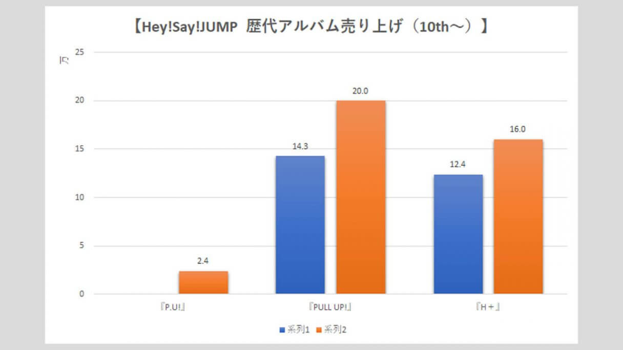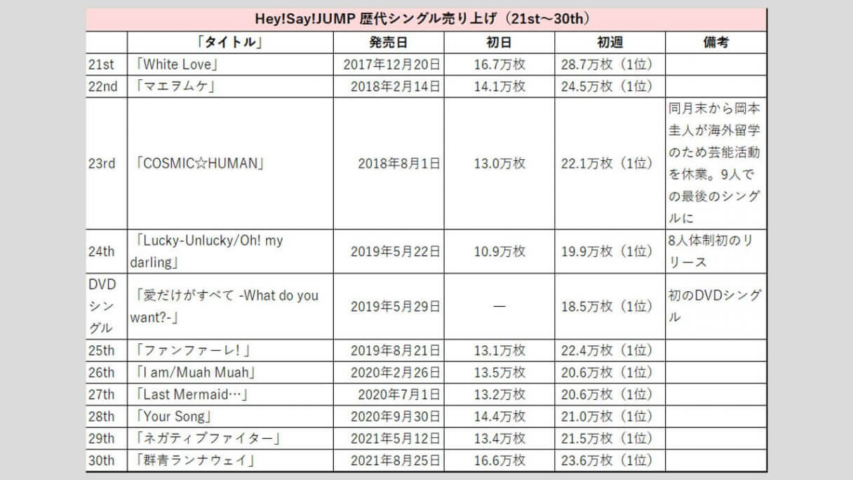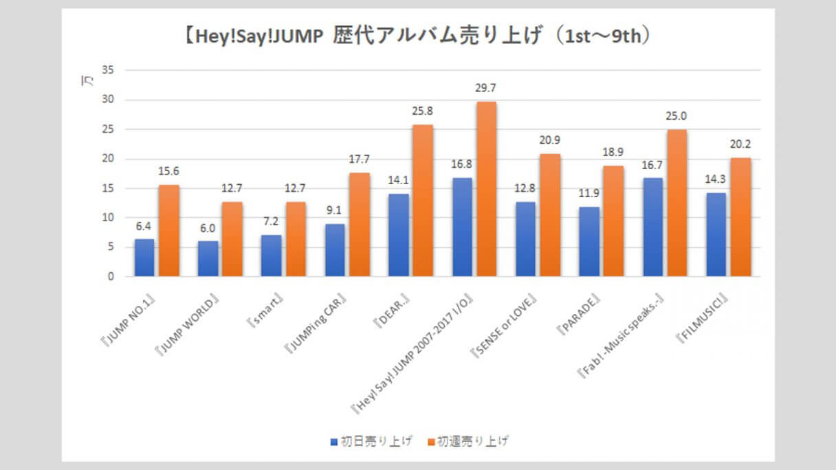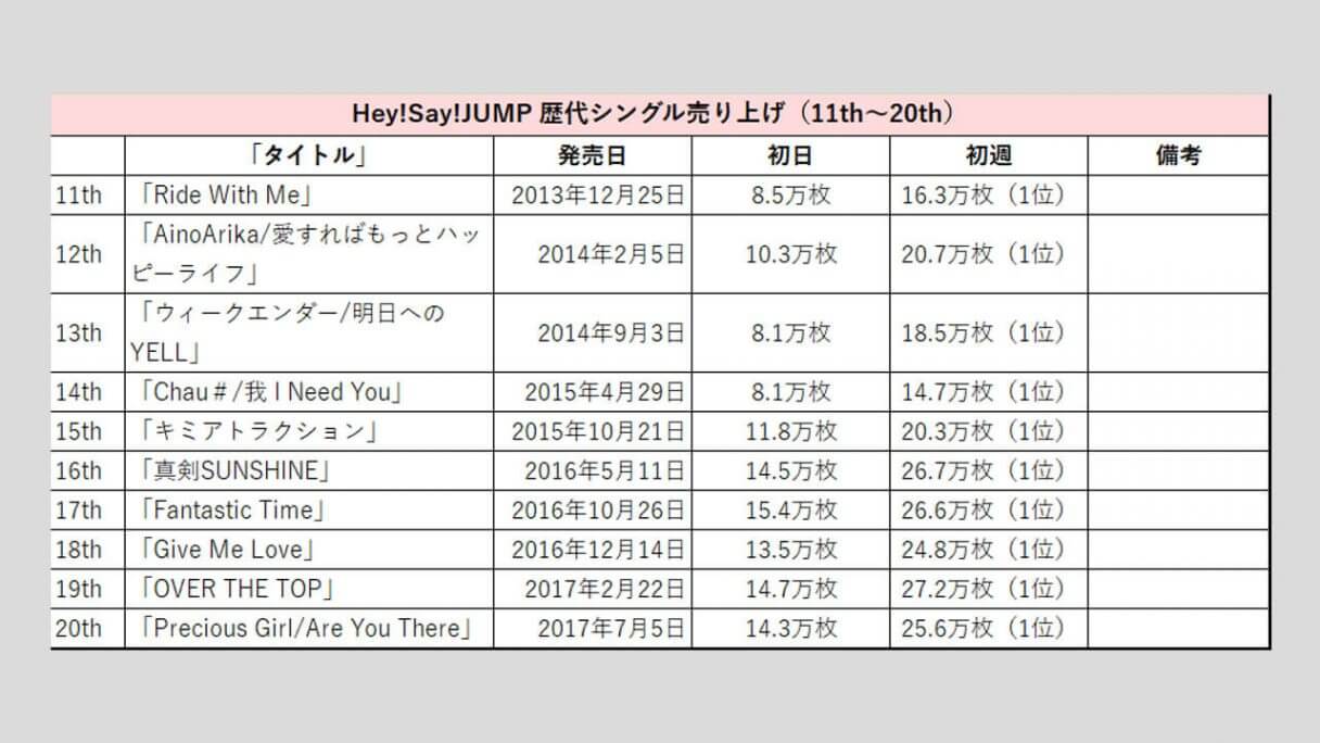 サイゾーウーマン男性アイドルSTARTO(旧ジャニーズ)Hey!Say!JUMP【Hey!Say!JUMP】歴代売上データ一覧 男性アイドル [STARTOグループ別売り上げデータ] 【Hey!Say!JUMP】歴代シングル・アルバム売り上げ枚数データ一覧|2025年6月5日最新情報 2025/06/05 08:00 サイゾーウーマン編集部 Hey! Say! JUMP 【サイゾーオンラインより】 2024年に結成18年目を迎えたHey!Say!JUMP(写真:サイゾーウーマン) ――オリコンリサーチ株式会社が毎週月曜からの7日間の集計期間中に、CD・DVD・書籍等の売り上げを集計する「オリコンランキング」。販売データとしての側面はもちろん、結果からはその時々の流行がわかるほか、アーティストにとっては人気の“指標”にもなるため、業界関係者のみならず、ファンたちも日々公開される売り上げランキングの動向に注視していることだろう。サイゾーウーマンでは、STARTO(旧ジャニーズ事務所)の各所属アーティストのシングル、アルバムの打ち上げ枚数の推移を、表やグラフで一挙に紹介! 目次 ・歴代シングル売り上げまとめ【2025年6月5日更新】 ・Hey!Say!JUMP、シングル売り上げの最高枚数は? ・歴代アルバム売り上げまとめ【2025年4月27日更新】 ・Hey!Say!JUMP、アルバム売り上げの最高枚数は? Hey!Say!JUMP 歴代シングル売り上げまとめ【2025年6月5日更新】 ※数字はすべてオリコン調べ ※画像クリックで拡大表示(C)サイゾーウーマン ※画像クリックで拡大表示(C)サイゾーウーマン ※画像クリックで拡大表示(C)サイゾーウーマン ※画像クリックで拡大表示(C)サイゾーウーマン ※画像クリックで拡大表示(C)サイゾーウーマン ※画像クリックで拡大表示(C)サイゾーウーマン ※画像クリックで拡大表示(C)サイゾーウーマン ※画像クリックで拡大表示(C)サイゾーウーマン Hey!Say!JUMP、シングル売り上げの最高枚数は? 2007年11月14日、山田涼介、中島裕翔、知念侑李、森本龍太郎、岡本圭人、薮宏太、八乙女光、有岡大貴、伊野尾慧、高木雄也の10人で「Ultra Music Power」でデビューしたHey!Say!JUMP。 その後、森本は11年6月に「週刊女性」(主婦と生活社)で未成年時の喫煙写真を報じられた一件が引き金となって脱退し、事務所も退所。また、海外留学のため18年8月末から芸能活動を休業していた岡本圭人も、21年4月にグループから完全に離脱。現在は8人体制で活動している。 まず、シングルの売り上げを見ていくと、6枚目の「『ありがとう』~世界のどこにいても~」(10年12月15日発売)まで、初日の数字は1ケタ台を連発。以降はアップダウンを繰り返し、10万台を割ることもあるものの、近年は13~17万台を推移。 33枚目の「DEAR MY LOVER/ウラオモテ」(5月31日発売)は、17.9万枚で発進し、初週売り上げは24.2万枚と過去5年間で最も高い数字となった。なお、歴代最高の初週記録は、21作目「White Love」(17年12月20日発売)の28.7万枚。 そして、グループ結成日に発売された34枚目の「UMP」(24年9月24日)は、初日18.0万枚とCDシングルでは最高のスタートを切ったものの、初週は21.7万枚にとどまった。前作から1年4カ月ぶりとなる待望のシングルであることを考えると、物足りない数字といえる。 今年5月28日にはニューシングル「encore」をリリースし、初日は15.2万枚、初週では20万枚の大台には乗ったが、前作より1.2万枚ダウンした。「DEAR MY LOVER/ウラオモテ」以降、売り上げは下降気味だけに、次作では25万枚超えを目指し、売り上げアップを図りたいところだろう。 Hey!Say!JUMP 歴代アルバム売り上げまとめ【2025年3月28日更新】 ※画像クリックで拡大表示(C)サイゾーウーマン ※画像クリックで拡大表示(C)サイゾーウーマン ※画像クリックで拡大表示(C)サイゾーウーマン Hey!Say!JUMP、アルバム売り上げの最高枚数は? 続いて、アルバムの売り上げをみていくと、初日、初週ともに最も売り上げがよかったのは、デビュー10周年を迎える17年7月26日に発売した初のベスト盤『Hey! Say! JUMP 2007-2017 I/O』。初週セールスは、シングルで歴代最高の売り上げを誇る「White Love」(17年12月20日発売)の28.7万枚を1万枚上回った29.7万枚となっている。 同作は初回限定盤1、初回限定盤2、通常盤の3形態で発売され、初回限定盤1には「Ultra Music Power」から「OVER THE TOP」までのPVを収録したDVD、初回限定盤2には、音源化されていなかったオリジナル曲を収録したCDも付属するなど充実の内容。10周年を祝う意味でも、手に取る人が多かったのかもしれない。 その後、7枚目『PARADE』(19年10月30日発売)は初週18.9万枚、10枚目『PULL UP!』(23年12月6日発売)も、9枚目『FILMUSIC!』(22年8月24日発売)の20.2万枚から若干売り上げを落として19万9,895枚(20.0万枚)と20万台を下回った。 24年11月27日発売の最新作『H+』は、そこからさらに売り上げが下がり、初日12.4万枚、初週16.0万枚という結果に。アルバム同様、近年はシングルも低迷しているだけに、復調を狙うには楽曲そのものの“強さ”はもちろん、趣向を凝らした特典をつけるなど、なんらかの仕掛けが必要かもしれない。 なお、メンバーの山田涼介は、4月16日に初のソロアル
