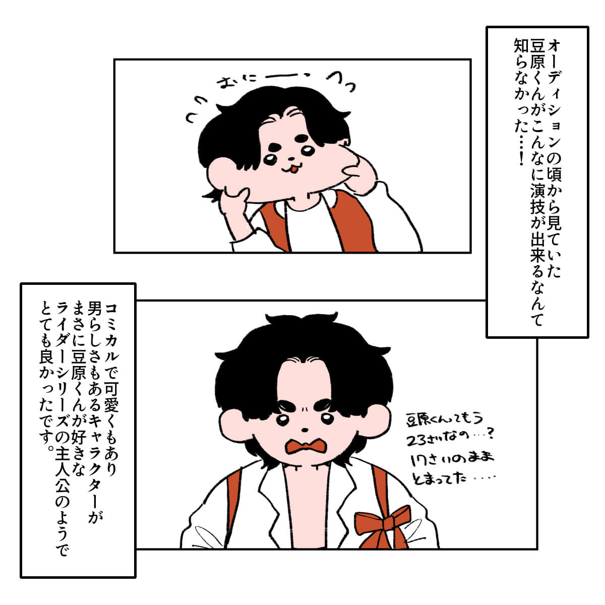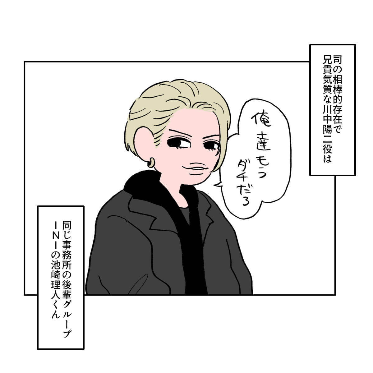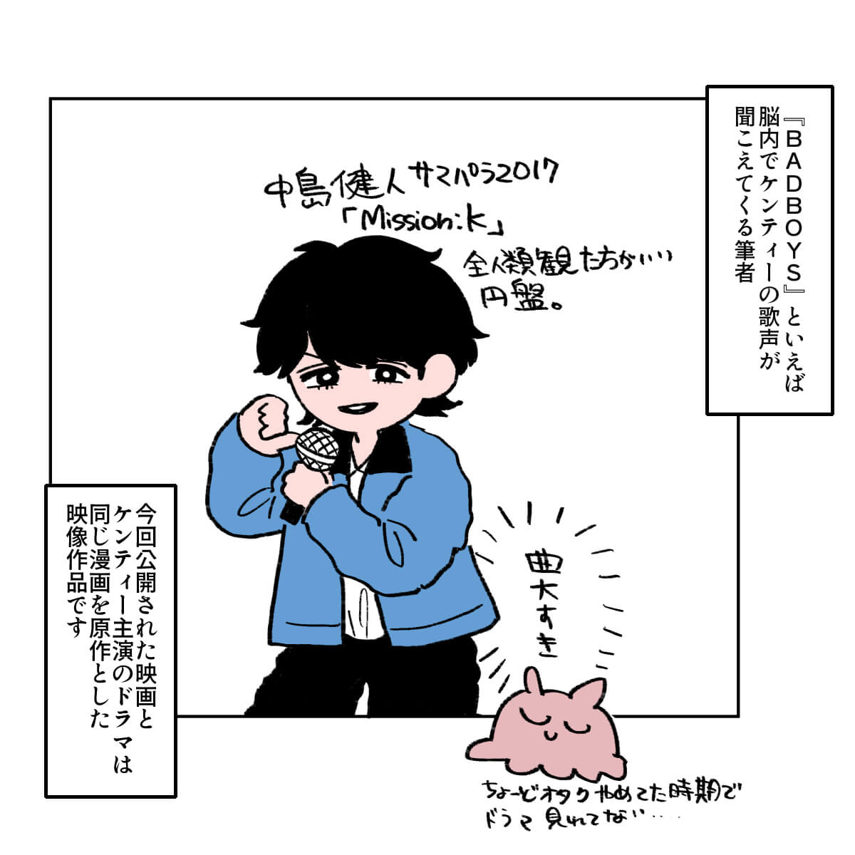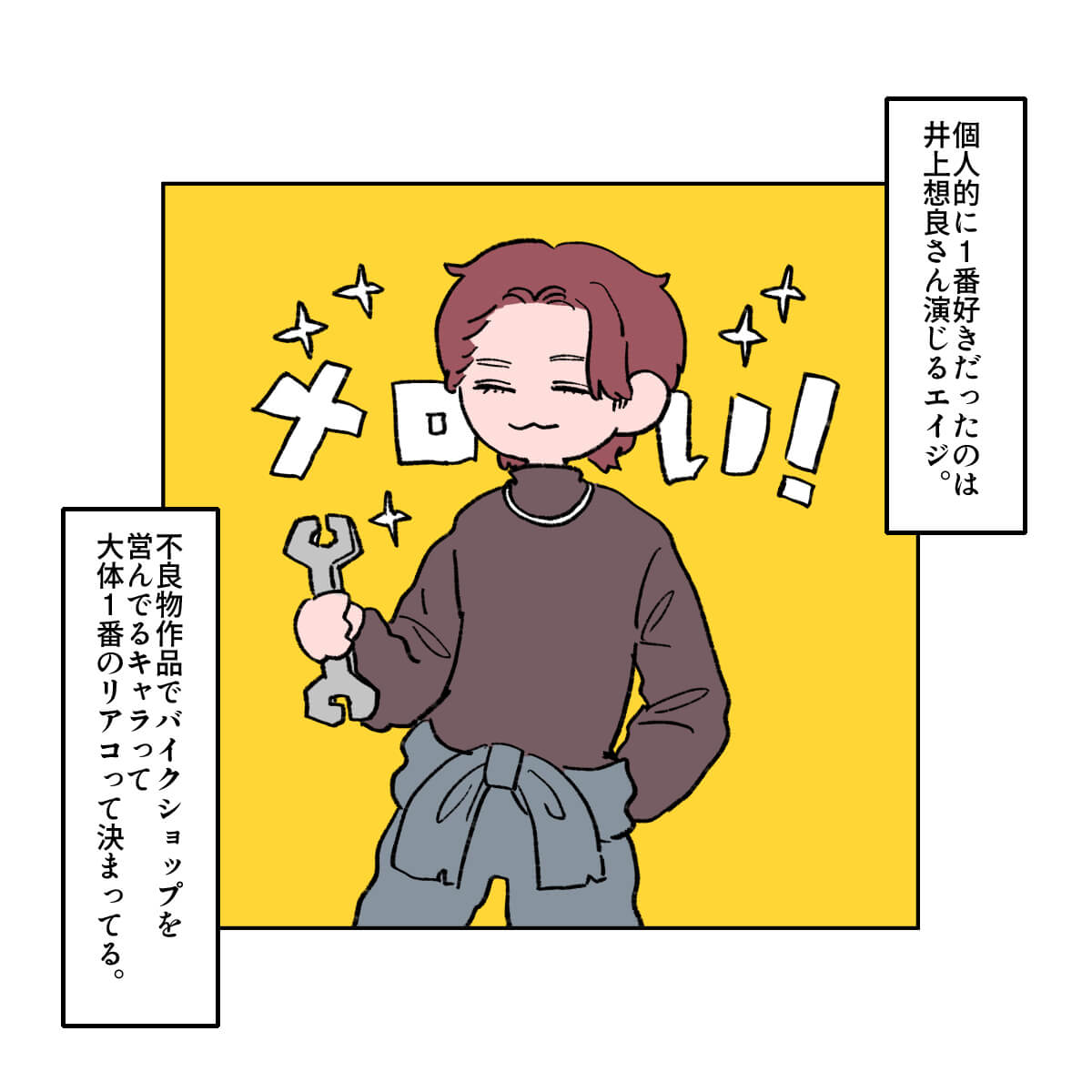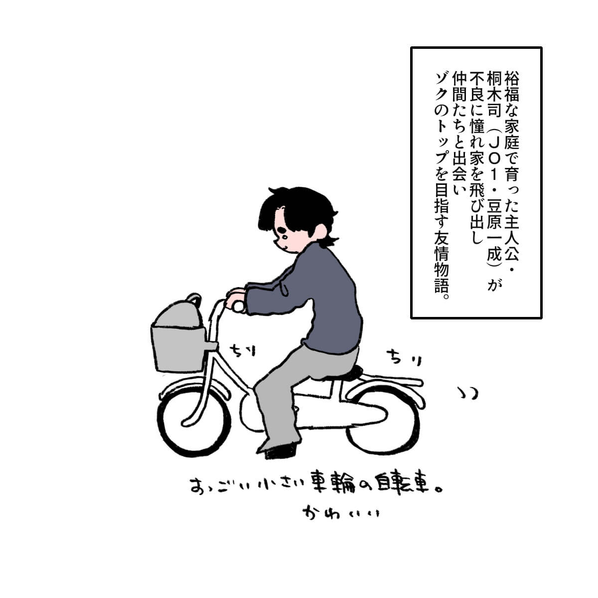 サイゾーウーマン男性アイドルJO1映画『BADBOYS』JO1豆原がまさに『仮面ライダー』 男性アイドル [ドルオタ漫画家・竜田トキヒロの“推し事”見聞録]vol.107 映画『BADBOYS』、JO1・豆原一成がまさに『仮面ライダー』の主人公! M!LK・山中柔太朗はギャップも 2025/06/04 22:00 竜田トキヒロ(マンガ家) JO1INI竜田トキヒロの“推し事”見聞録 【サイゾーオンラインより】 ――Twitterで日々、ボーイズグループのメンバーにまつわるイラストを投稿中のドルオタ漫画家・竜田トキヒロが、現場レポートからドラマや映画、番組レビューまで、“推し事”の様子をお届け! 今回は、現在公開中のJO1・豆原一成主演映画『BADBOYS -THE MOVIE-』をレビューします。 目次 ・『BADBOYS -THE MOVIE-』の概要とあらすじ ・M!LK・山中柔太朗のギャップに驚き ・JO1・豆原一成は「まさに主人公」! 体を張ったアクションも 『BADBOYS -THE MOVIE-』の概要とあらすじ 今作は、1988年から1996年まで漫画雑誌「ヤングキング」(少年画報社)にて連載され、シリーズ累計発行部数5500万部を誇る大ヒット不良漫画『BADBOYS』(作・田中宏氏)の実写版。広島を舞台に、主人公・桐木司が、かつて自分を助けてくれた伝説の不良・村越への憧れから暴走族チーム「極楽蝶」に入り、8代目トップとして族のテッペンを目指す姿を描いています。 2011年には、三浦貴大主演で映画が公開され、13年4月期には『BAD BOYS J』として、中島健人やSnow Manメンバーらが出演する連続ドラマが日本テレビ系にて放送。同11月には劇場版も公開されました。 今回司役を務めるのは、映画初主演となるJO1・豆原。また、「極楽蝶」メンバーの川中陽二をINI・池﨑理人、中村寿雄をM!LK・山中柔太朗、岩見エイジを井上想良が演じるほか、井頭愛海、岩永丞威、大下ヒロト、山谷花純、兵頭功海、青柳翔らが脇を固めています。 12年ぶりとなる映画化は果たしていったいどんな作品に仕上がっているのか、竜田トキヒロがイラストで振り返っていきます! 『BADBOYS -THE MOVIE-』、M!LK・山中柔太朗のギャップに驚き! 『BADBOYS -THE MOVIE-』JO1・豆原一成は「まさに主人公」! 体を張ったアクションも ★これまでの連載記事はこちらから 映画『バジーノイズ』レビュー:JO1・川西拓実は愛されヒロイン!? 桜田ひよりの役は「超怖い」――Twitterで日々、STARTO ENTERTAINMENT(旧ジャニーズ事務所)のタレントをはじめとしたイラストを投稿中のドルオタ漫画家・竜田トキヒロが、現場レポー...サイゾーウーマン2024.05.15 JO1・河野純喜らの“プロのおふざけ”に感動!? ドキュメンタリー映画『未完成』レビュー――Twitterで日々、STARTO ENTERTAINMENT(旧ジャニーズ事務所)のタレントをはじめとしたイラストを投稿中のドルオタ漫画家・竜田トキヒロが、現場レポー...サイゾーウーマン2024.05.01 元ジュニア・田島将吾が嵐の曲を披露、後藤威尊はファンサが「王子様」!『INITIME MUSIC』レビュー――Twitterで日々、ボーイズグループのメンバーにまつわるイラストを投稿中のドルオタ漫画家・竜田トキヒロが、現場レポートからドラマや映画、番組レビューまで、“推し事”の...サイゾーウーマン2024.12.11 竜田トキヒロ(マンガ家) 漫画家、イラストレーター。育休中に執筆したエッセイ漫画でKADOKAWAコミックエッセイ大賞受賞。Ameba、ライブドア公式ブロガーを経たのち現在はインフルエンサーとしてエンタメ、オタクに特化した漫画やイラストや体験ルポ等幅広く執筆。著書『コミュ障母さんとごきげん娘』(KADOKAWA) X:@musumenuma 最終更新:2025/06/04 22:51 旧ジャニ版には乃木坂メンバーも出ていたっけ 関連記事 映画『バジーノイズ』レビュー:JO1・川西拓実は愛されヒロイン!? 桜田ひよりの役は「超怖い」JO1・河野純喜らの“プロのおふざけ”に感動!? ドキュメンタリー映画『未完成』レビュー元ジュニア・田島将吾が嵐の曲を披露、後藤威尊はファンサが「王子様」!『INITIME MUSIC』レビューINIのパフォーマンスは新鮮! STARTOアーティストとの違いとは?WEST.の“絆”を再確認! グループ初の劇映画主演作として大正解だった『裏社員。』レビュー 次の記事 【Hey!Say!JUMP】歴代売上データ一覧 >