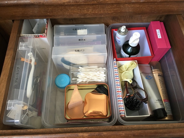 サイゾーウーマン暮らし住まい30女の「汚化粧スペース」 暮らし [連載]30代女子の「煩悩部屋」ビフォーアフター【煩悩003-13】 30女の汚化粧スペースは「高級ゴミの山」!? “理想が迷子”な汚女子に片付け方を伝授! 2018/12/03 21:30 伊藤まき「汚部屋」ビフォーアフター 深い引き出しで「モノが埋まらない」コツ 空き箱で空間を仕切りましょう ローチェストには、深めの引き出しが2つありました。引き出しの中も、グループ分け収納に仕切り「モノの住所」を作ります。 左側には、Eさん私物の空き箱を使って、使用頻度の低いアイテムを収納しました。ヘアケアアイテム、コンタクト用品、スポンジやコットンのストックなどです。 【テクニック】「透明な箱」を上に重ねる! ダイソーのシューズケースがぴったりでした 右側の引き出しには、ダイソーのシューズケース(100円/税抜)を2つ用意しました。深めの引き出しには、靴の空き箱が収まりやすいです。 空間を区切ったら、さらに小分けしていきます。ワンボックスにワングループが理想的です。 もうひとつのポイントは、深い引き出しの中に「モノを埋もれさせない」ことです。 引き出しを開けたら「上から見て、見渡せるか」を考えること。透明の小箱を上に重ねて使うなどして、深さを有効活用するのがオススメです。 【テクニック】散らばるアクセサリーの「100円収納」 【Before】鏡から離れた場所にピアス、ヘアスプレー、そして消臭力 ベッドルームを整える前は、スキンケア用品やヘアケアアイテムがあちこちに散らばっていました。香水を纏う、アクセサリーを付けるなどの行為も、部屋の中で場所がバラバラです。 とりあえず、「空いている場所に置く」を繰り返していたので、散らかり続ける仕組みになっていました。「モノの住所」を用意しないと、大切なモノも行方不明になります。 【After】100円ショップのパーツボックスでペア保管! よく使うアクセサリーは、フラットな空き箱やトレーに並べます。あまり使わないモノは、100円ショップのパーツボックス(100円/税抜)にペア保管を。これで、アクセサリー迷子の心配はありません。 次のページ メイクスペースが、こんなふうに変わりました 前のページ1234次のページ Amazon 人生を変える断捨離 関連記事 ハンガーは「40本」あればいい!? 汚部屋30女を救う「ズボラ収納」3つのポイント!イライラの原因は「80cmを確保」でゼロ円解決!? 動線最悪の「汚ベッド」を配置換え!【動画アリ】ゴミだらけの部屋は「枯れている」!? 汚キッチン&ダイニングの断捨離ビフォーアフター! 汚部屋30女が“収集癖”と卒業!? ゴミに埋まる「キッチンテーブル塚」を徹底断捨離!汚部屋30女はレシートまみれ!? ゴミと書類をかき分けて「キッチンカウンター」を発掘!