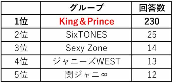 サイゾーウーマン男性アイドルSTARTO(旧ジャニーズ)好きになったジャニーズ1位は? 男性アイドル 【ジャニーズファンアンケート 2018】 2018年、好きになったジャニーズは? 1位はSixTONESとKing&Princeの争いに!【ジャニーズファンアンケート 2018】 2019/01/20 19:00 ジャニーズSixTONESジャニーズファンアンケート 衝撃に次ぐ衝撃が1年もの間続いた2018年のジャニーズ事務所。ジャニーズファンの間でも、阿鼻叫喚の声があふれ返った1年となりました。 “これまで”から“これから”へ――ジャニーズ事務所が新たな形に変わっていく、その端境期にあるとさまざまな局面で感じた18年。そんな1年を振り返るべく、みなさんの声をアンケートで大募集しました。 そこから今回は、「好きになったジャニーズはいますか?」「それは誰ですか?」というアンケートに集まった回答をご紹介していきます。(※アンケート実施期間は18年12月1〜20日、回答数991)(原則として、アンケート回答は原文ママ) 「いる」と答えたのは684人と全体の75%という結果に。それでは、「いる」との回答で上がったジャニーズの内訳をランキングで見ていきましょう。 好きになったジャニーズ、グループ1位は? グループで1位となったのは、18年5月にデビューしたKing&Prince。230とダントツで票を集めました。「花晴れがきっかけだけどそれからグループ知るうちにみんなを好きになった」(32歳、ゆうまま)「忙しいだろうに一人一人が頑張っている姿を見て」(kazu 47)「最初は全く知らなくて、花のち晴れのドラマを見て紫耀君にはまって、色々な動画を見てたら廉君を知り、廉君にハマりそこからking &Princeのファンになりました」(24歳、レアメタル)「興味なかったけど、たまたま見た密着番組で好感が持てた」(43歳、みもさ)と、新規ファンを多数獲得した模様。 2位には、ジャニーズJr.のSixTONESがランクイン。YouTubeで活躍している彼らには、「たまたまYouTubeで見かけて、カッコよくて驚いた!」(モーグリ)「YouTubeのジャニーズJr.チャンネルをみて。こんなに魅力的なグループはひさしぶり!YouTubeを見てから彼らのことを色々調べました」(29歳、ERICA)「youtubeのジャニーズチャンネルを見て好きになった。歌もダンスも上手いし!とにかくストーンズの掛け合いが面白い!是非デビューして欲しいグループです」(35歳、ニャンコ先生。)と、やはりYouTubeの力が大きいよう。「歌!ダンス!パフォーマンス!今までのジャニーズには居なかったグループだと思います。韓流に勝てるグループ!」(ジャニヲタBBA)との期待も聞こえます。 3位のSexyZoneは、「色んなところで頑張ってたと思うし、最初はそこまで応援はしていなかったけど、年末の音楽番組でsexy zoneを楽しみにしている自分がいた。松島くんもパニック障害というのに、それで活動を休むわけにはいかないと思って仕事を続けたのかなと思うと、すごいなと感じた」(16歳、ももりん)「24時間テレビを見て」(37歳、junt。)「扱いが5人平等になってから輝きが増してる気がする。自然と惹かれた」(みるきー)といった回答が集まりました。 次のページ 個人部門も、キンプリメンバーが続出 12次のページ Amazon HEART 関連記事 2018年に頑張ったジャニーズは? 1位はKing&Princeと増田貴久!【ジャニーズファンアンケート 2018】今年、嫌いになったジャニーズは?【ジャニーズファンアンケート 2018】(回答数911)今年、「一番衝撃だったジャニーズの出来事」を発表!【ジャニーズファンアンケート 2018】今年のジャニーズ事務所は「乱」! 漢字一文字で振り返ると?【ジャニーズファンアンケート2018】『とくダネ!』山田美保子、ジャニーズファン“鉄の掟”解説に「聞いたことない」と批判続出
