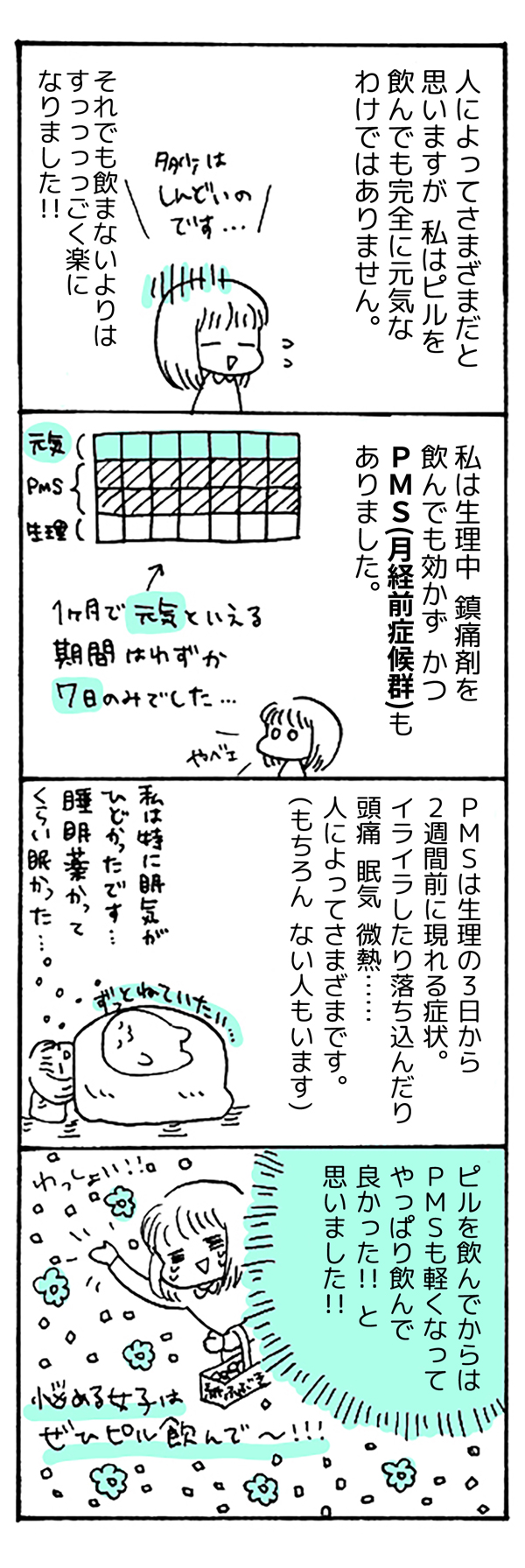 サイゾーウーマンカルチャーマンガ【11~20回】月経困難症マンガ カルチャー 【連載】私の生理、「病名」がつきました。~月経困難症、ピルに漢方あれこれ5年試してみたら~ 【月経困難症マンガ】ピル服用、7カ月の間に起きたこと【第11回~第20回まとめ読み】 2019/02/10 18:00 まお マンガ私の生理、「病名」がつきました。月経困難症 ピルを飲んで数カ月後、どうなった? PMSは、どうなった? 次のページ 本当にムカついた「ピルの偏見」! 前のページ123456次のページ Amazon 生理ちゃん 関連記事 【タイ移住マンガ】「軌道に乗ったら」なんてあり得ない!? 早くも不安のタイ暮らし【22話】【マンガ・ヤリマン引退】風呂上がりの「おまたパンパン」が気持ちいい!【第24回】【日雇いマンガ】33話『ちゃっかりさんは仕事上手!? ベテランおばさん観察日記3』【マンガ】私は「何者か」になるんだよ――茨城とヤンキーを嫌悪する、その理由【17話】【配信者マンガ】「結婚」「泥酔」「山で遭難」……ニコ生配信者たちの年末年始!【第17回】 その他の作品を読む