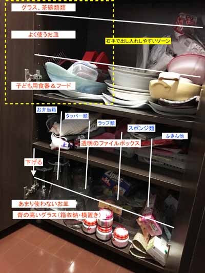 サイゾーウーマン暮らし住まい「食器棚」を劇的チェンジ! 暮らし [連載]収納の悩みをスッキリ解決します! 伊藤まきの「お片付けSOS」相談! 「食器棚」の収納力アップに“アレ”は厳禁!! 劇的チェンジの秘訣で「容量300%増」も!? 2019/02/18 19:30 伊藤まき 「お片付け・お掃除SOS」伊藤まき 空間を「仕切る」より「区切る」ことで時短に! 毎日使うモノだからこそ、機能的な食器棚を目指したいですよね。食器棚には、棚タイプ(前から取る)と引き出しタイプ(上から取る)があります。ストレスを溜めないために、「ワンアクションで取り出す」ことを考えて選びましょう。 さて、本題に戻ります。 こちらは、備え付けの棚に「棚板を増した例」です。ホームセンターで3枚の板をカットして収納力を上げた結果です。材料費は、2,000円ぐらいで済みました。 筆者のお客様のご自宅例です 空間をフルに使って、“ワンアクション”で出し入れできるようになりました。使用頻度の高いモノの収納は、快適さが重要です。 Yさんの食器棚も、ホームセンターで板をカットしたほうが「快適な出し入れ」になります。採寸やDIYが苦手なら、1枚の板とタボ(棚受け)を持参し、お店の方に助言をもらうと簡単です。 「ワンアクション」の食器棚で、家事が楽になる! Yさんの食器棚の収納は、棚板(厚1.5cm)を2枚増やせば解決できます! 食器以外のキッチン小物も、たくさん入ります。 使用頻度の高い食器類は黄色の点線ゾーン(右手の場合)に収めます。これで、左手で扉を開けて右手でお皿を戻すことができます。 食器棚に「キッチン小物」を入れるプラン! Yさんの食器棚・横60cmをフル活用収納プラン また、タッパーやラップ類は、透明のファイルボックスがオススメです。在庫を「見える化」にすることで、一度で見渡せます。背の高いグラスも、透明の箱(ダイソ―のシューズボックス)に入れて下段へ。横置きなら、高さ違いでスペースを奪う問題も解決できます。 ※ 写真左から、ホームセンターのファイルボックス(当時248円/税込)、ニトリのファイルボックス(399円/税込)ライター調べ 【まとめ】 Yさん、食器棚の収納はいかがでしたか? 収納が「取り出しにくい」と感じたら、収納グッズを買わずに空間を見直しましょう。目安としては、12〜16cmの高さで仕切れば「ワンアクション」になります。この時、以下の5つのポイントも意識してお皿を収めると良いでしょう! [1]形状の異なるお皿を重ねるなら2種類まで [2]1枚で数パターン使える皿を選ぶ [3]同じ種類・形状は縦1列に並べる [4]タッパーは、重なる型を2種類まで [5]家族の適正量を意識する 毎日のことだからこそ、家事の簡略化を目指したいですね。 ――「お片付けSOS相談」は次回、2月25日(月)に更新! <プロフィール> 伊藤まき(ito maki) 収納ライター・兼・整理収納アドバイザー1級。おがくず工場に生まれ、ホテル清掃員、国鉄系レストランの厨房、内装会社、デパートの搬入搬出など“家事の土台”を極めた生活を経て、出版社入社ののち独立、現在に至る。モノを手放すほど「幸運」が舞い込むジンクスを何度も体感! 貧乏神と決別した実体験をもって、整理収納の威力をお伝えします。 <Instagramはこちらから> ☆☆☆収納のお悩み[何歳でもOK!お住まいどこでもOK!]大募集!☆☆☆ 片付けのちょっとした“お悩み”に、収納ライターの伊藤まきさんが、目からウロコの解決方法を提案します! アナタの部屋の「困っている場所」の写真を撮って「お悩み詳細」のコメントを添えて、下記よりご応募ください。 ★応募フォームはこちら★ 前のページ123 最終更新:2020/01/28 13:46 関連記事 ダイソーの“見える化”収納アイテムで、ゴチャつく「洗面台下」を無駄なくフル活用!ダイソーの「落ちない名品」で、イラッとするトイレの“収納と掃除”が極楽に!セリアの100円グッズで、ランドリーラックのイライラ「隙間」を快適収納にアップ!ハンガーは「40本」あればいい!? 汚部屋30女を救う「ズボラ収納」3つのポイント!キャンドゥの“アレ”は無印良品にそっくり!? 汚部屋30女のキッチン収納を400円で解決 次の記事 『トレース』小雪の行動に批判殺到 >